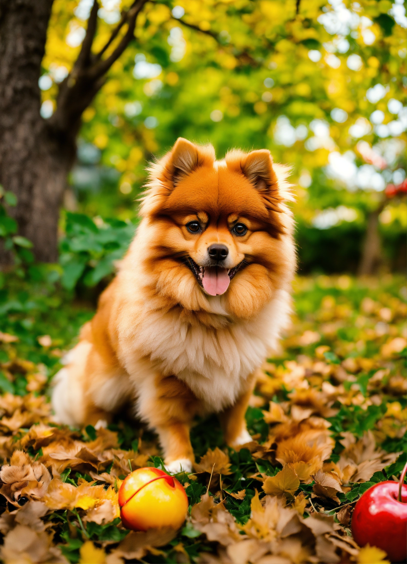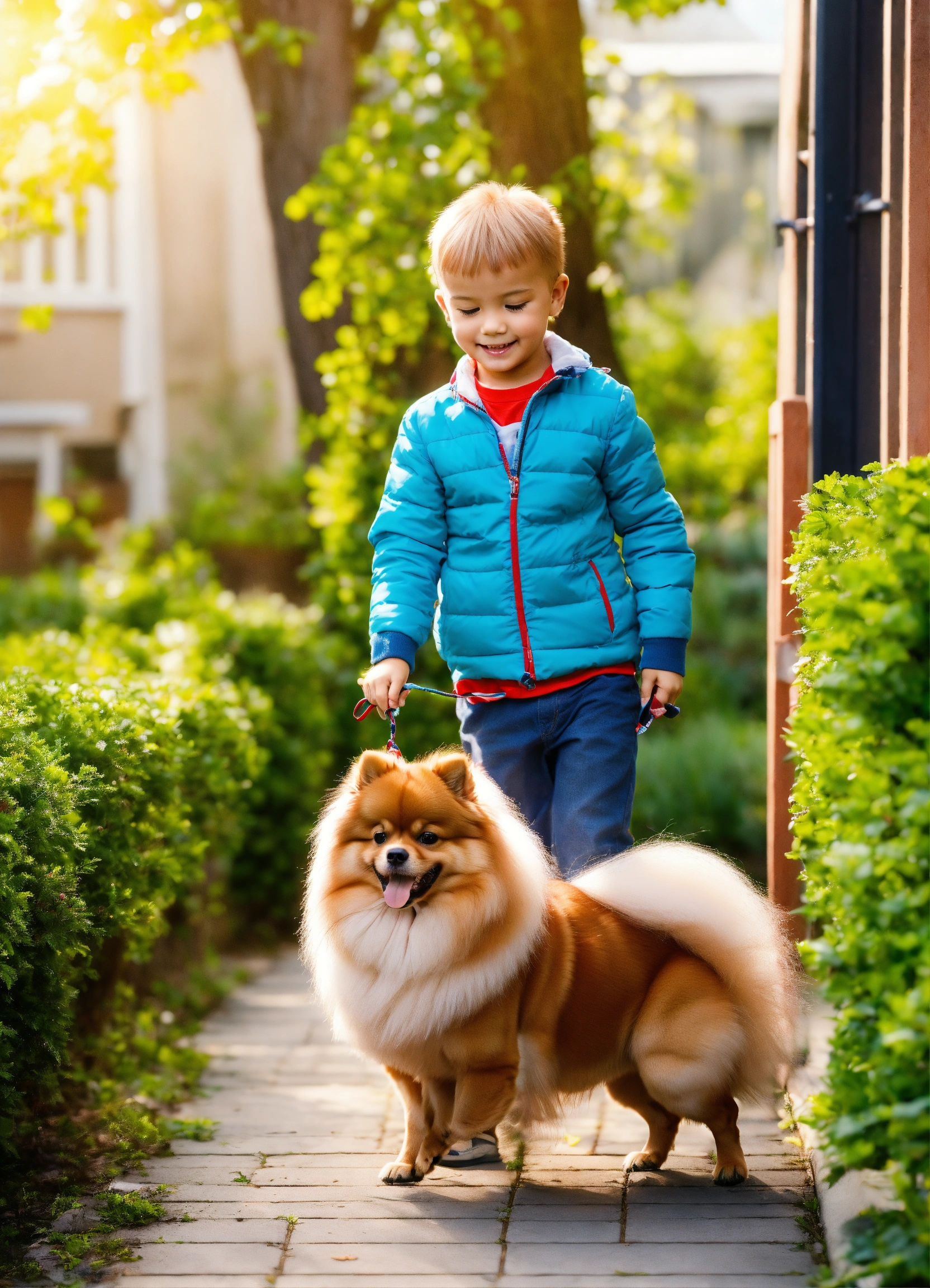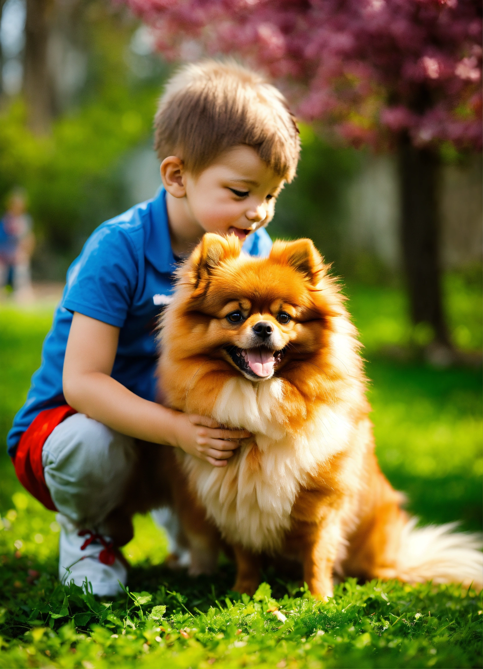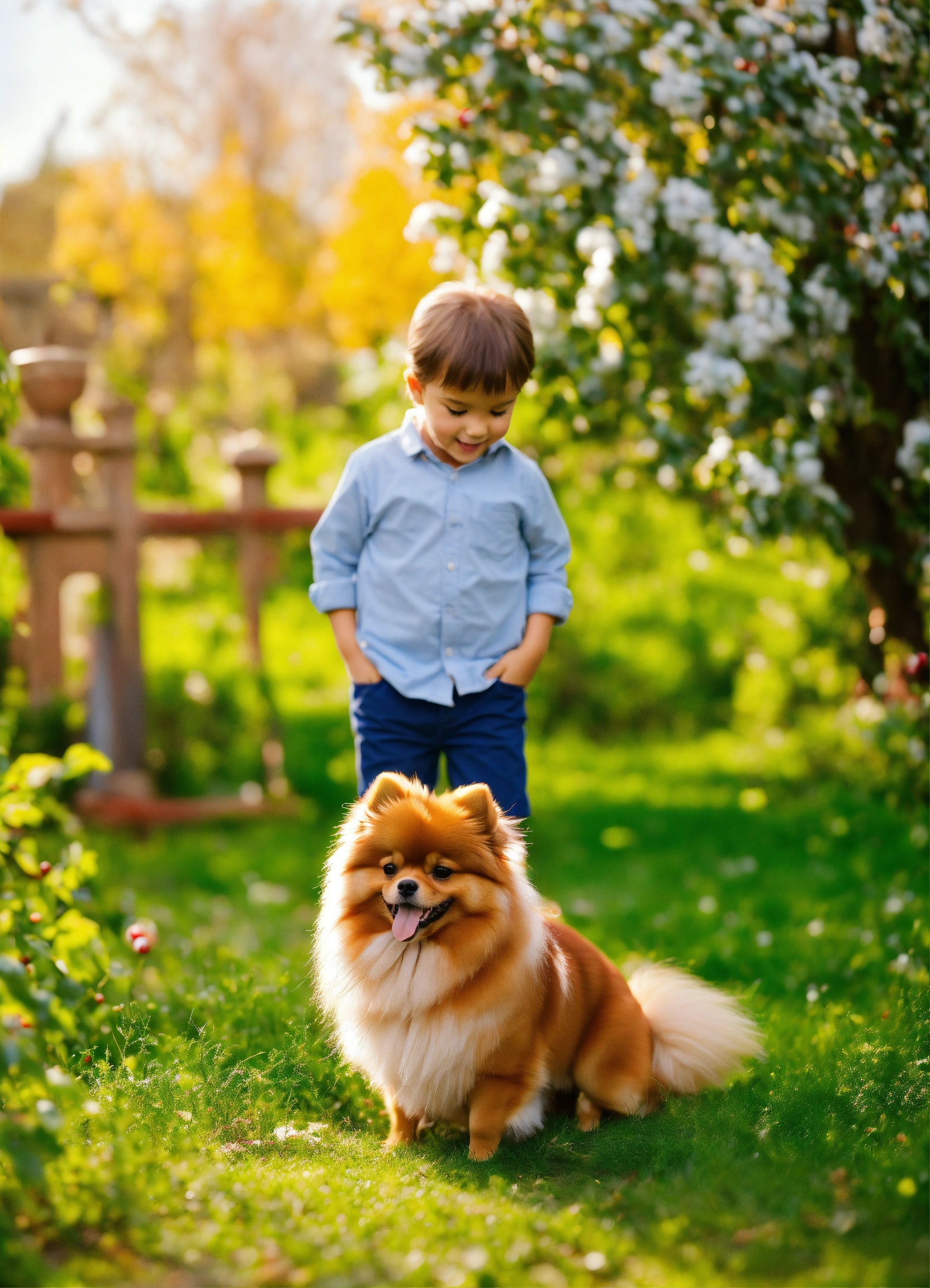 Dog pomeranian spitz breed, red color plays with a 5 year old boy, in the yard, trees, bushes, cherry