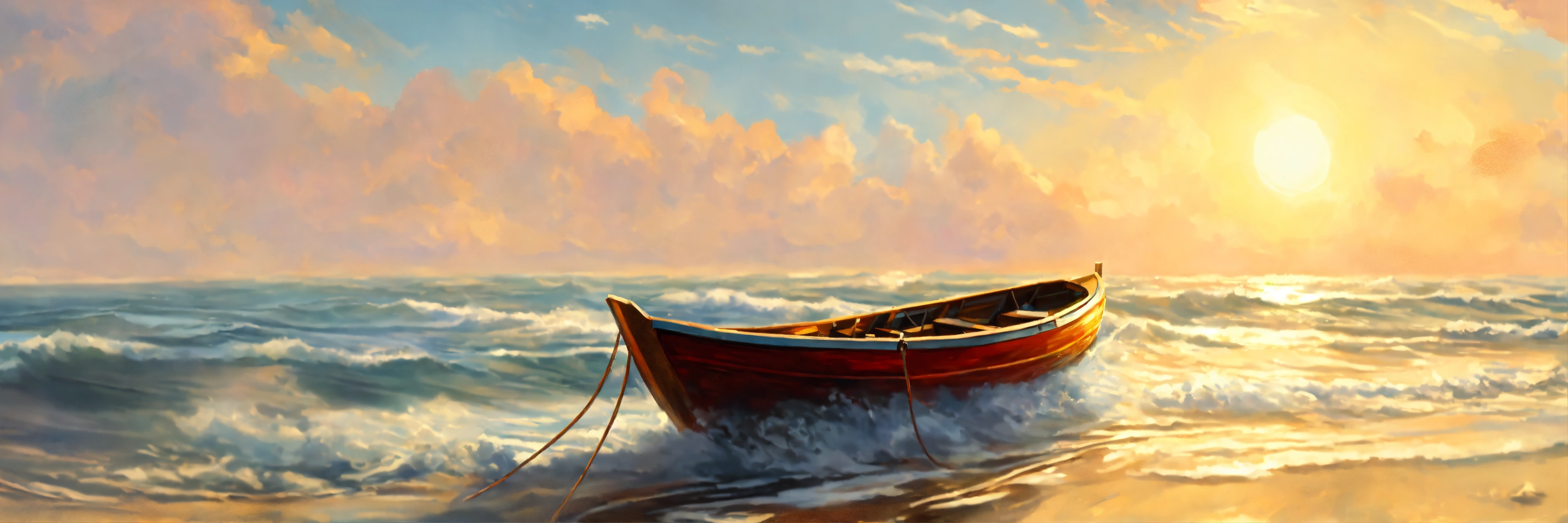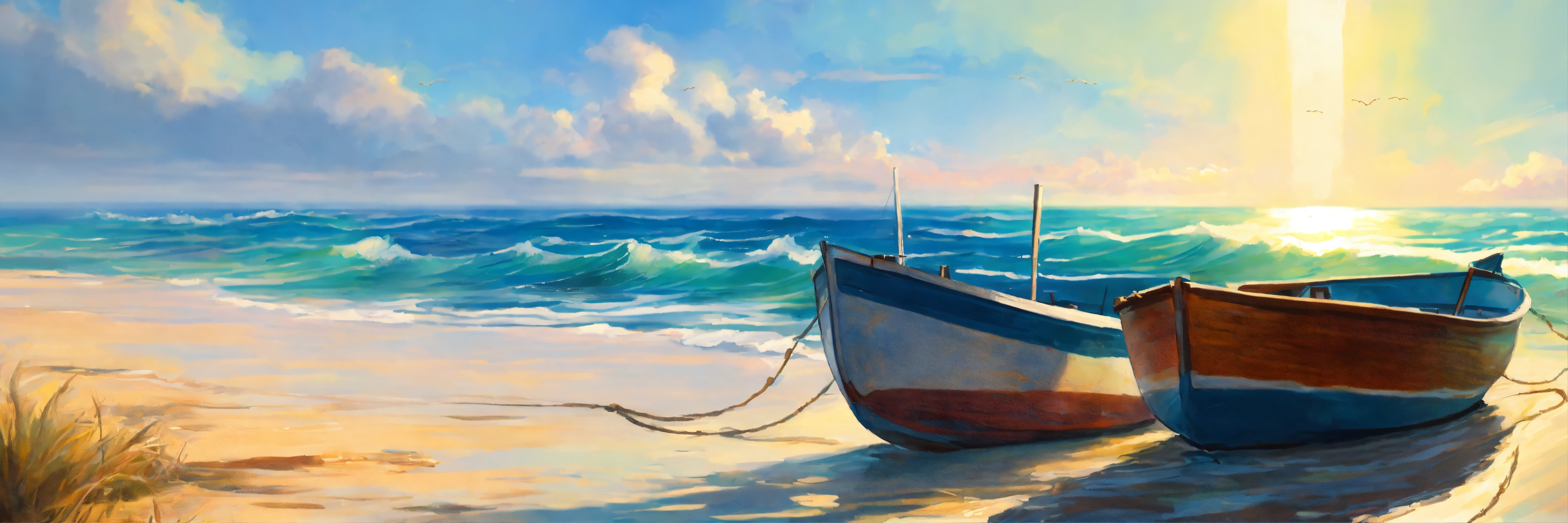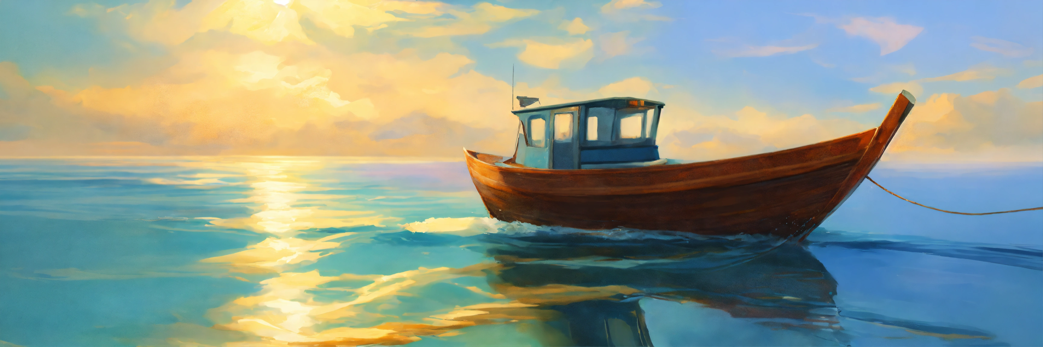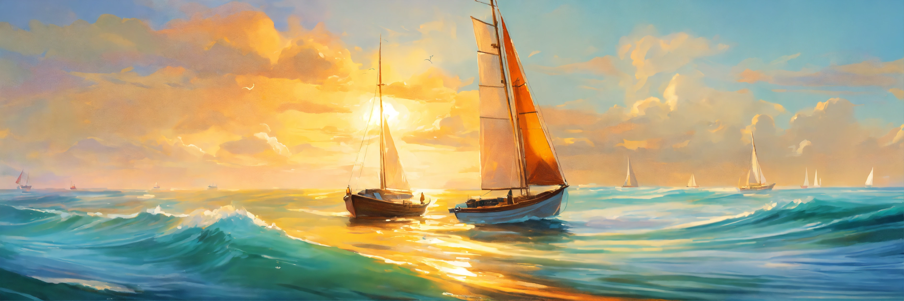Concept art of two boats meeting each other an endless ocean on a sunny day, oil painting style, highly detailed, brush strokes, 8k