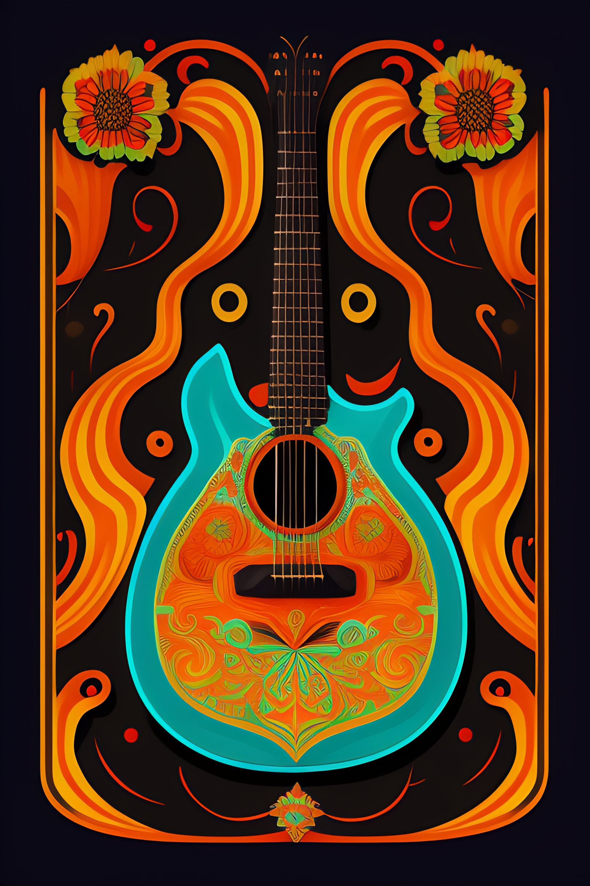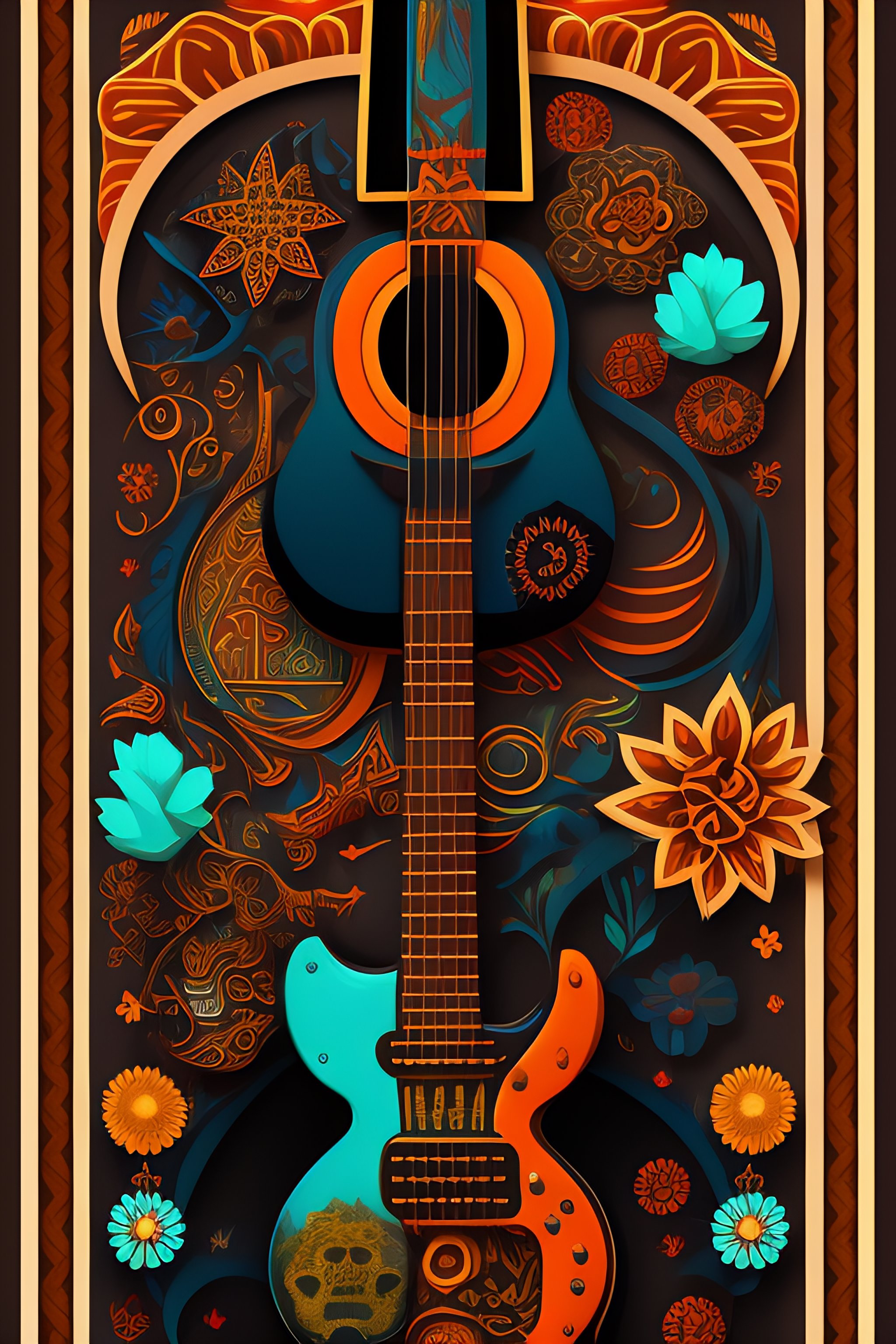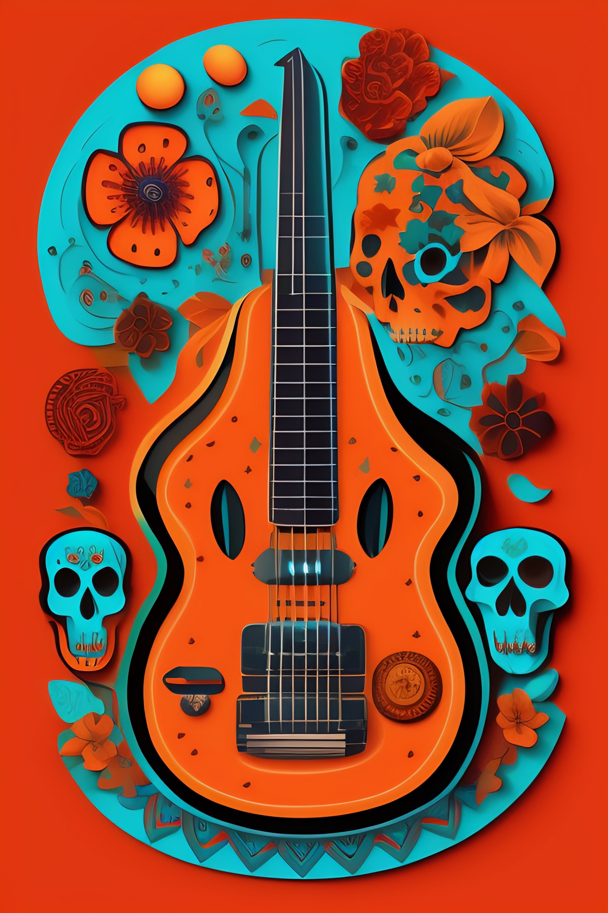 Vector flat flyer, flyer flat vector 2d image of a guitar surrounded by mexican ornamental elements such as mates, skulls, flowers guitars, garlands of lights and native plants, colors orange, turquoise and black
