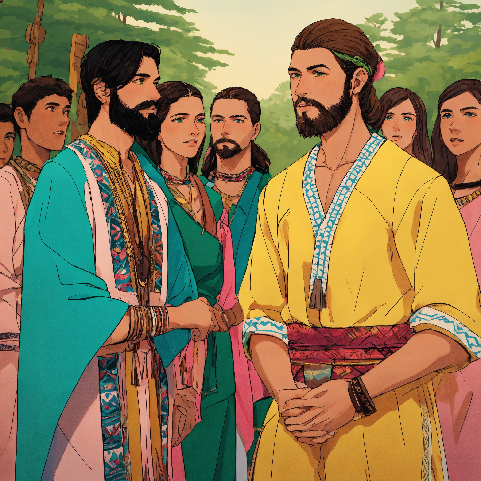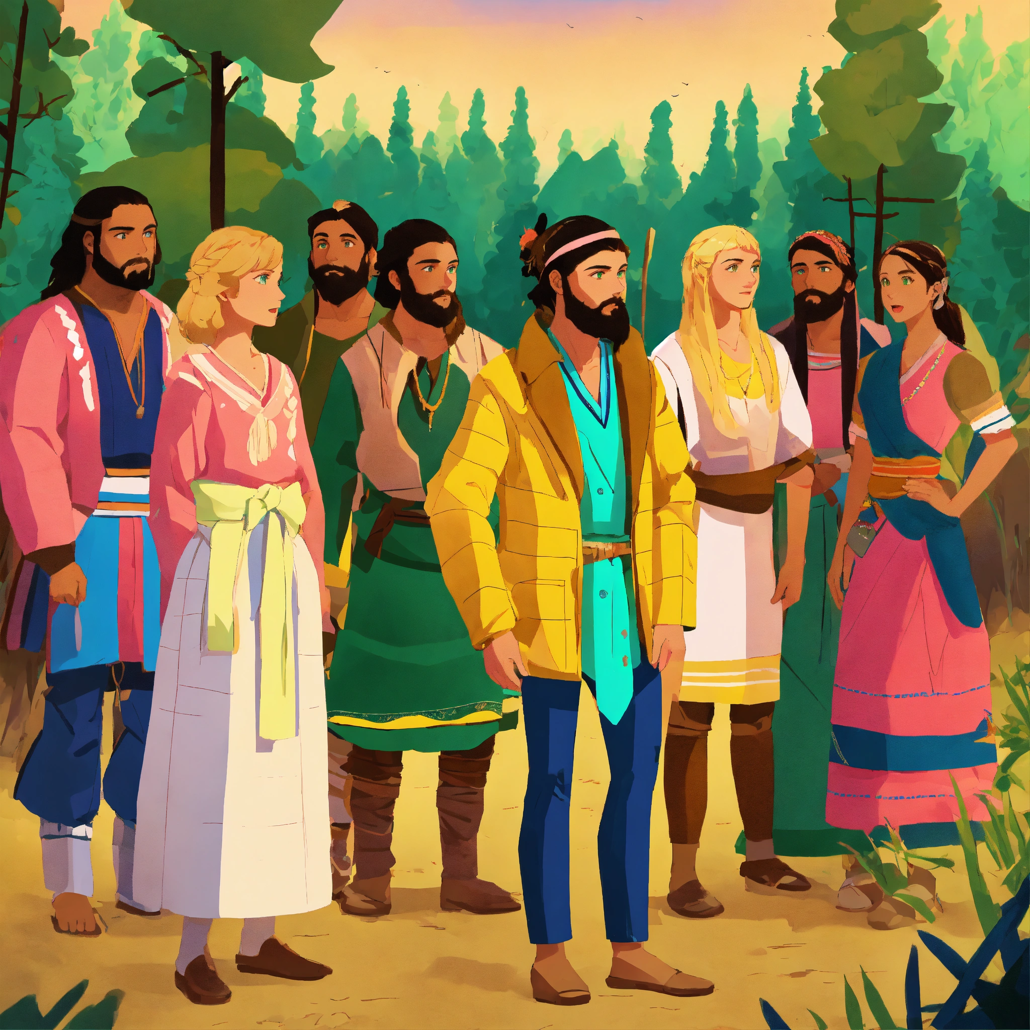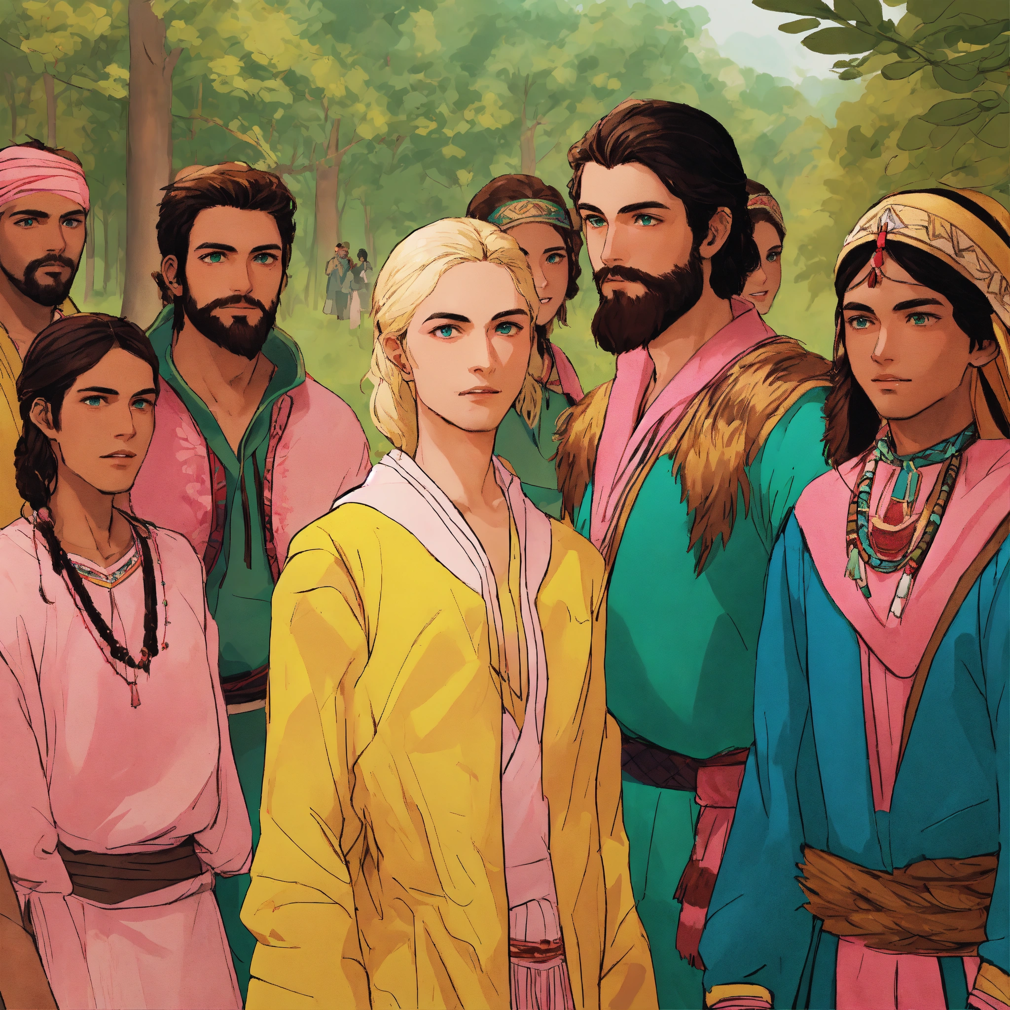 In this particular illustration style, a young man with brown hair, a light thin brown beard, and green eyes can be seen wearing a yellow jacket and a white woman with blonde hair, blue eyes, and a v-shaped face wearing pink jacket. show group of tribal people meeting young man and woman. show wide view of forest and tribal people dressed in their historic dresses