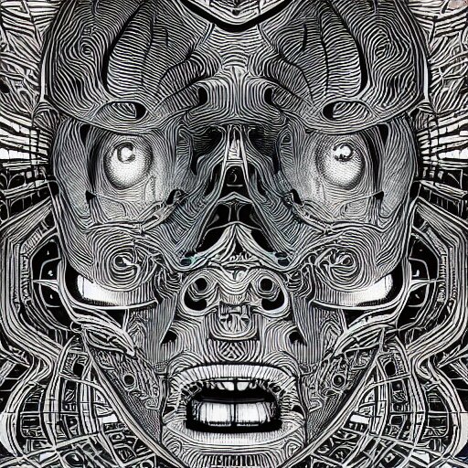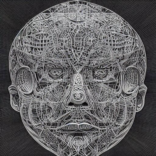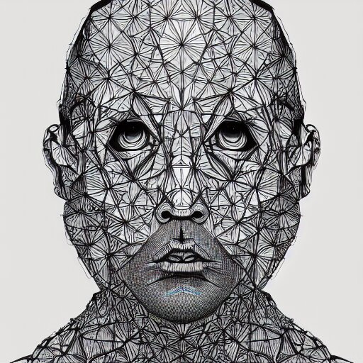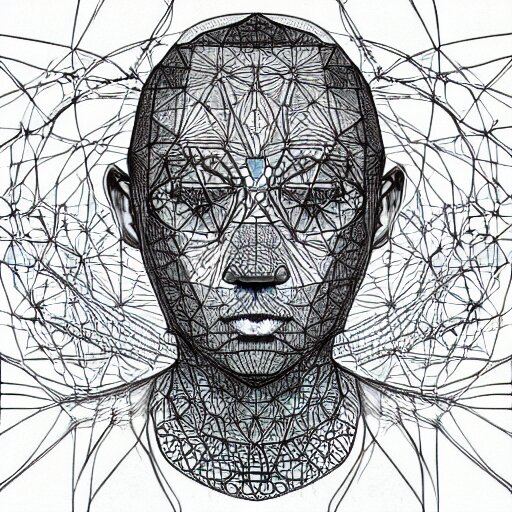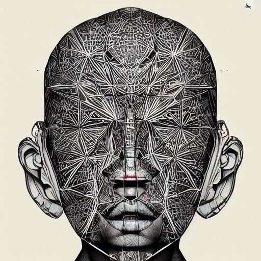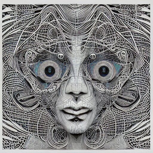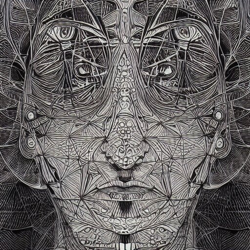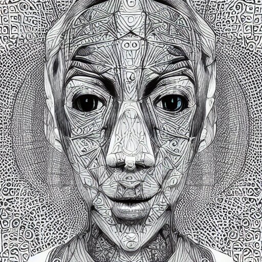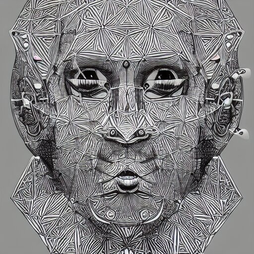 Geometrically surreal artificial intelligence monk, high detail, photorealistic, intricate line drawings, dotart, album art in the style of james jean
