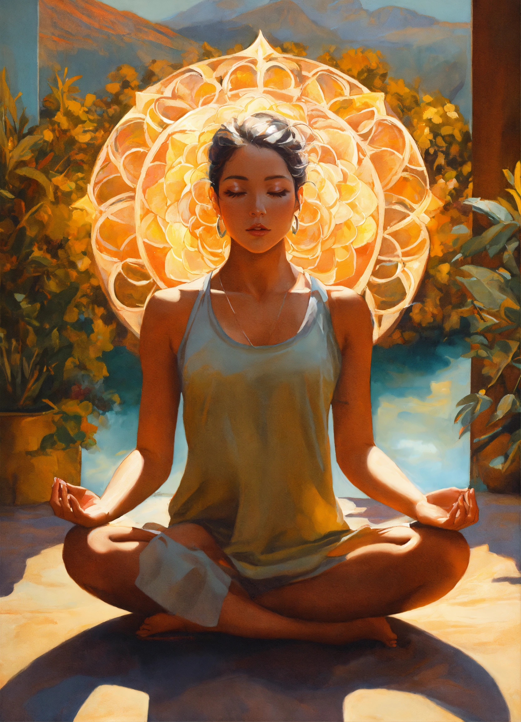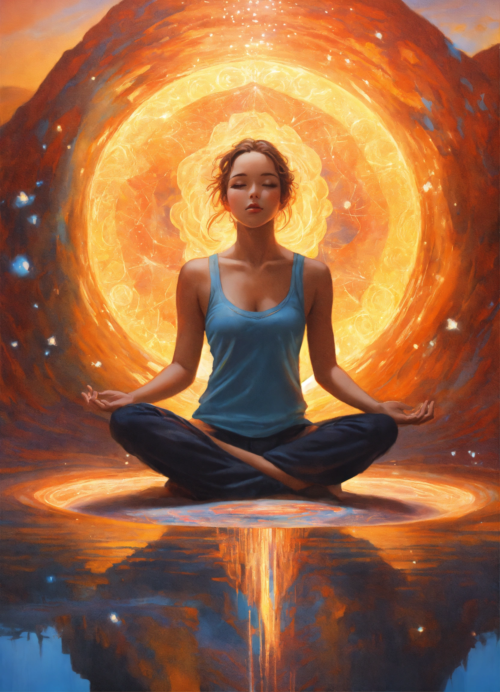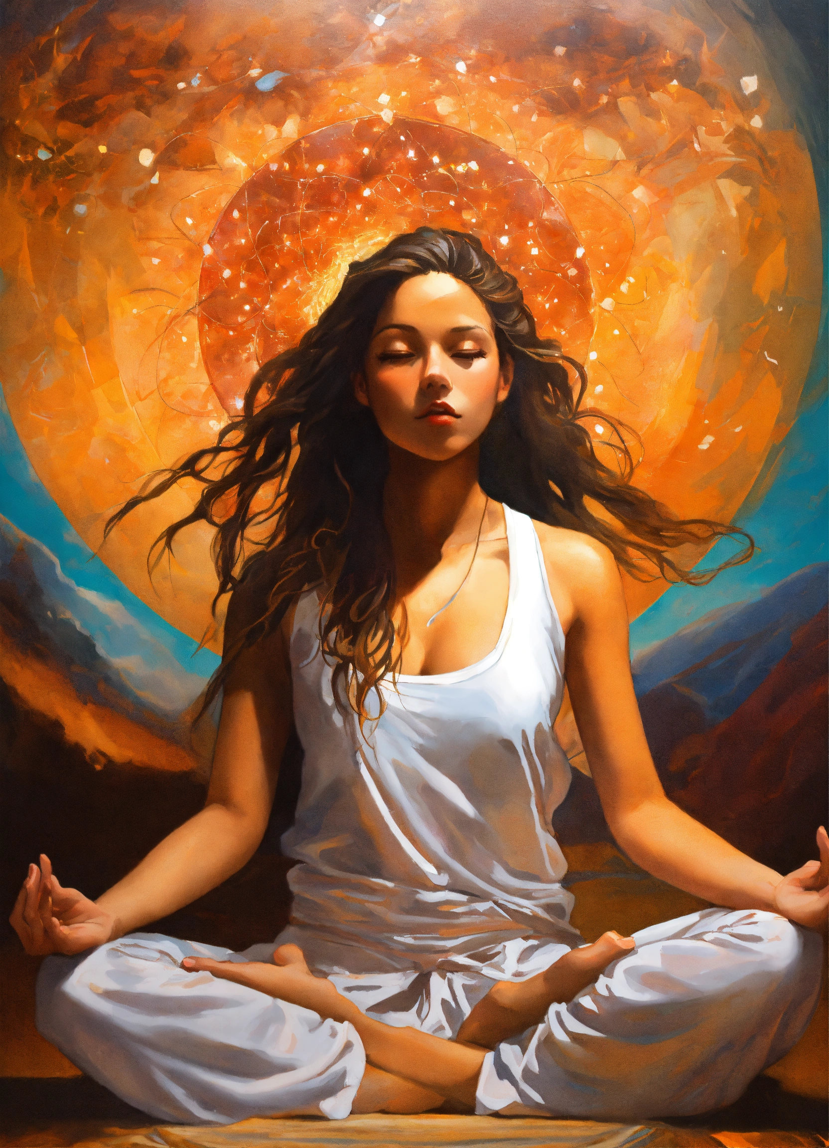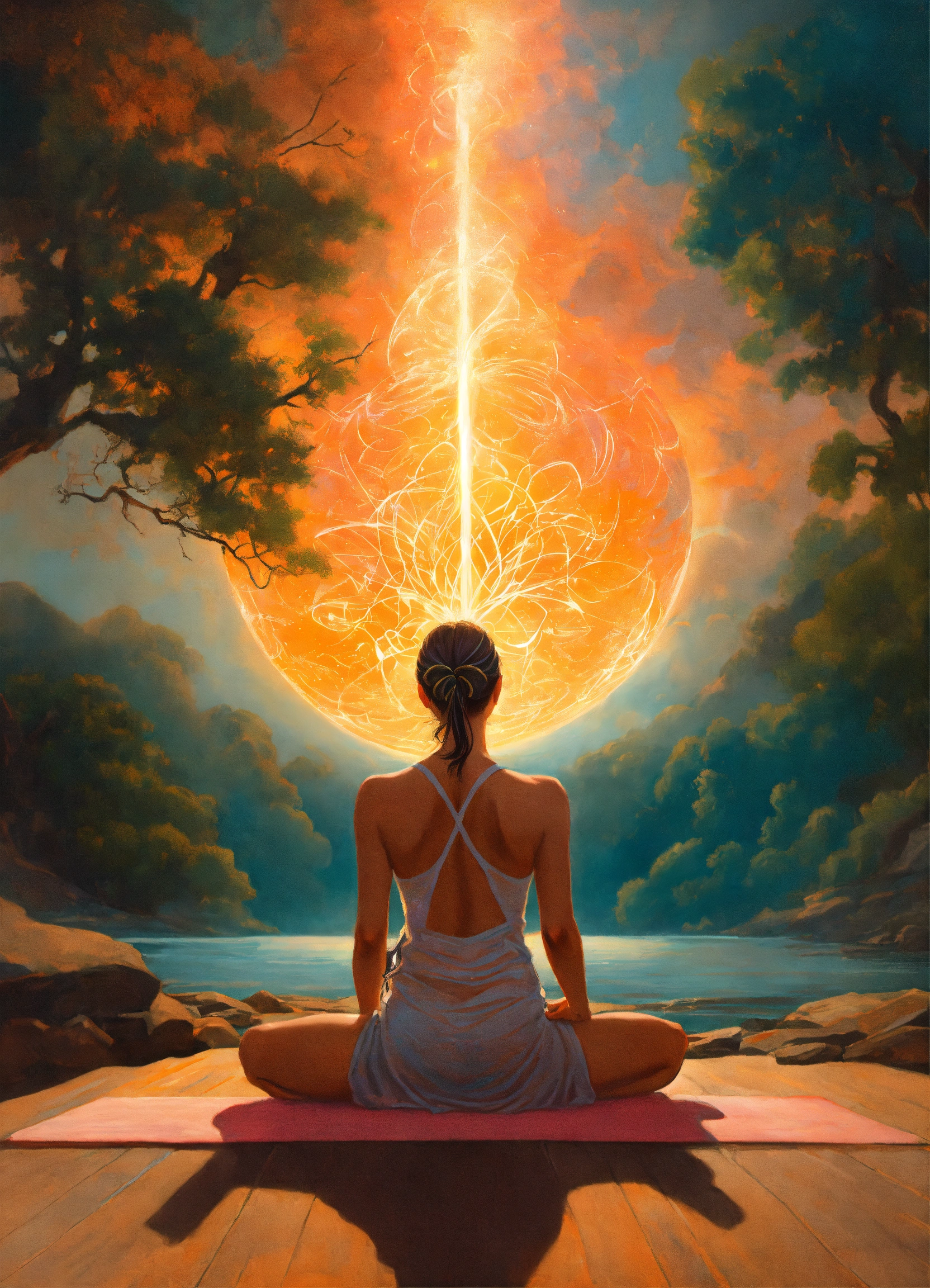A young yoga practitioner sits alone in nature, practicing kundalini yoga, seeking to invoke an altered state of consciousness, with each inhale of her breath, she transforms her reality into a supernova of creative energy, with each exhale she releases all her fears and doubts, in the painting styles of james bullough, wlop, jon foster, zack snyder, high detail.