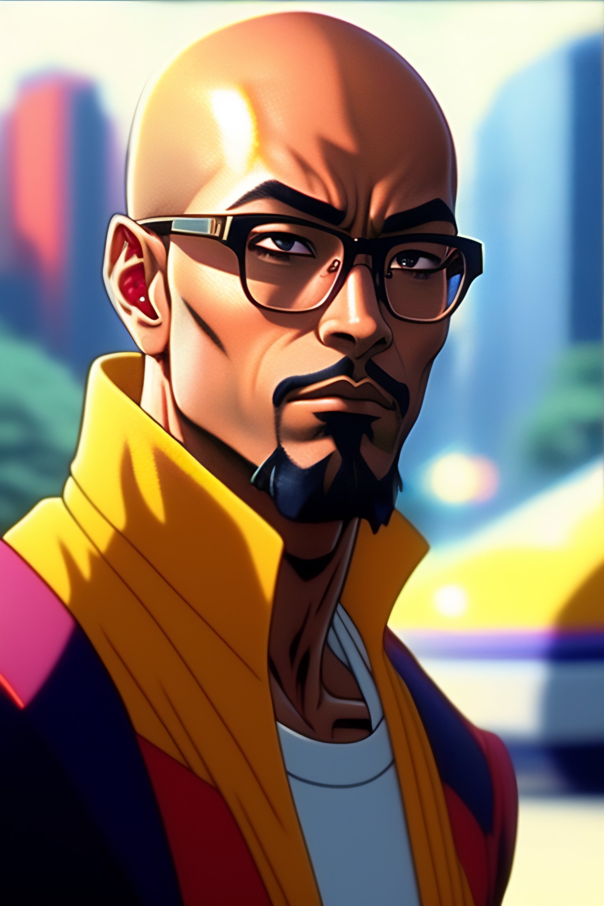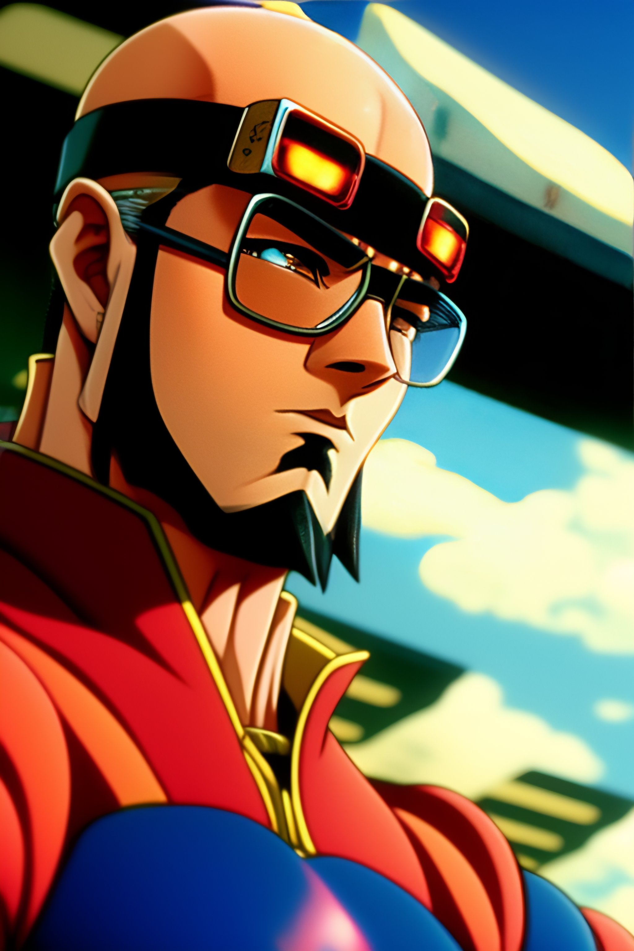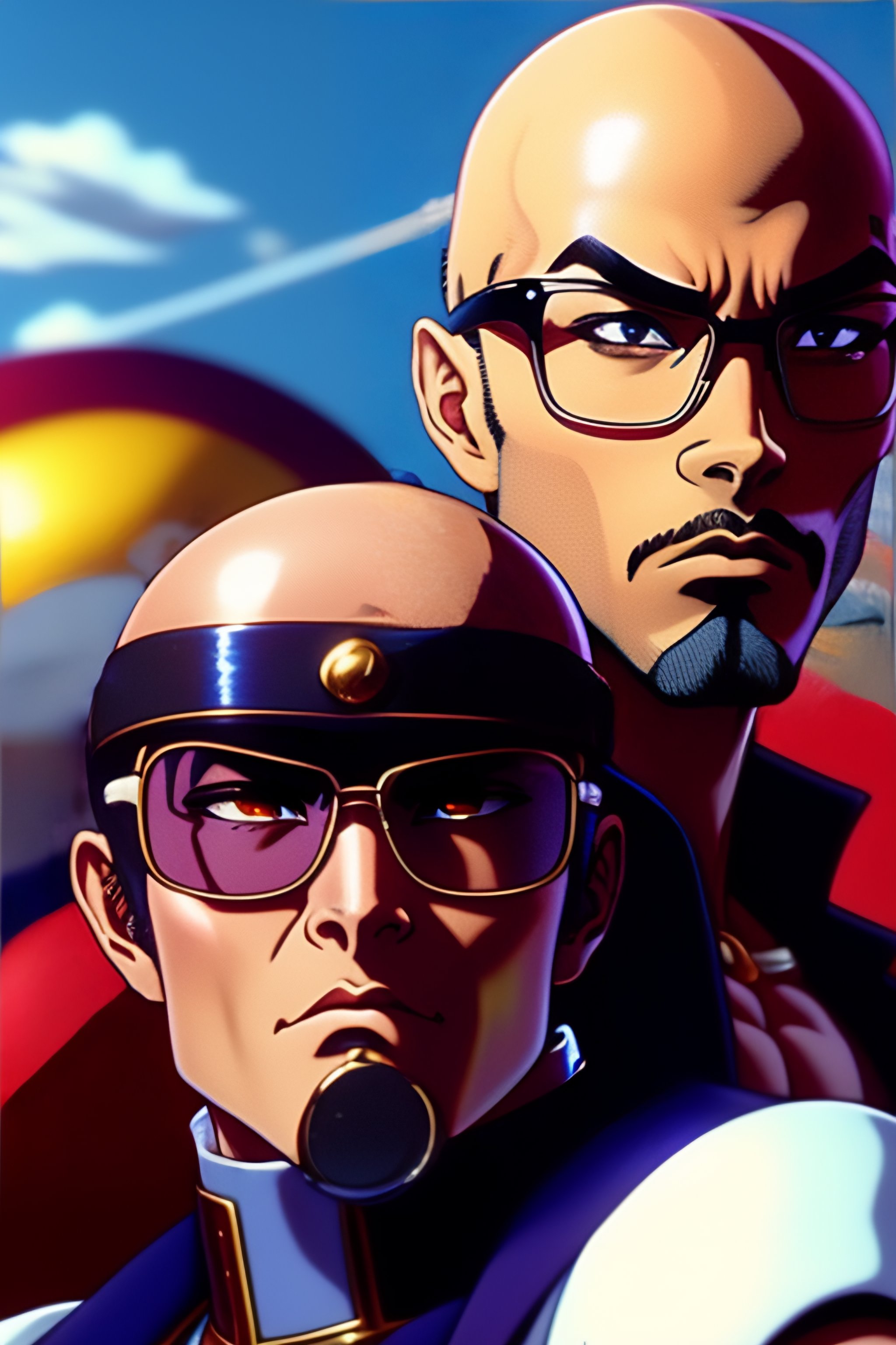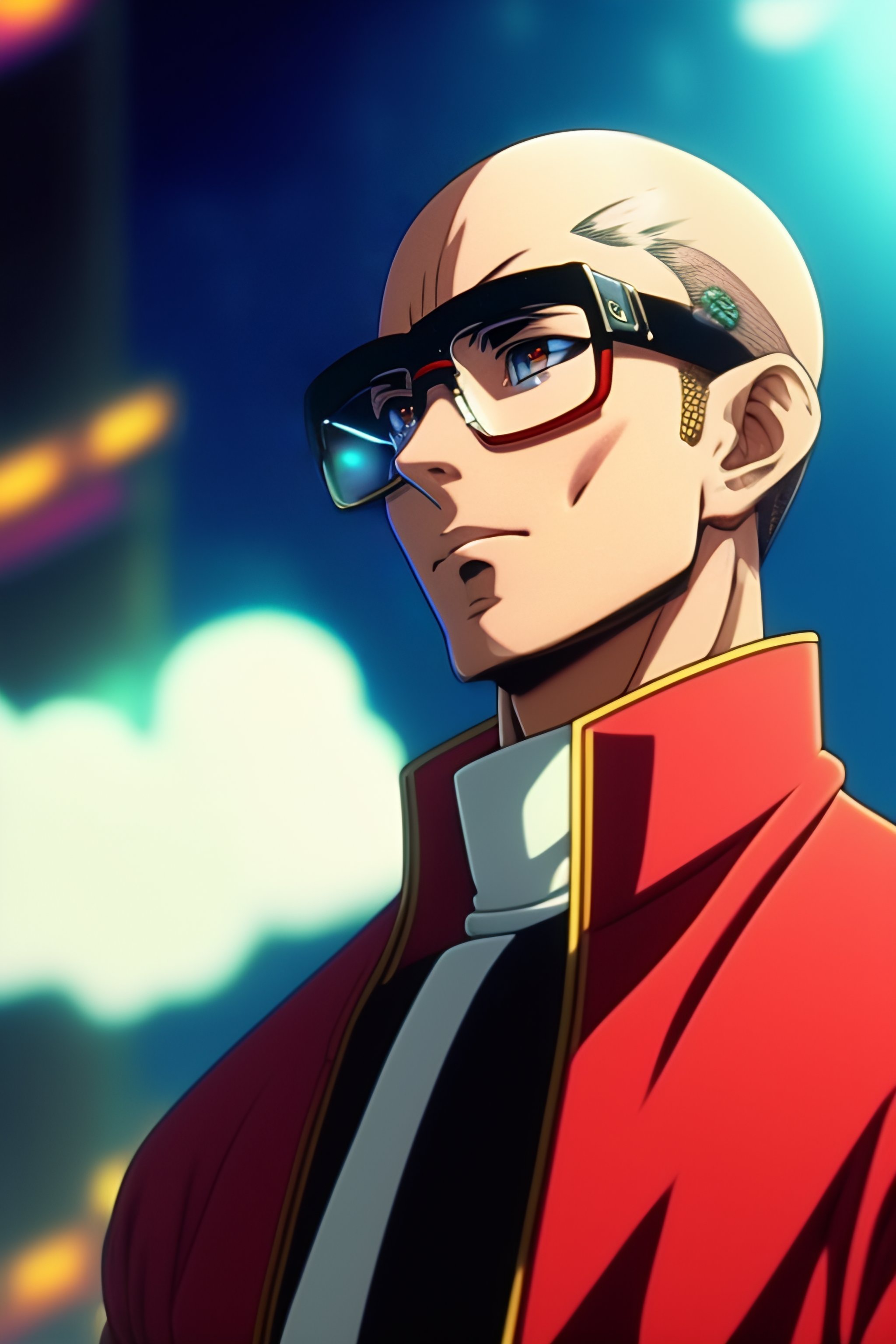Bald guy with glasses and small goatee, vintage anime screenshot, 90’s anime aesthetic. maximalist action shot from the plot twist.