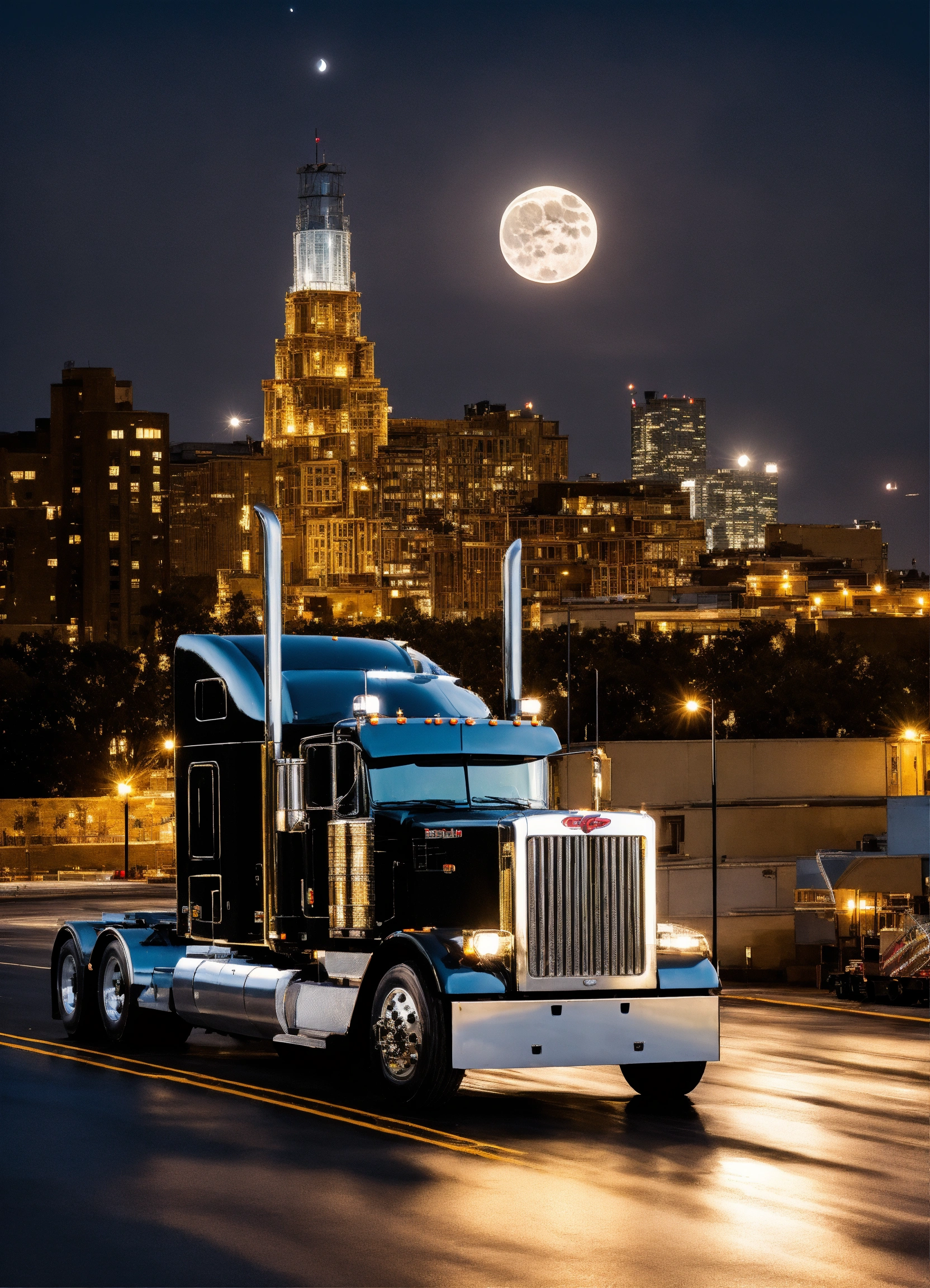 2023 peterbilt 379 black with gold trim downtown background with moonlight landscape