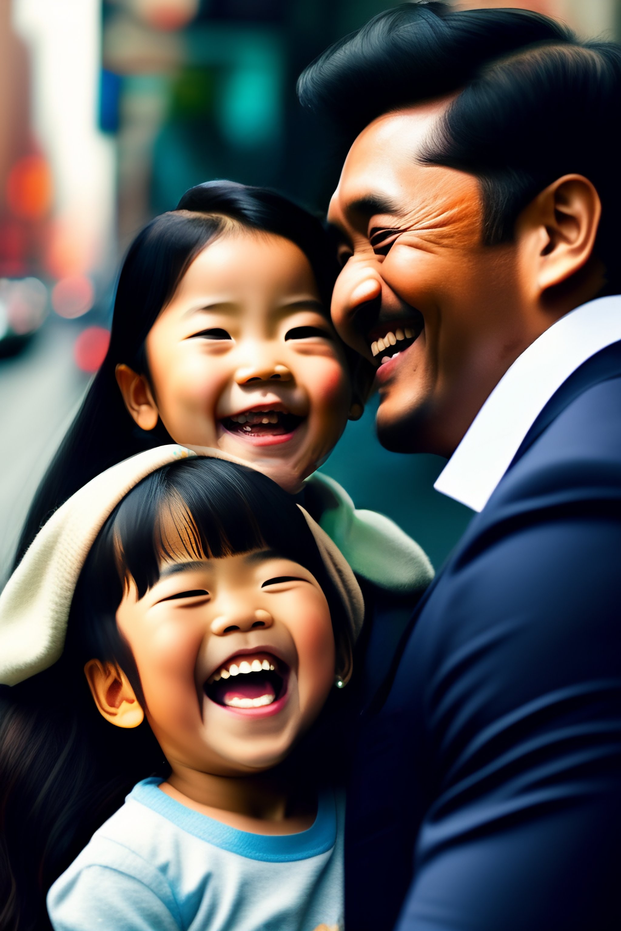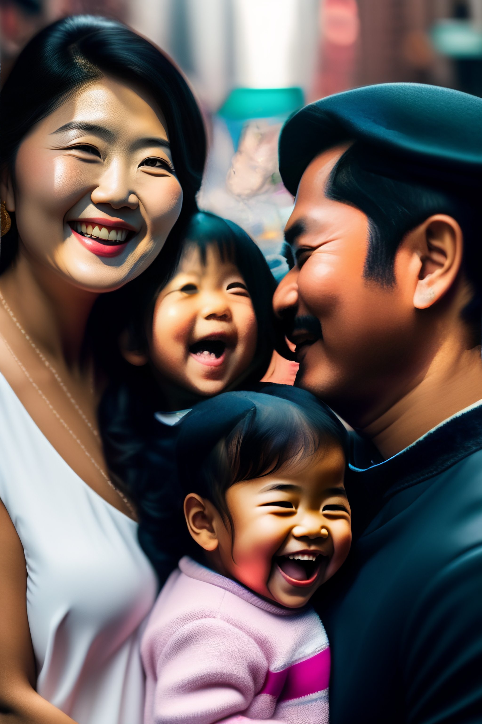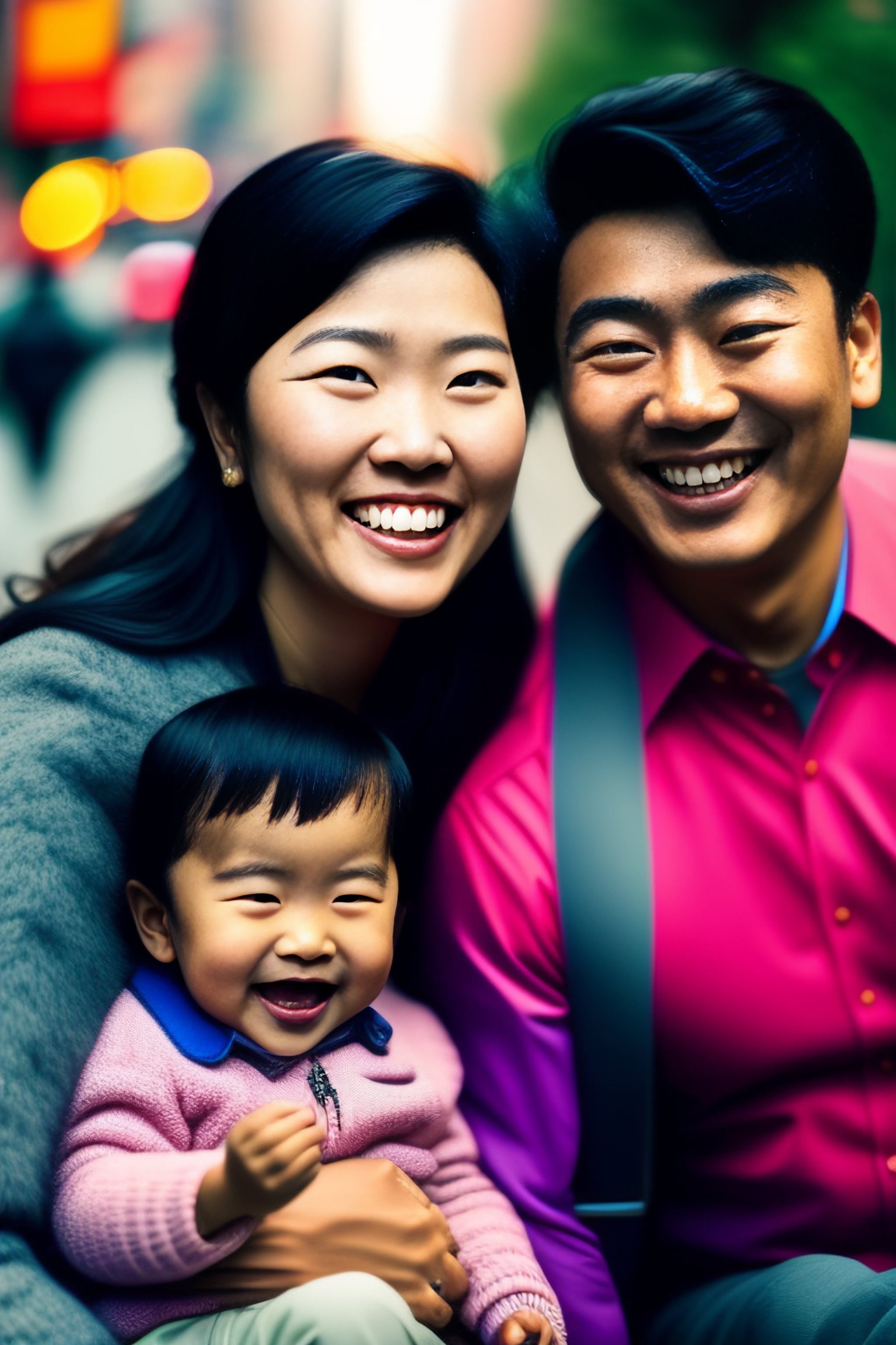 Korean mom and indian dad with 3 year old son and 1 year old daughter laughing and playing together in new york city