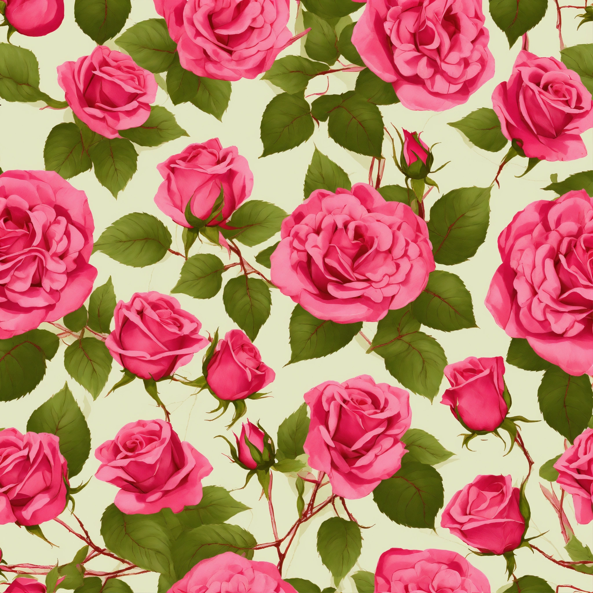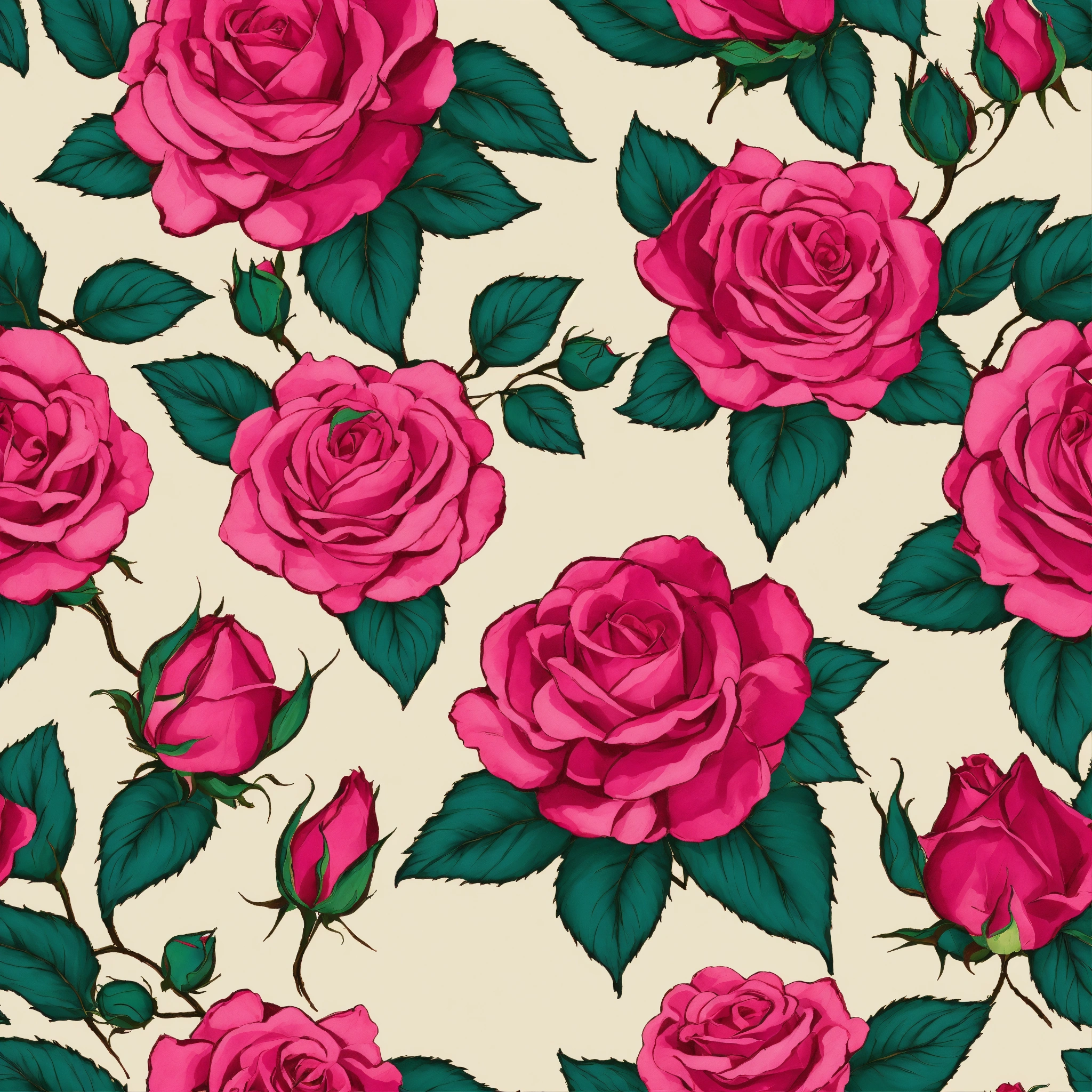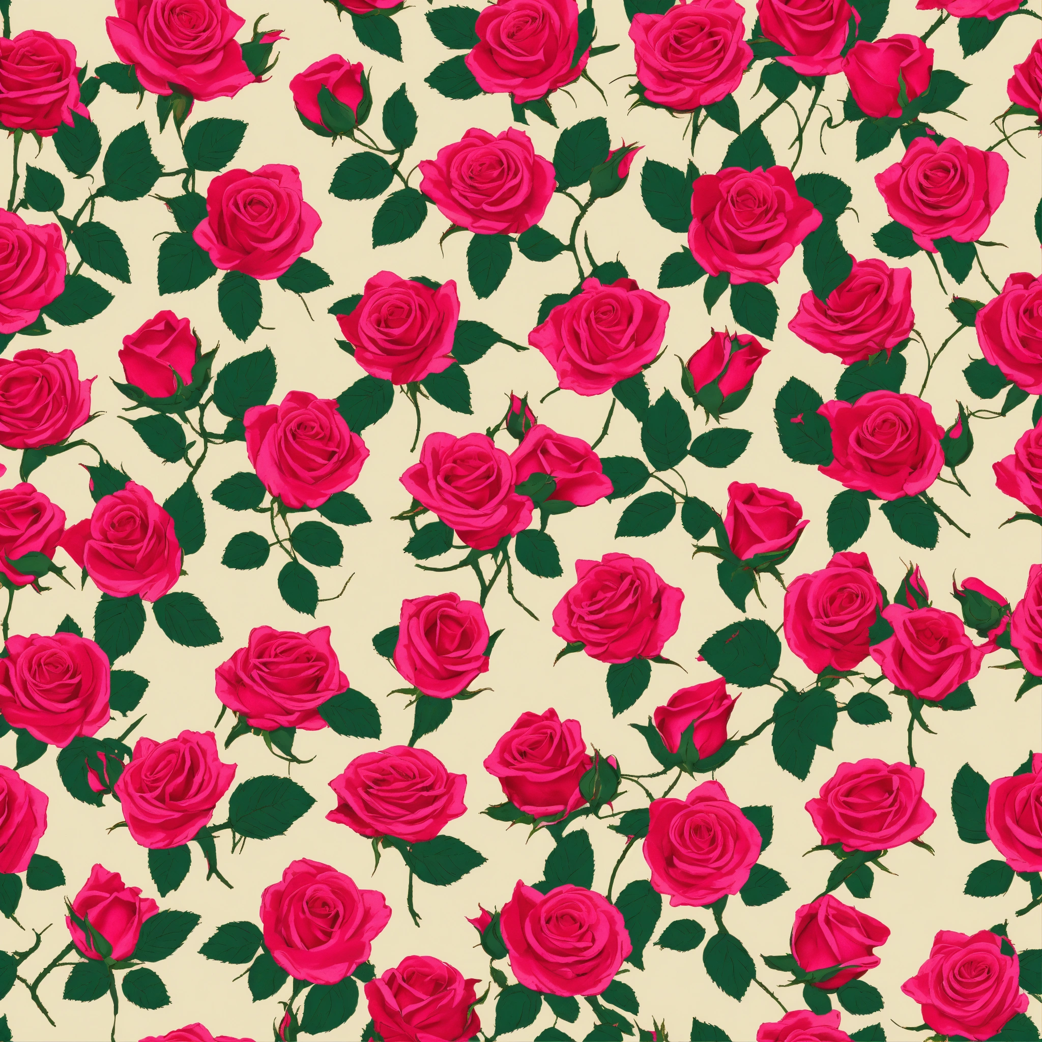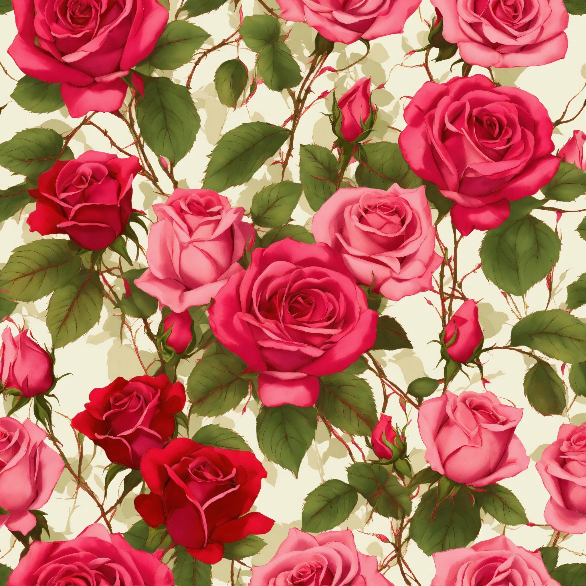 Create a seamless pattern with many small pink and red rose buds on a criss-cross vine design, contrasting off-white background, the design must be seamless, illustration color drawing, 16k