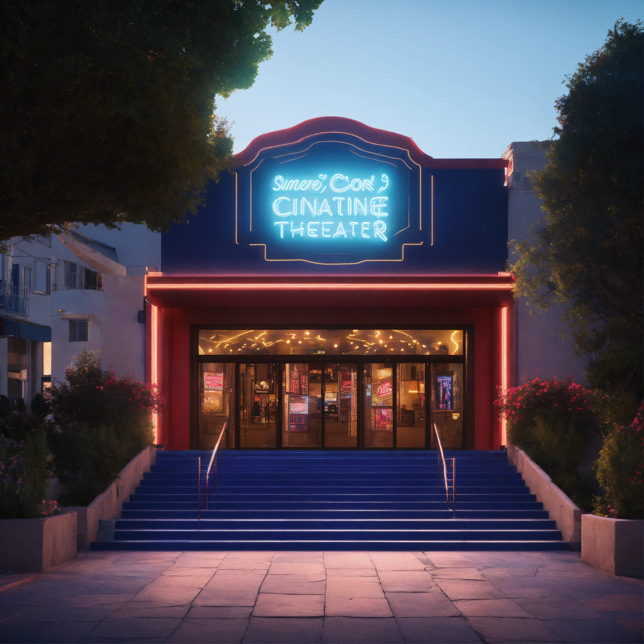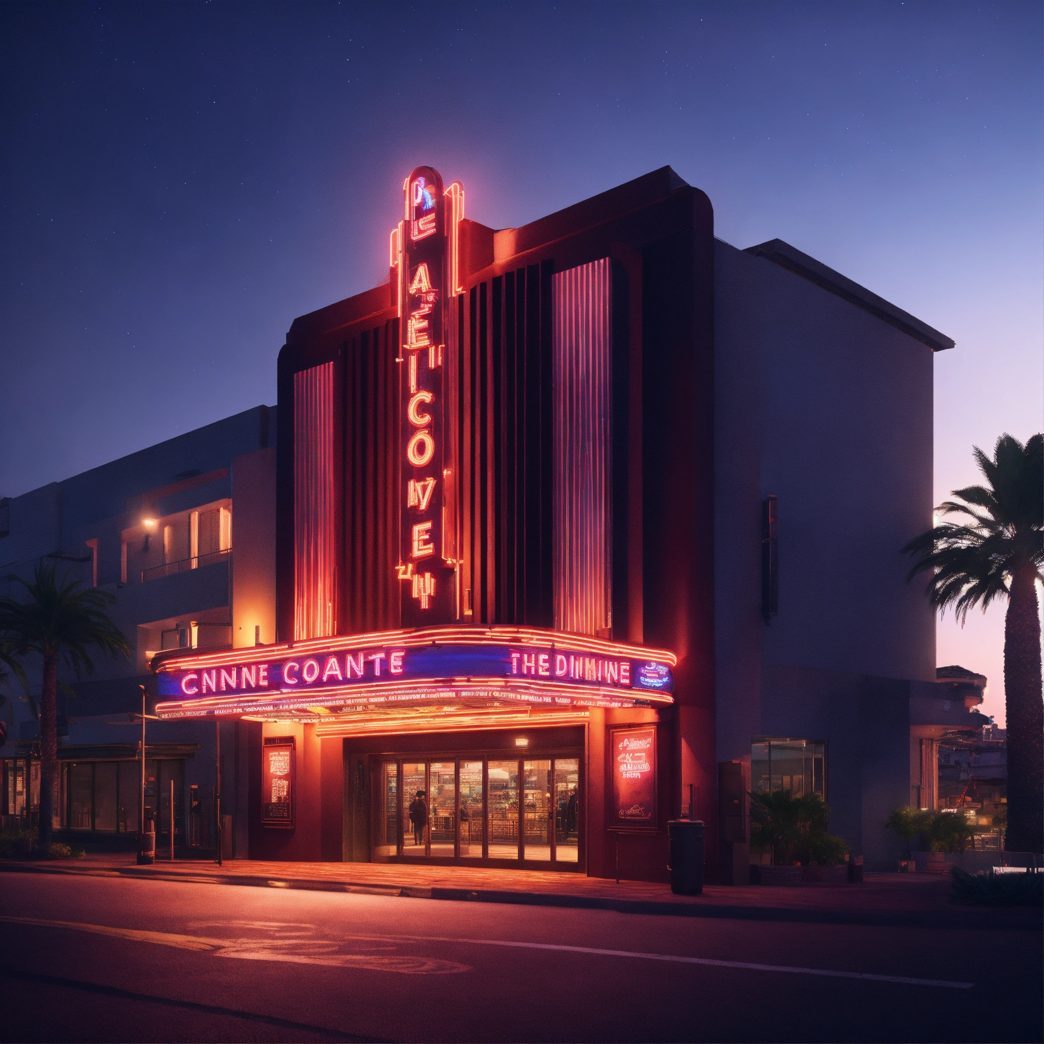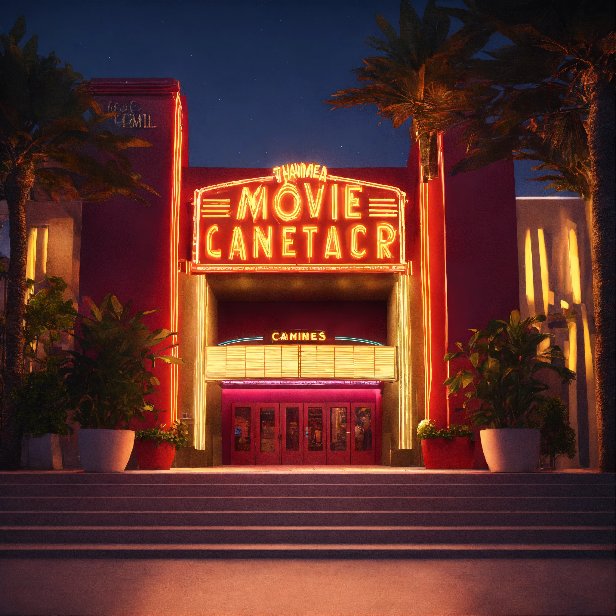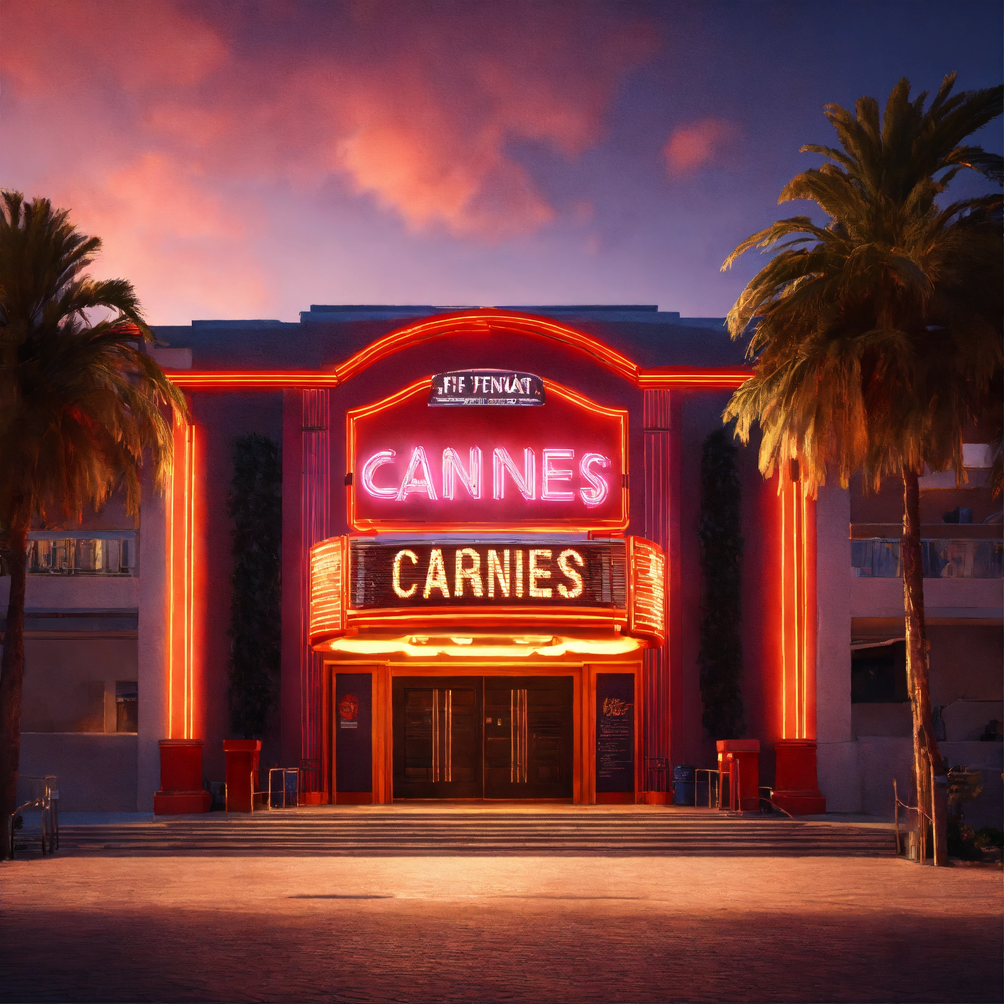 Outdoor entrance movie theater, day, summer, cannes, lettering neon, cinematic diffused lighting, movie theather, vibrant, 8k, unreal engine, wide shot