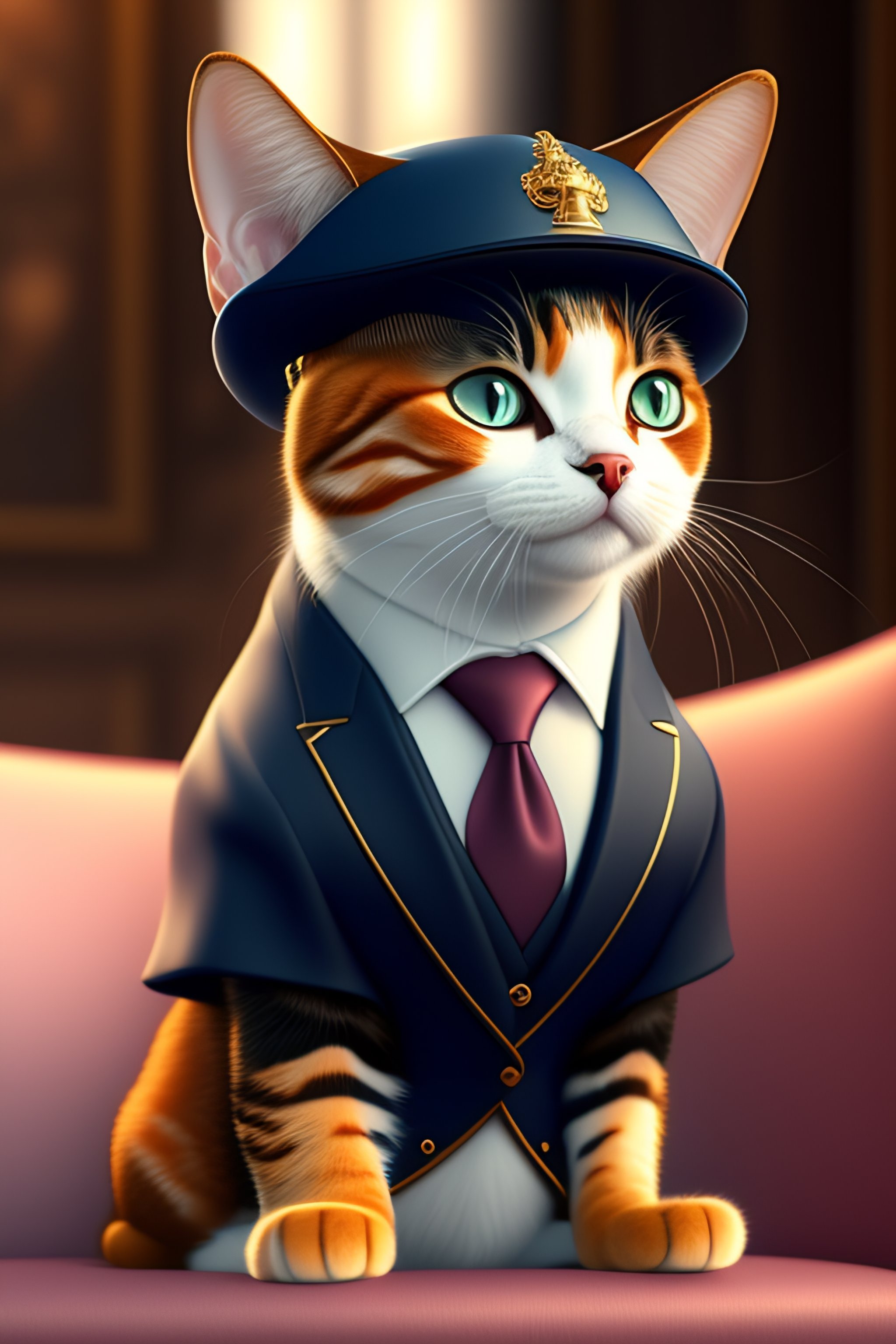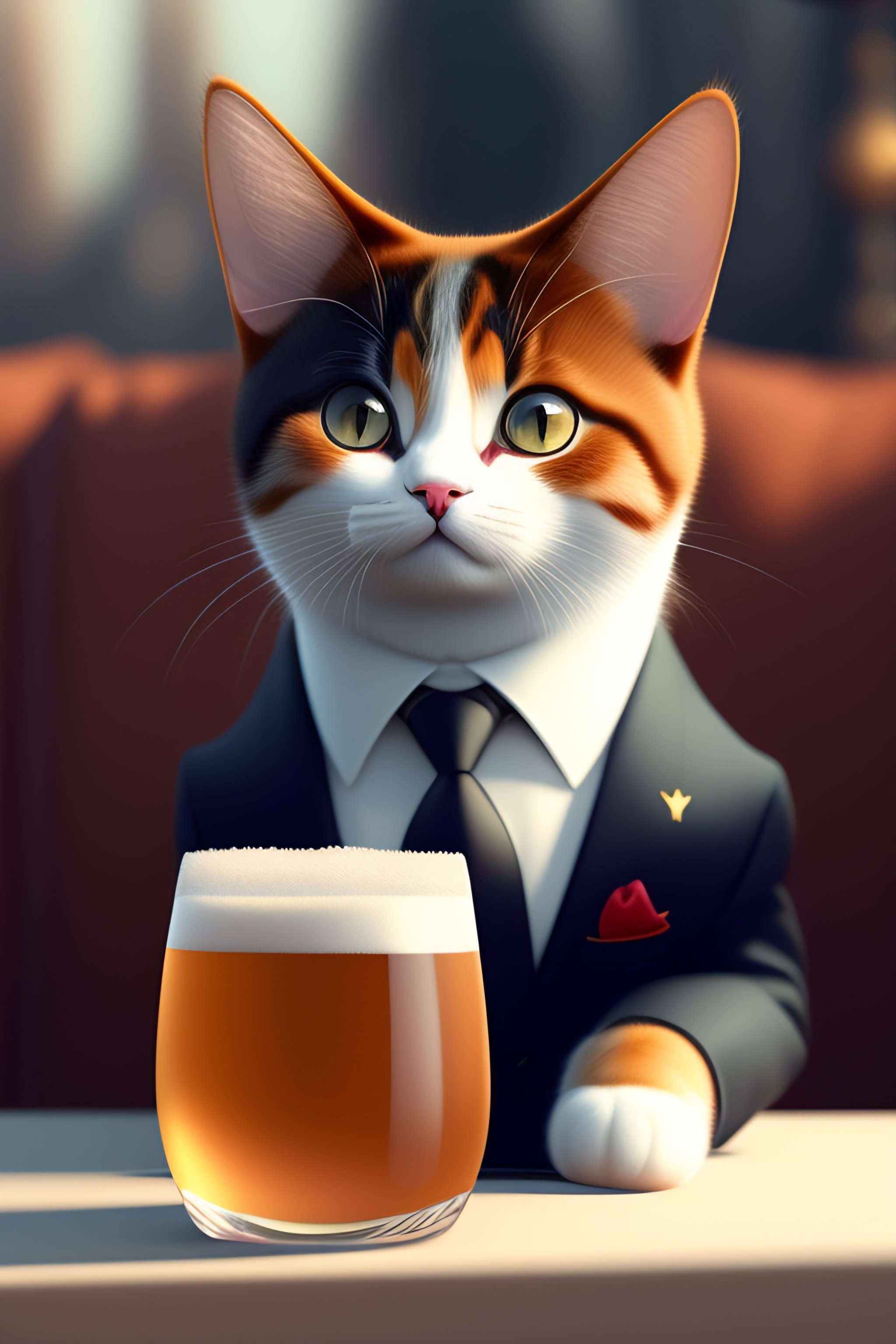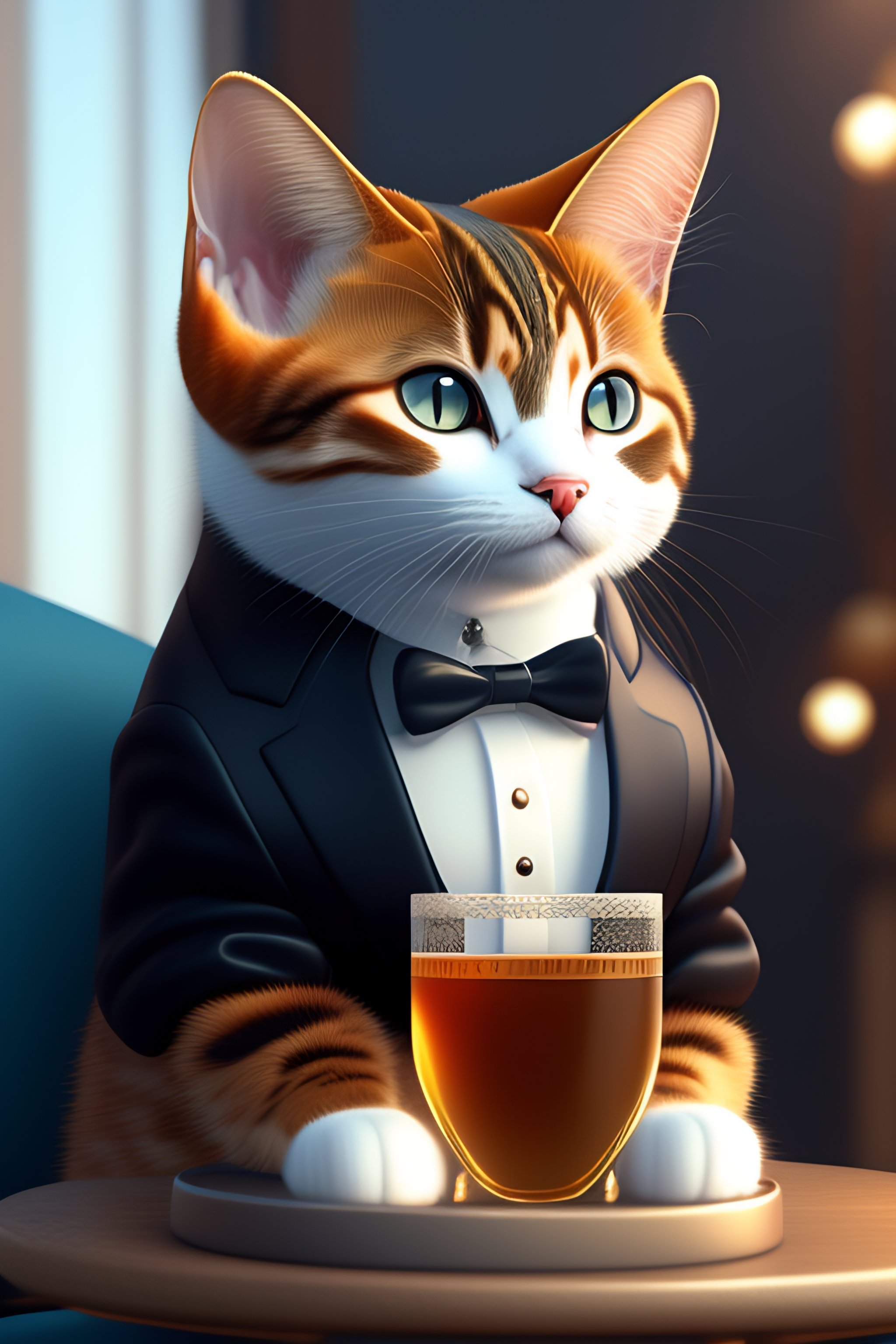 Cute and adorable cartoon cat inu with cap, fantasy, dreamlike, city scenario, surrealism, super cute, trending on artstation calico with 3 piece suit, sitting in a lounge drinking martini . hyper realistic, ultra realistic, 8k