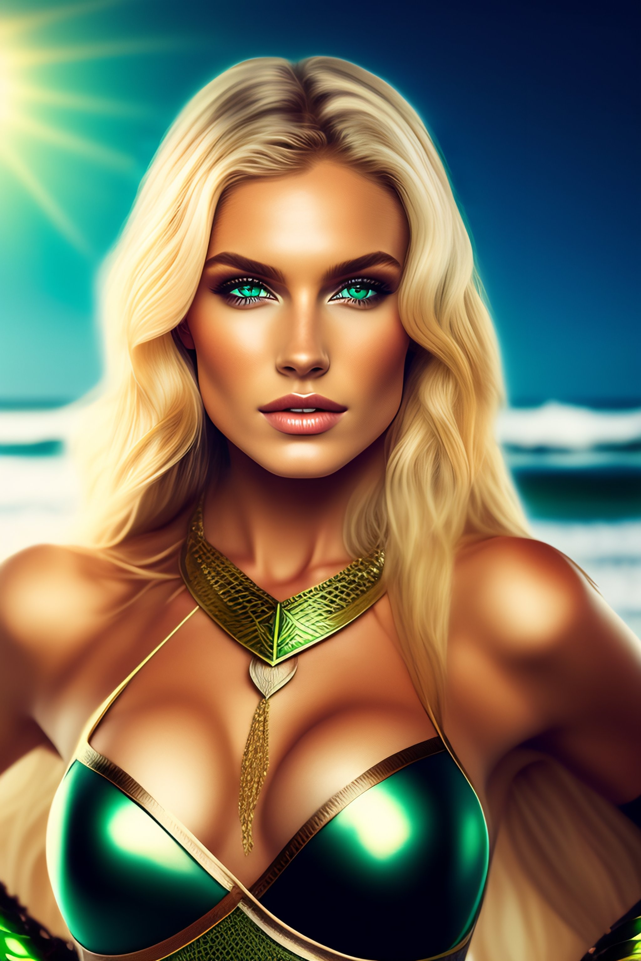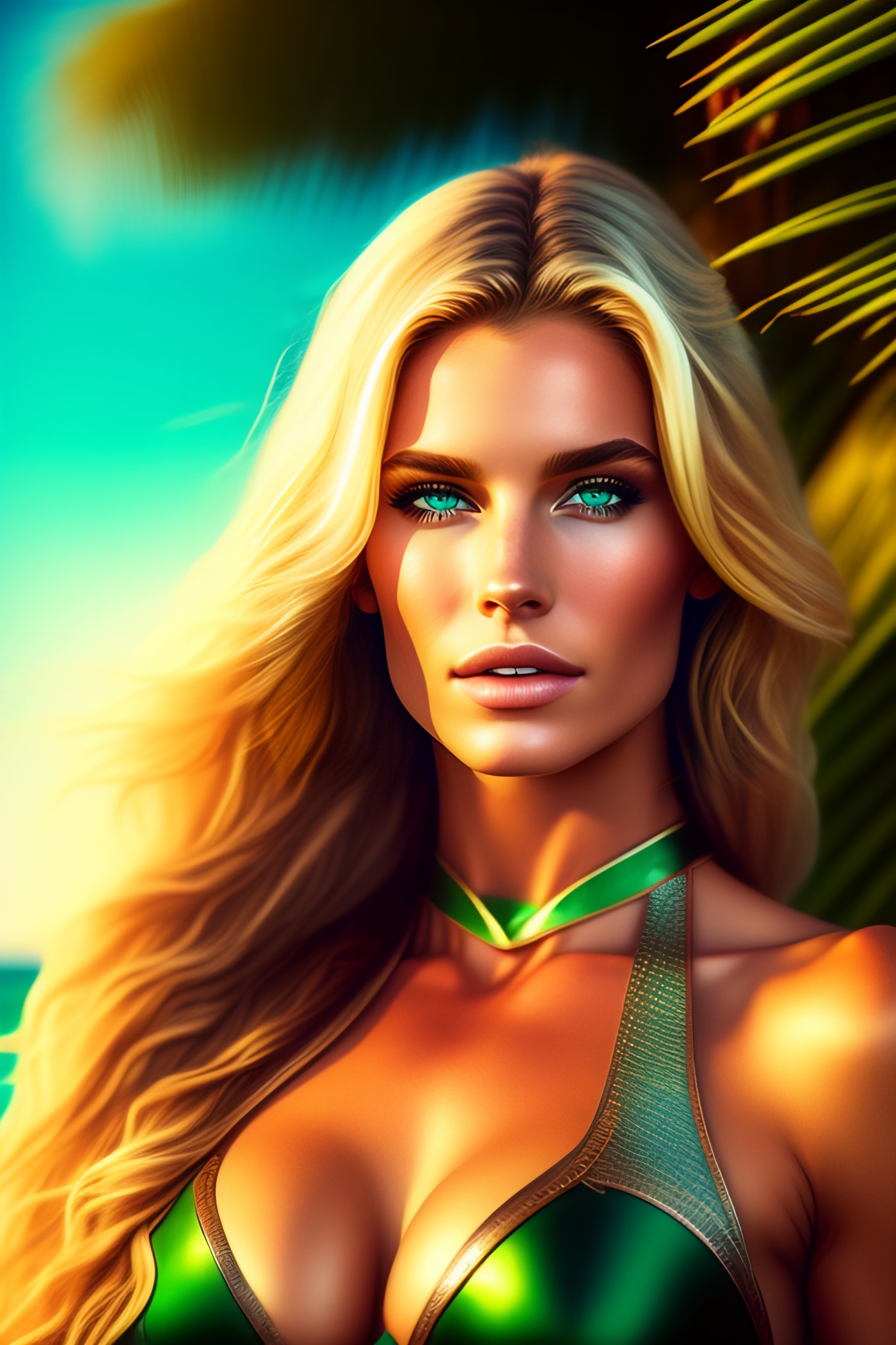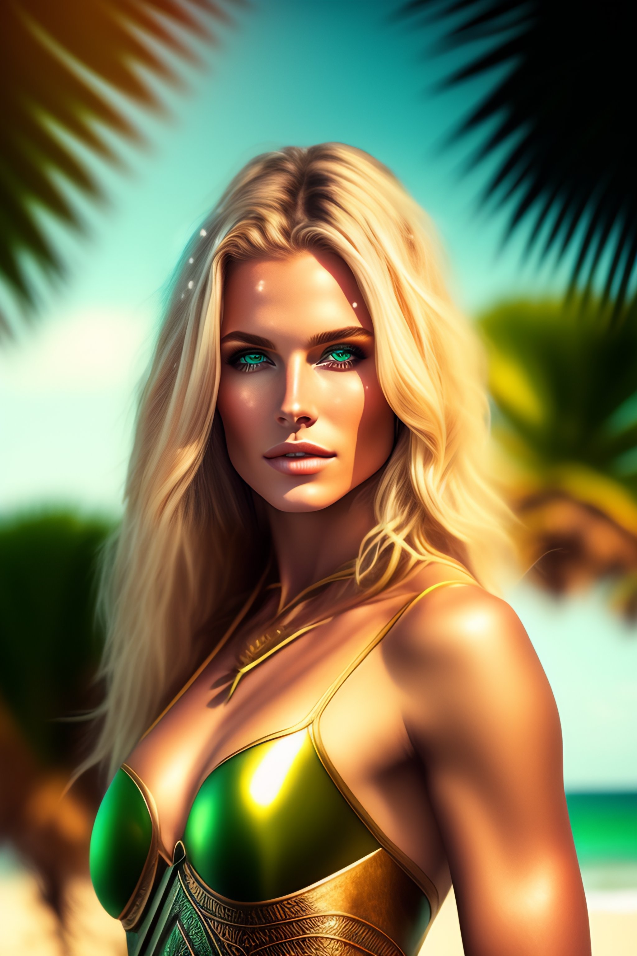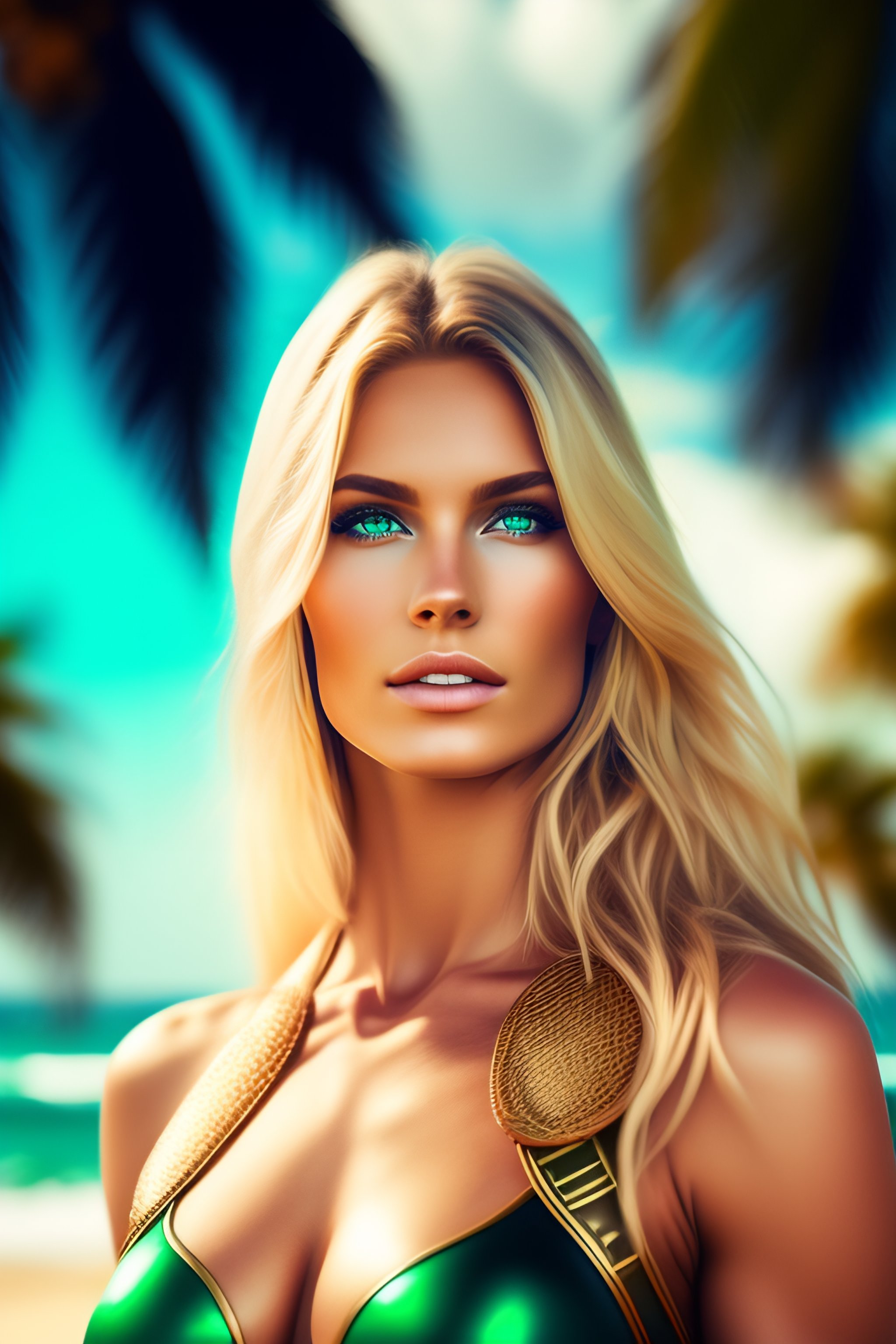 Sexy girl, super hero, beautiful green eyes, skinny, viking girl, viking, | body | real photo : clear background: blonde, beach, palm trees, sun, sand