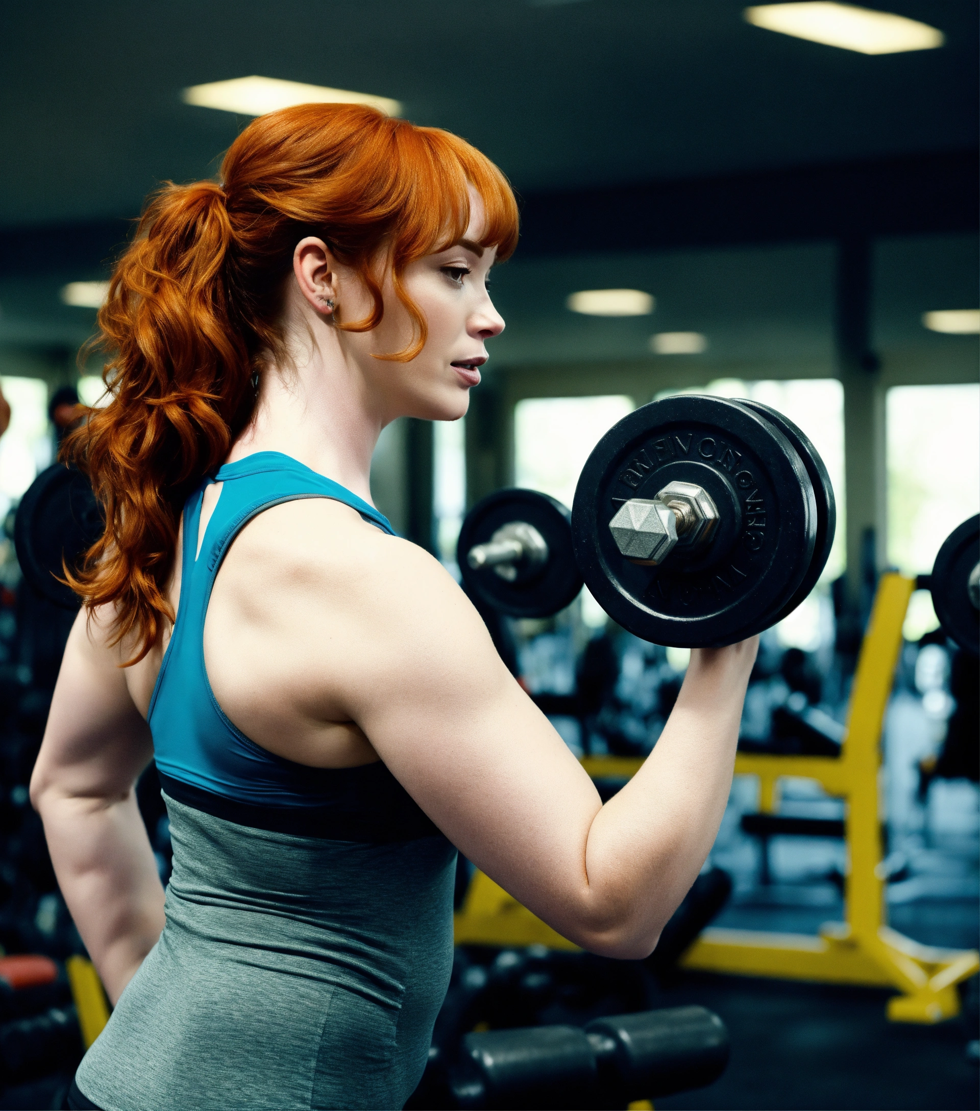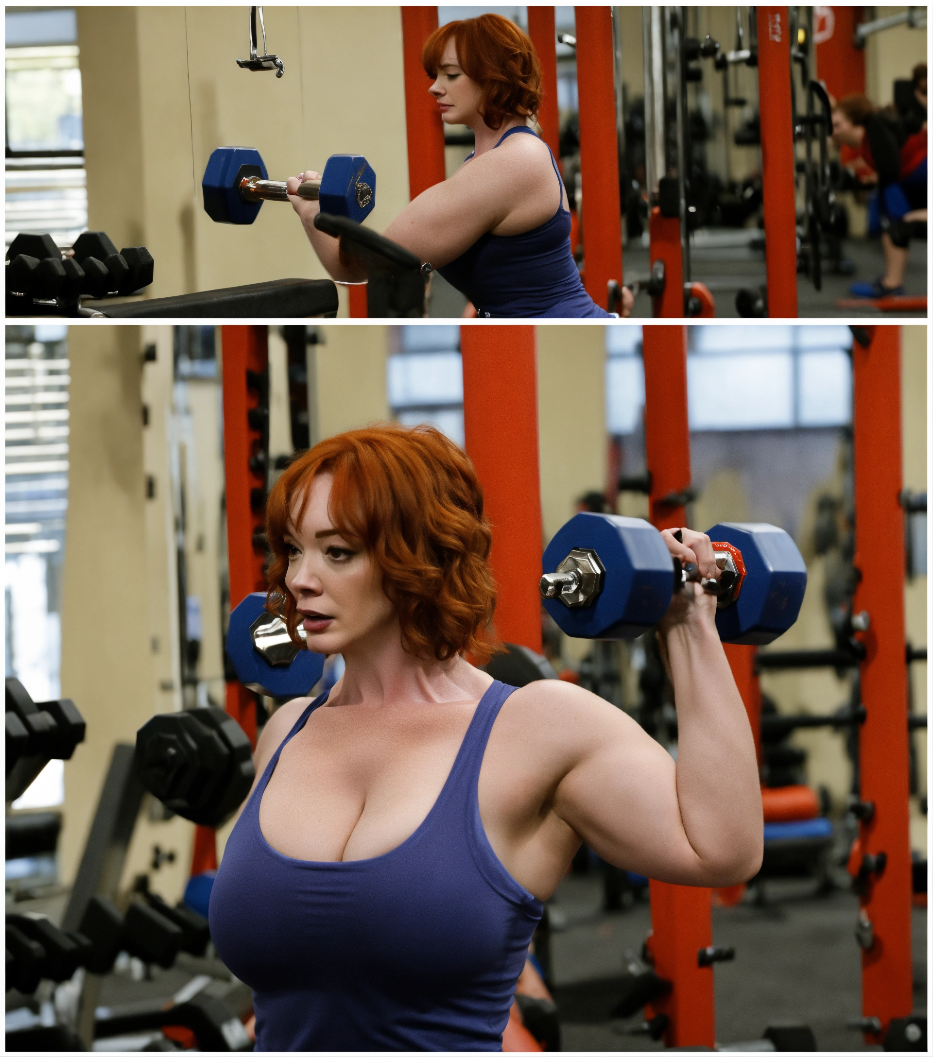 Christina hendricks, working out in gym, younger, side view, full figure, lifting dumbell, cut top, up front