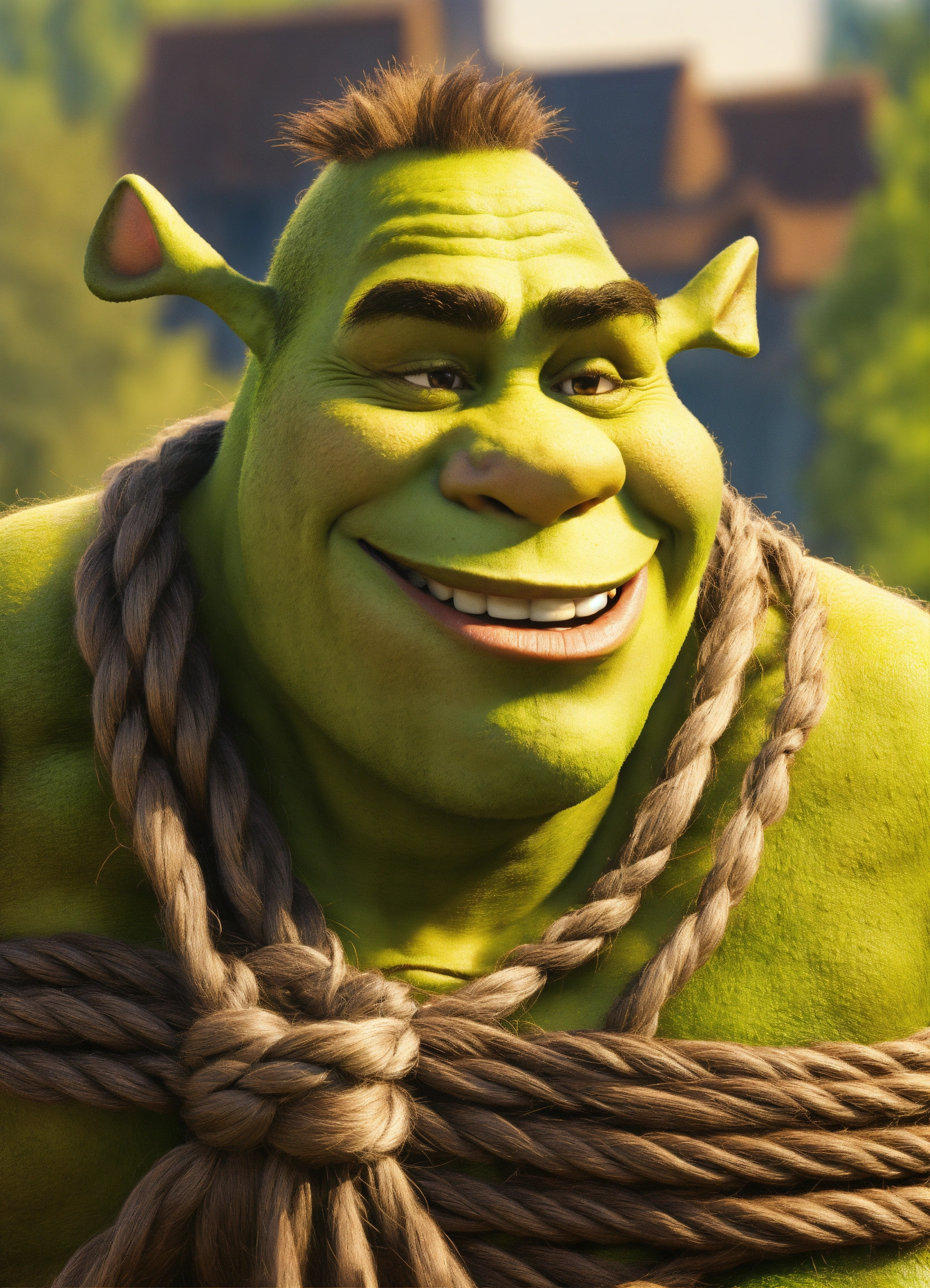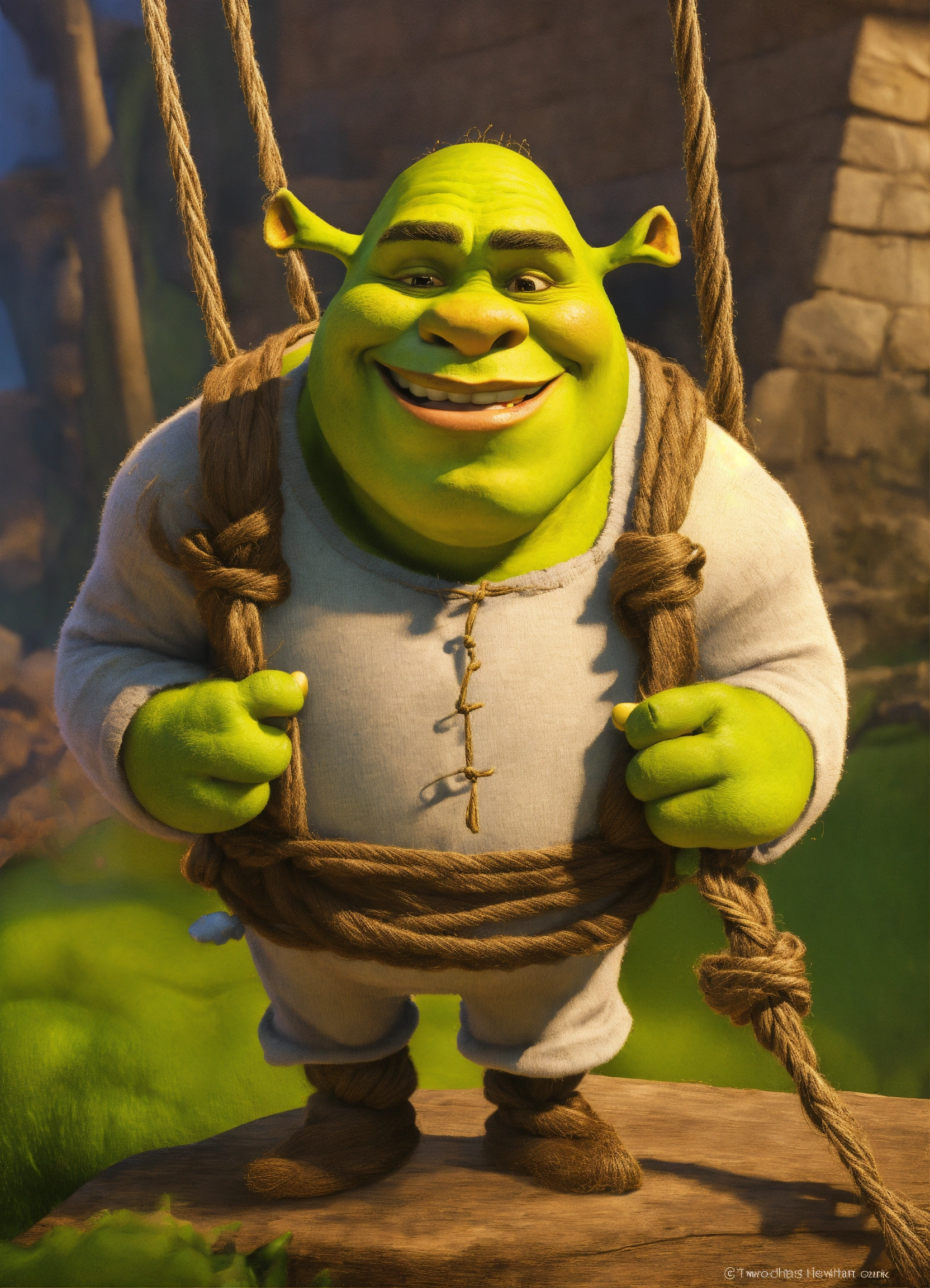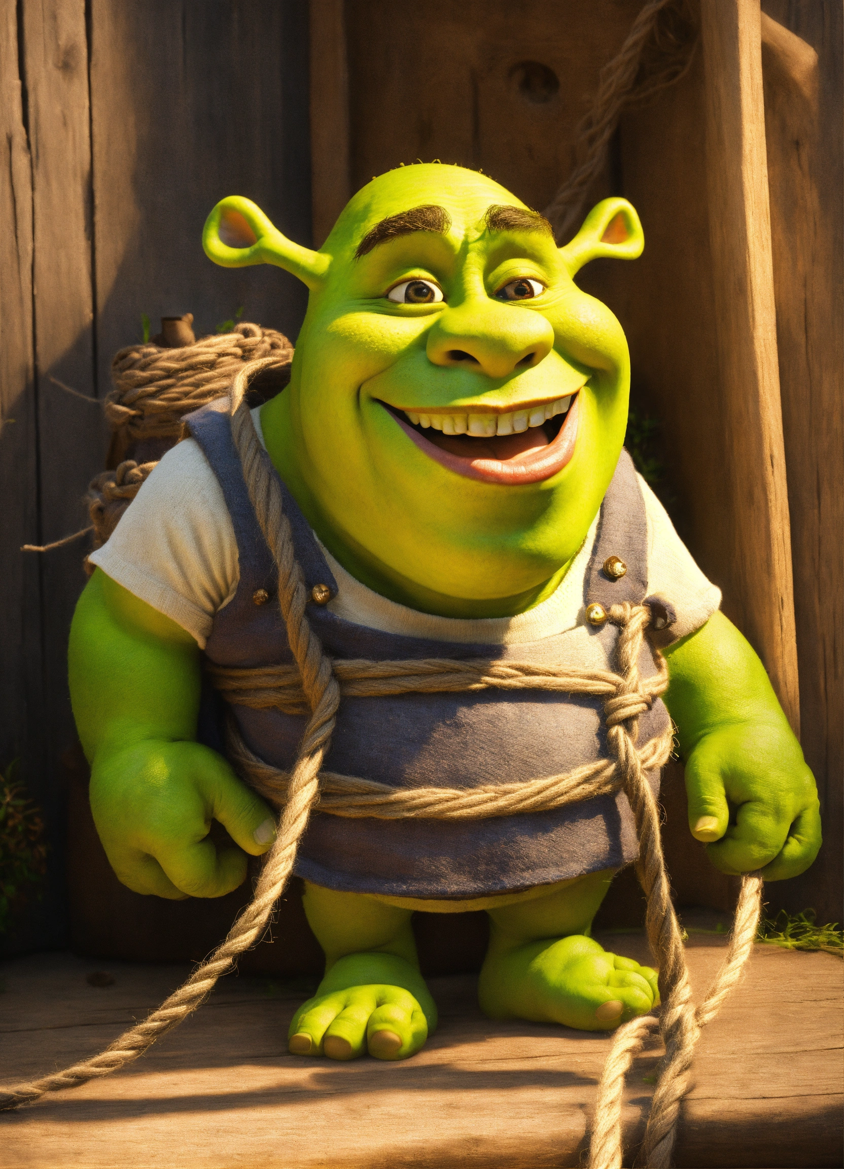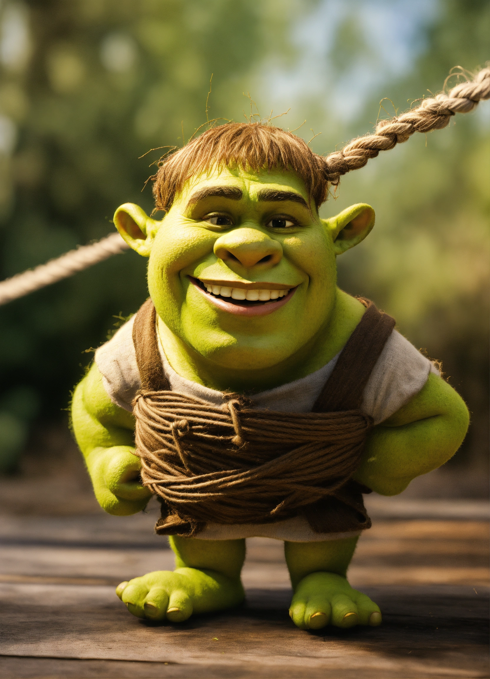 Shrek tied with twine