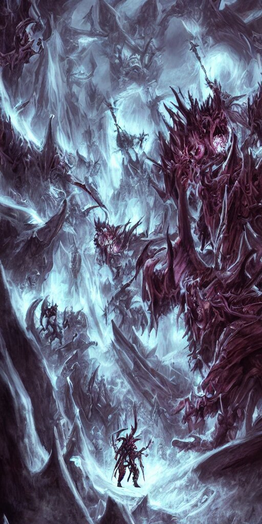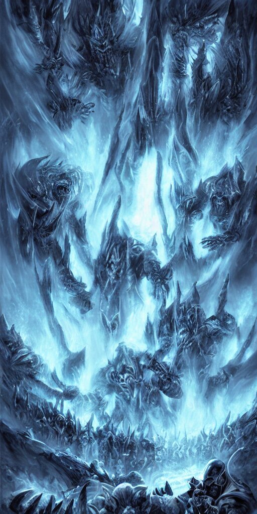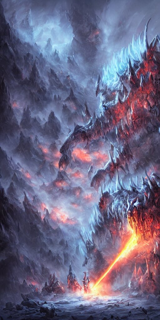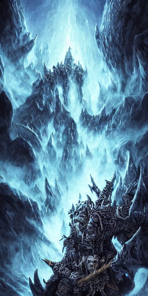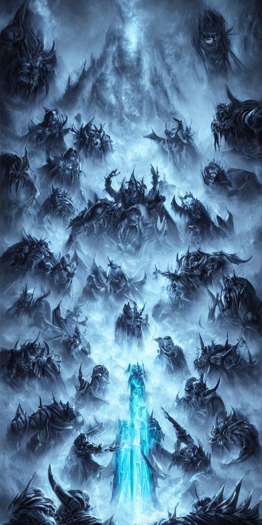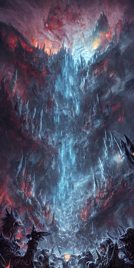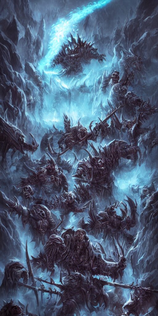 Vast ice dungeon, undead army, fire lightning, warcraft, warcraft artwork, mixed art, cinematic light, majestic, hyperrealistic, hyper detailed, dark fantasy, gritty