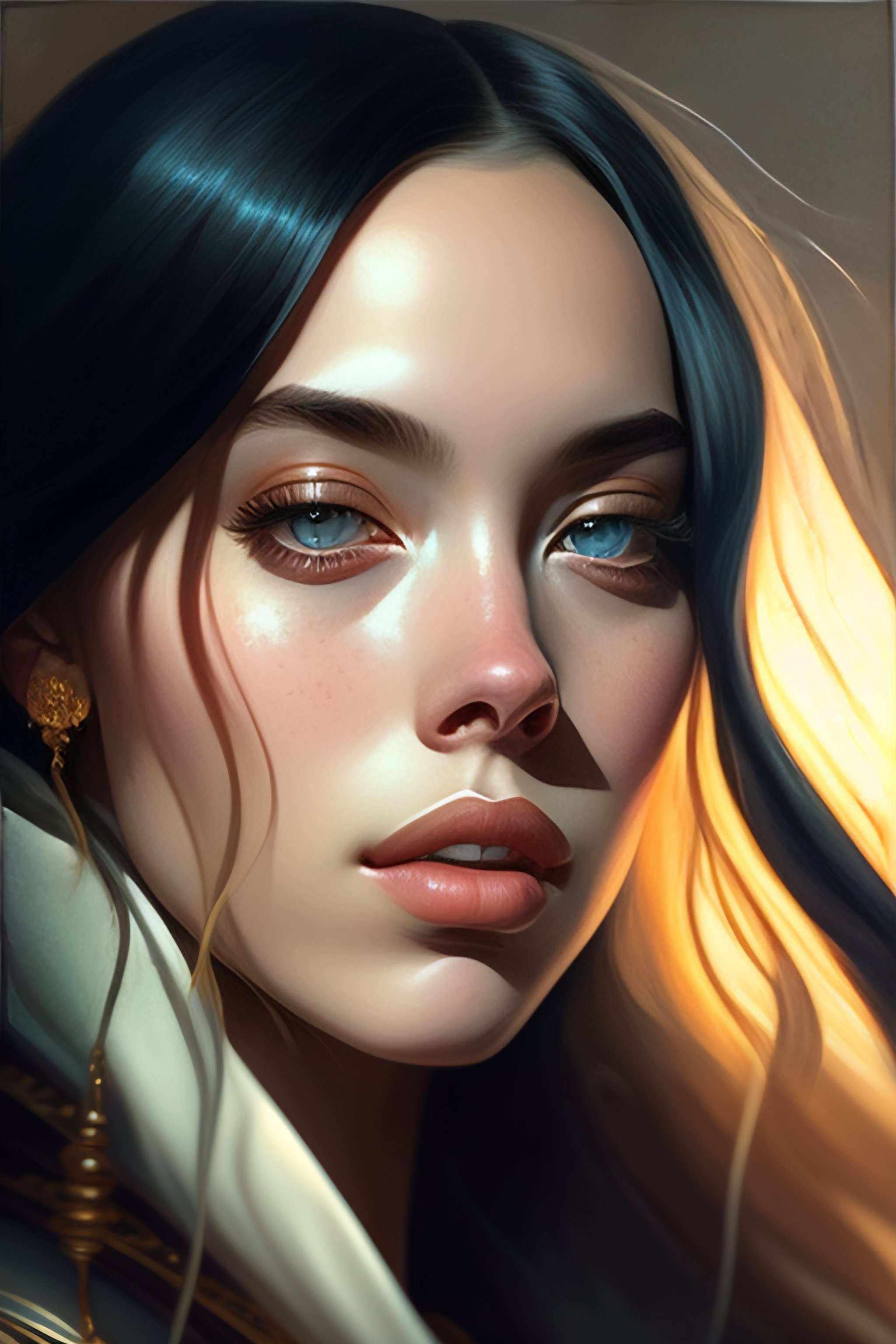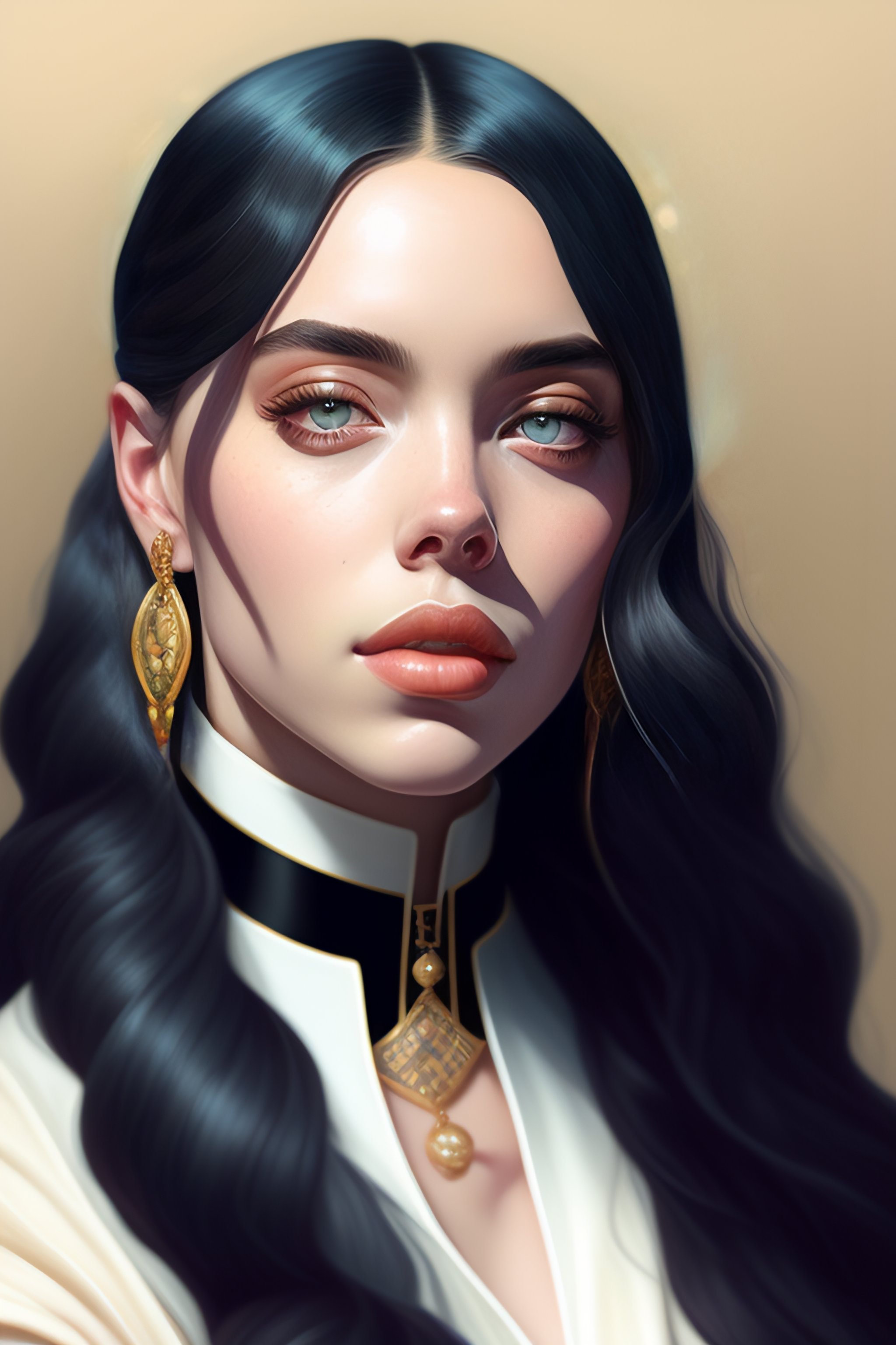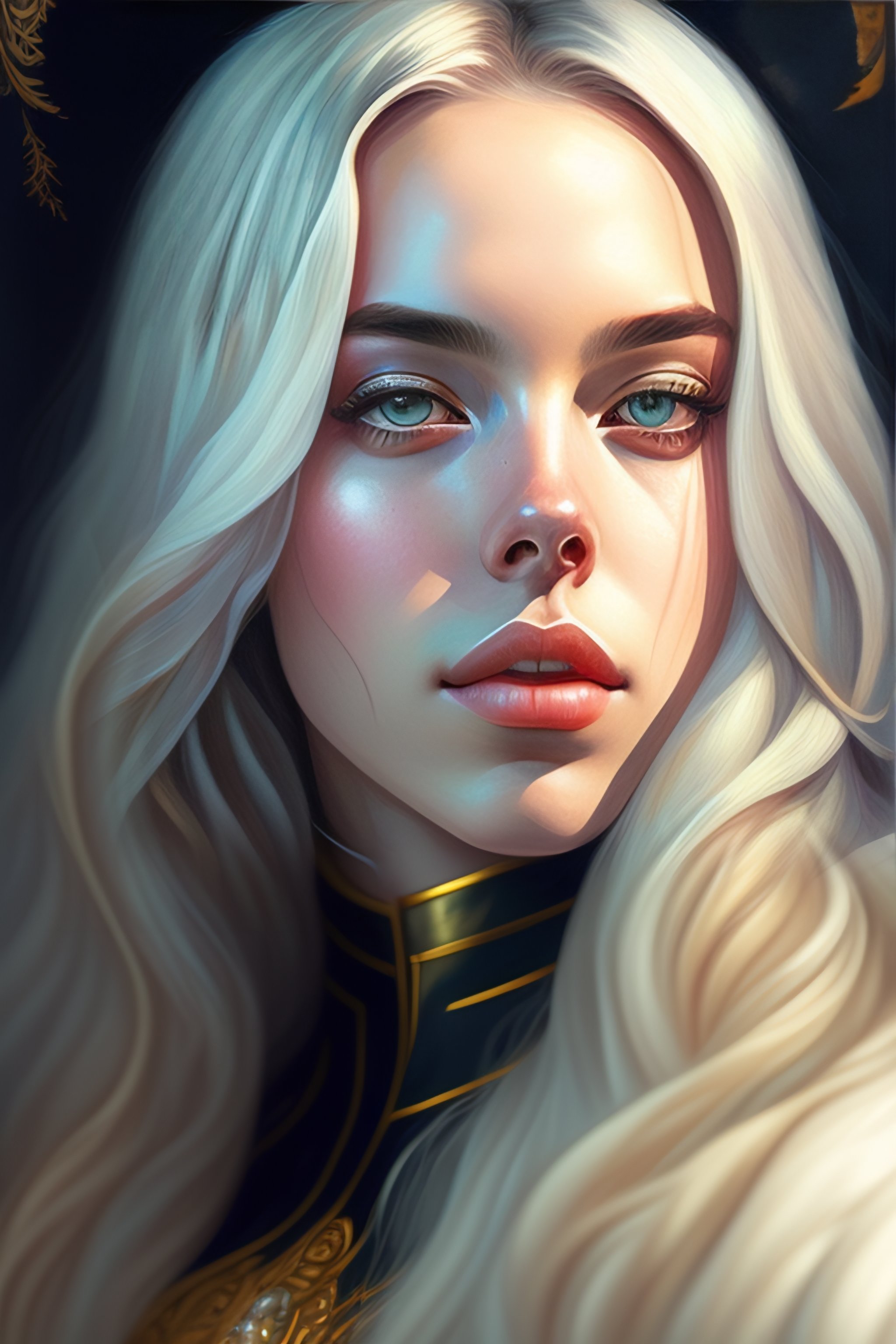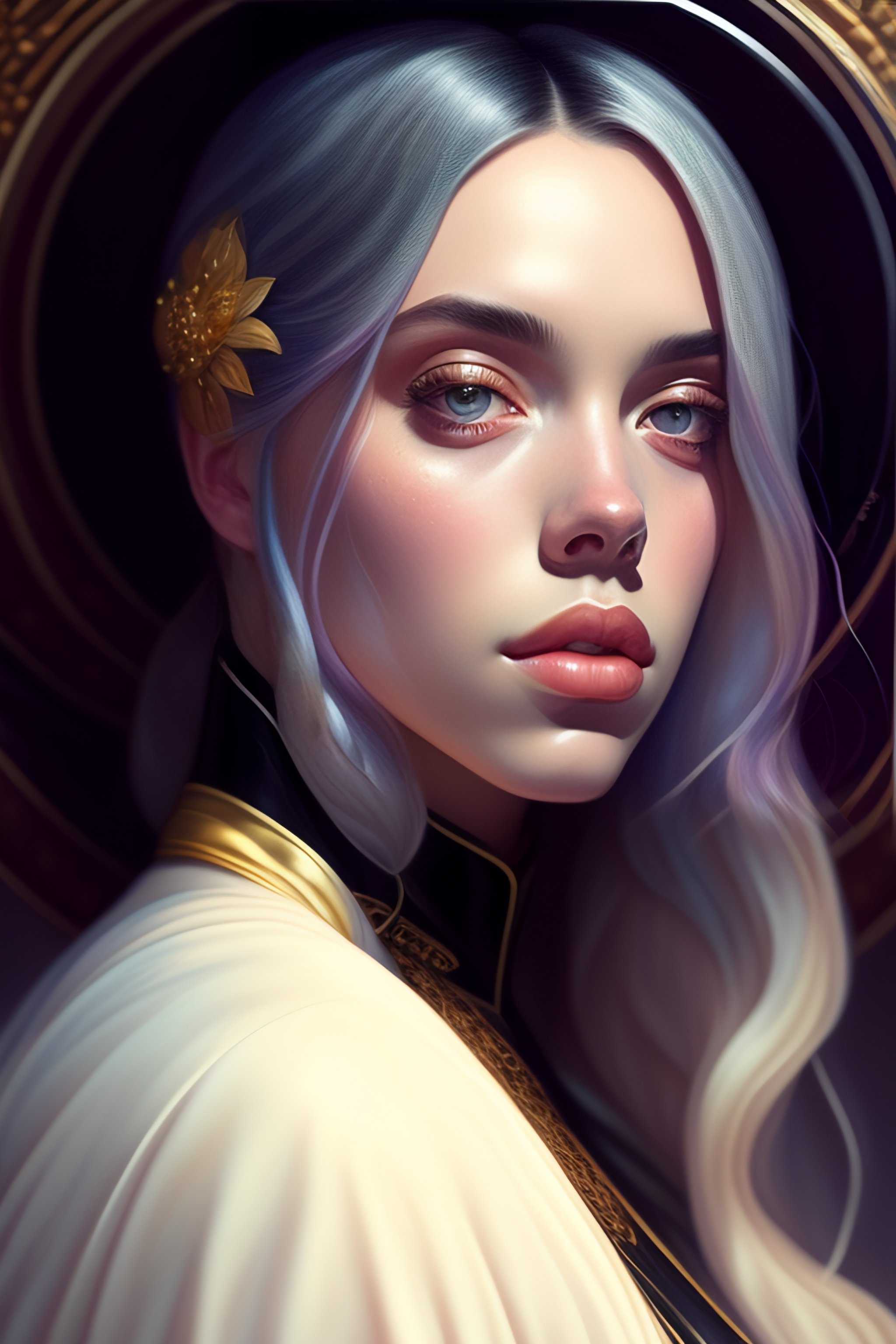 Portrait of billie eilish, intricate, elegant, highly detailed, my rendition, digital painting, artstation, concept art, smooth, sharp focus, illustration, art by artgerm and greg rutkowski and alphonse mucha and uang guangjian and gil elvgren and sachin teng, symmetry!!