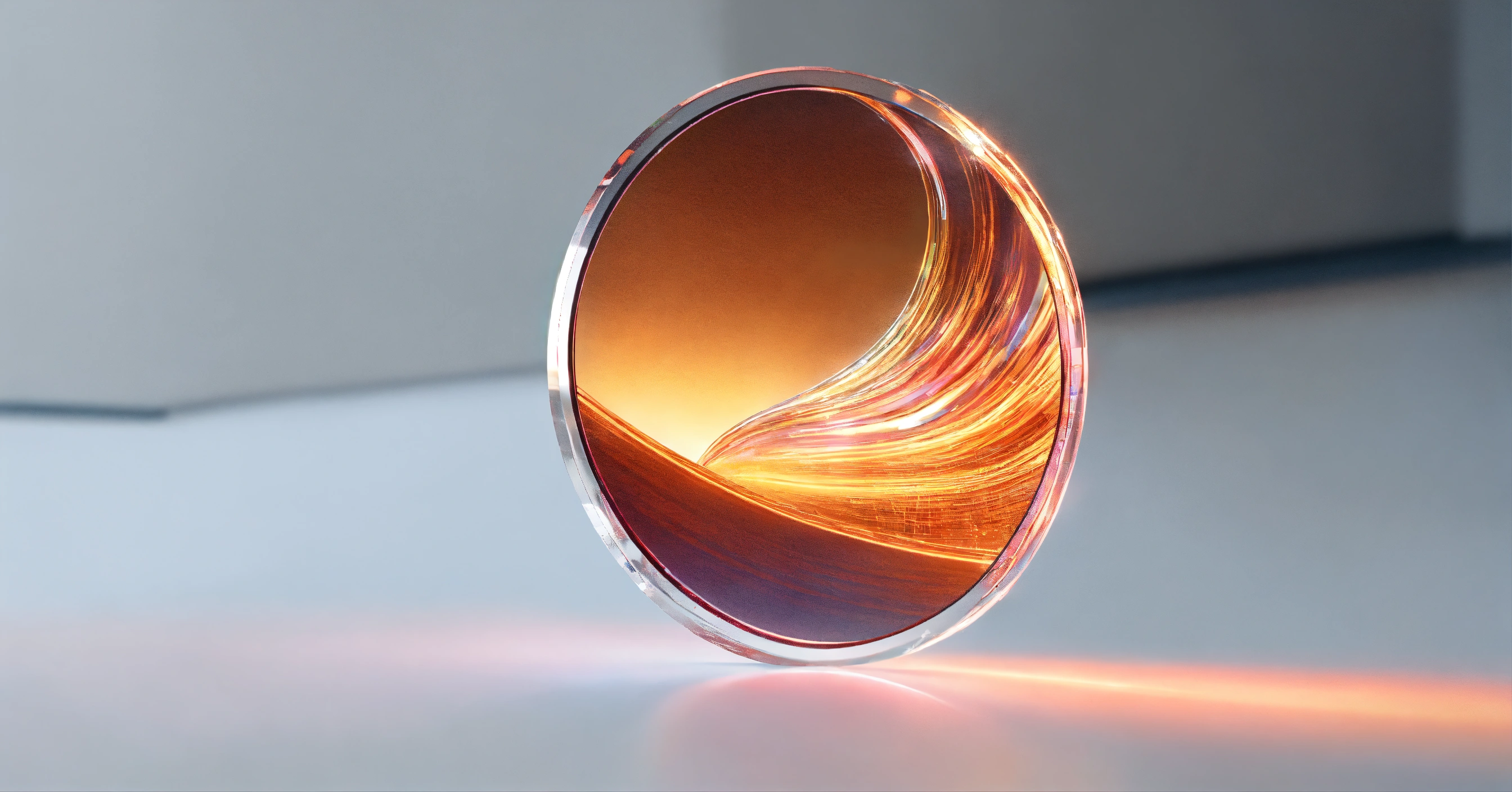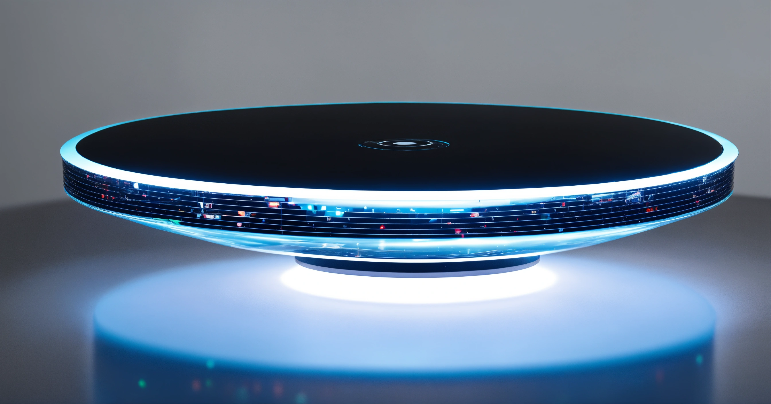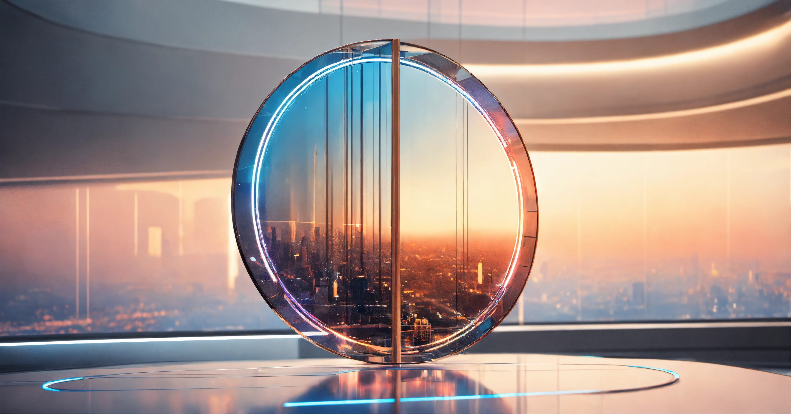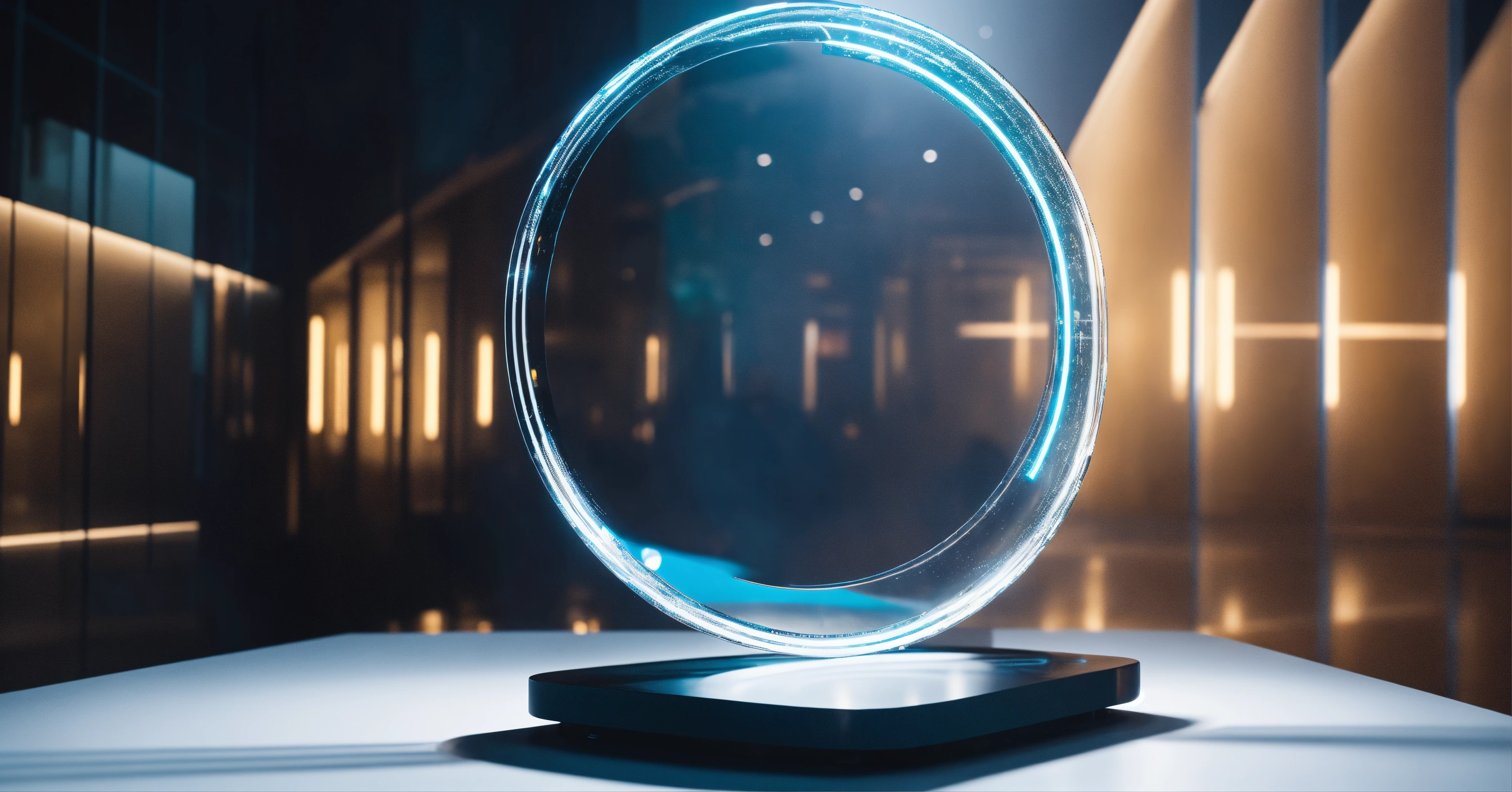 Thin glass circle, seen from a side angle with a rotated perspective. it is brilliantly illuminated and stands against a pristine white background, showcasing futuristic tech design, perfect for 8k resolution.