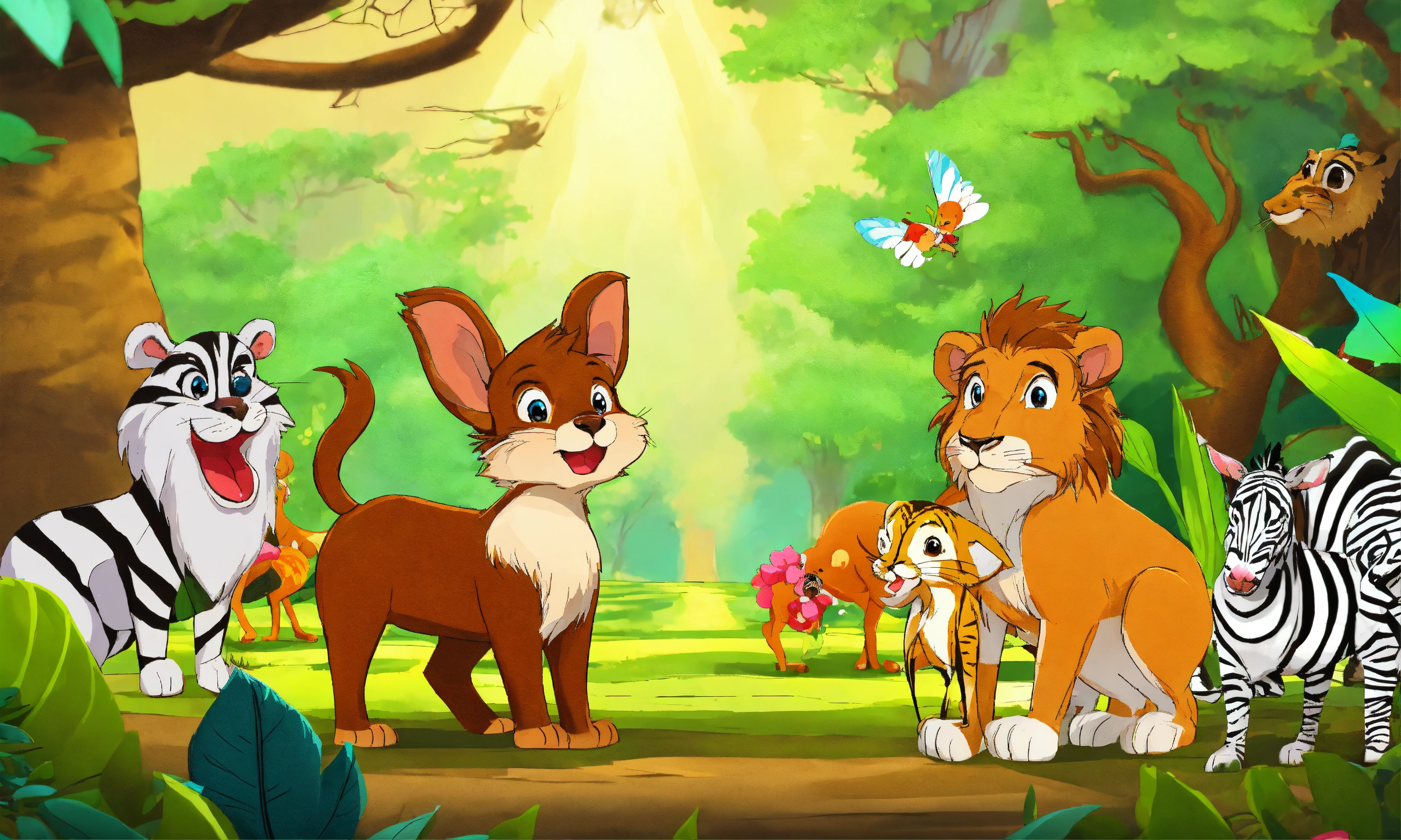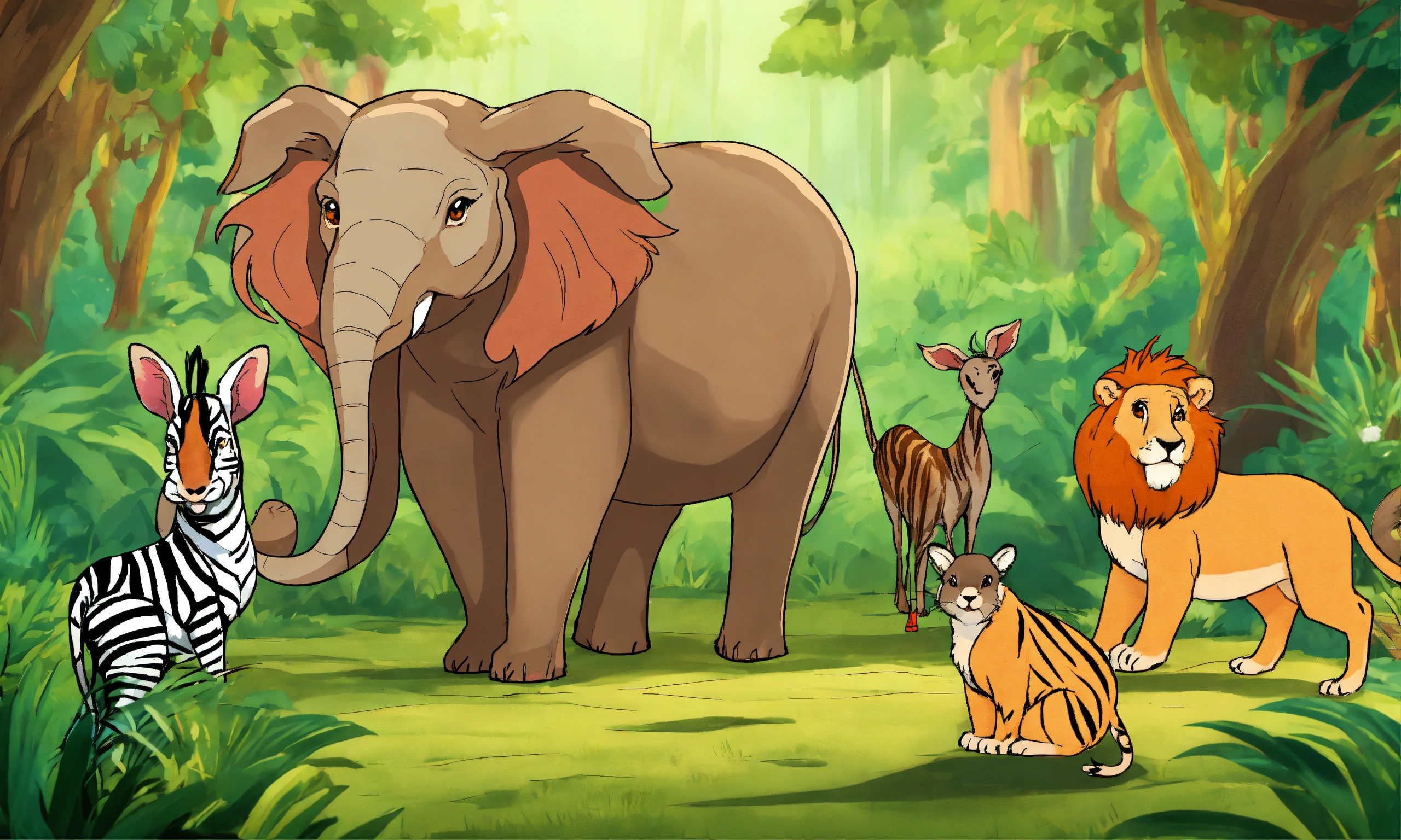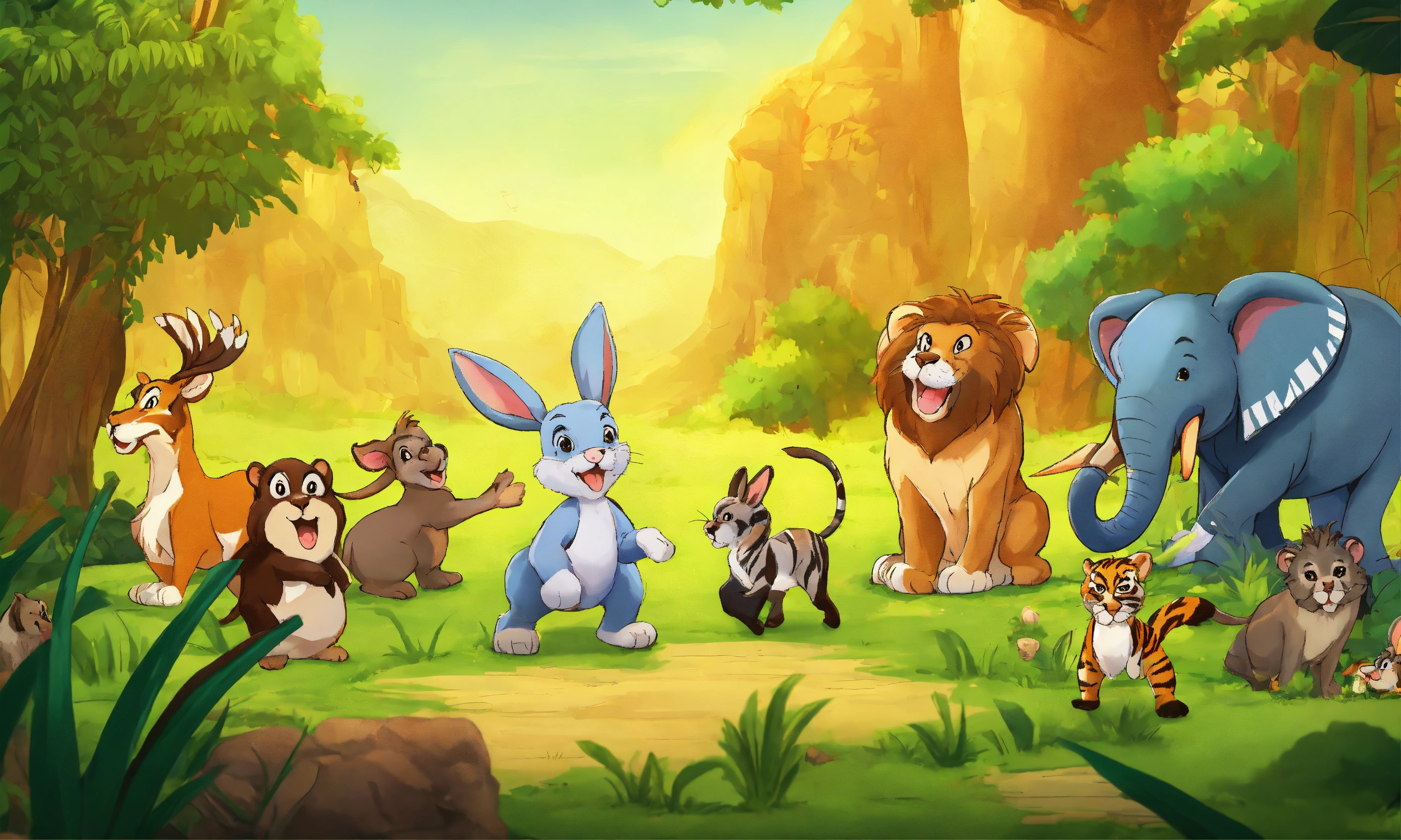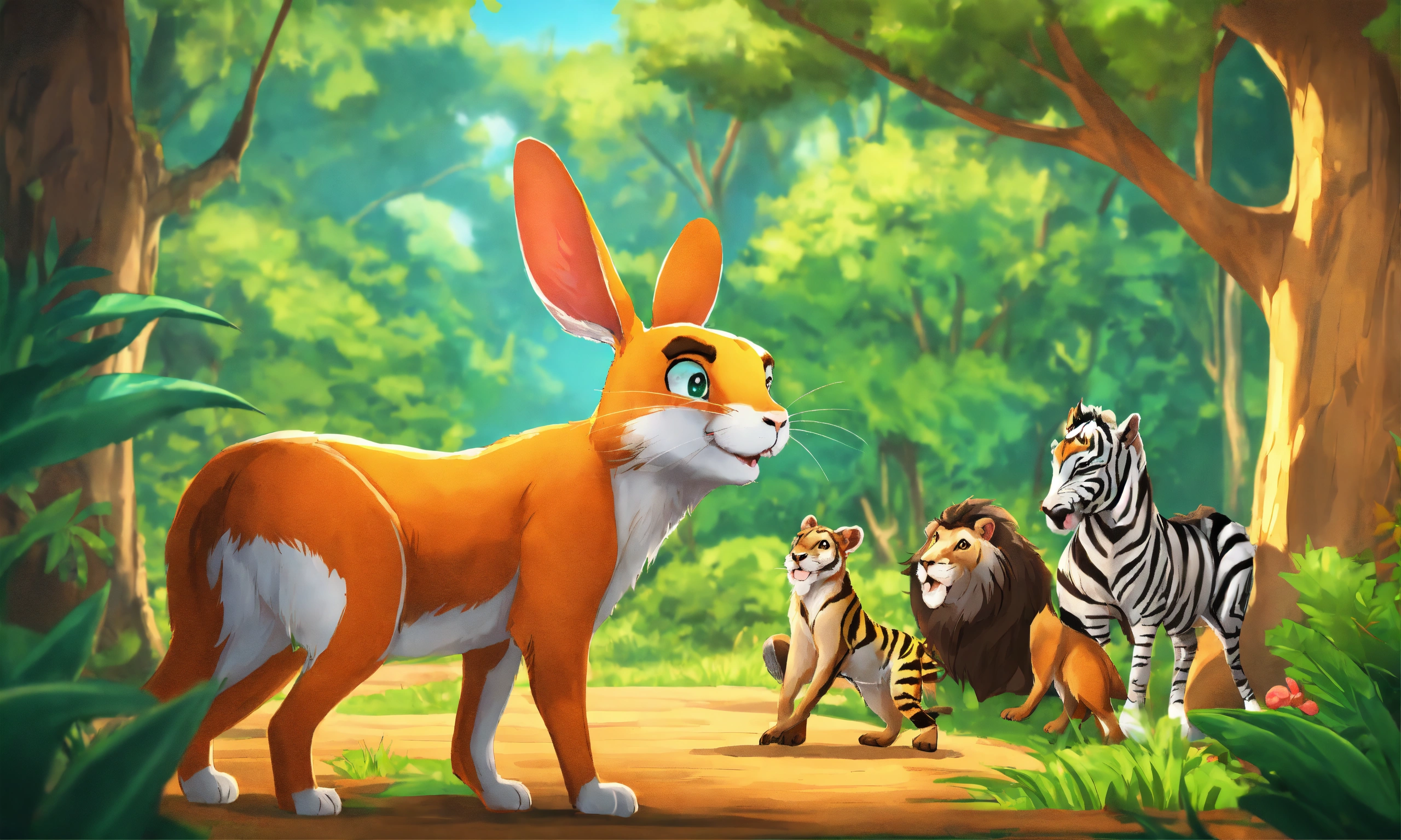 Cartoon rabbit is showing its presence in front of other jungle animals elephant wolf deer lion monkeys zebra bear for being faster