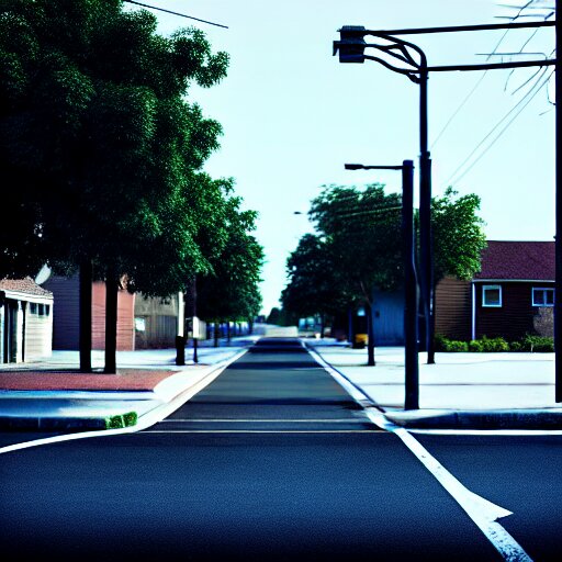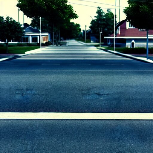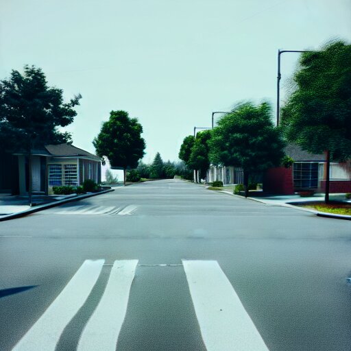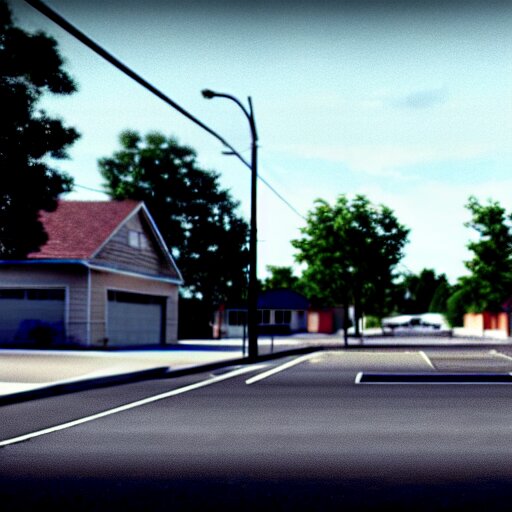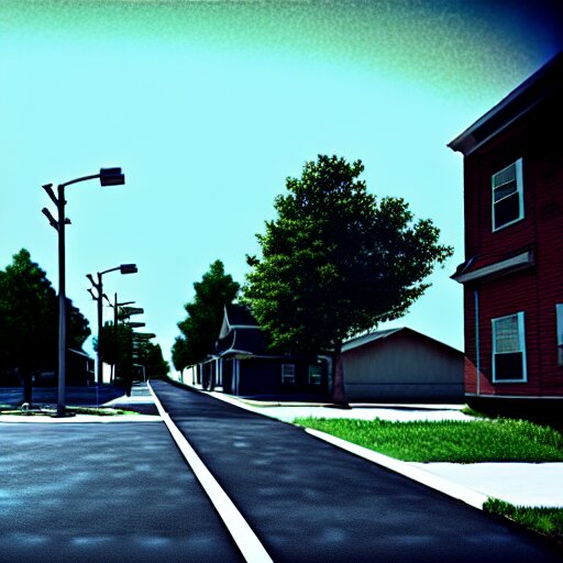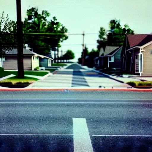 Grainy photograph of a liminal middle class american suburb, clean, empty street, broad daylight, noisy filter, octane render, 3d render, flat lighting