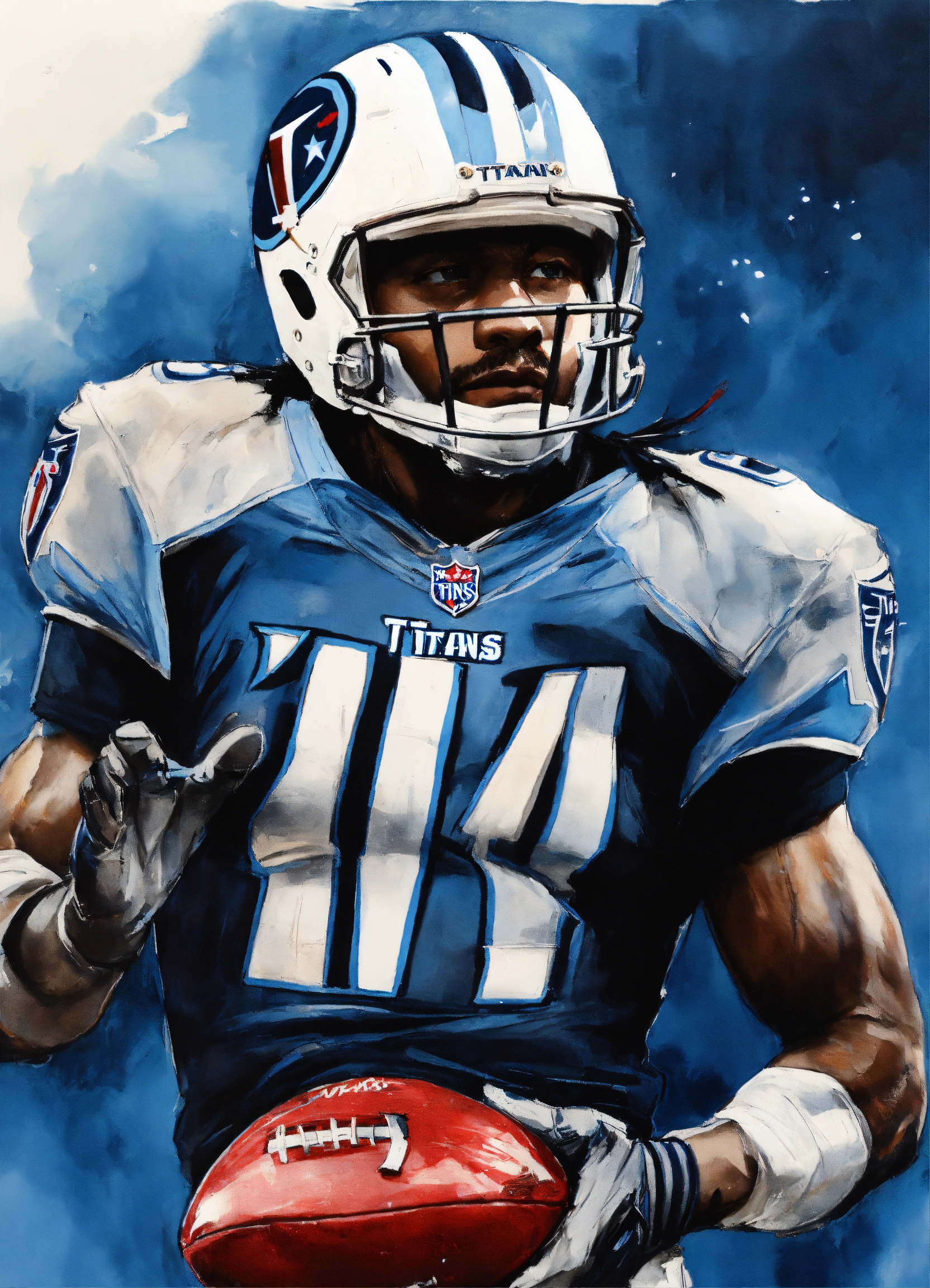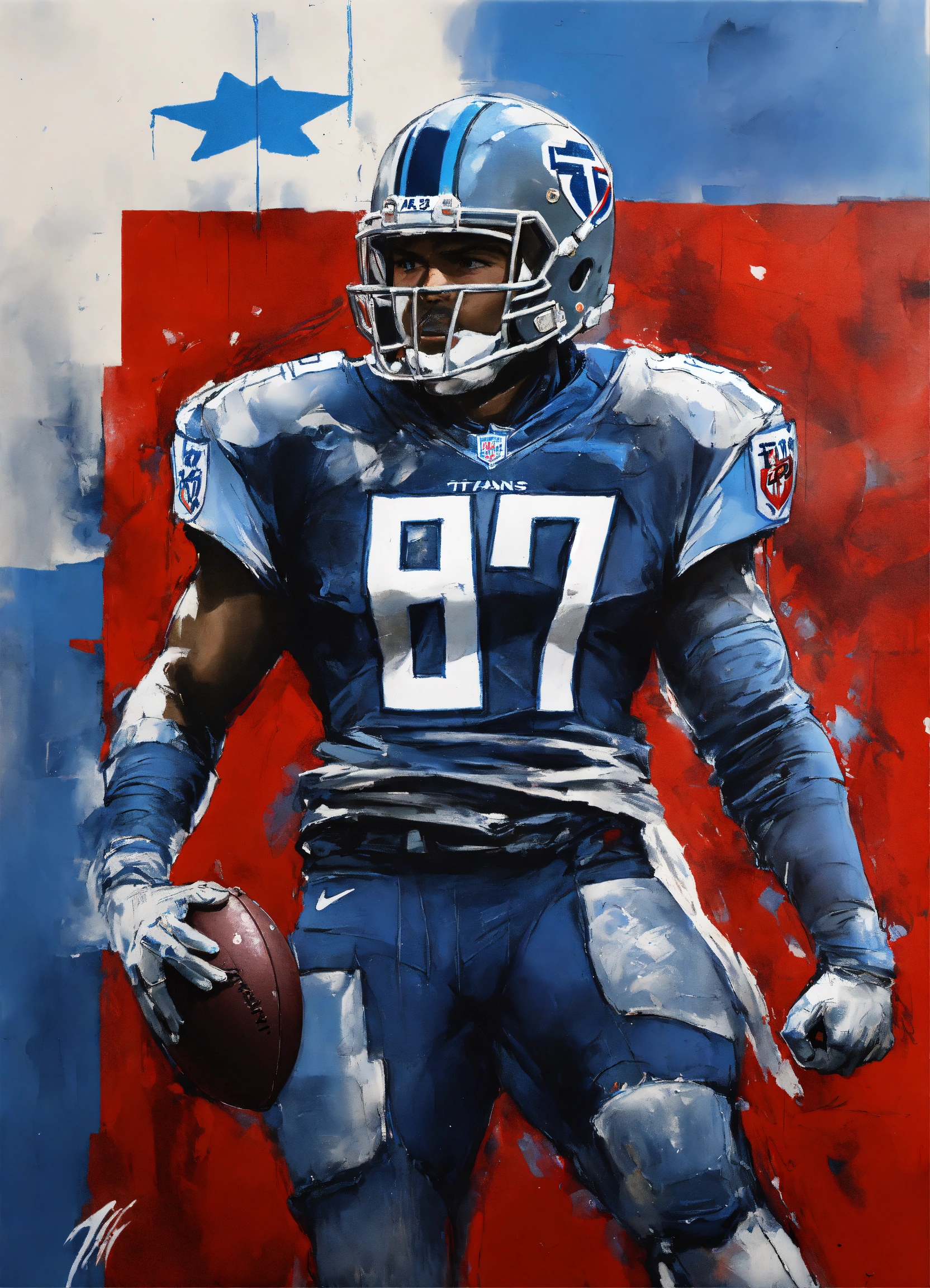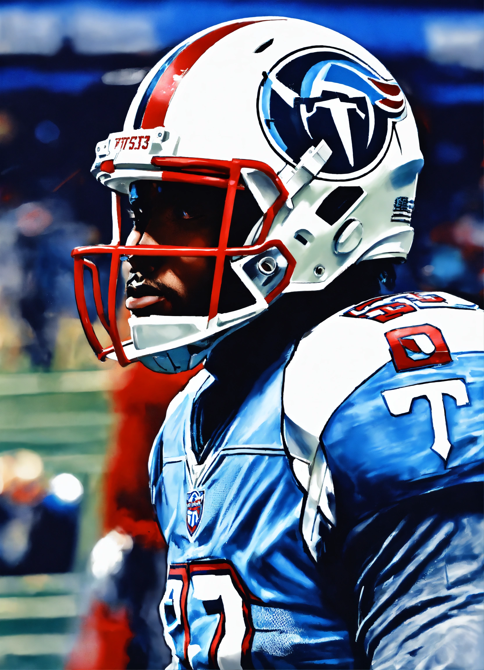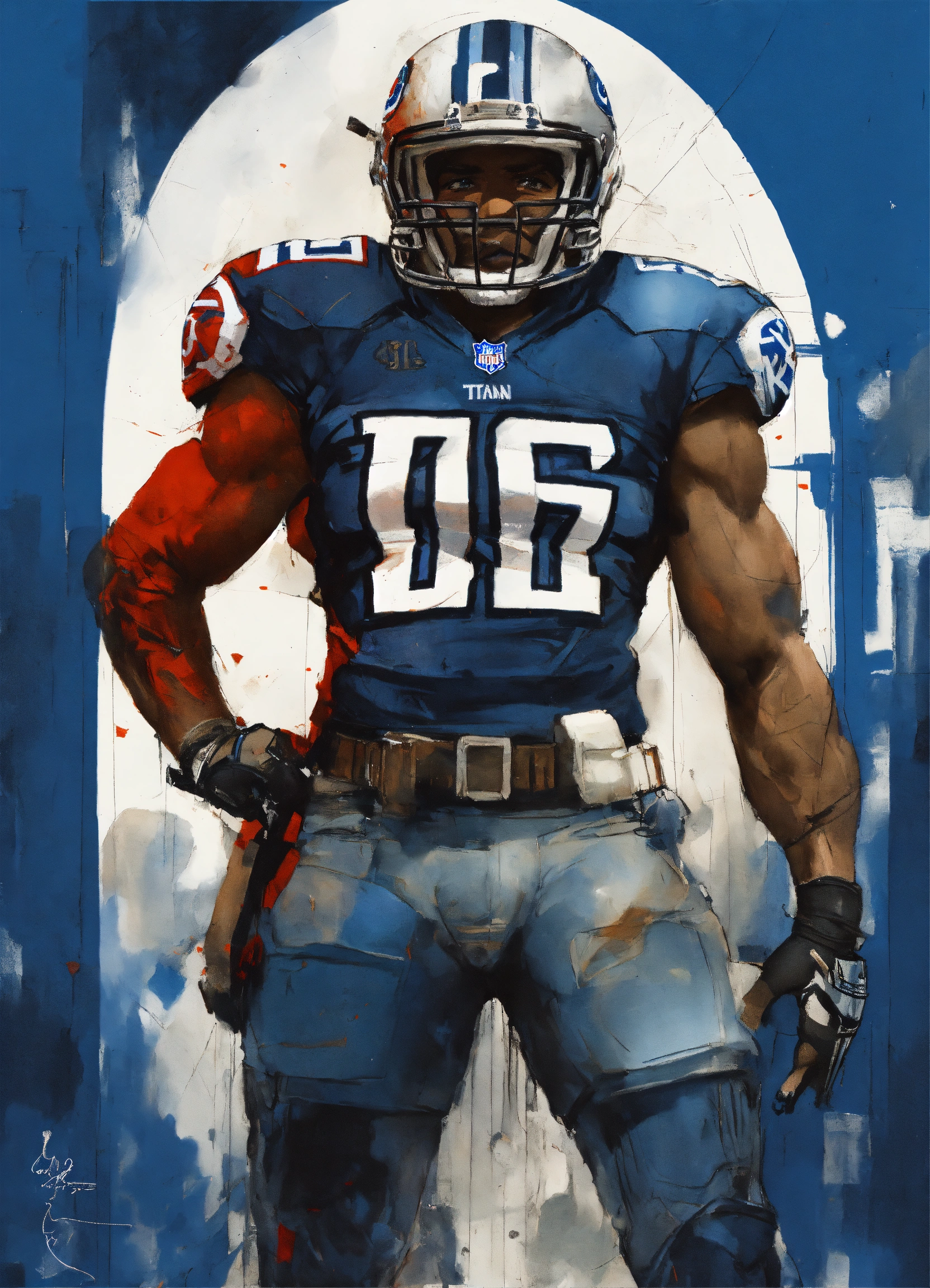 Full photo shot of a tennessee titans, american football player, yoji shinkawa style, jean-baptiste monge, general plan, central composition, entirely on a sheet, painting, ultra-fine detailed brushstrokes, concept art, cinematic lighting, titans blue, (white 1.3), red and titans blue, style, stylize, intricate detail, 32k, transparent background, (white and titans blue background -- ar 916) --v5.1 --seed 7777