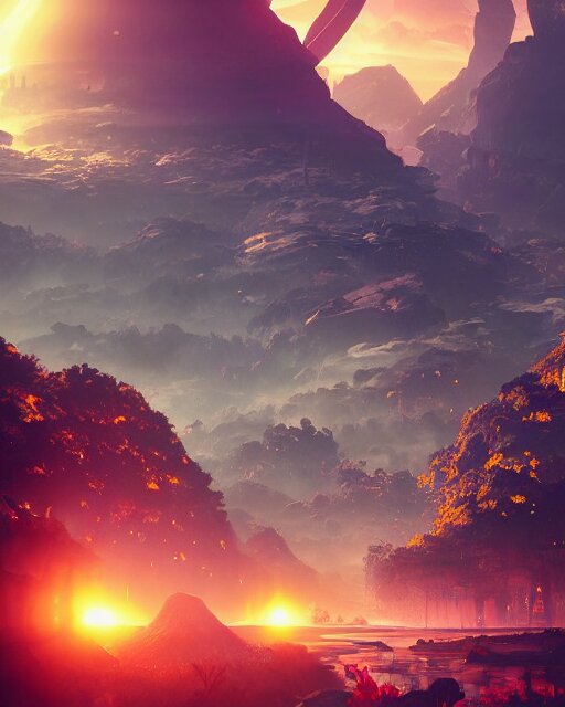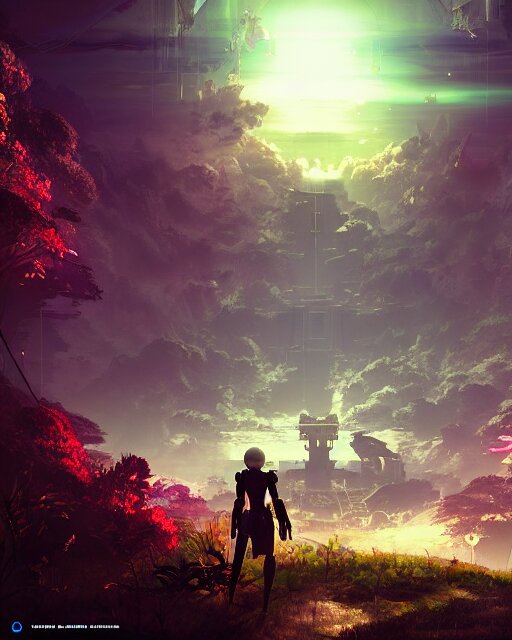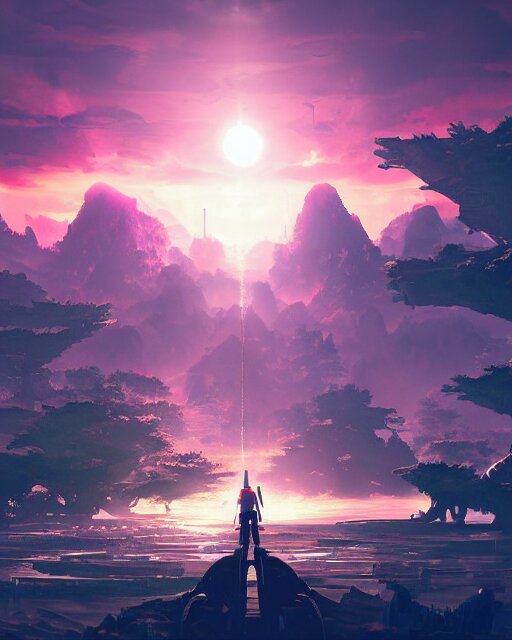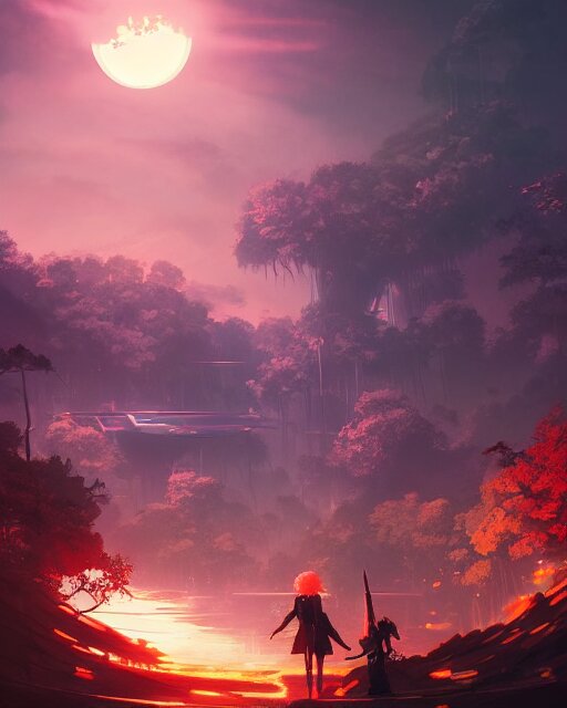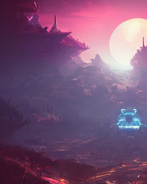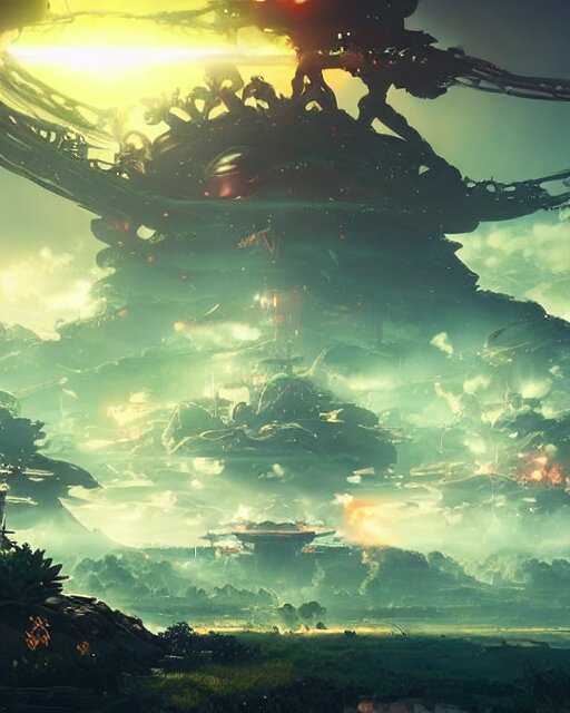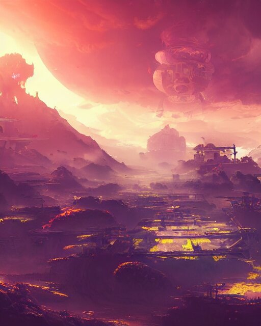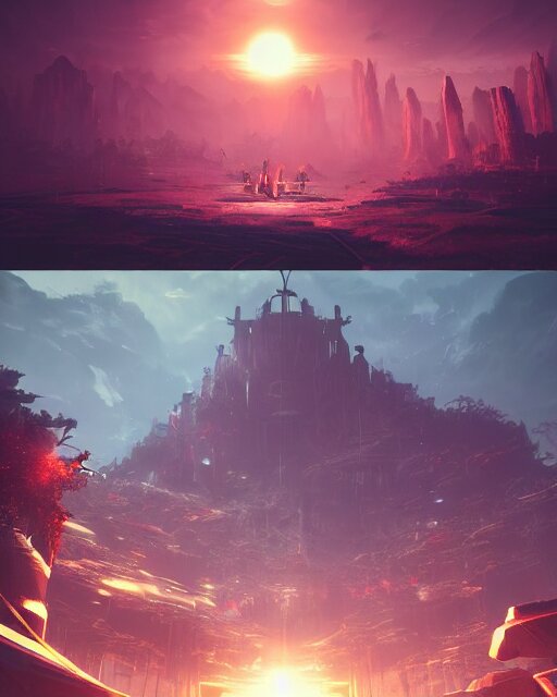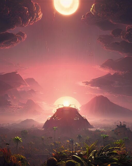 Beautiful landscape, nier automata, protoss!!, temple!!, machine planet, mothership in the sky, pink sun, tropical forest, colorful light, advanced technology, cinematic lighting, highly detailed, masterpiece, art by bastien grivet and darwin cellis and jan urschel