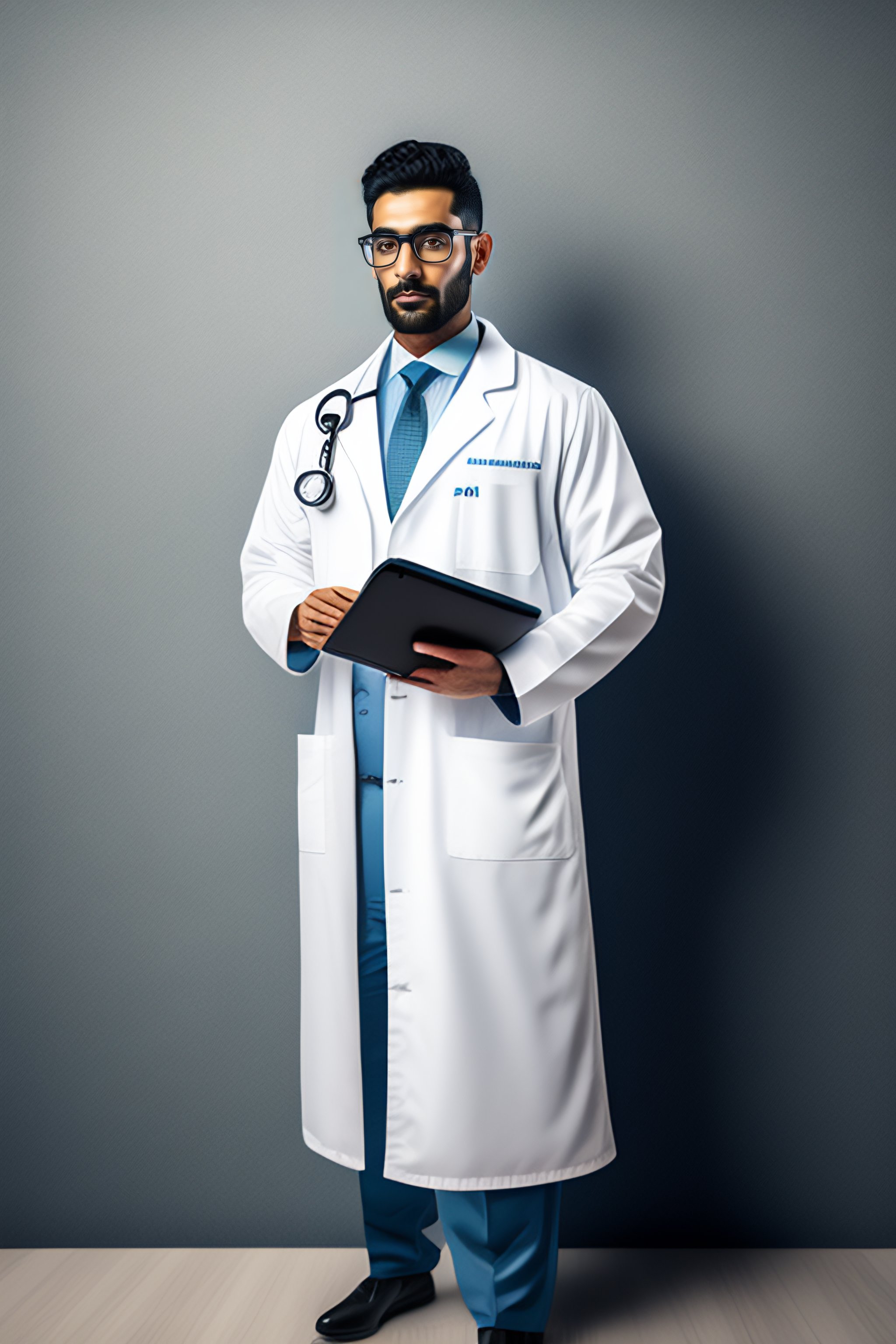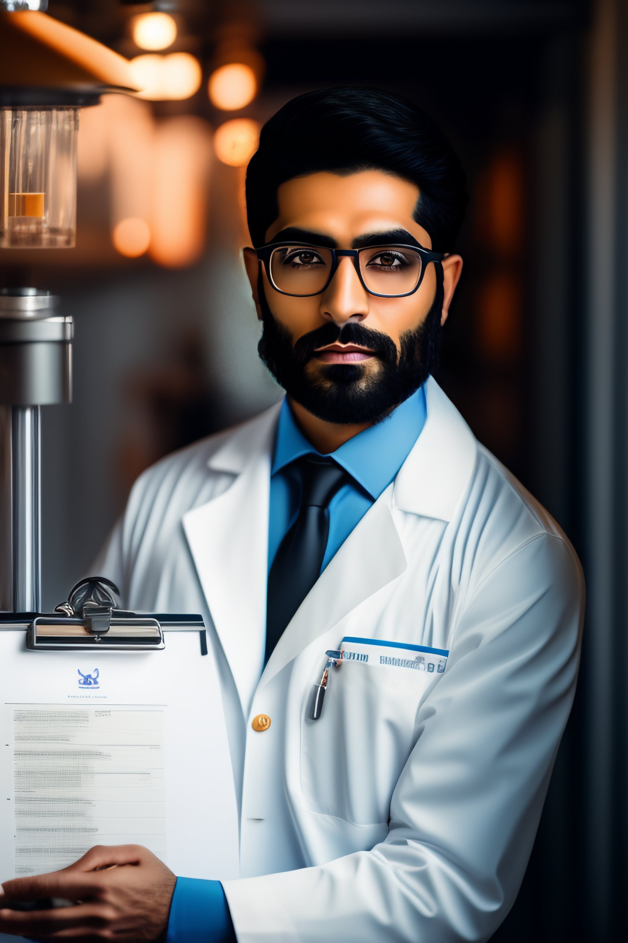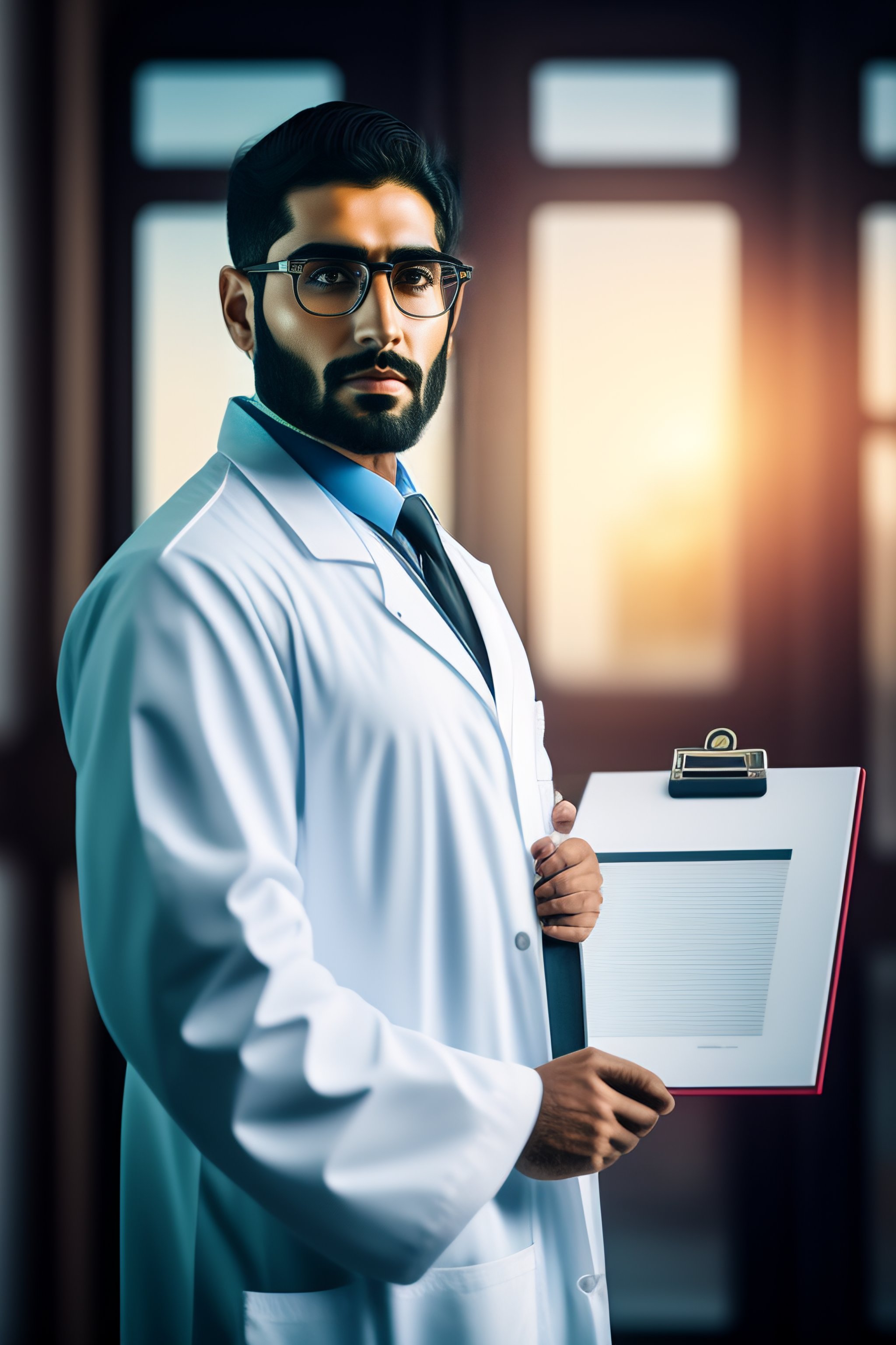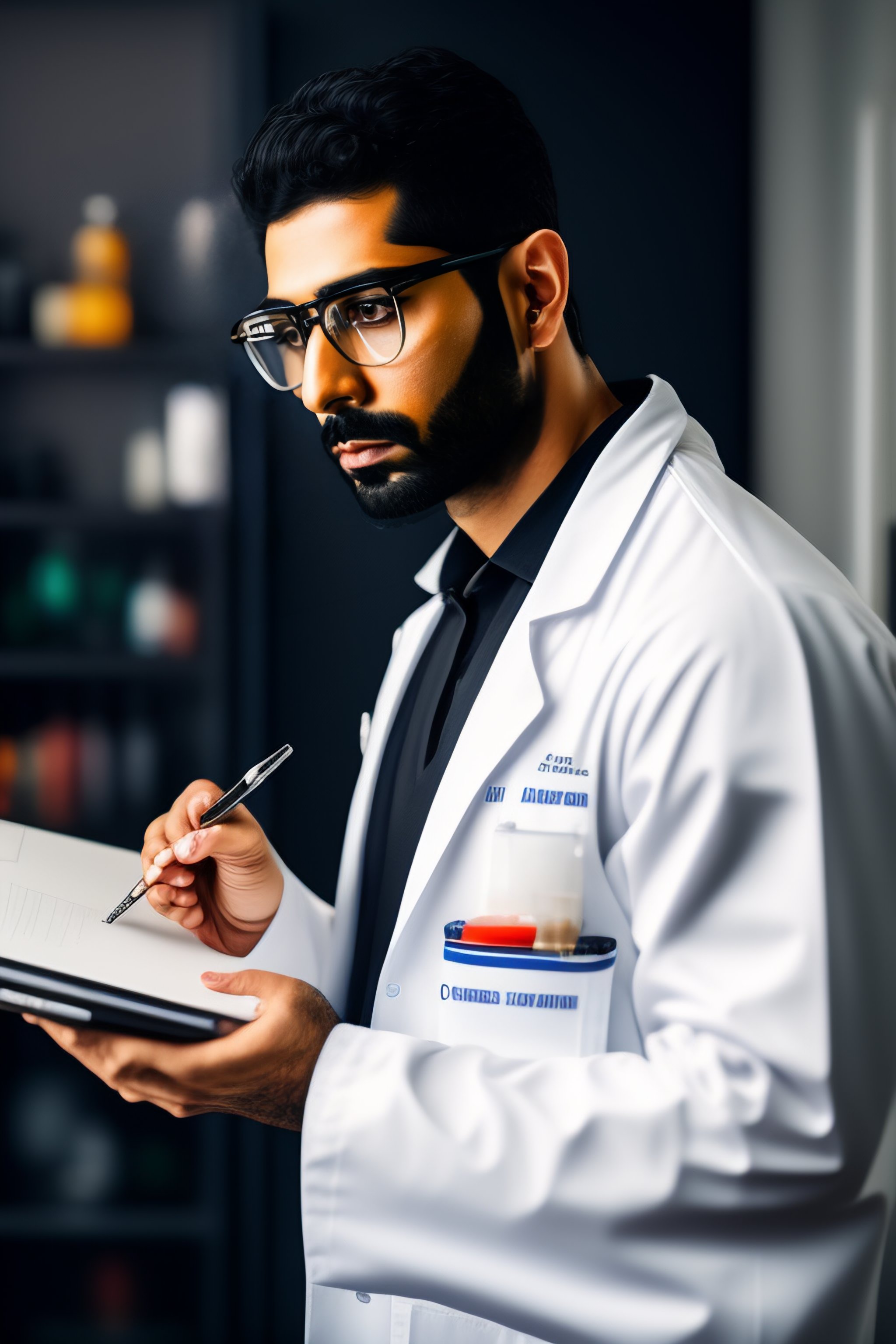 Natural 35mm f4 full body photo of shapely handsome arab 37 years old man scientist with short black hair, short beard wearing lab coat and glasses, holding a clipboard, courageous, realistic
