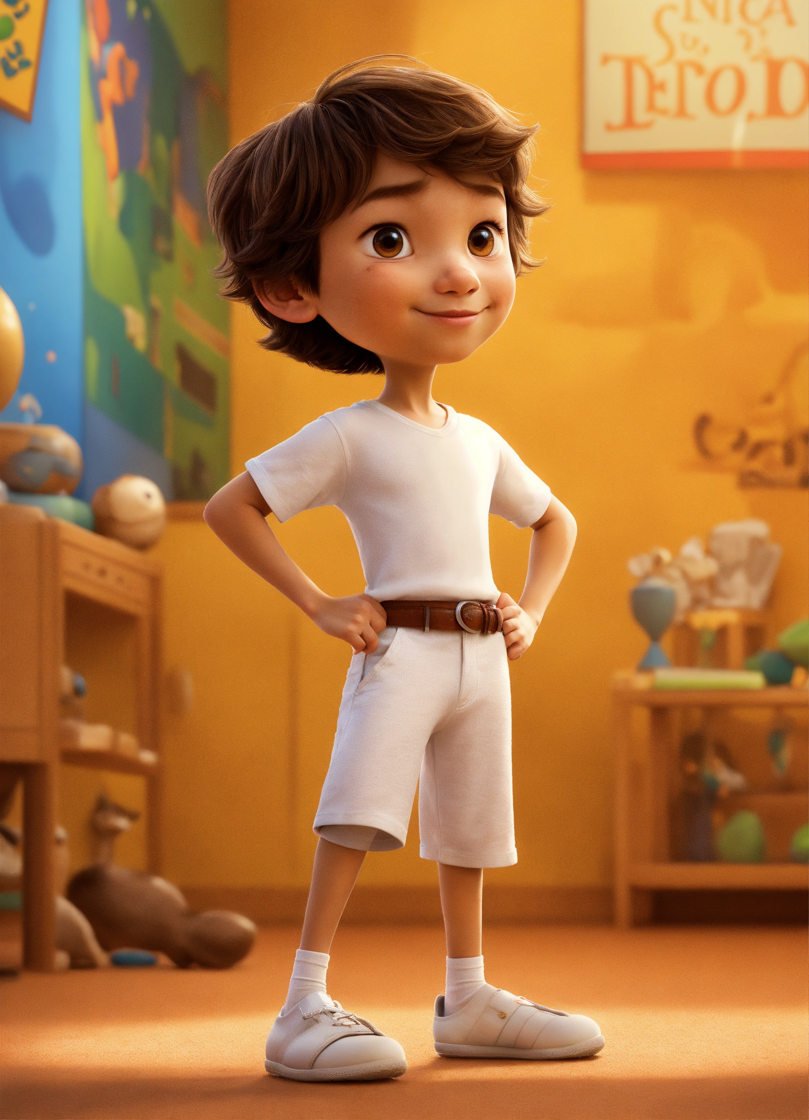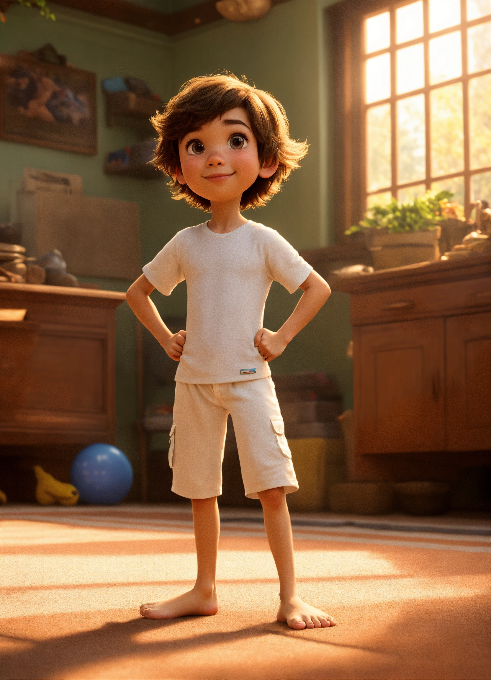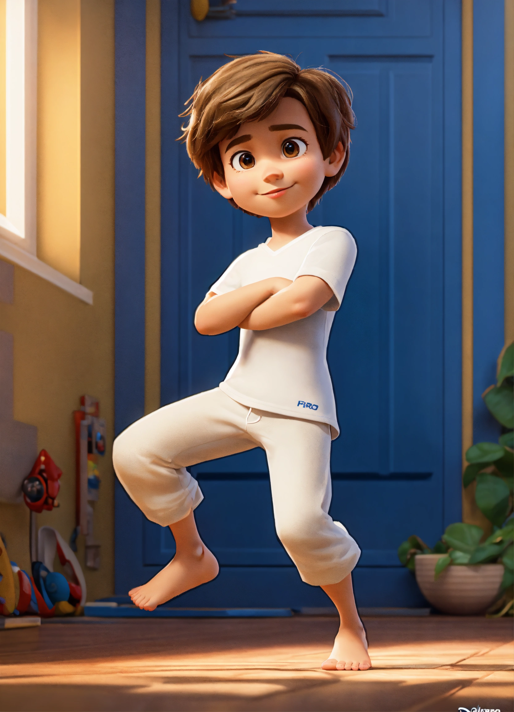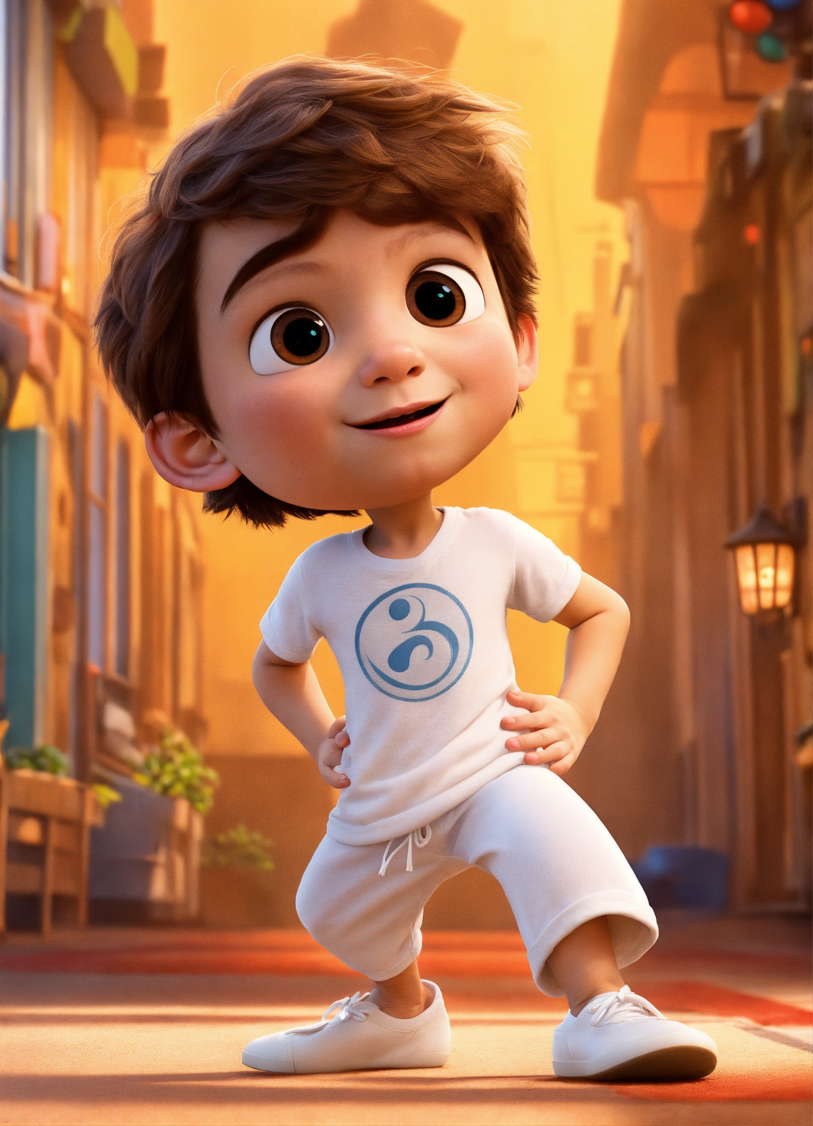 A disney-style 3d poster from pixar, with a cute young caucasian boy, short bob hair with white tshirt and white long pants, without shoes, ele é lutador de capoeira, ele não usa calçado, precisa estar sem sapato, uma corda branca fina pendurada na cintura