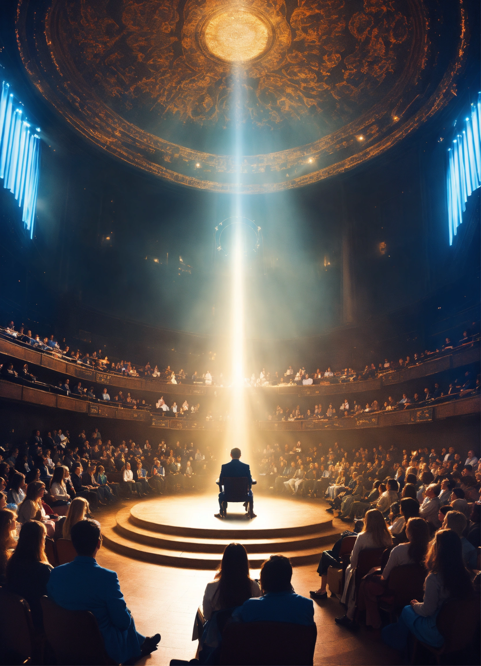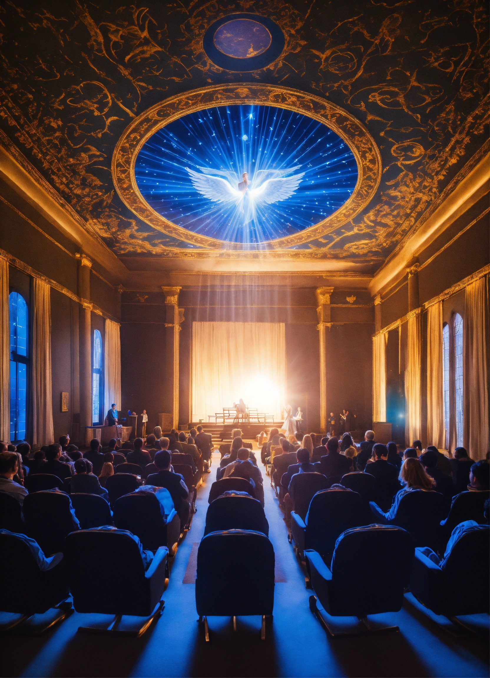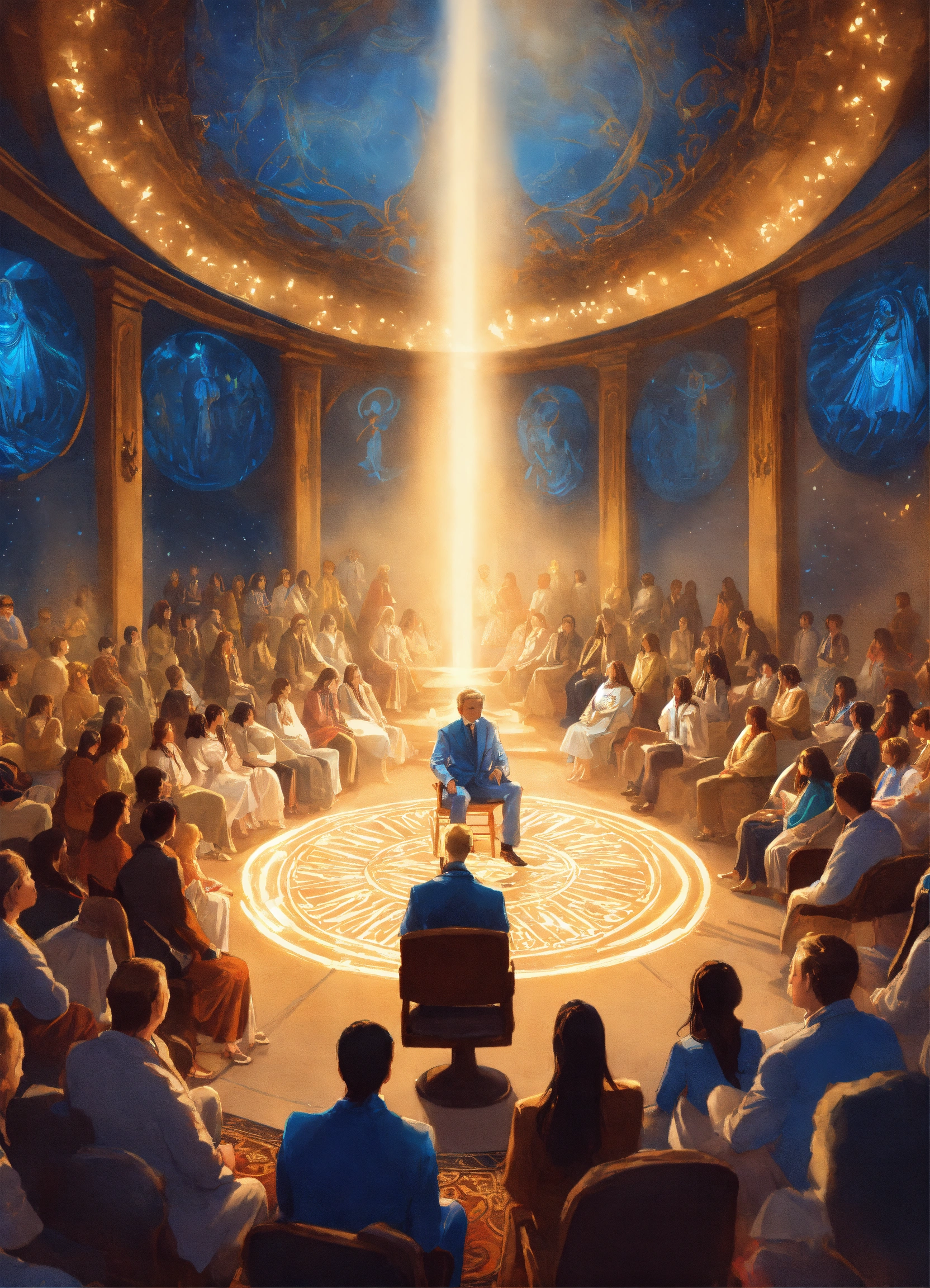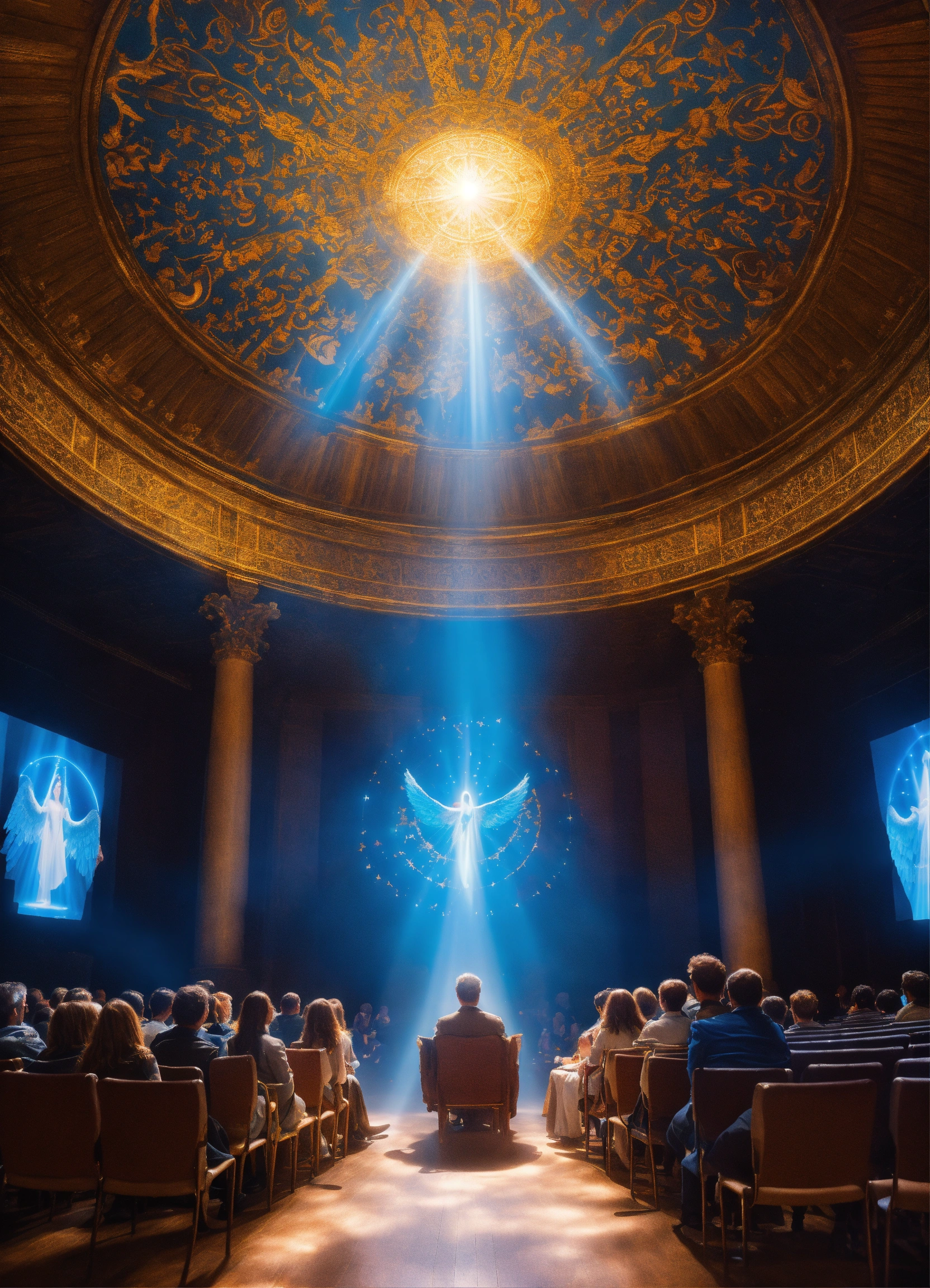 Many people sitting on a chair in a circle in an auditorium, angel michael as man surrend an touch her with blue light, teaching, blue rays of light, divine signs, mystic symbols, esoteric emblems, lightful
