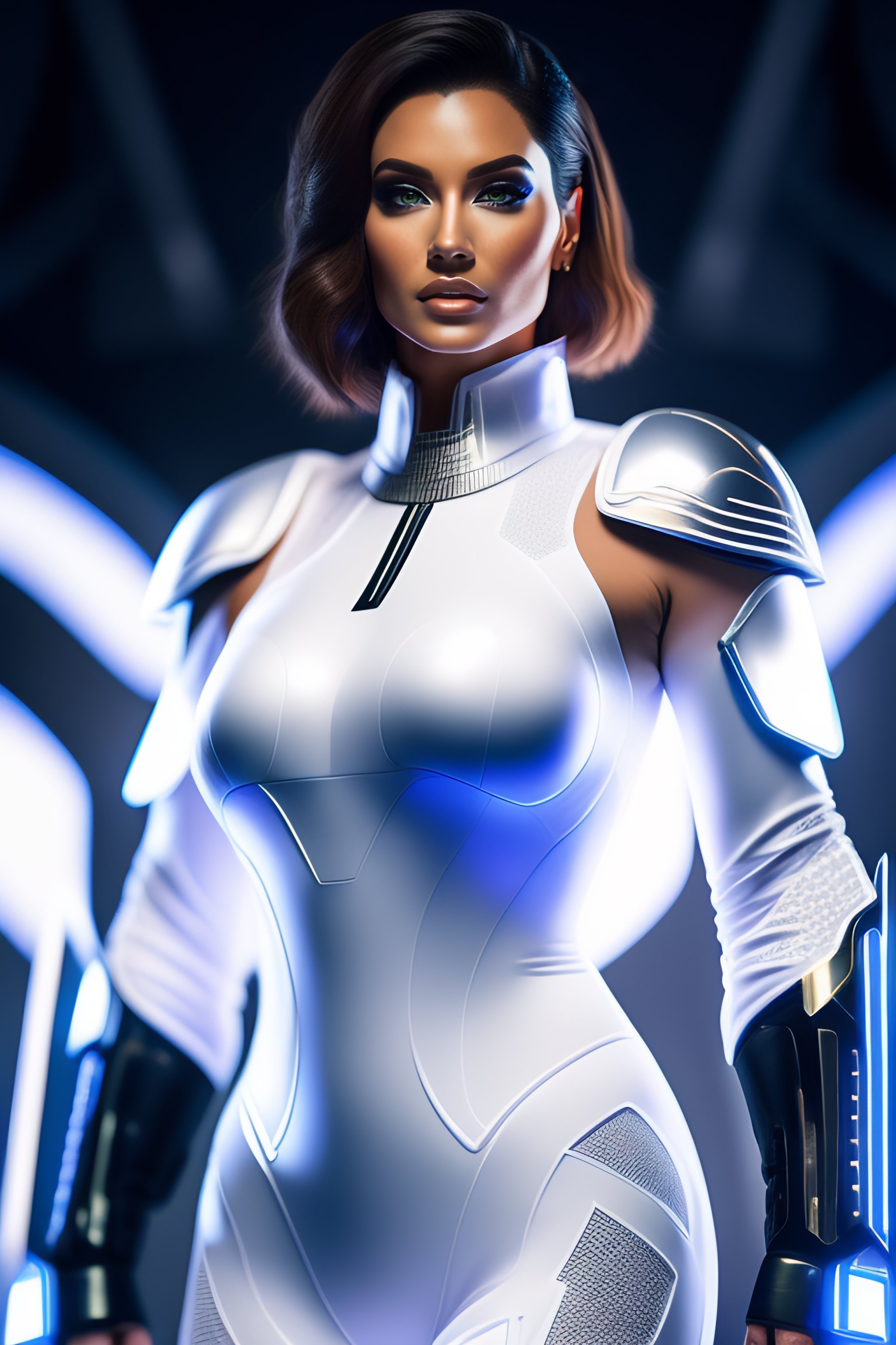 Full body portrait of a tron legacy girl quorra, wide angle shot, short bob hair, white body armor, white leg armors, white chest armors, white high heels, revealing skins, intricate, futuristic, elegant, cyber lights, highly detailed, digital photography