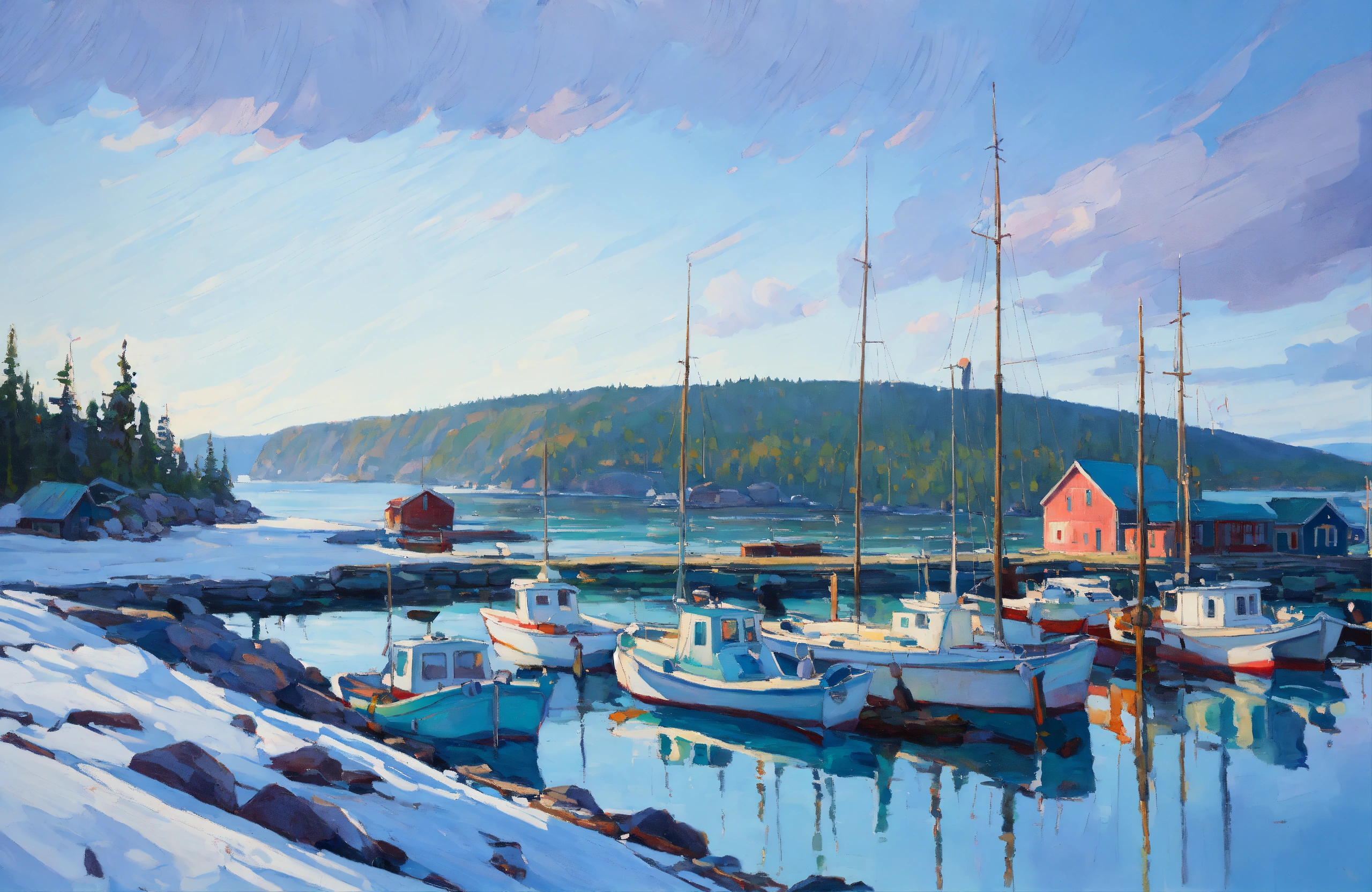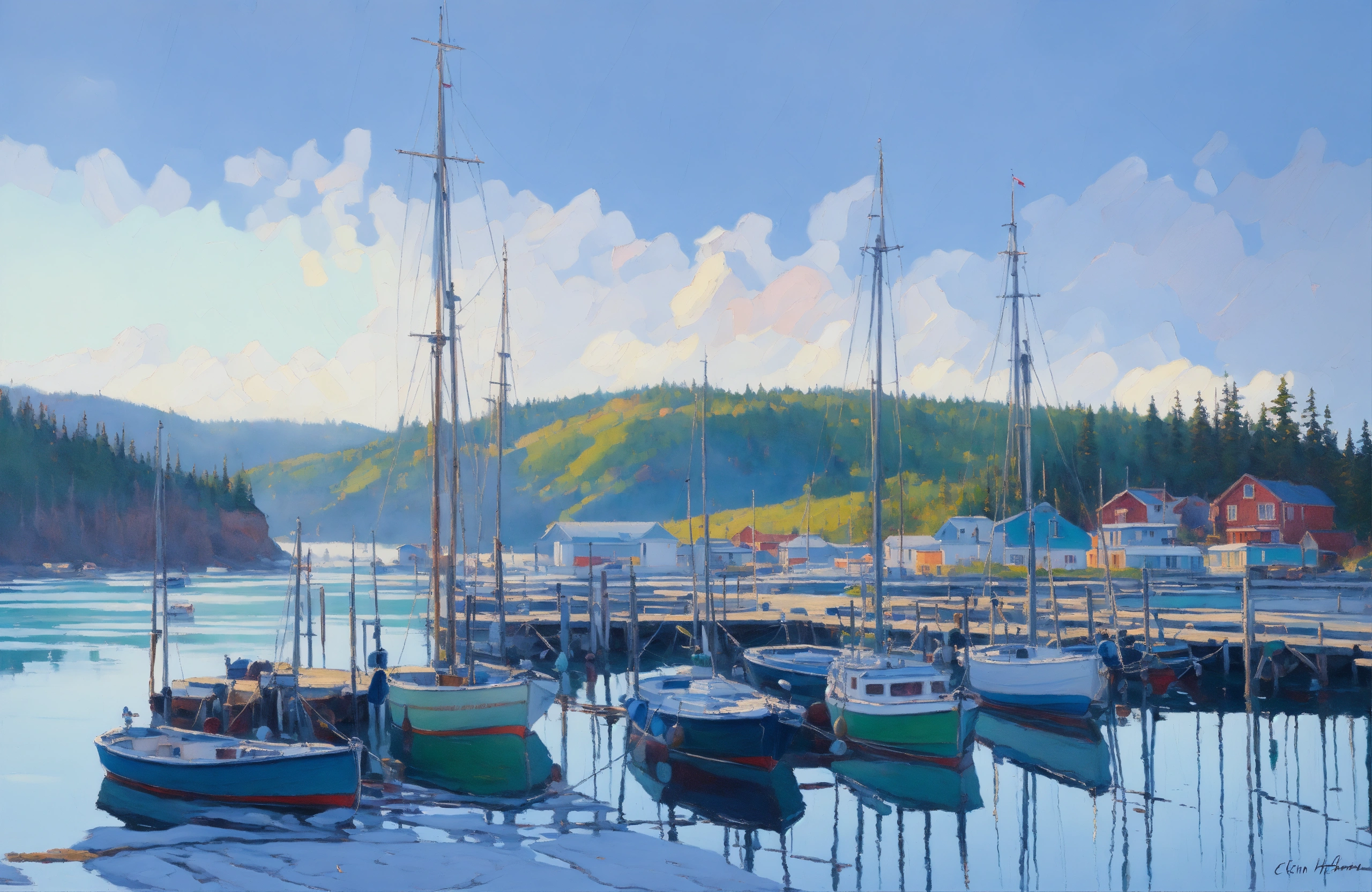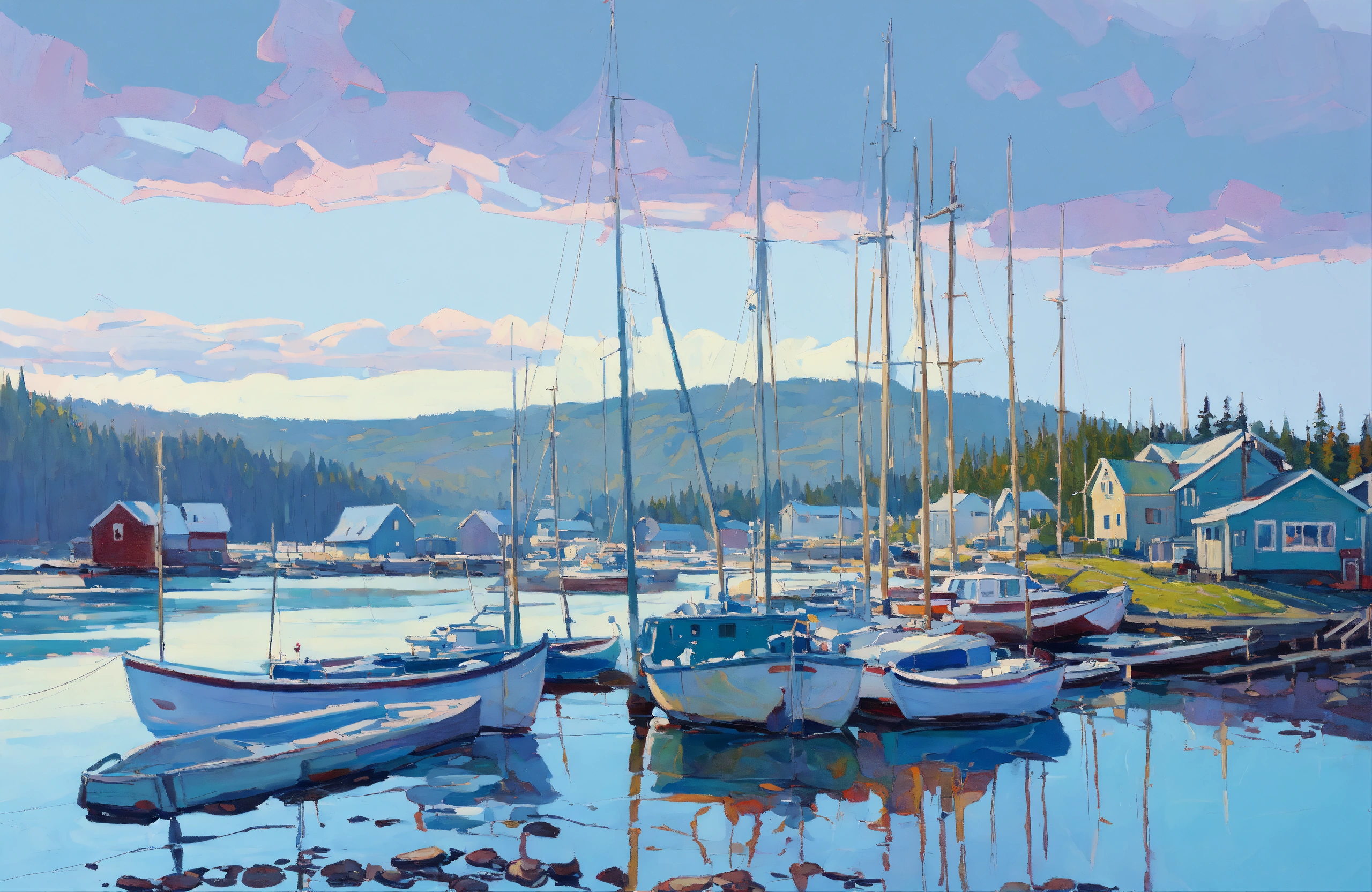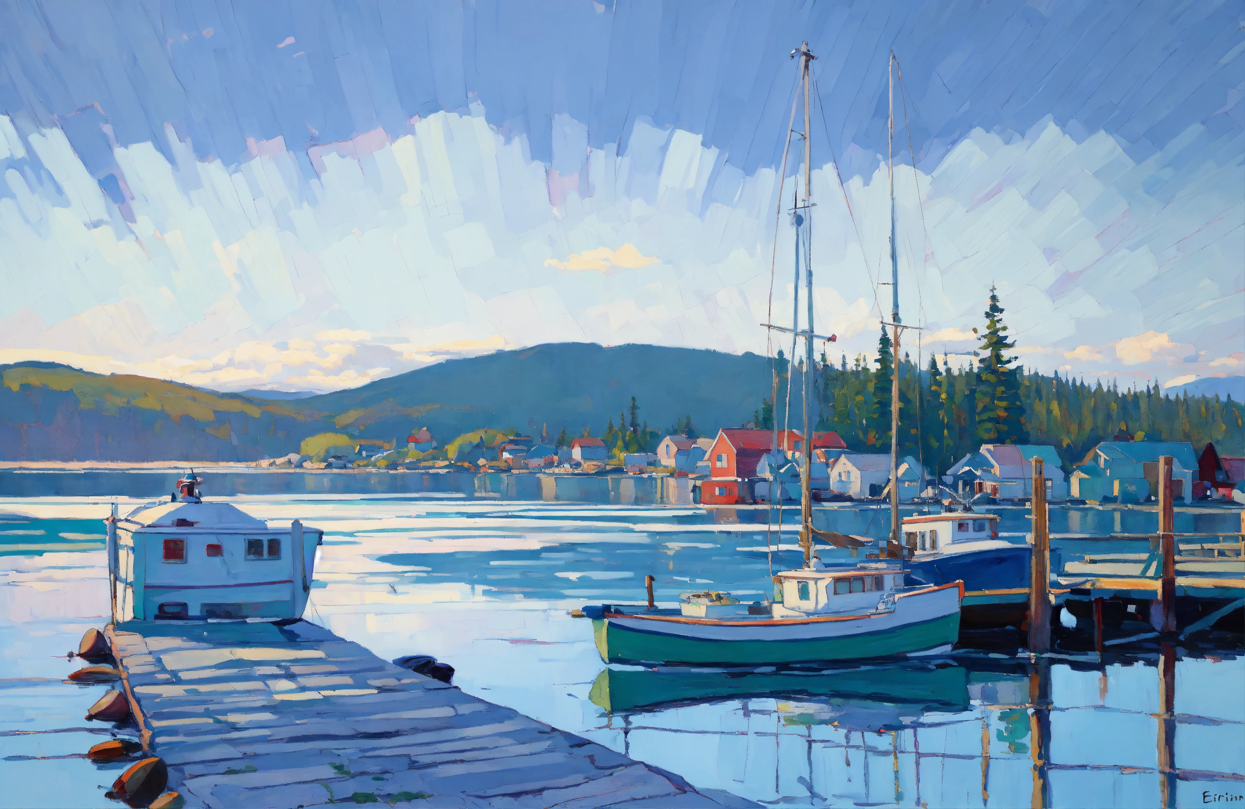 Ocean, seashore, gaspé, labrador landscape, rpg style, erin hanson, trees, boat, quay, wharf, morning light with long shadows and mist, chalet, oil painting, hill, spruce tree