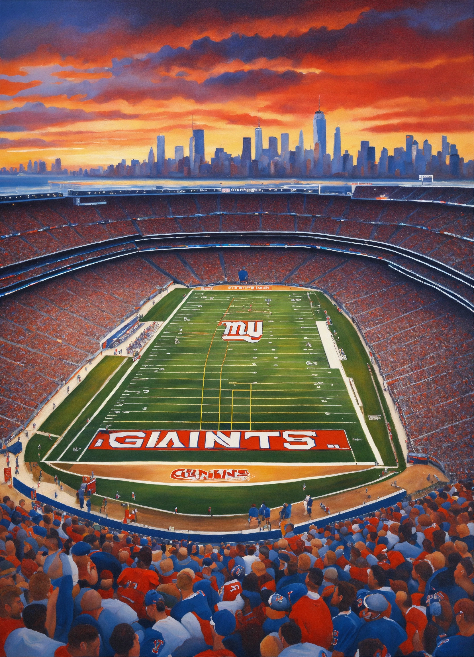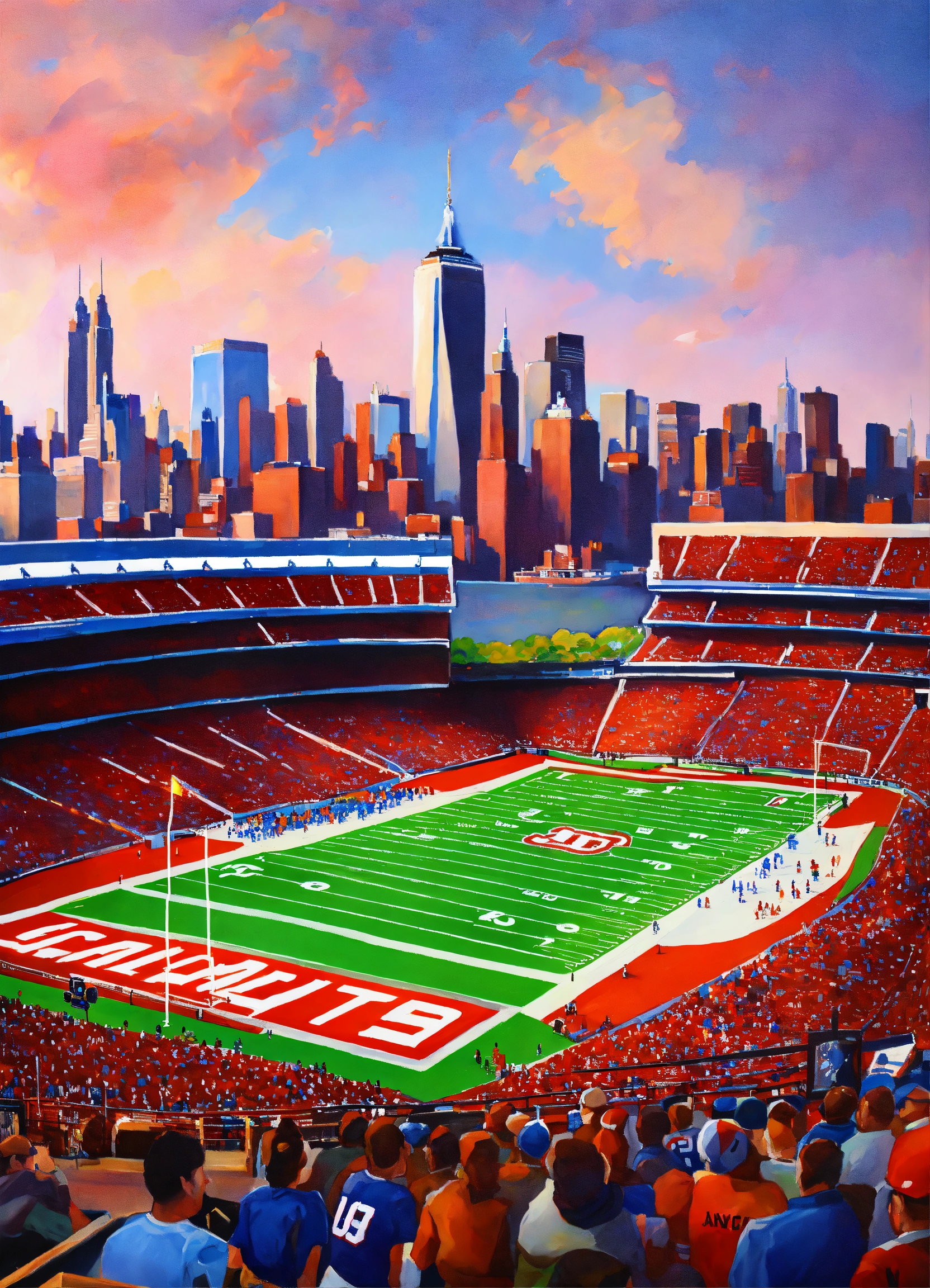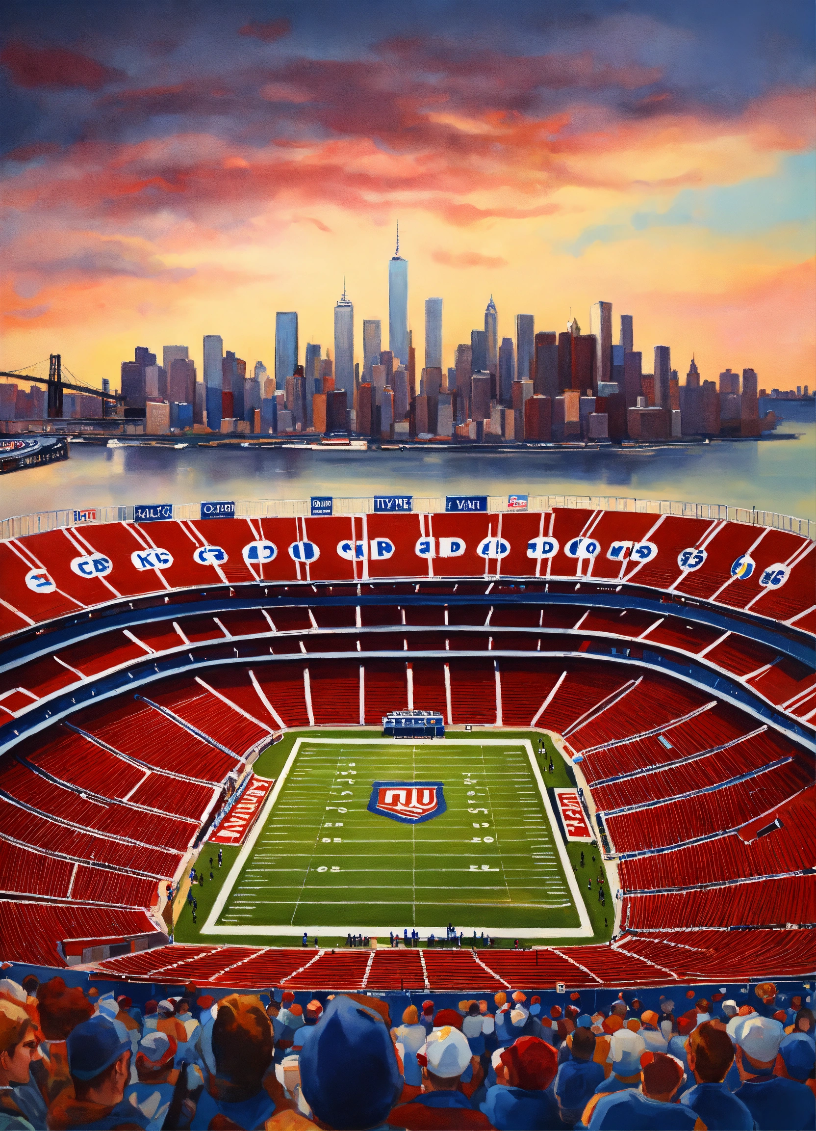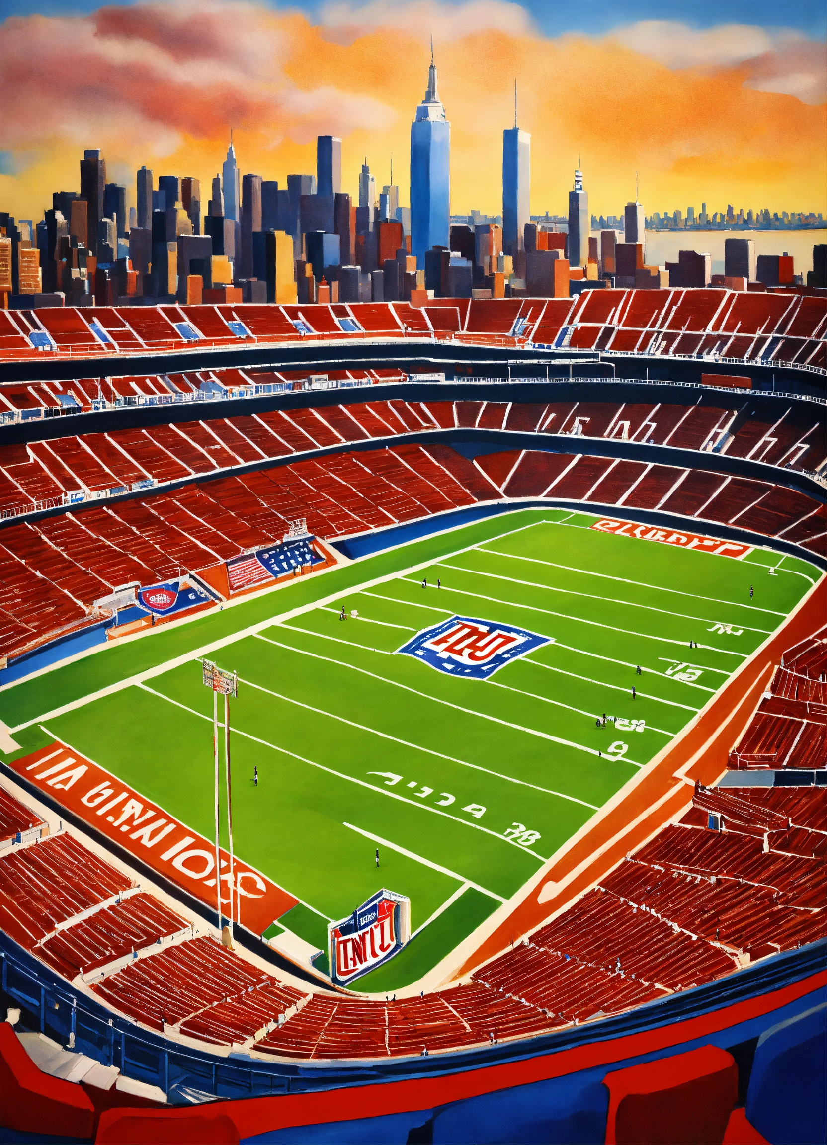 A painting of the new york giants football stadium with the new york city skyline in the backround