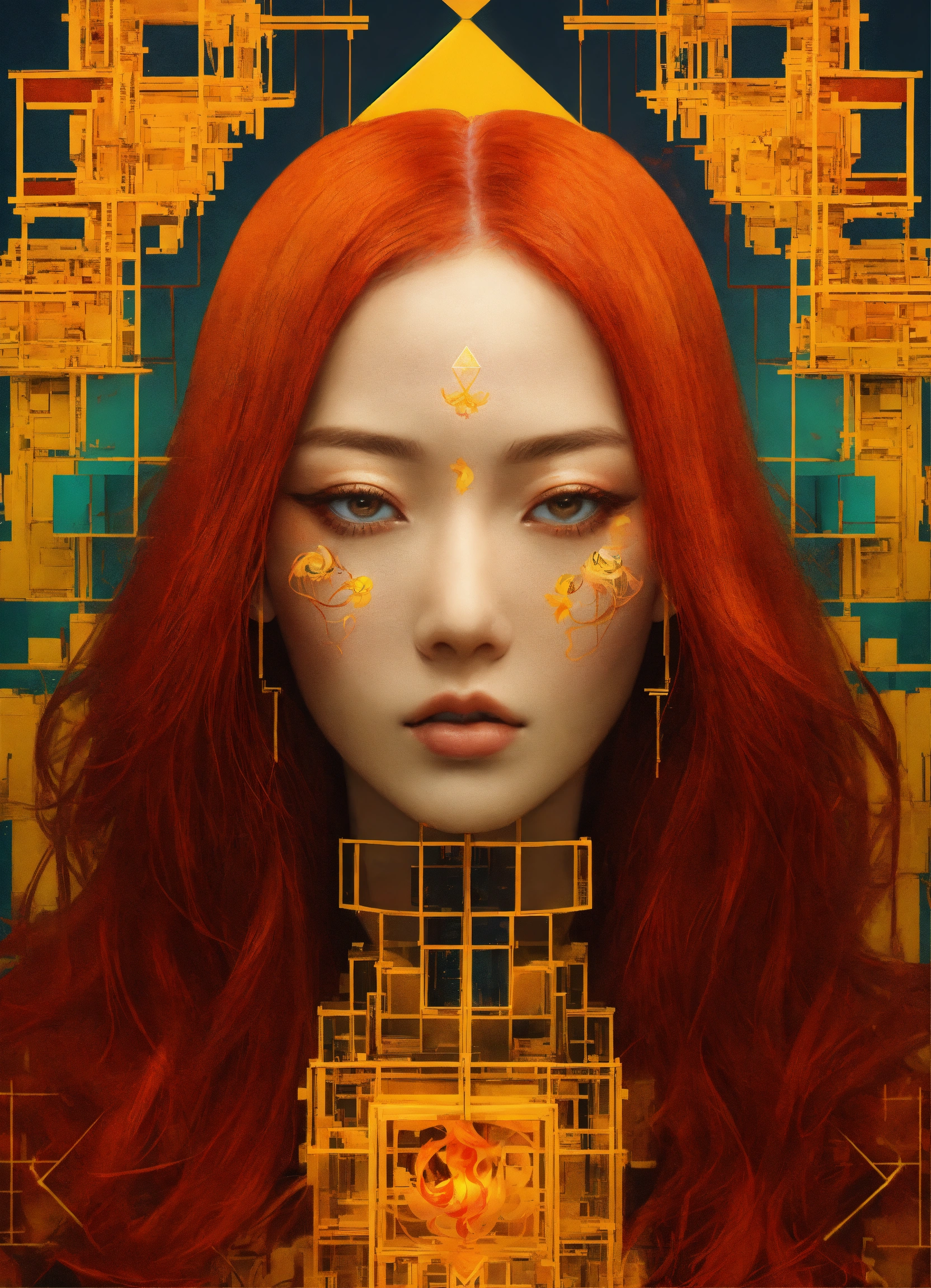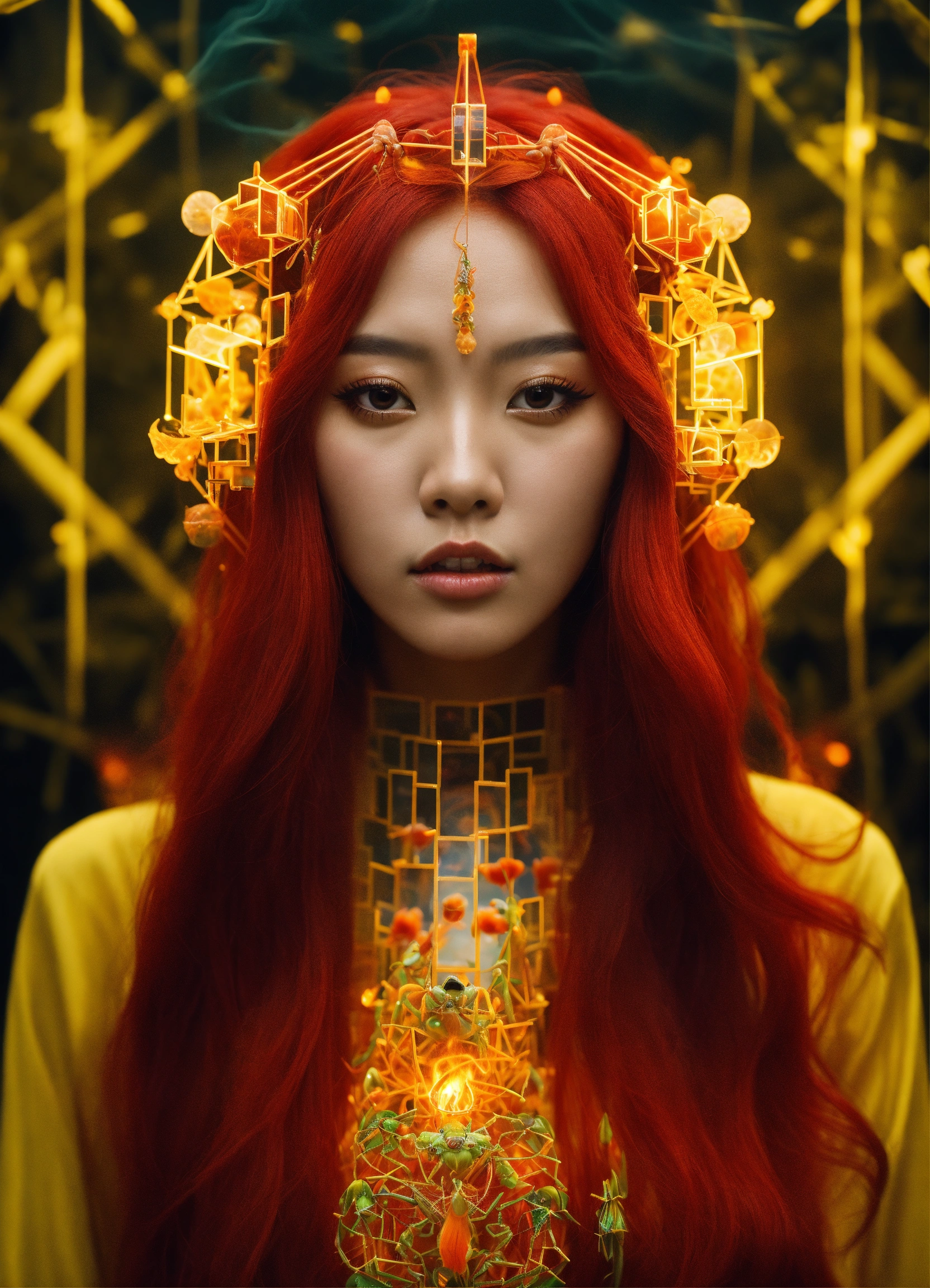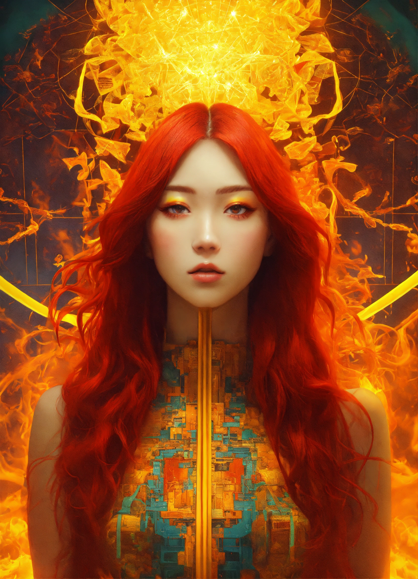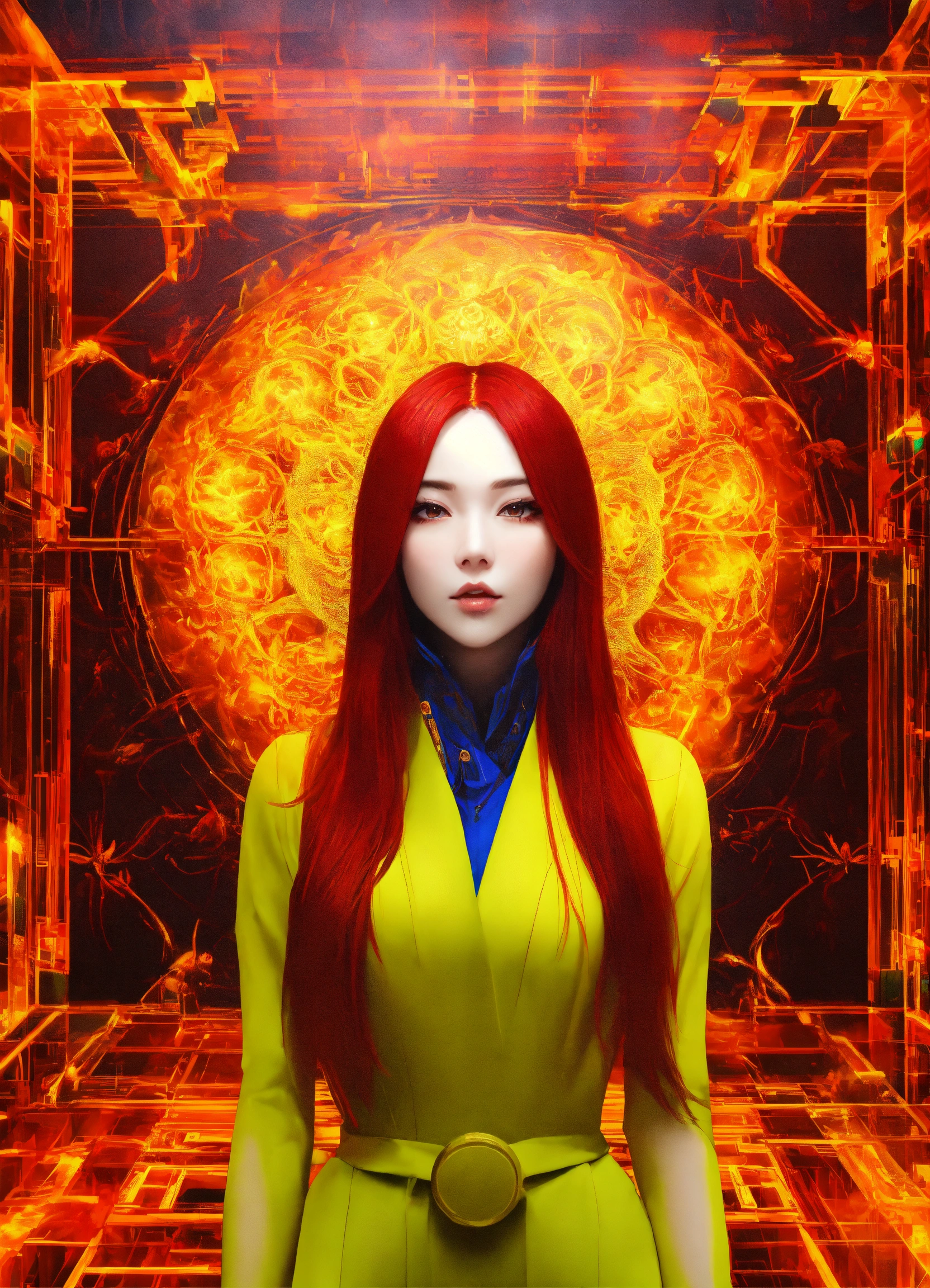 Beautiful woman, korean features, long red hair, yellow colours, model, tesseract body fractal three point perspective hypercube mirror zen face brain mayan mantis jellyfish face, smoke, fire