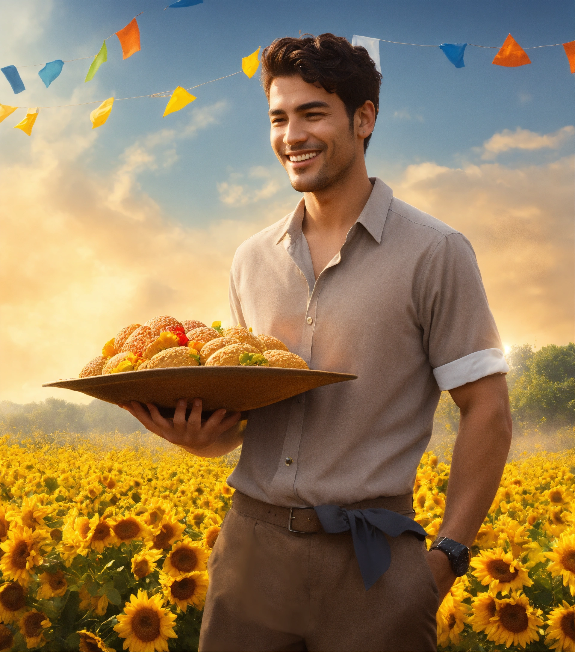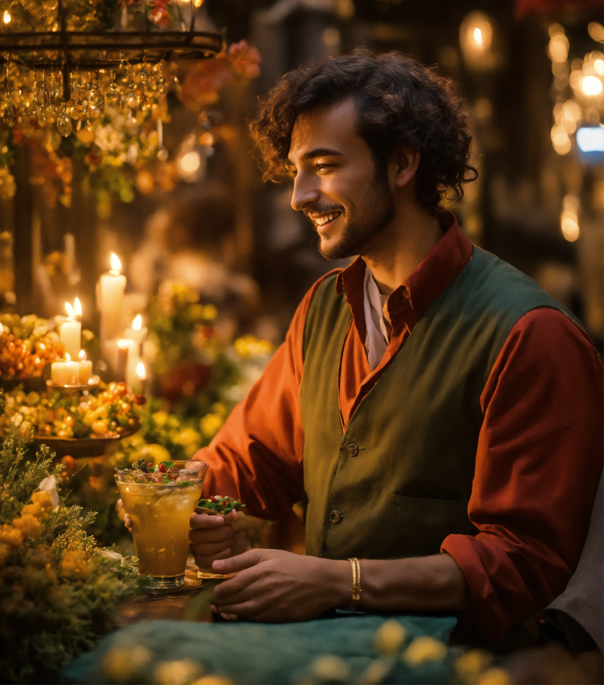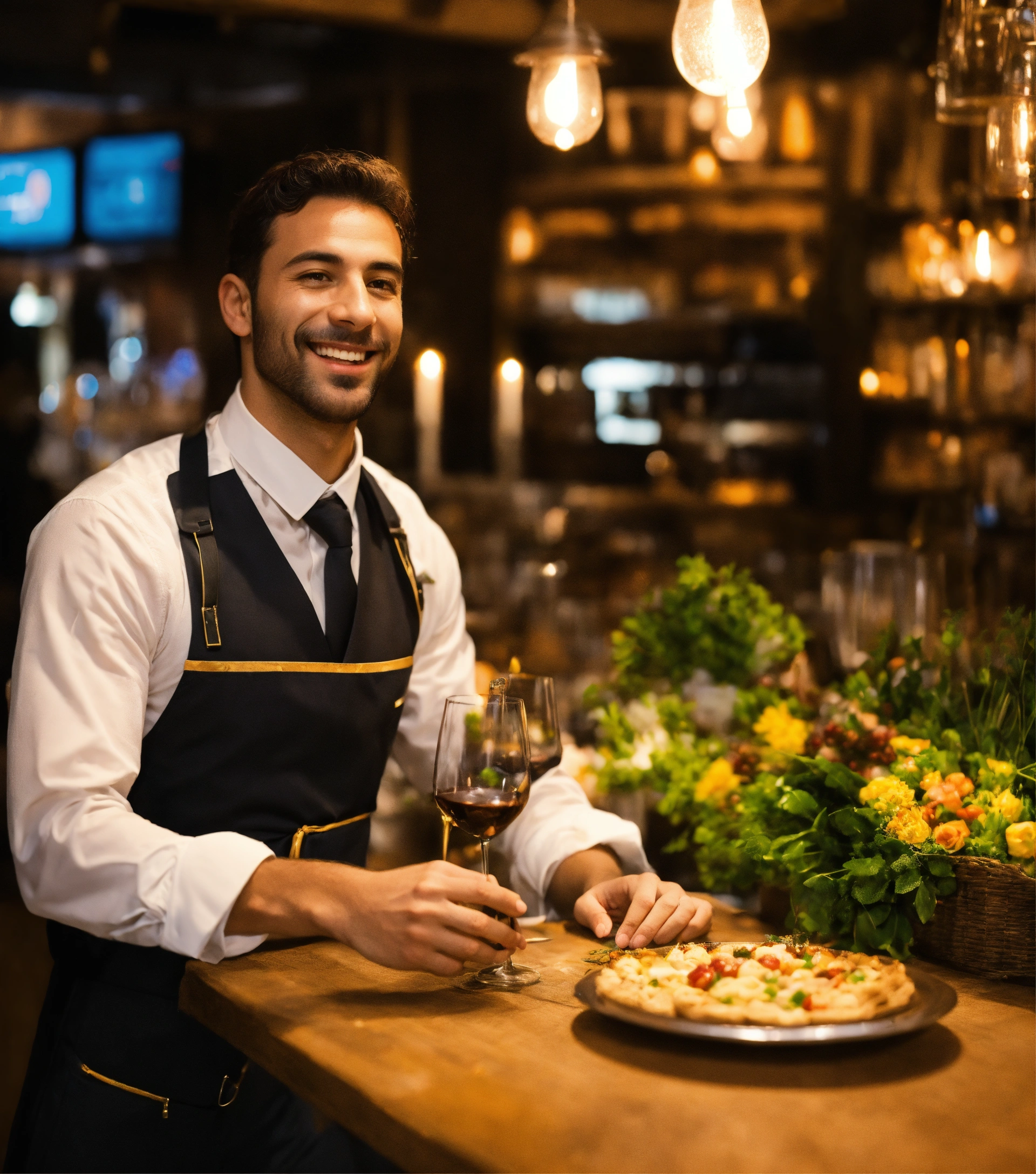 Un serveur joyeux brun ayant une aura de vendeur et charismatique