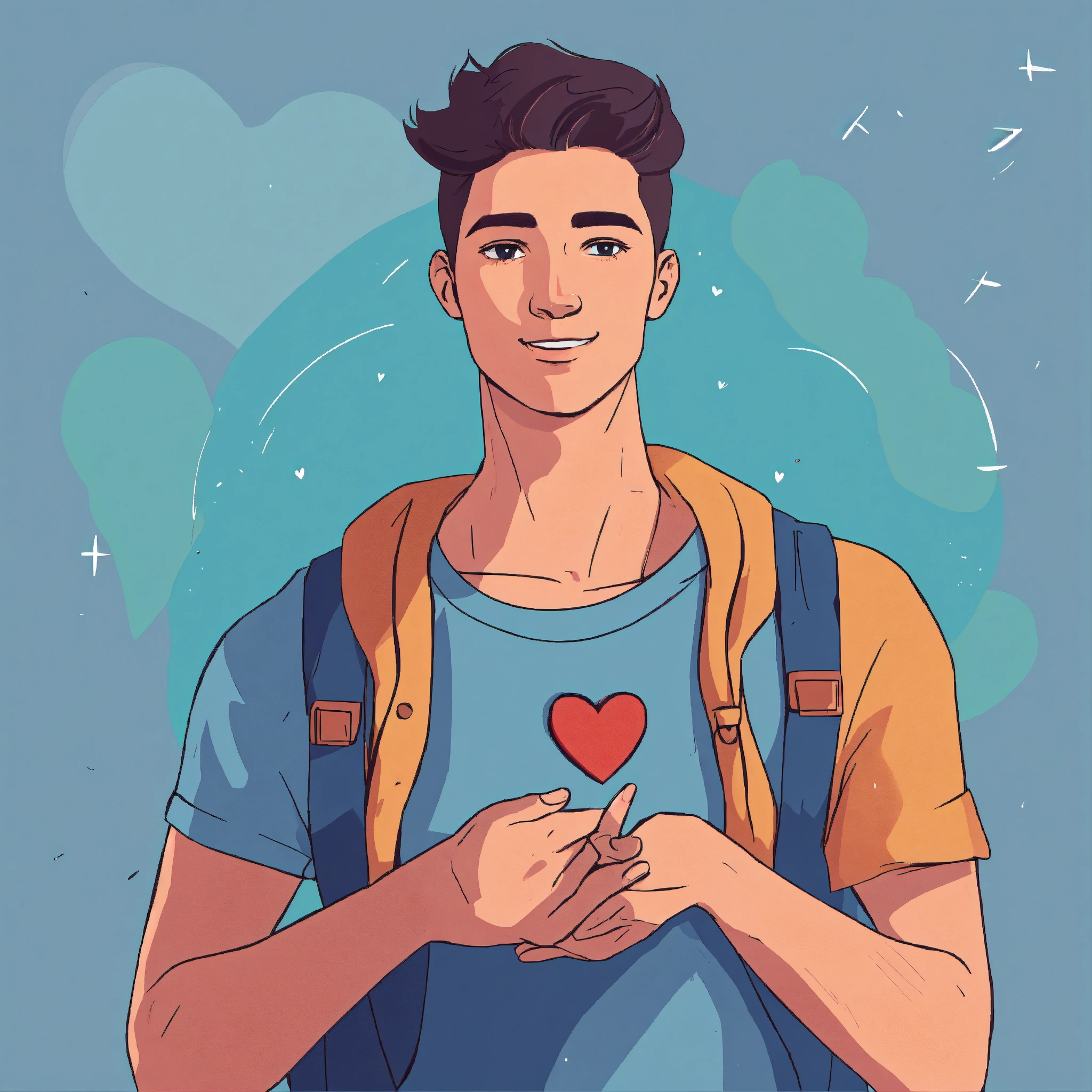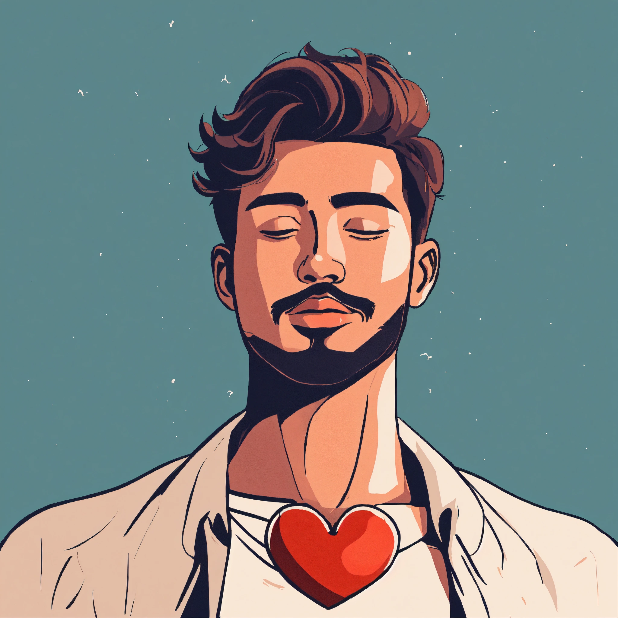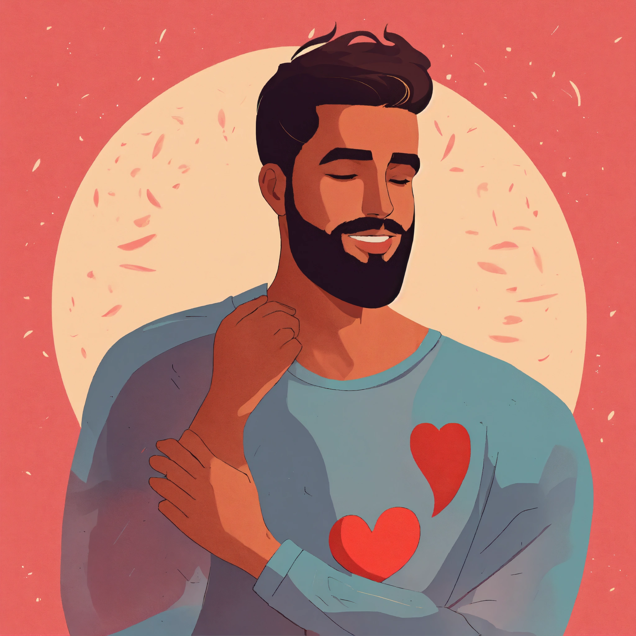 Self help concept. young positive man with his hand on the chest with heart, gratitude and peace. vector illustration in simple style