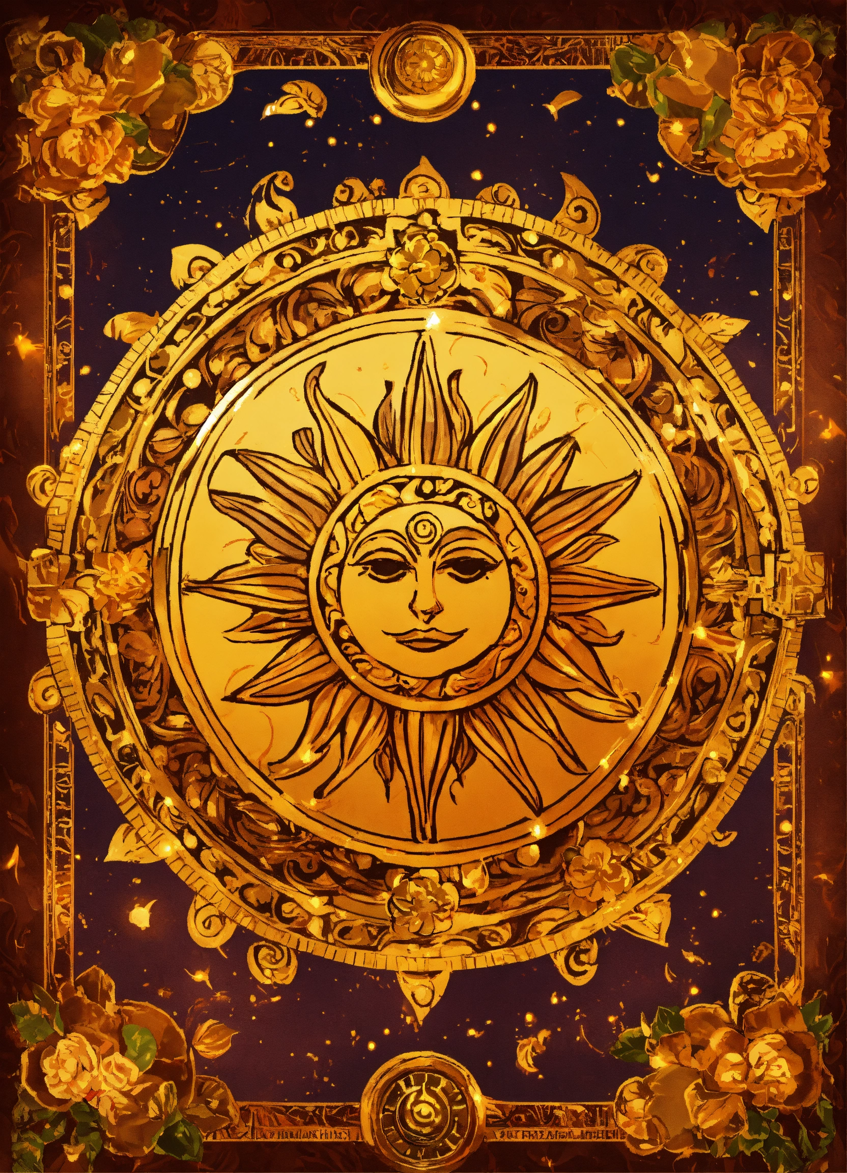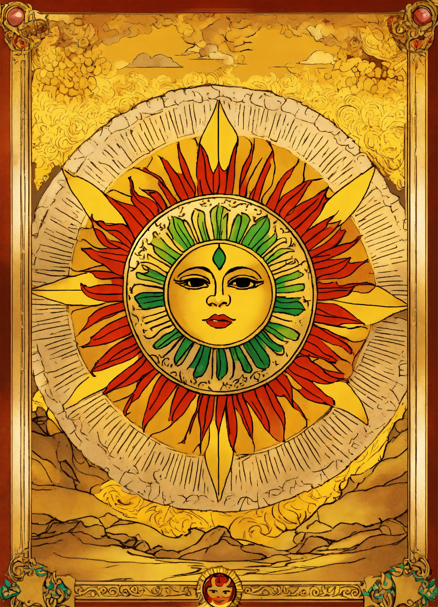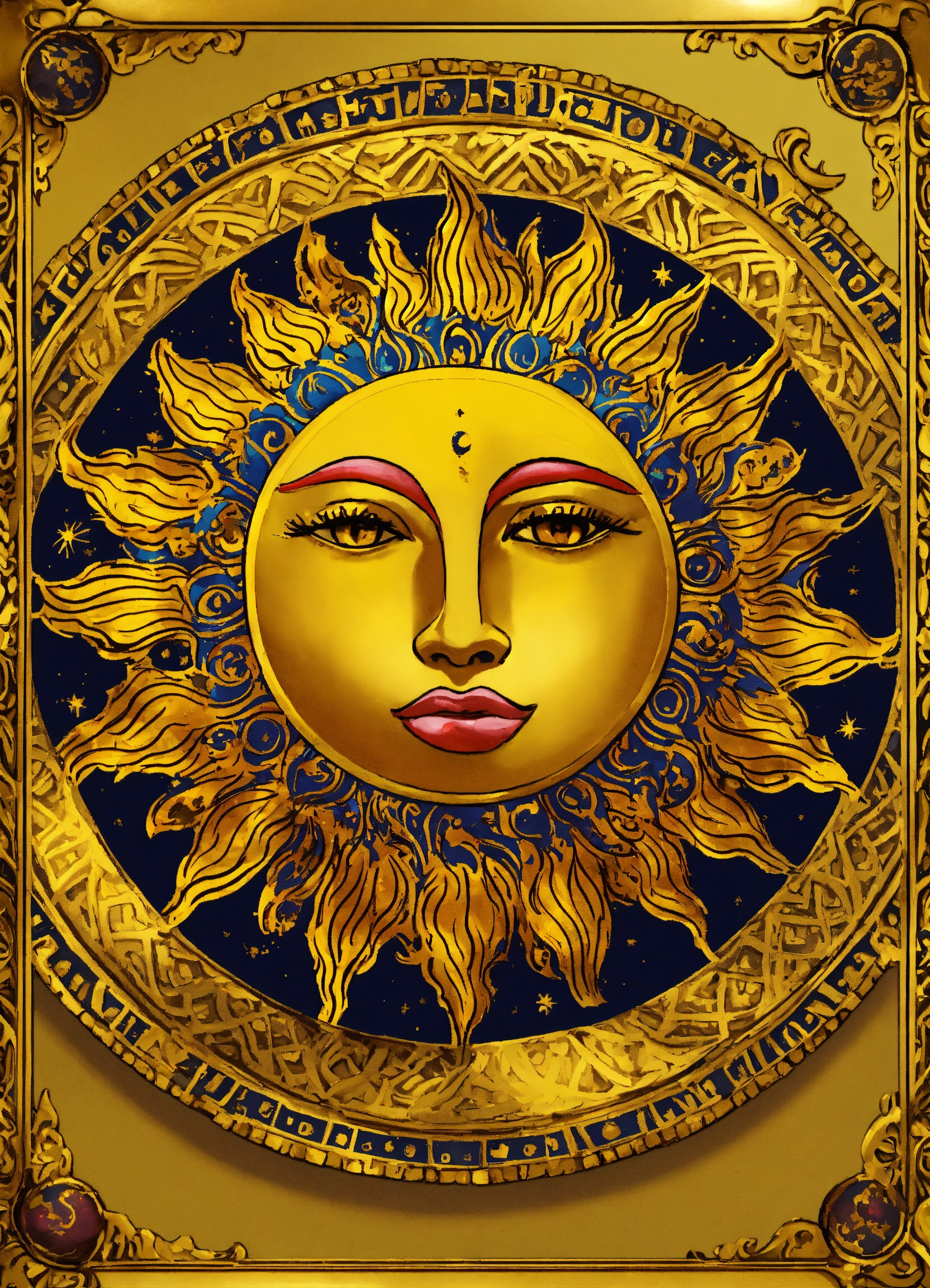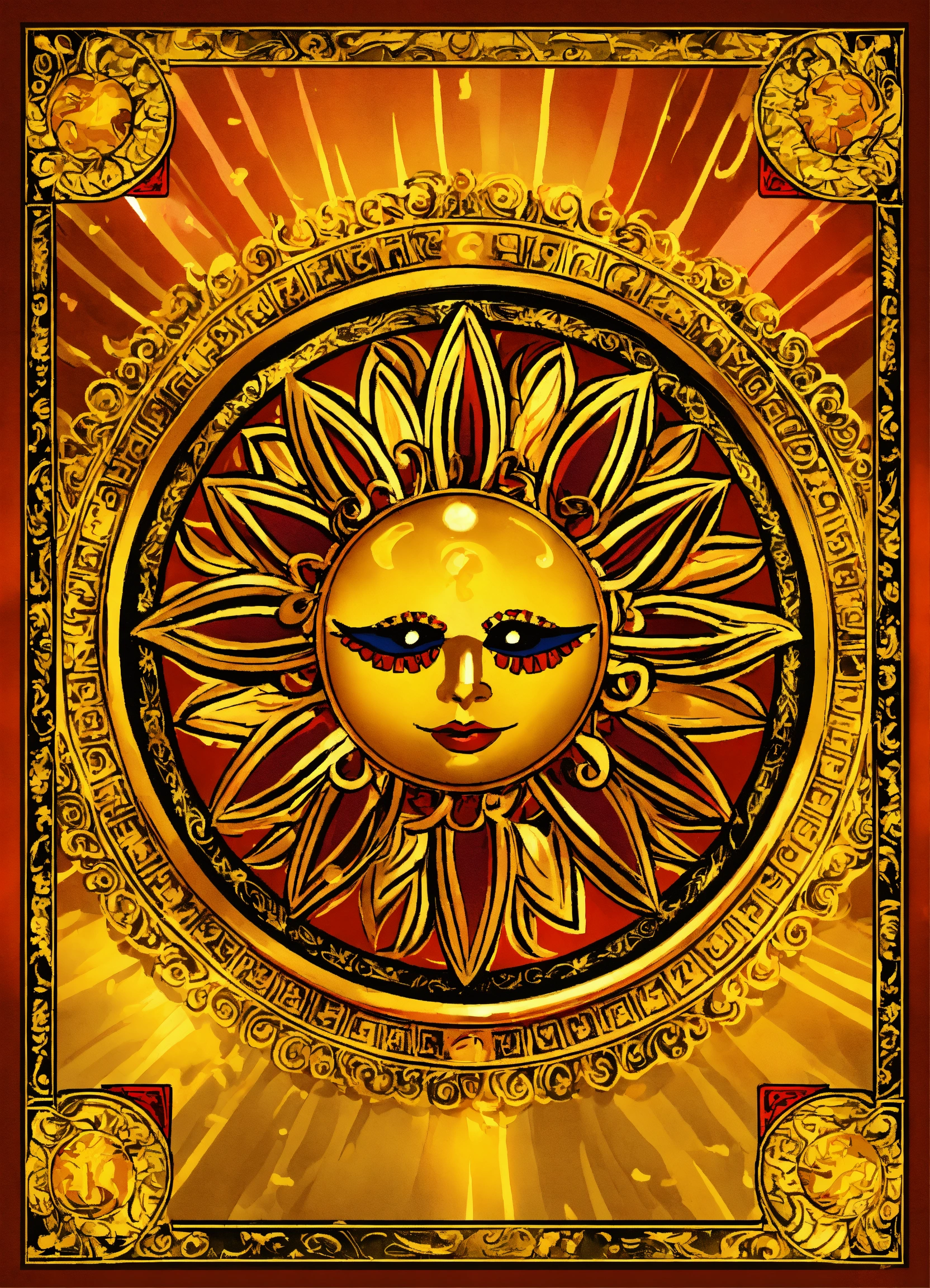 The sun, based on the card "el sol" of the mexican lottery deck in anime style. gold background card styled.