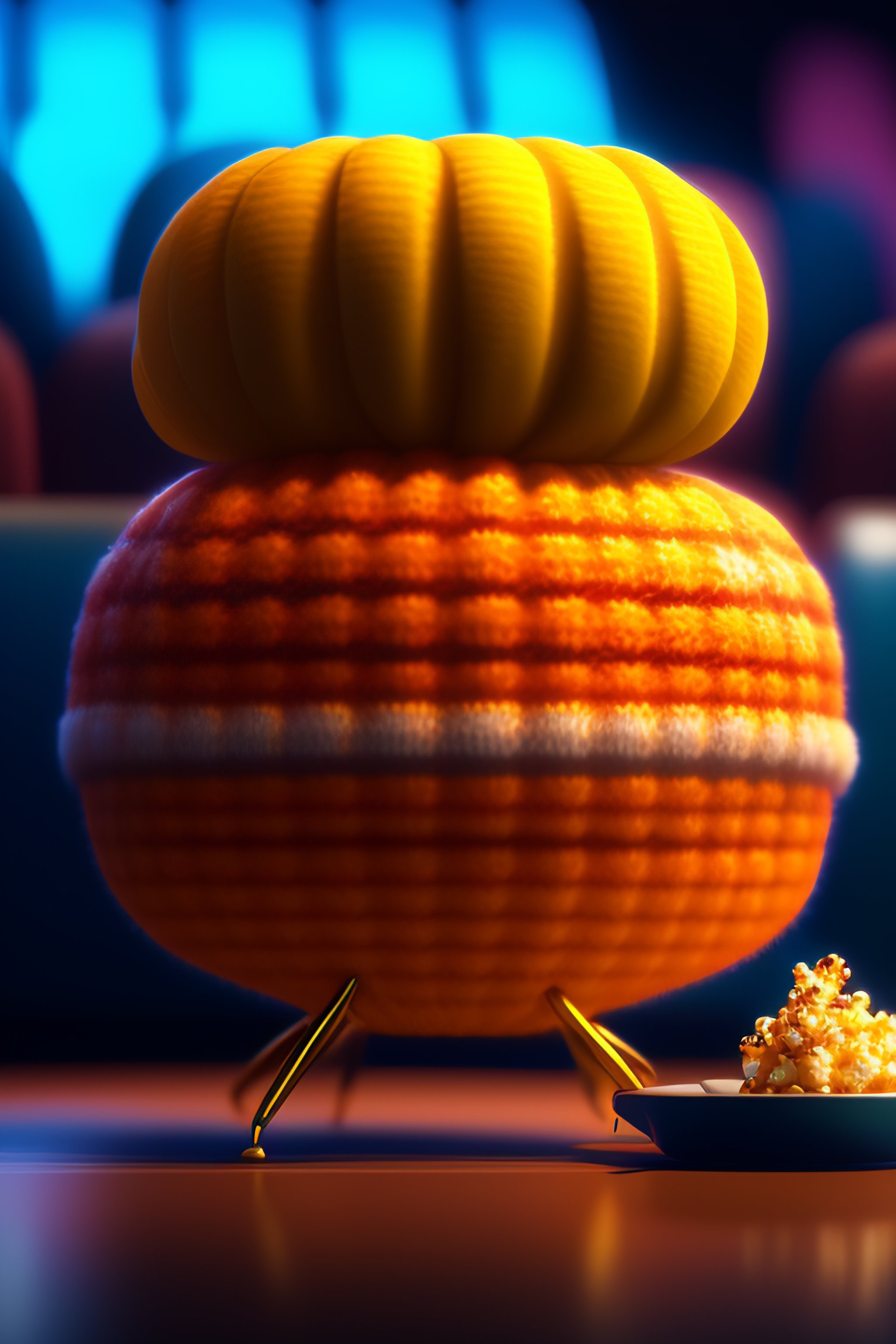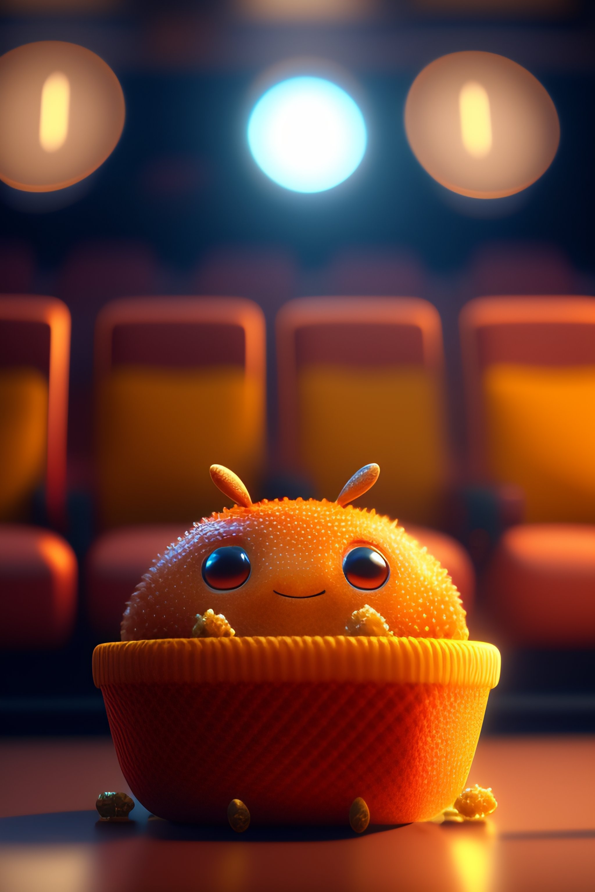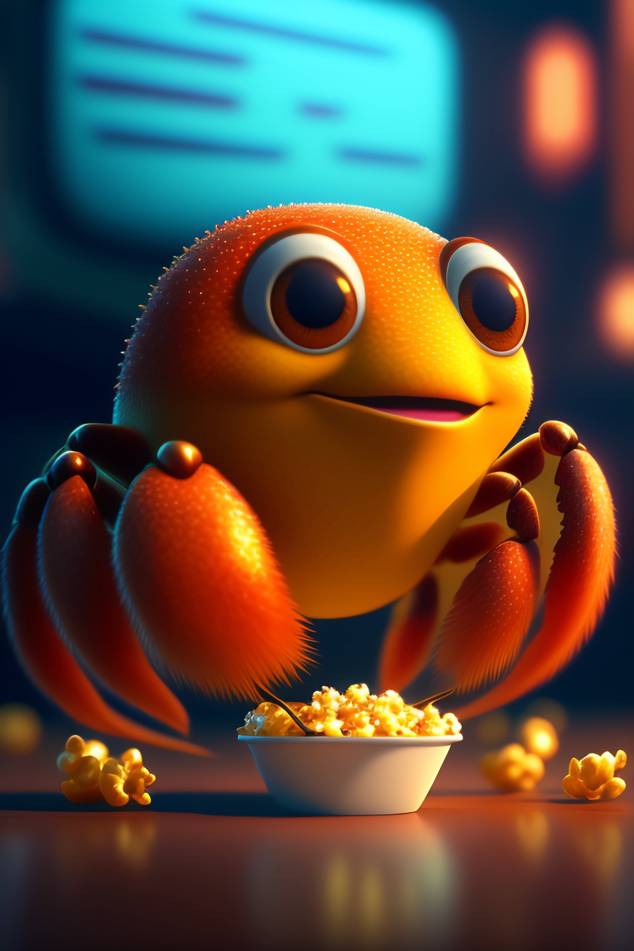 Cute small humanoid crab sitting in a movie theater eating popcorn watching a movie, unreal engine, cozy indoor lighting, artstation, detailed, digital painting, cinematic, character design by mark ryden and pixar and hayao miyazaki, unreal 5, daz, hyperrealistic, octane render
