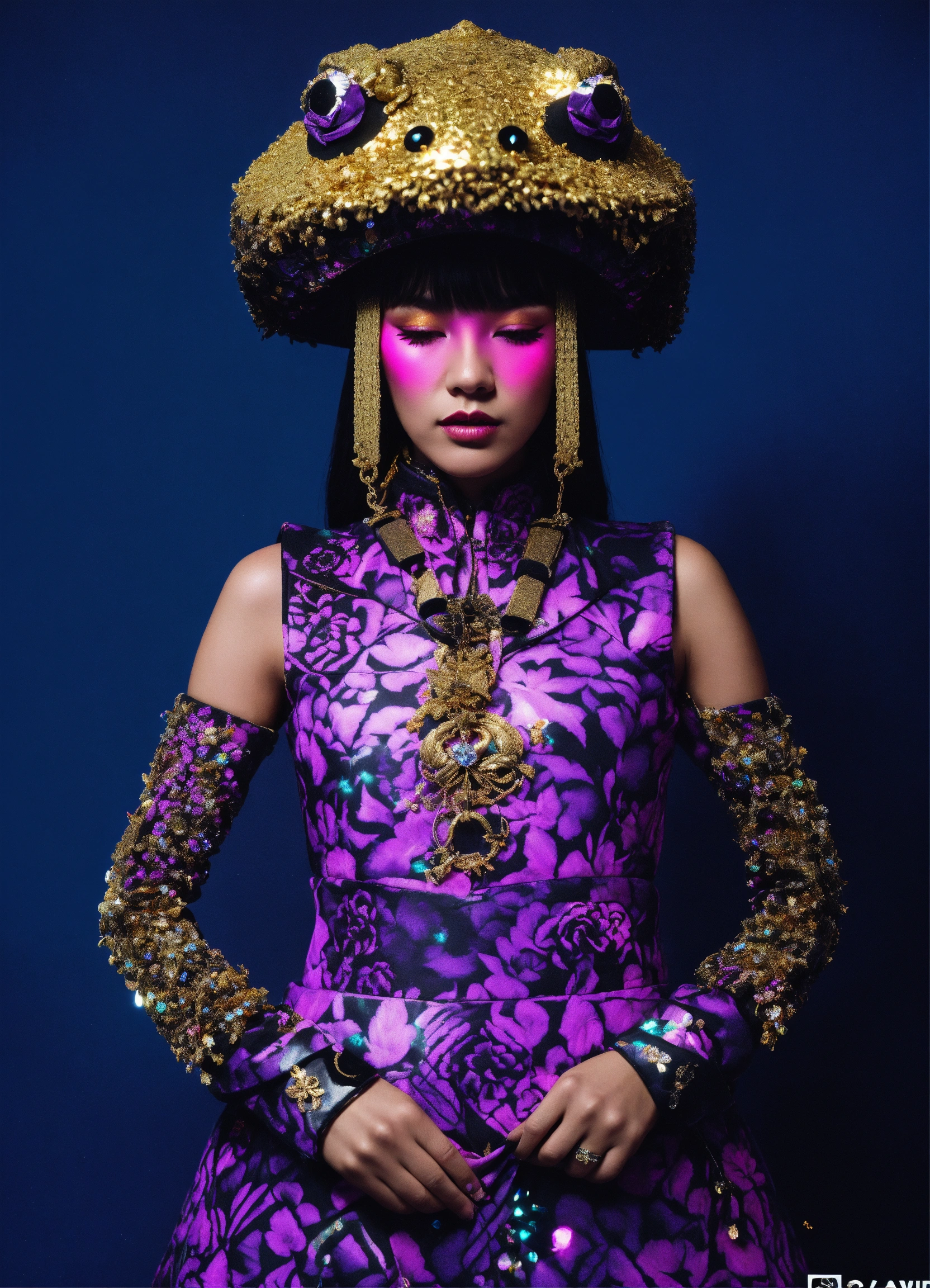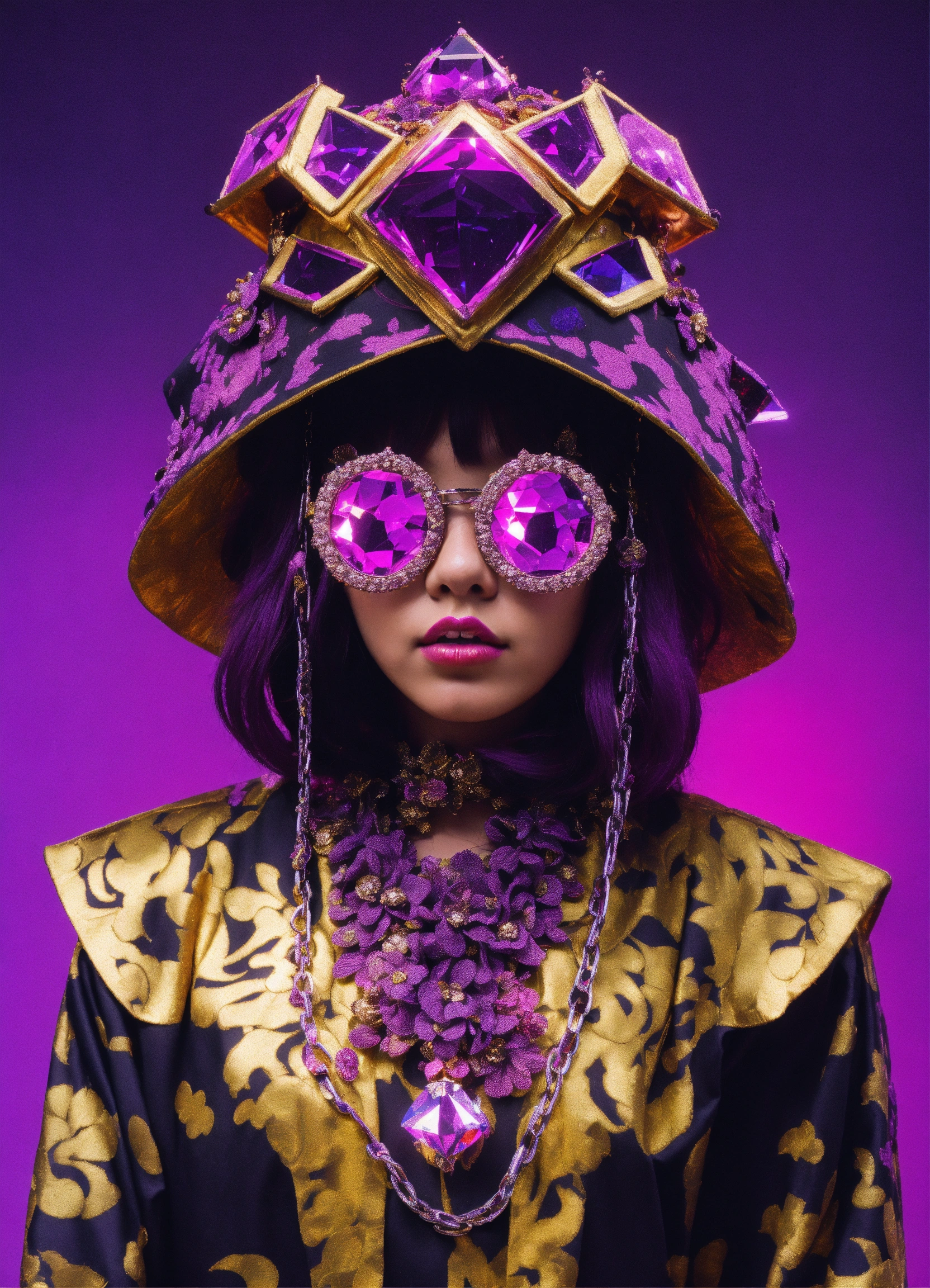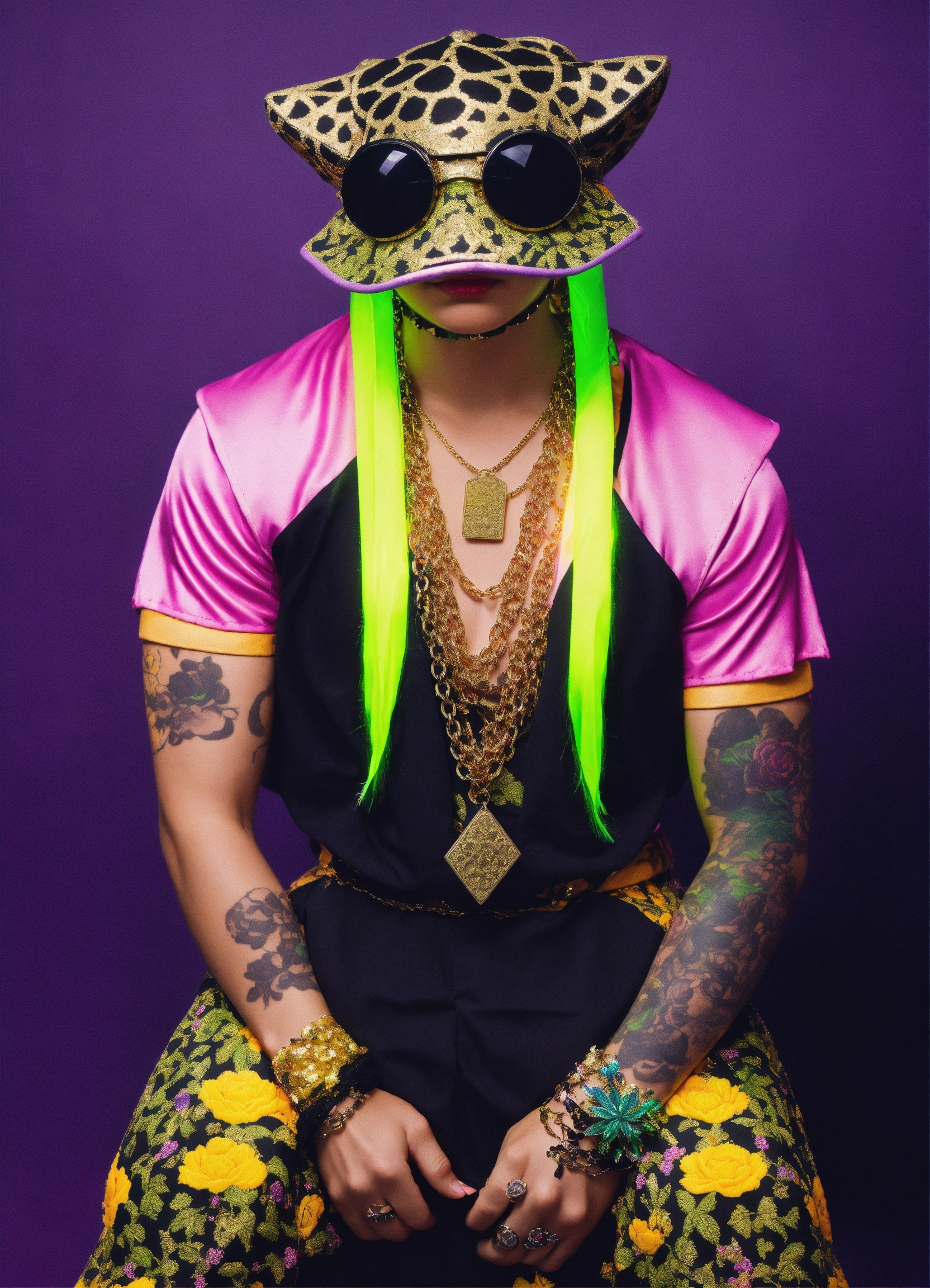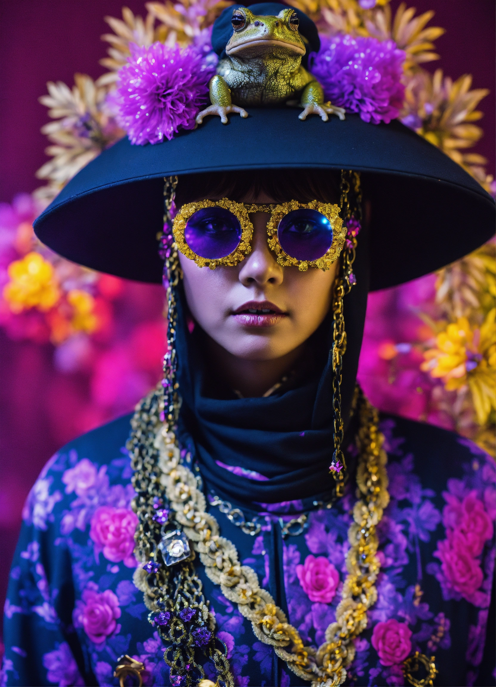 Full body portrait a toad made out of a 3d black floral purple metal diamond light neon optical illusion, festival raver street wear, kawaii hat with crystal hemp gold black chains, ninja qr code samurai in folk costume in a fashion magazine