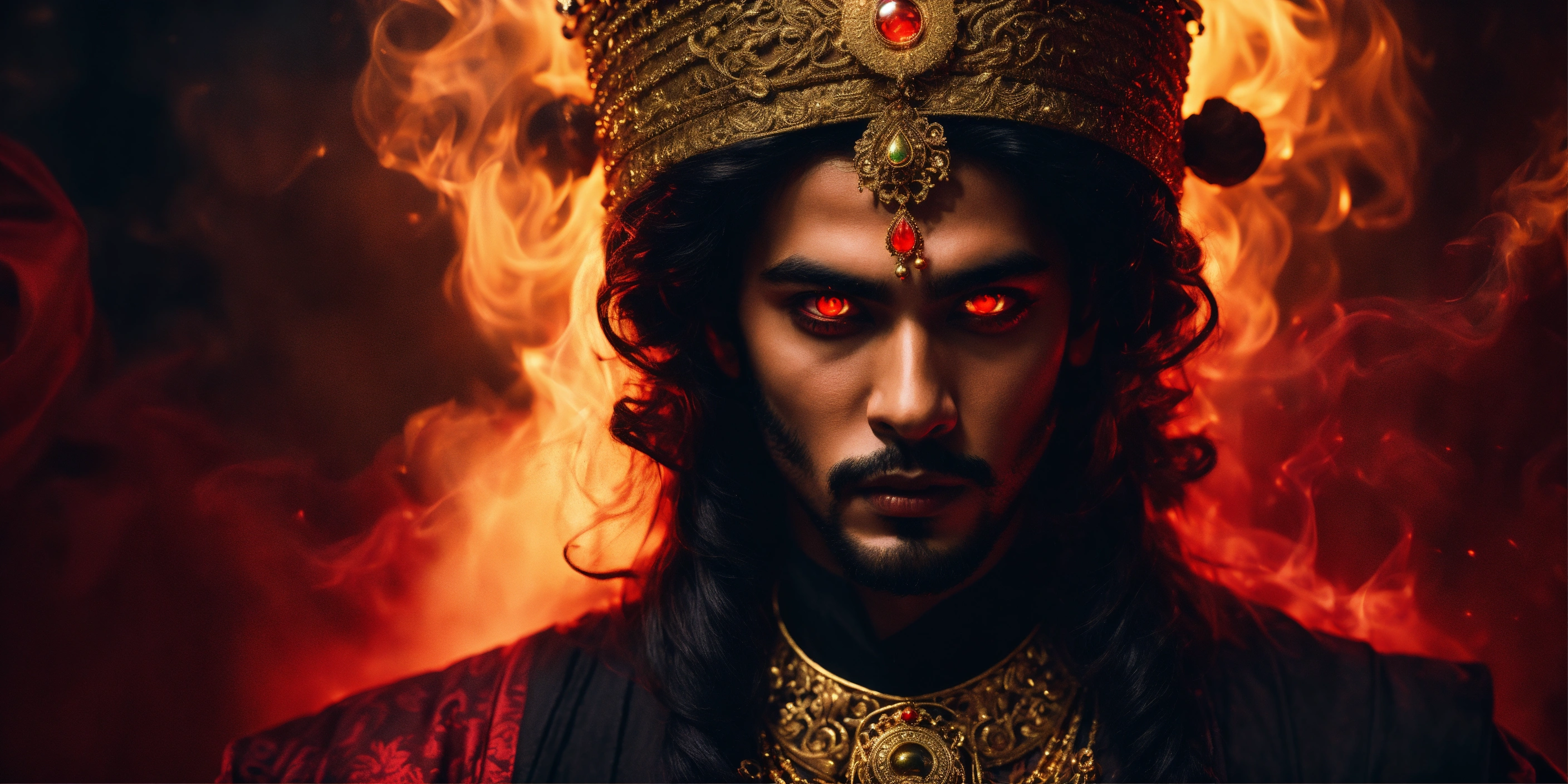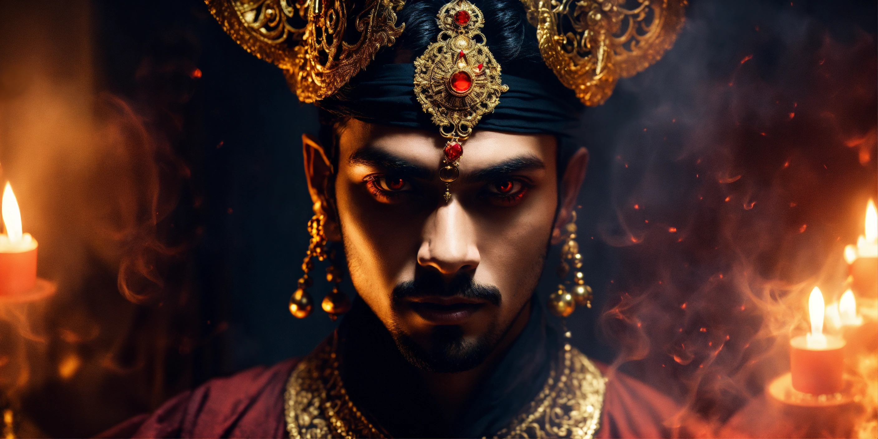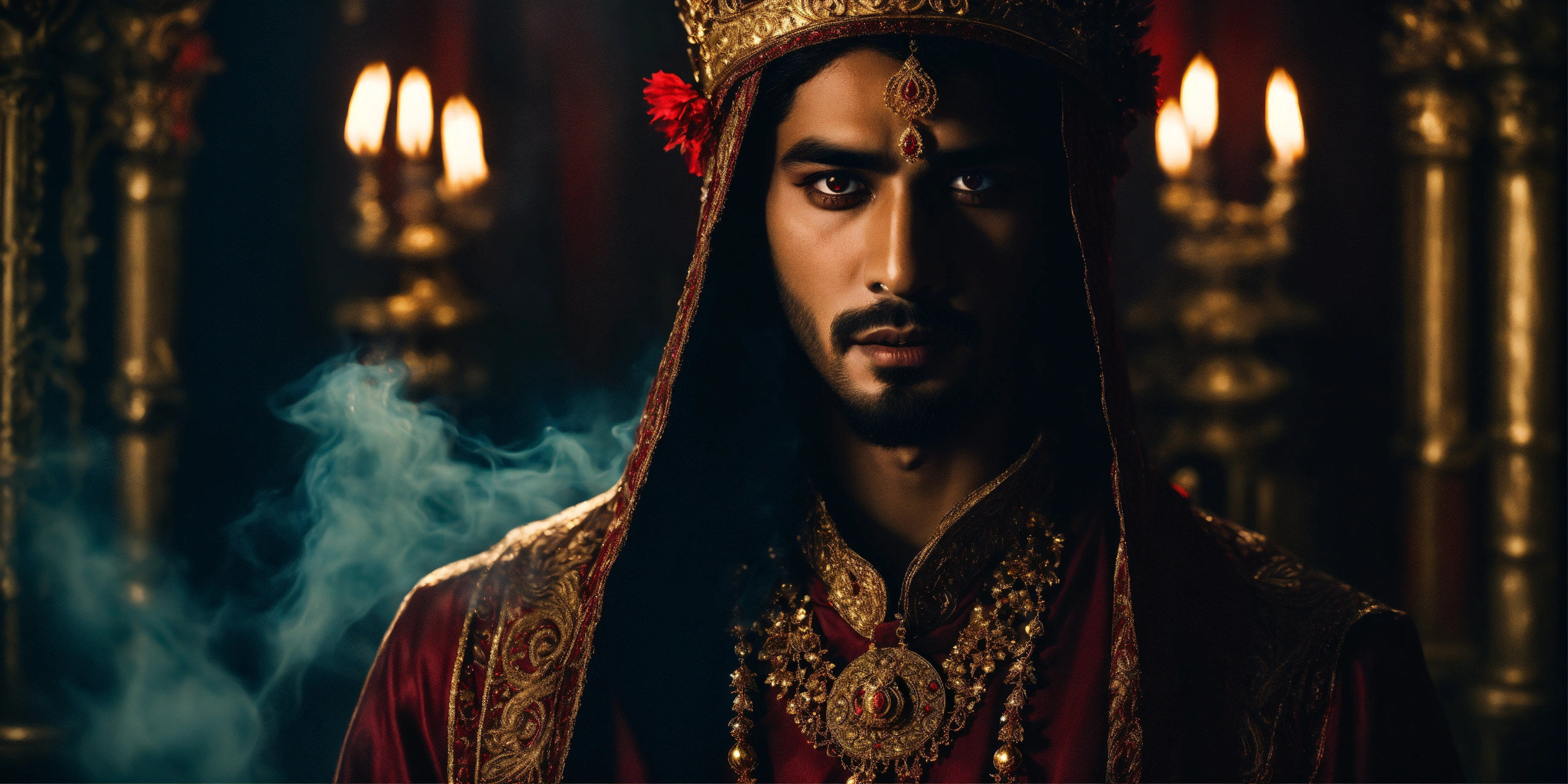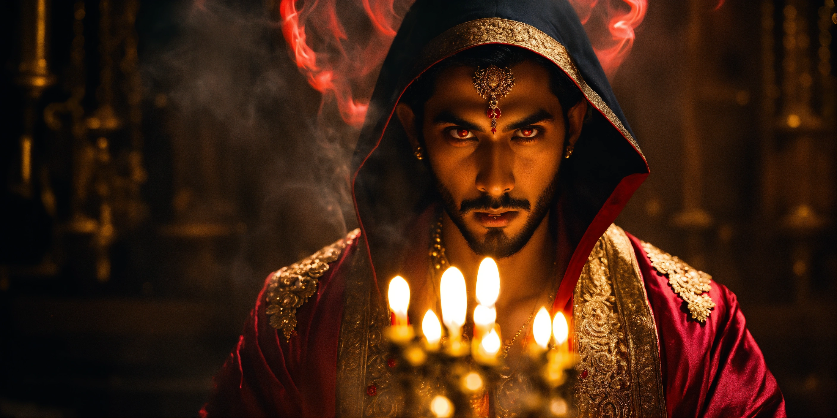 Sinister and dramatic portrait of a young handsome south asian diabolical sorcerer with glowing red eyes wearing dark elaborate robes and ornate gold jewellery hypnotising the viewer in a dimly lit occult chamber enveloped in incense smoke
