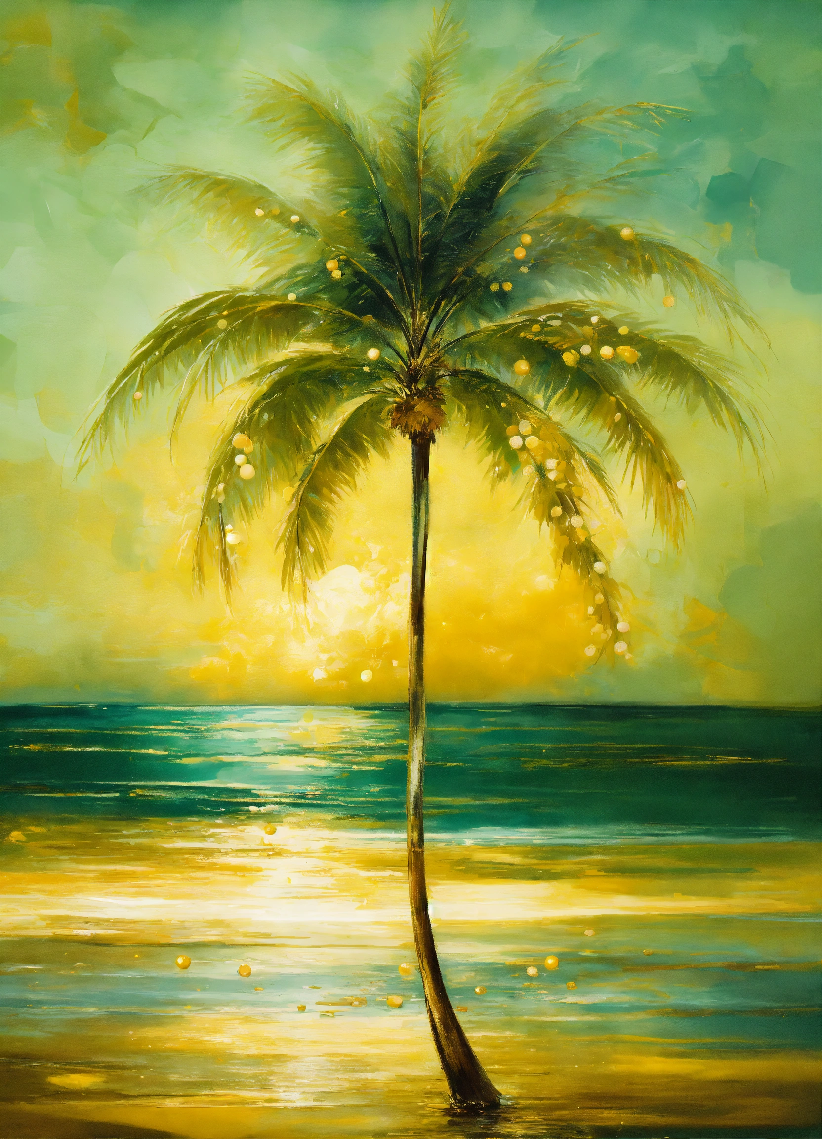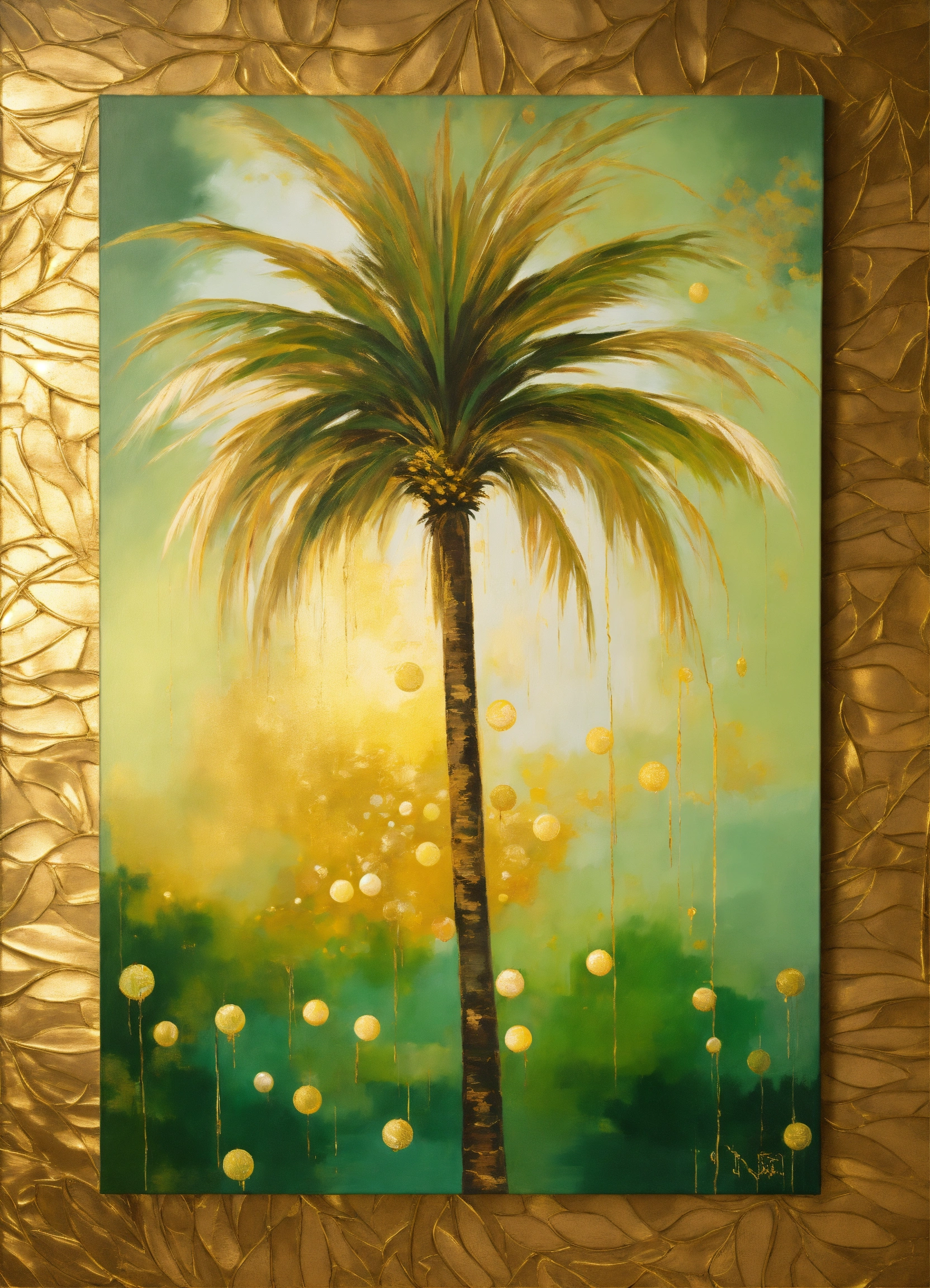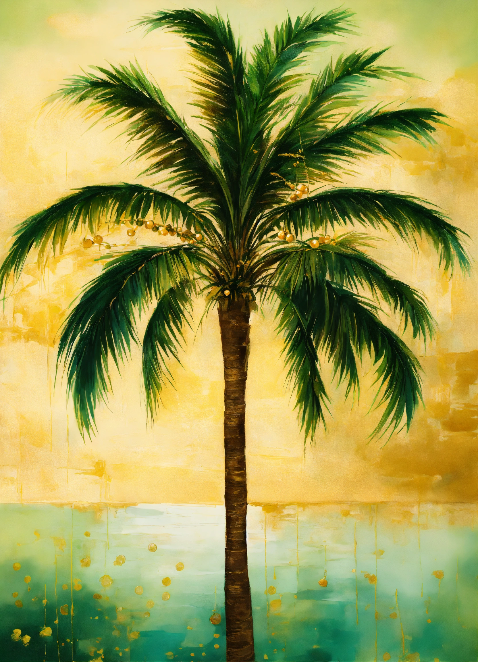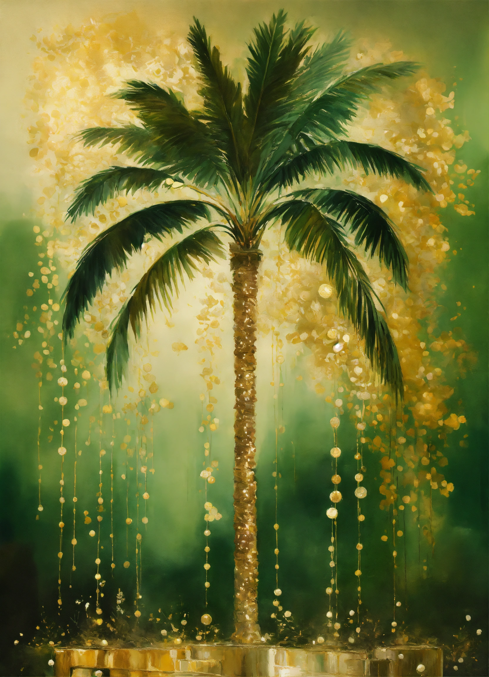 One tall palm tree in painting style, elegant in shades of green with touches of gold and golden pearls