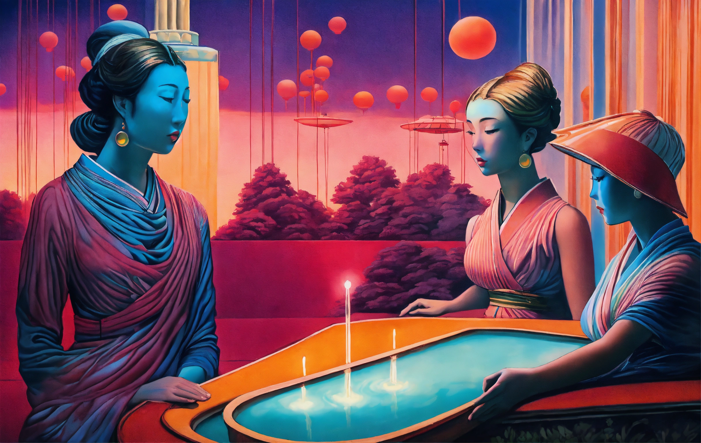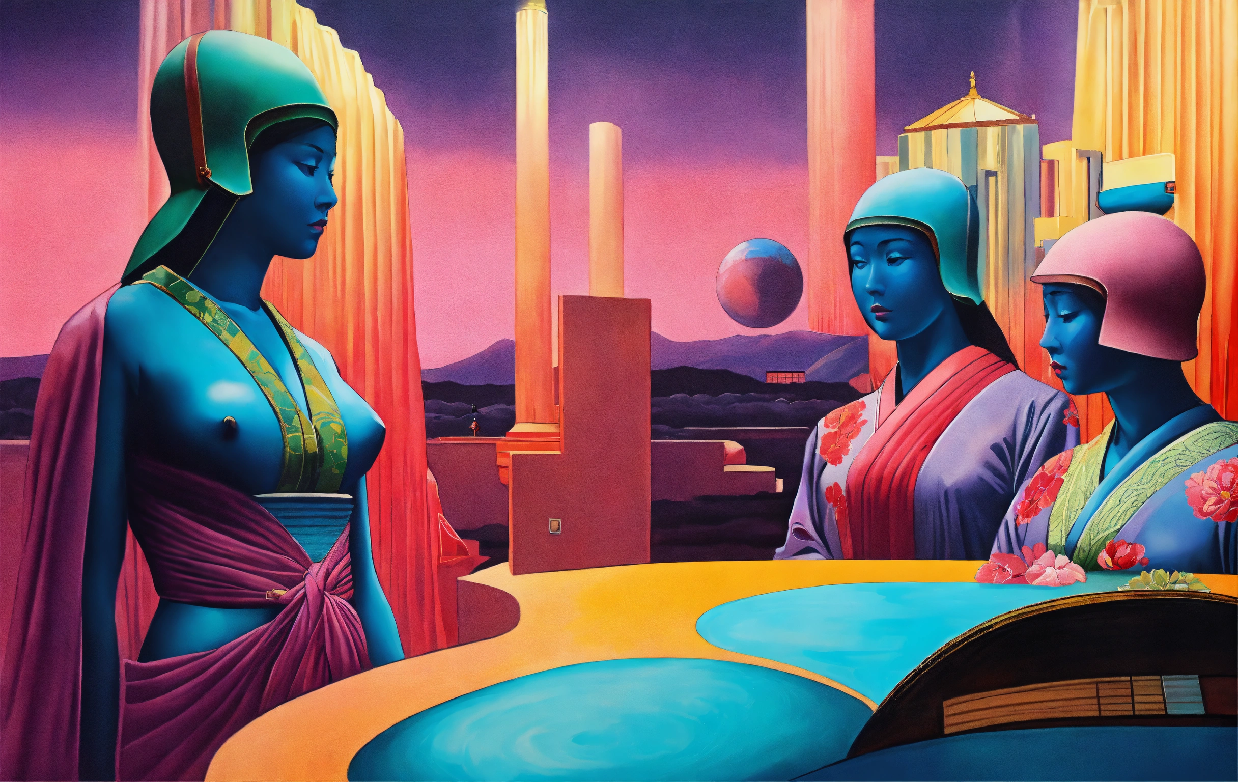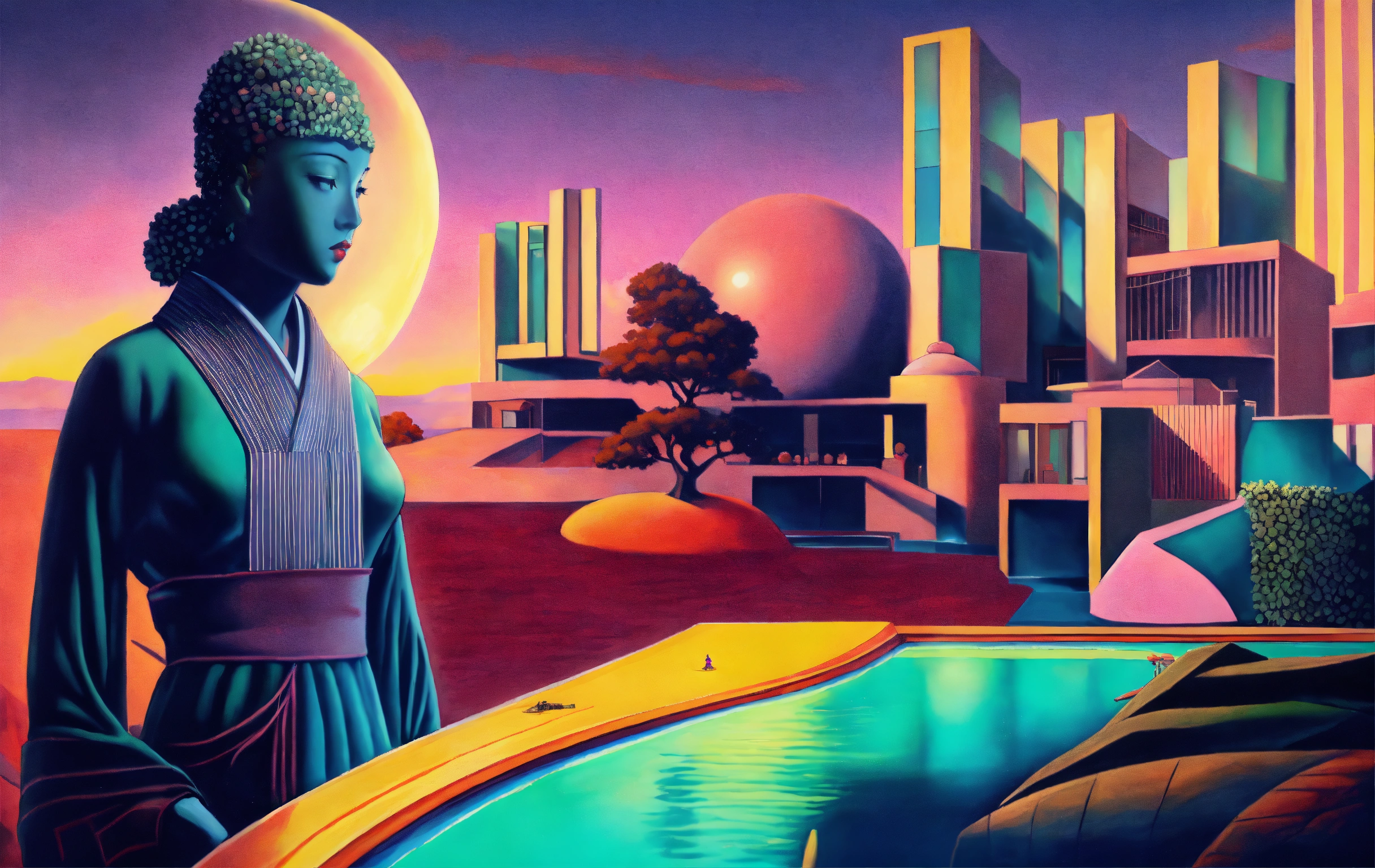 In a hyperrealistic optical illusion-based painting, the japanese venus offers a huge ufo to us and there is a swimming pool in her background, by rene magritte and raphael, a surrealistic setting, 64k cold colors, mute colors, optical illusion