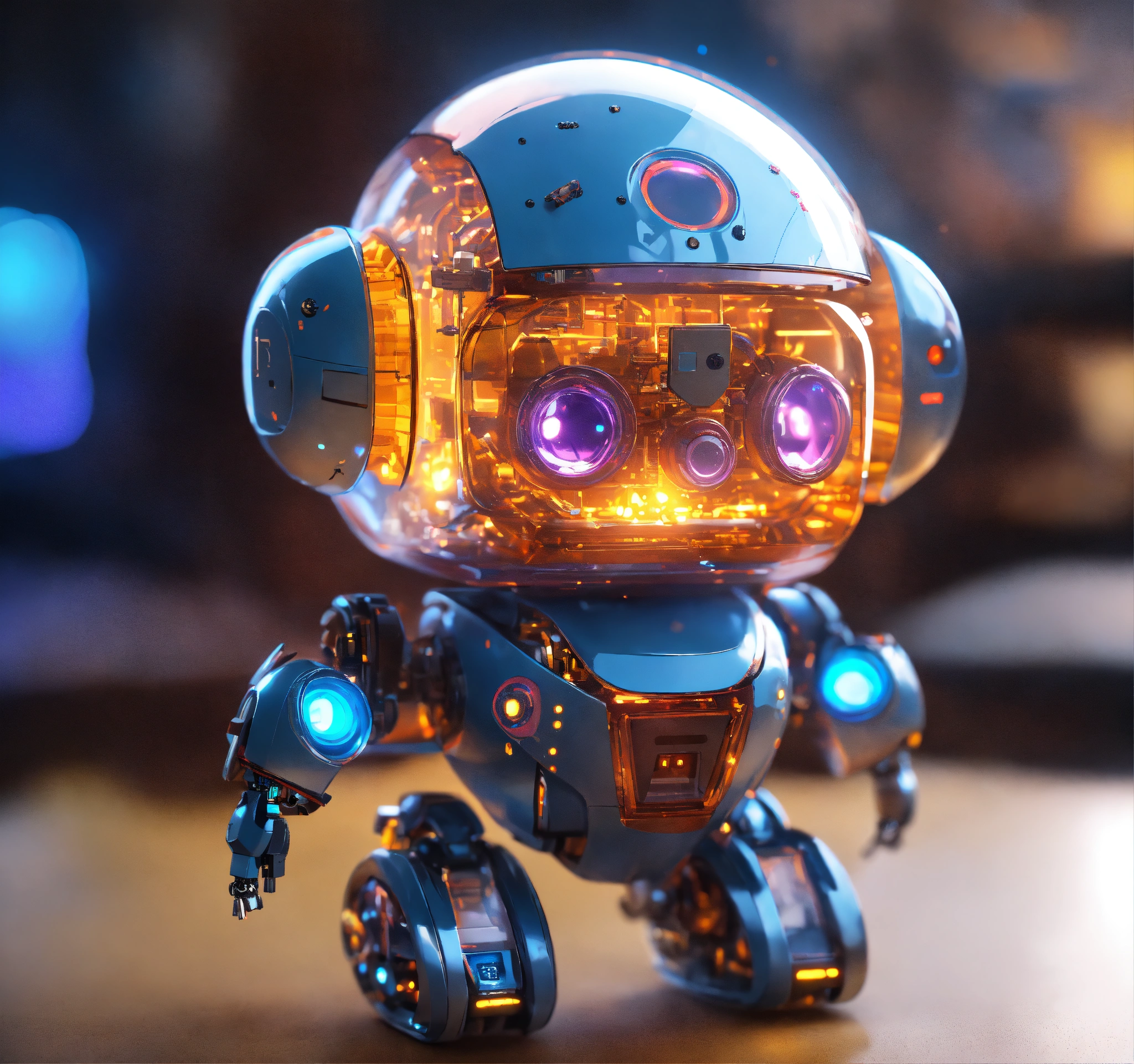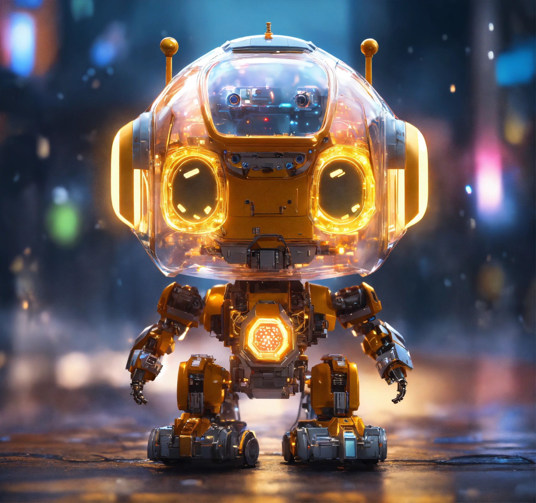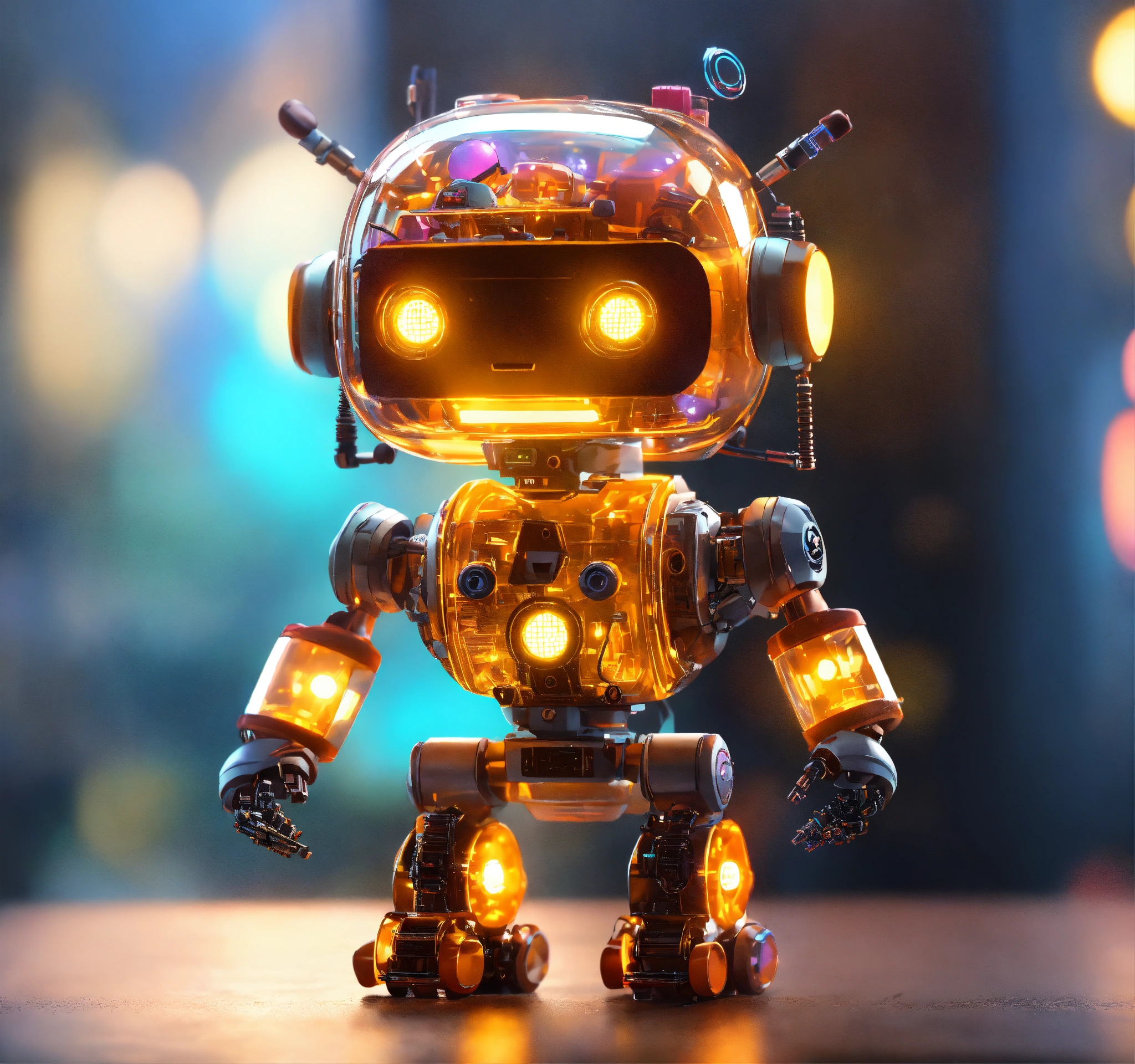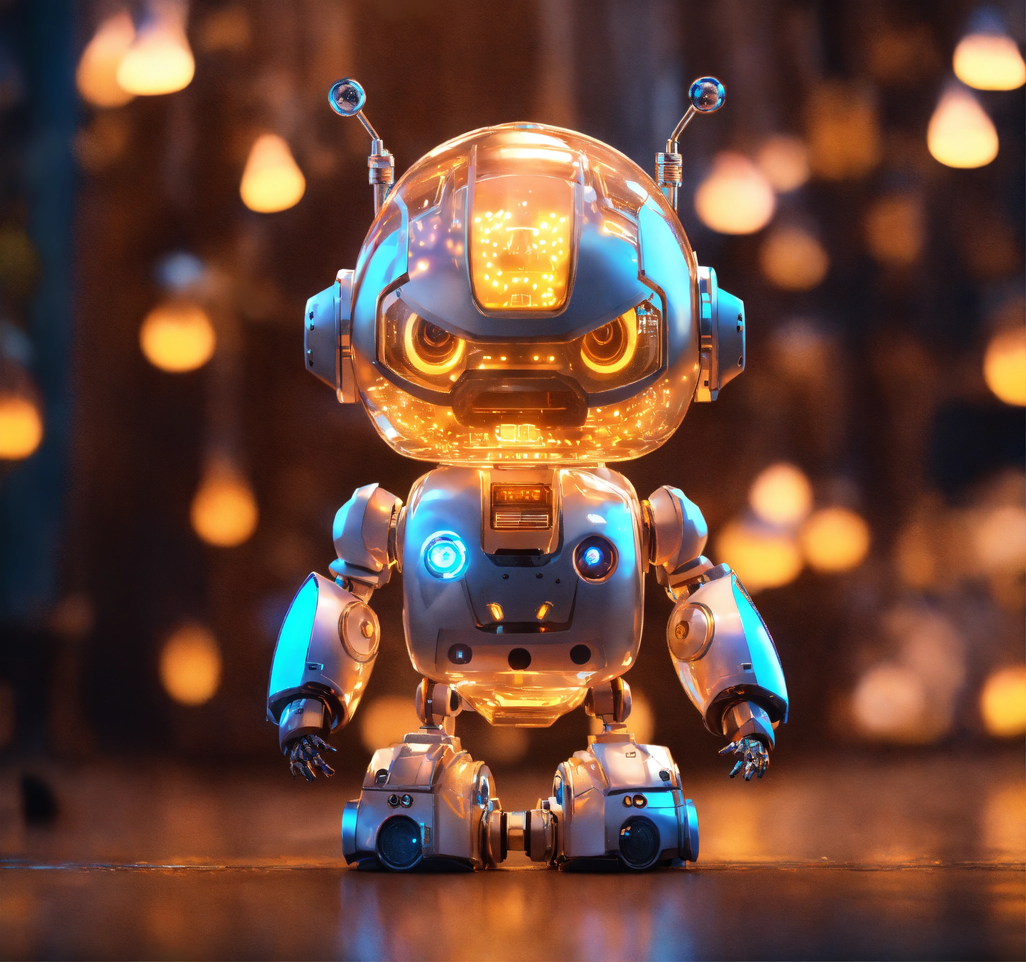 Adorable, a (tiny cute translucent polycarbonate robot) with an led screen face, bomb emoji, stunning unreal engine render, intricate details, bokeh effect, lights