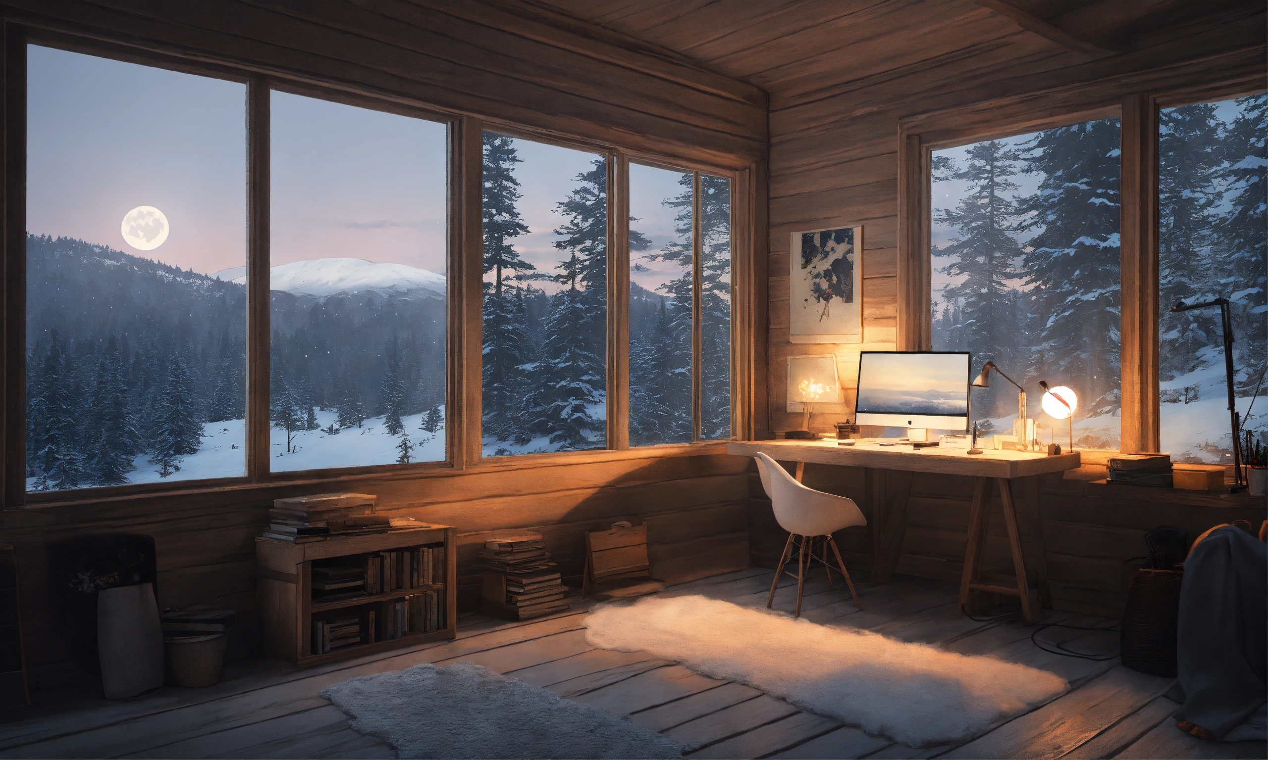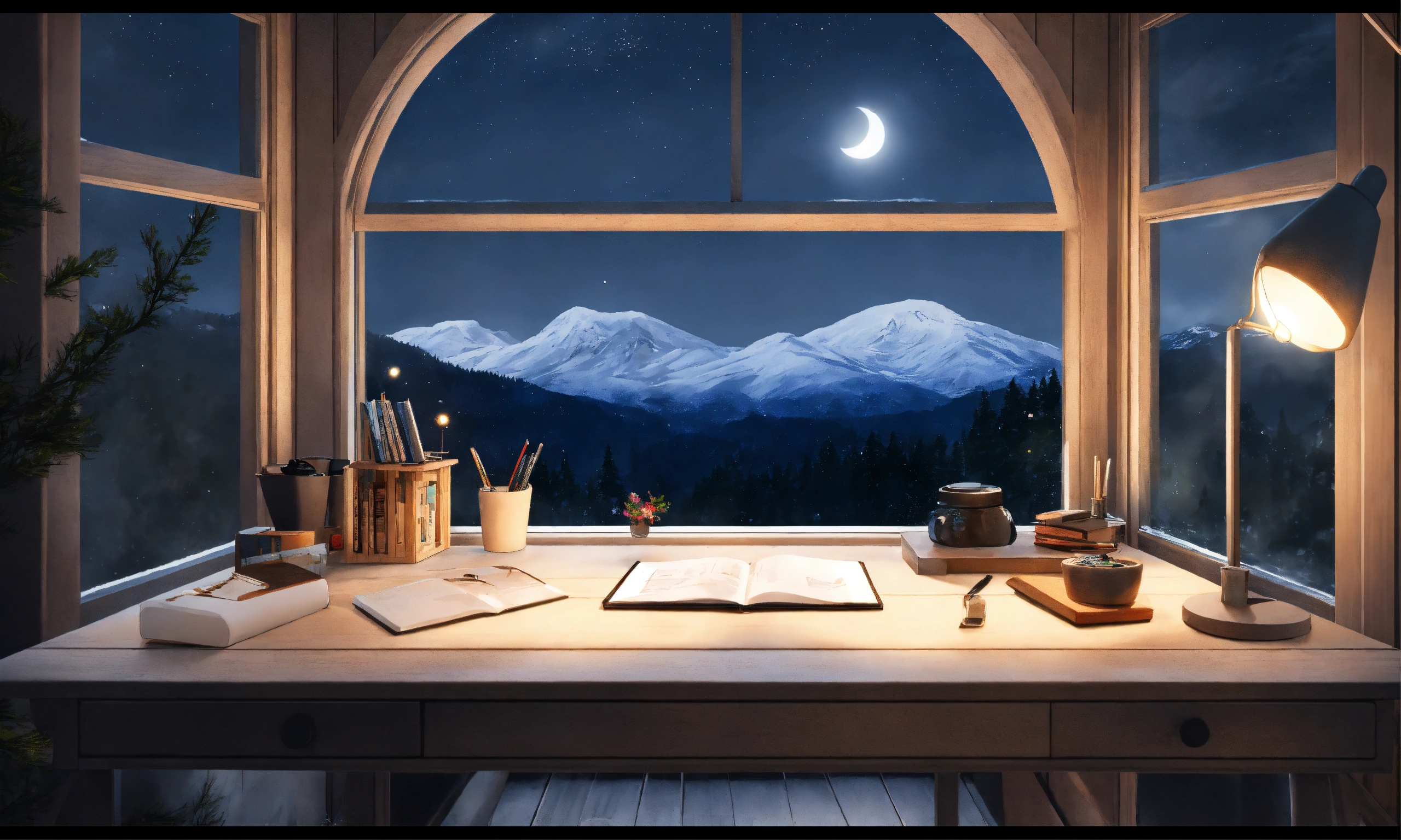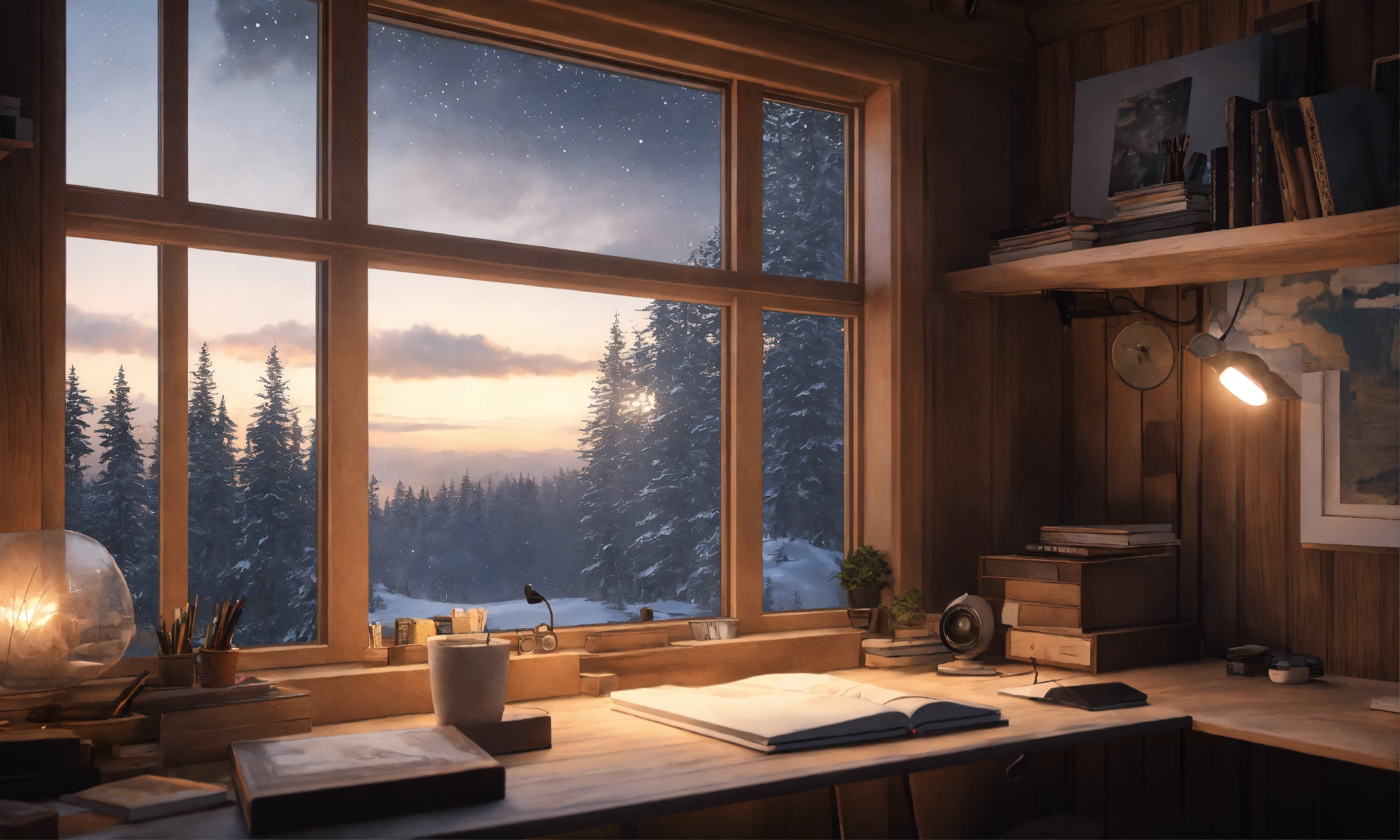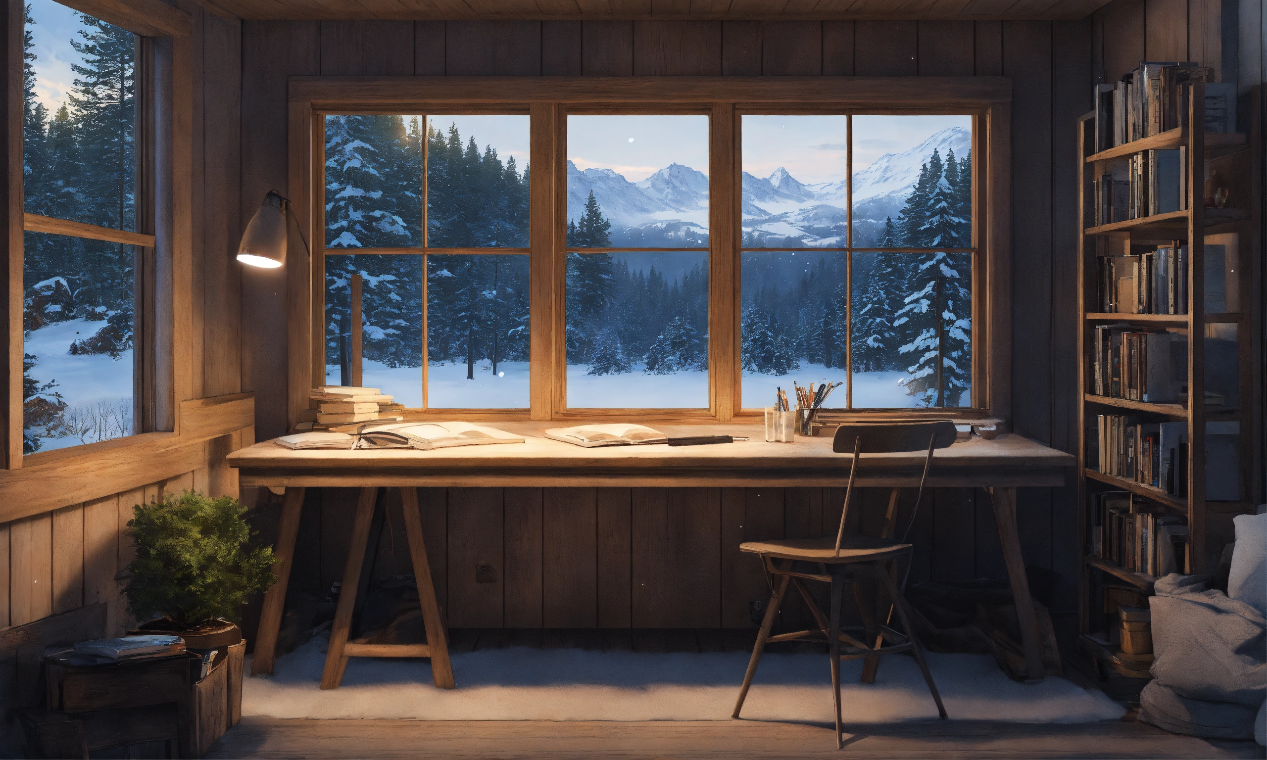 Study desk behind big centered window in nordic cabin, studio ghibli, anime, white washed wooden walls, grey washed acrylic tones, view over forrest and snow, peaceful nighttime, image point of view study desk, minimalistic, lofi artwork