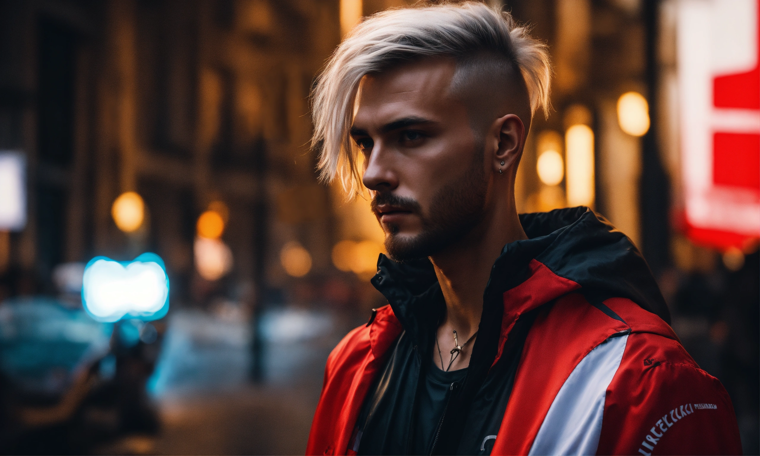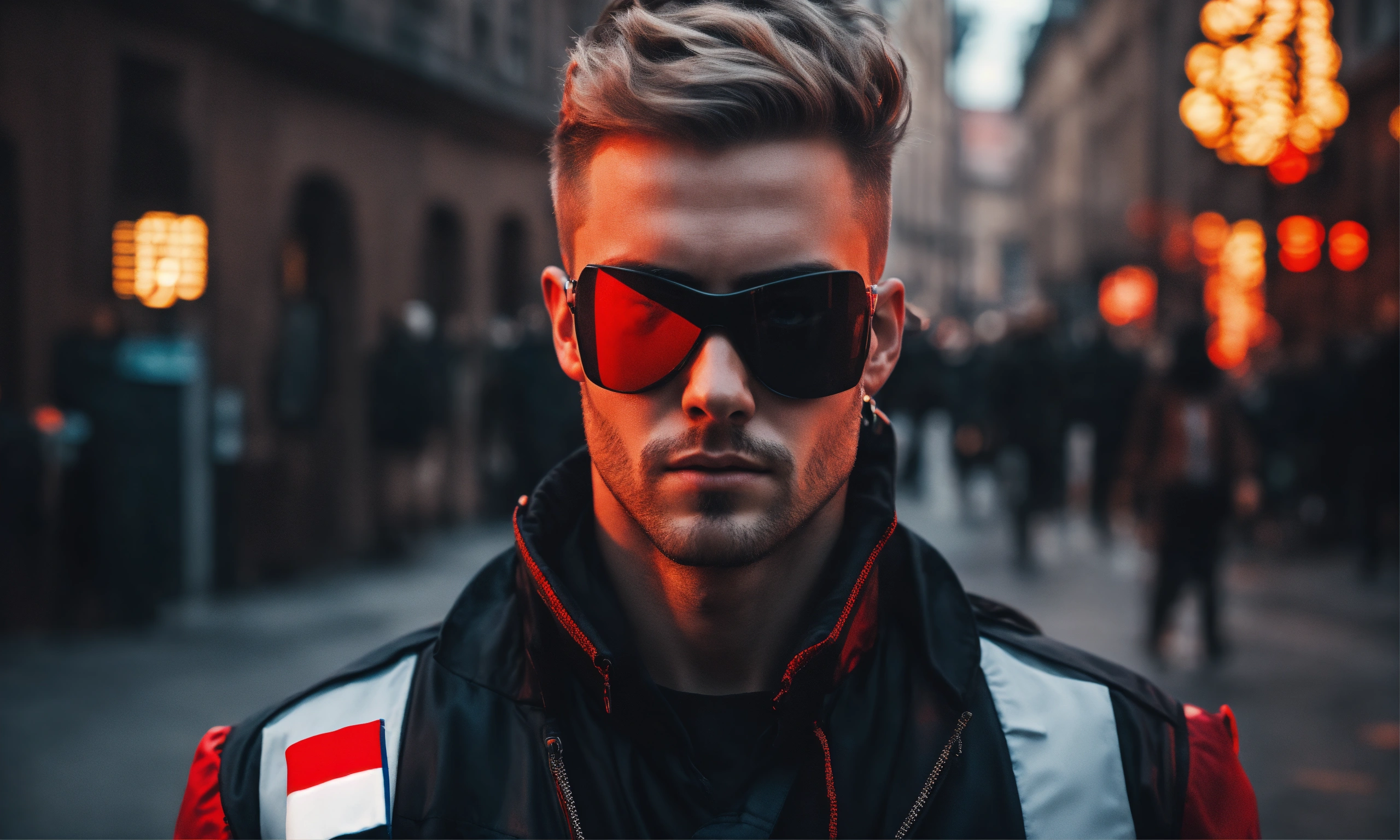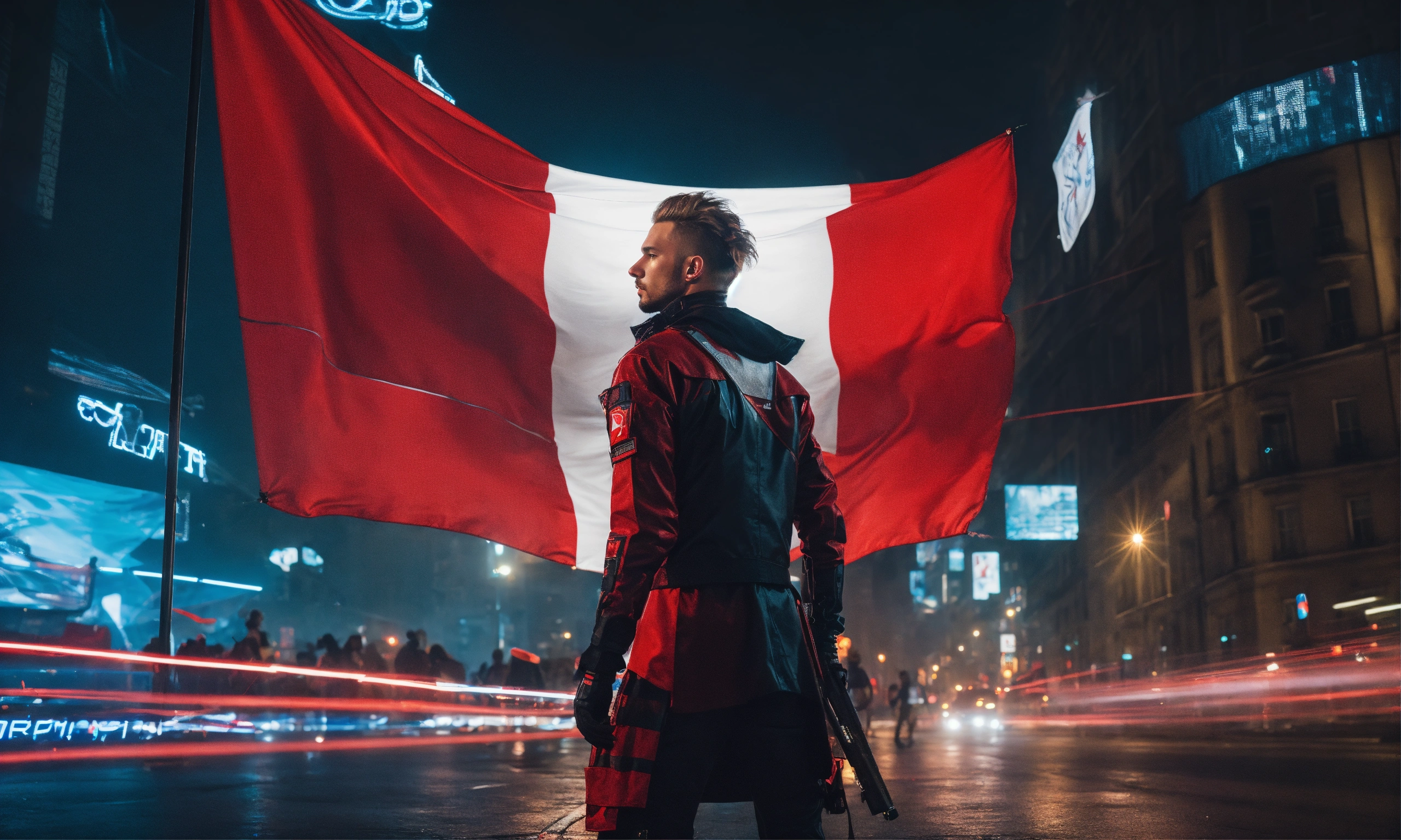 Futuristic cyberpunk image of a beautiful man with poland flag, on street warshaw, without glasess, black background, turism, hair