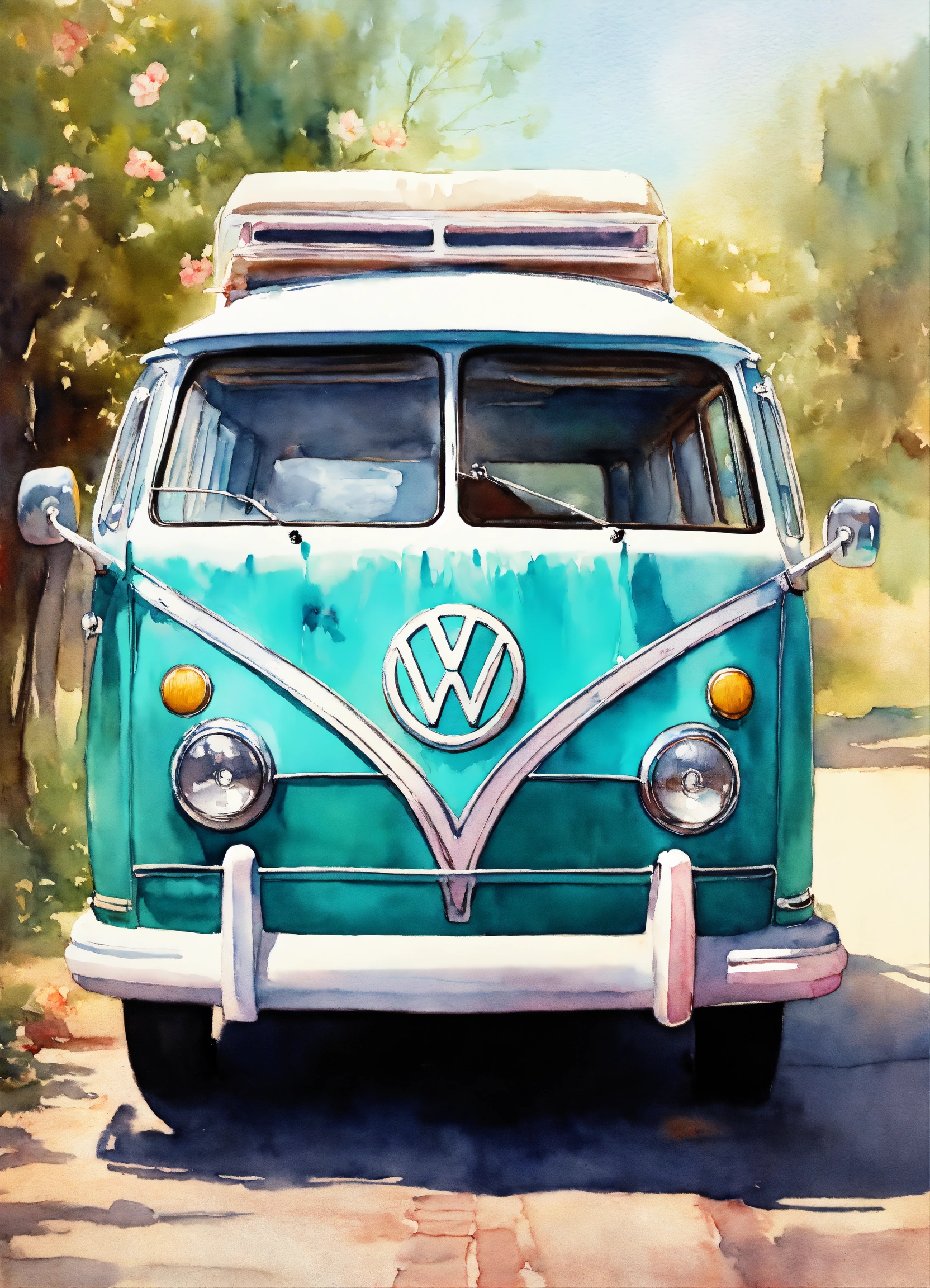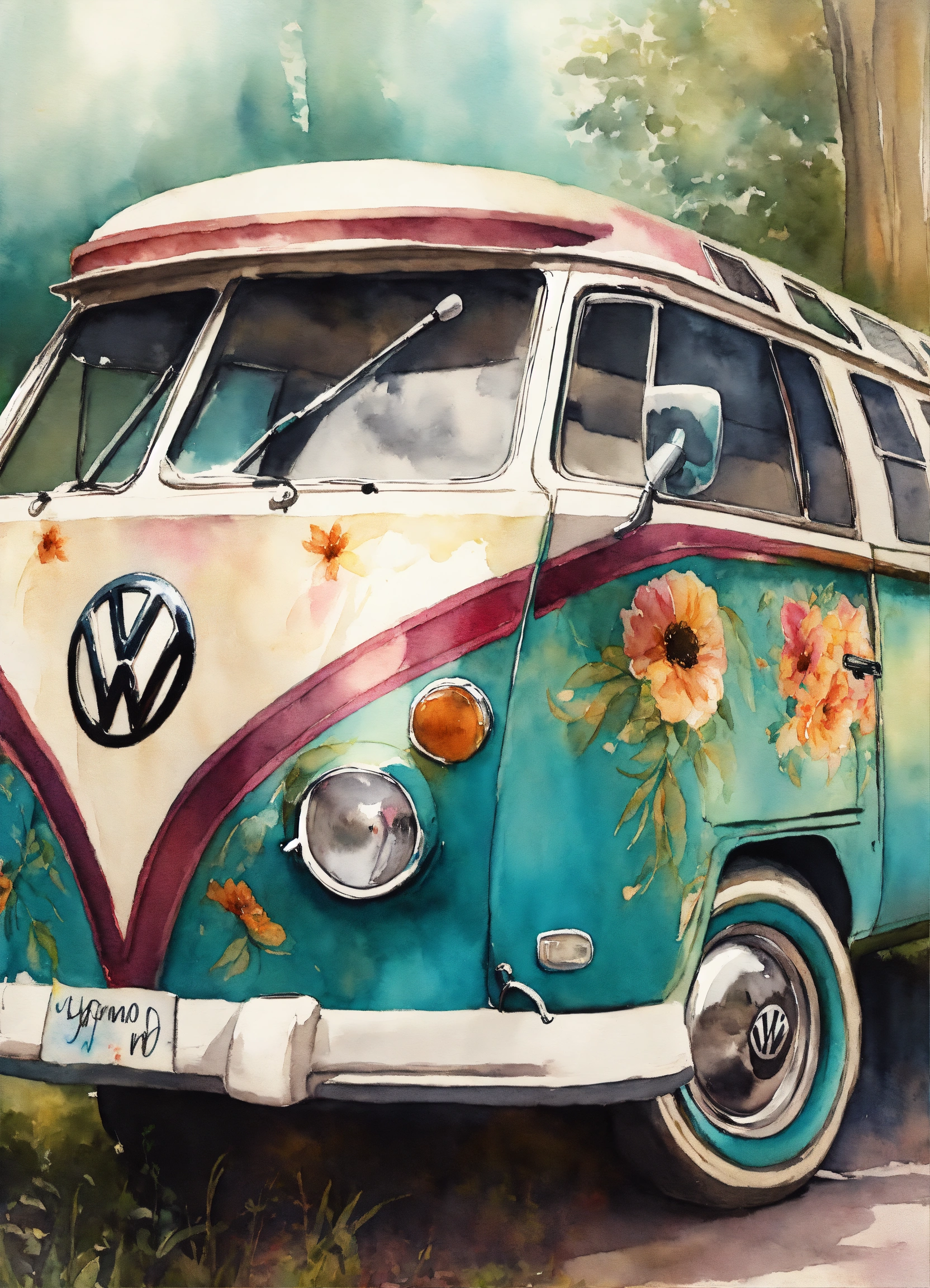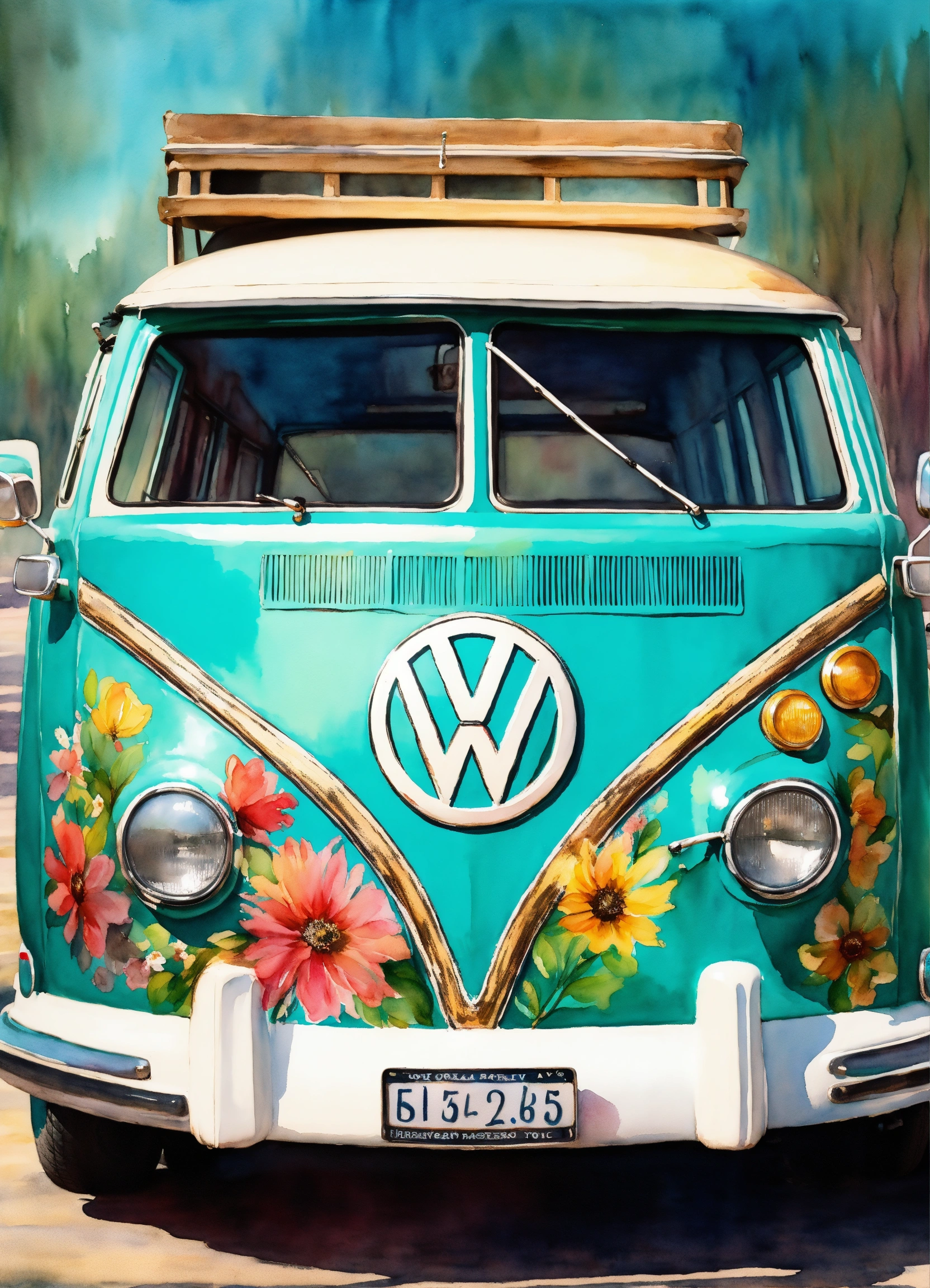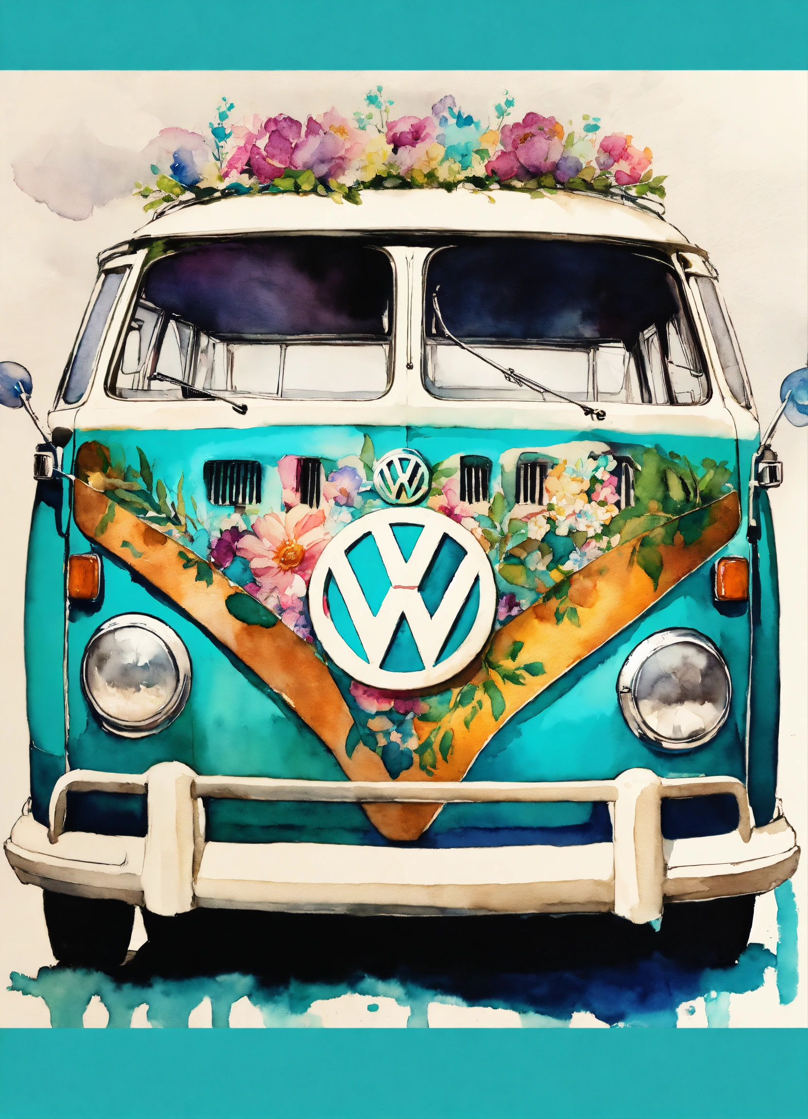 Concept art of turquoise volkswagen bus, watercolor paint on sides, personalized, girly, feminine, handpainted, artsy, boho, hyper realistic, realistic, hyper realism, painted, beautiful, unique, floral, vintage, hippie