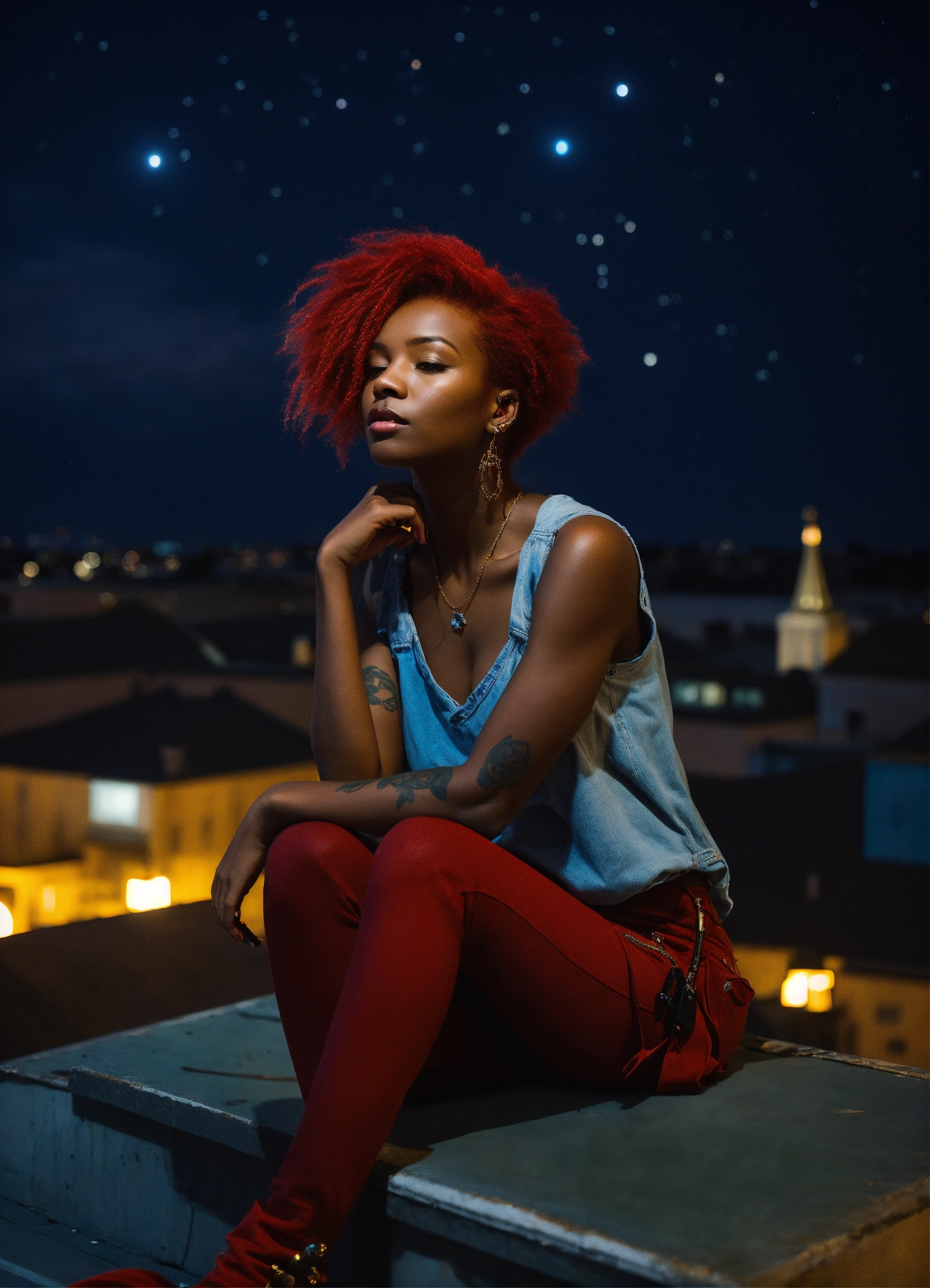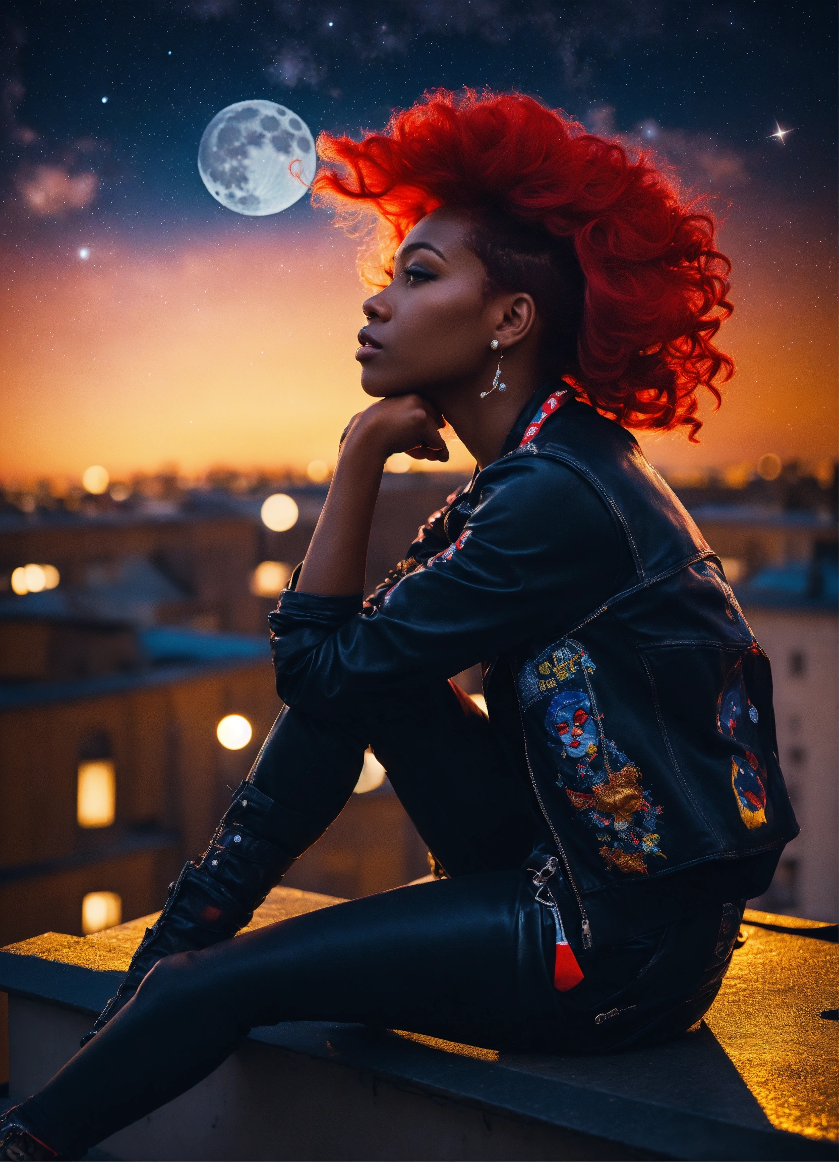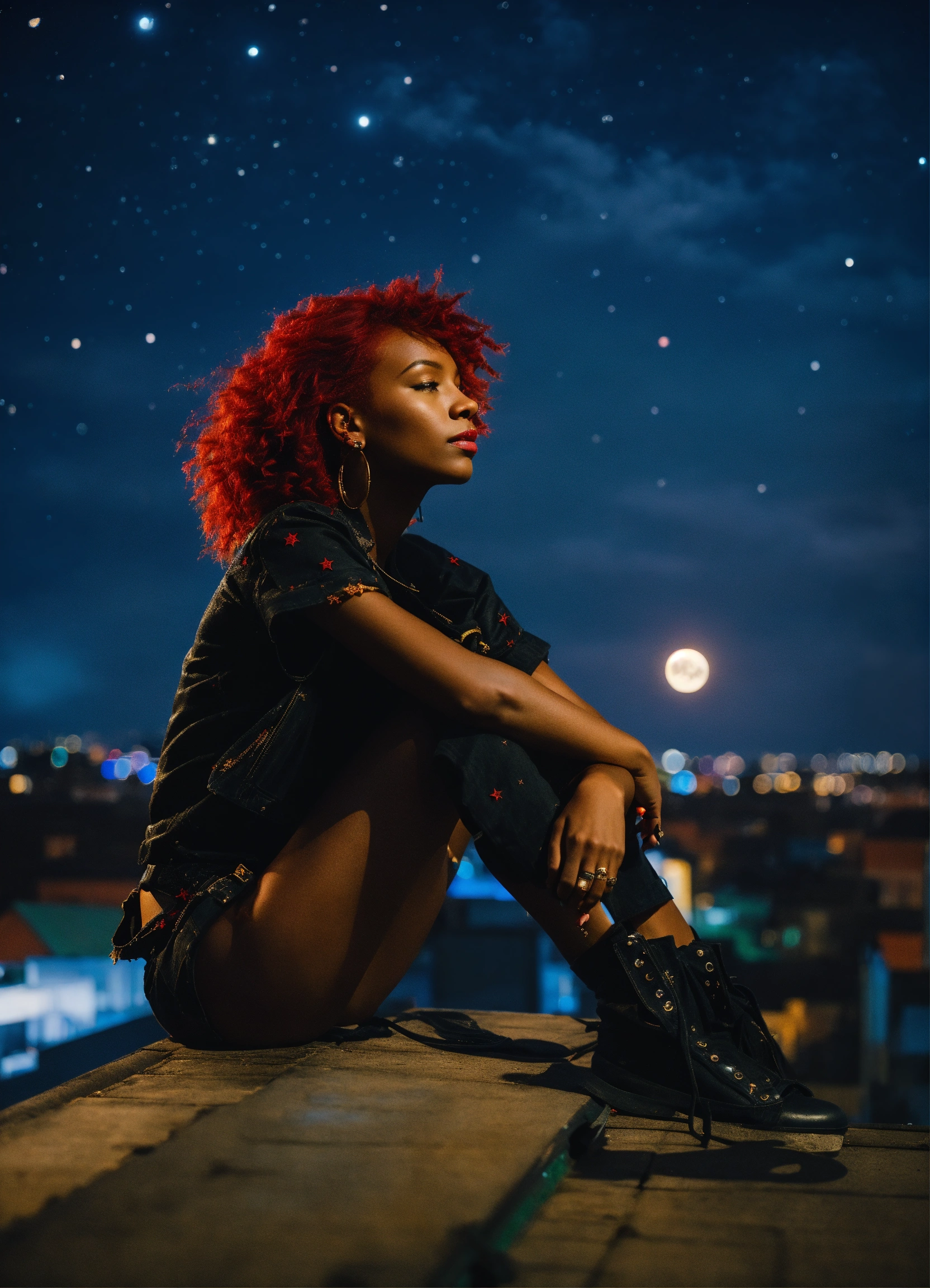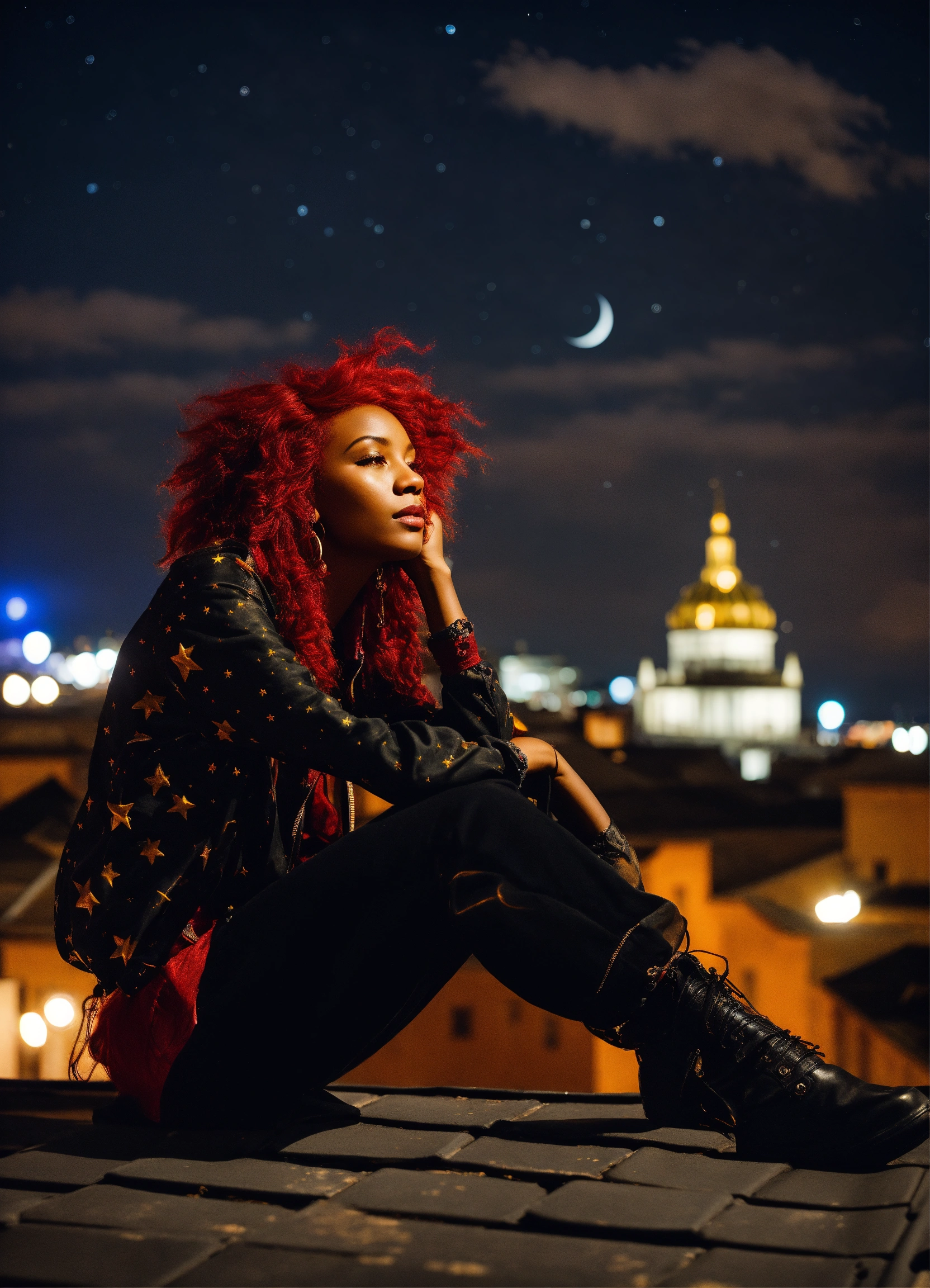 Black woman with red hair in punk attire, sitting on a rooftop in st. petersburg, moonlit starry sky, daydreaming