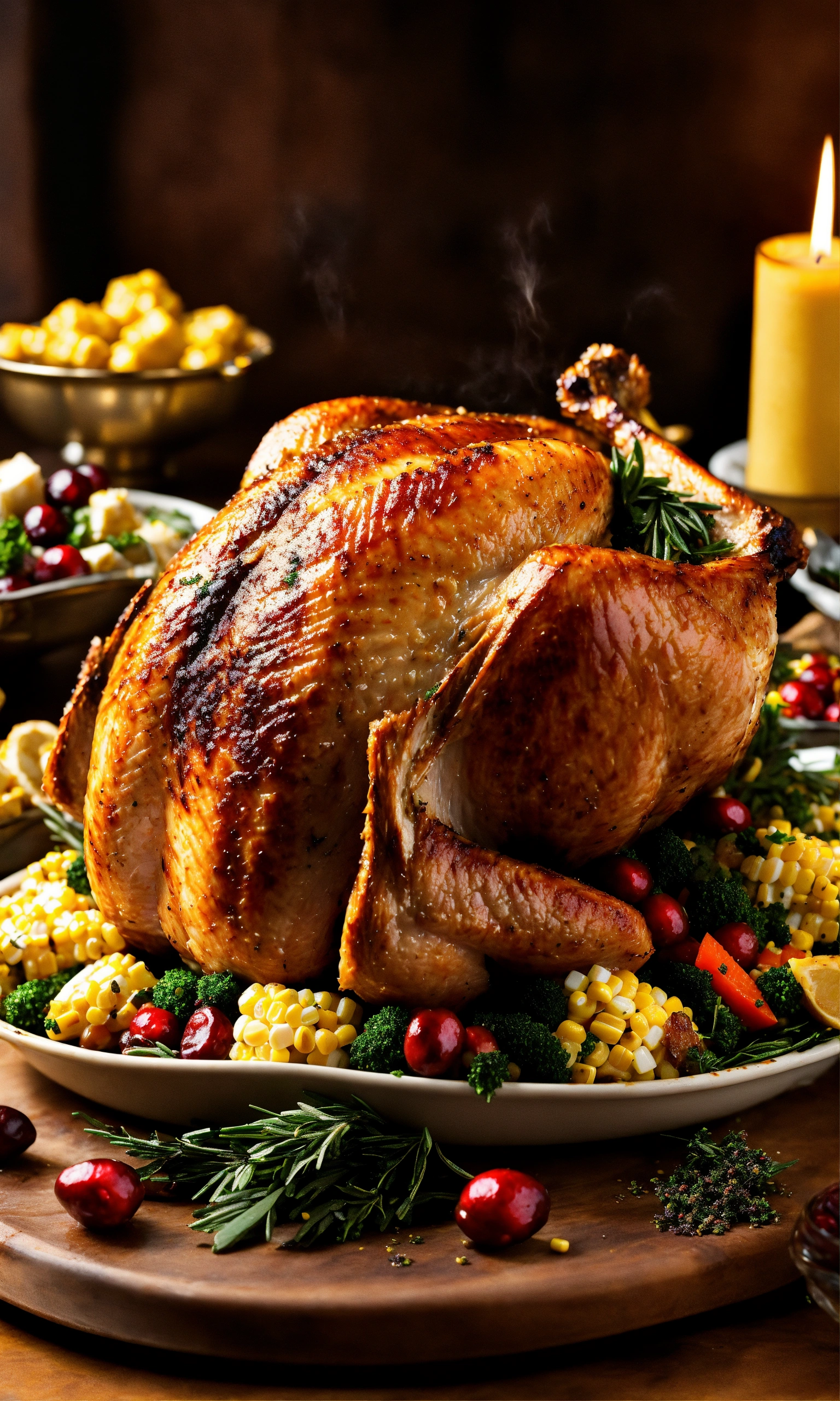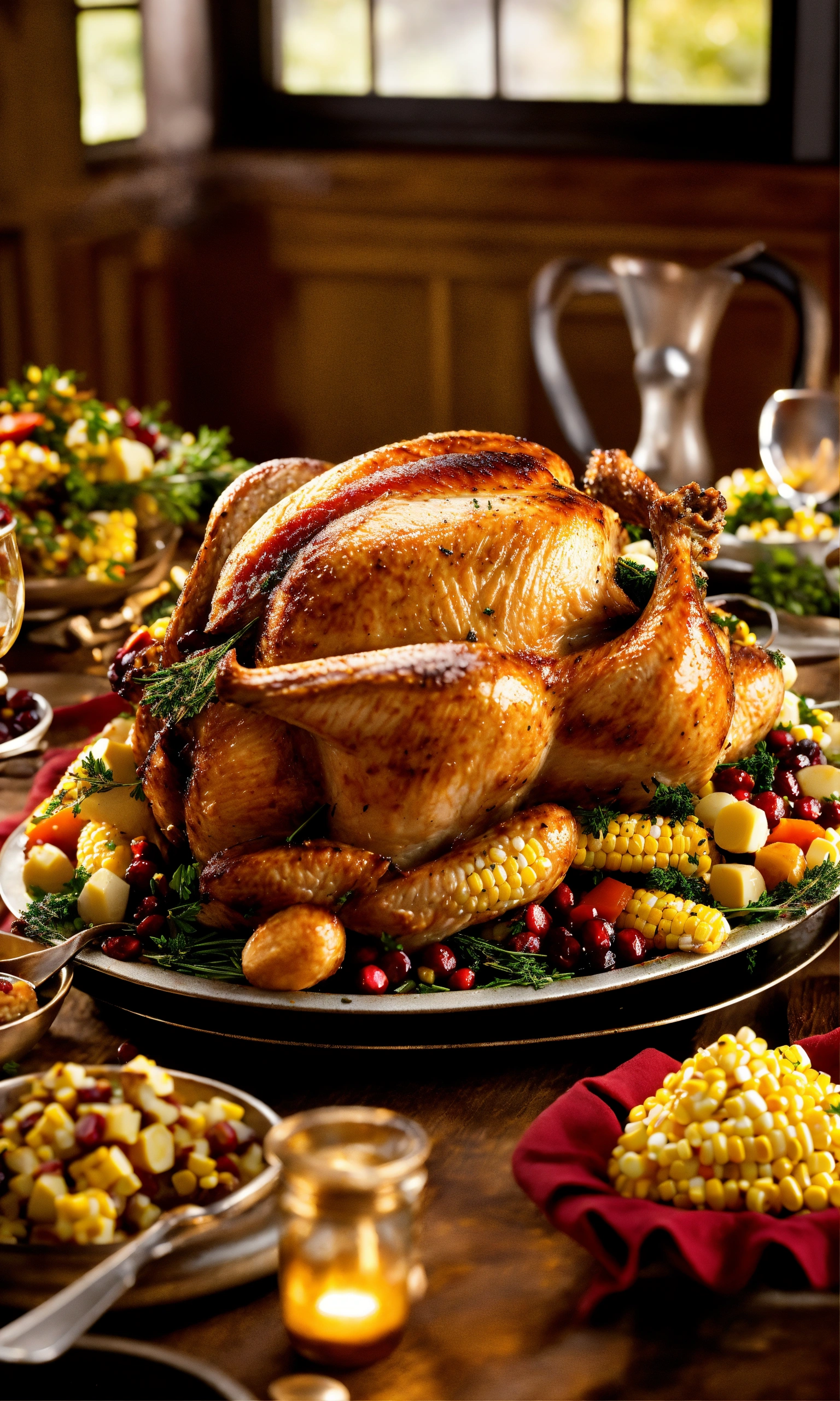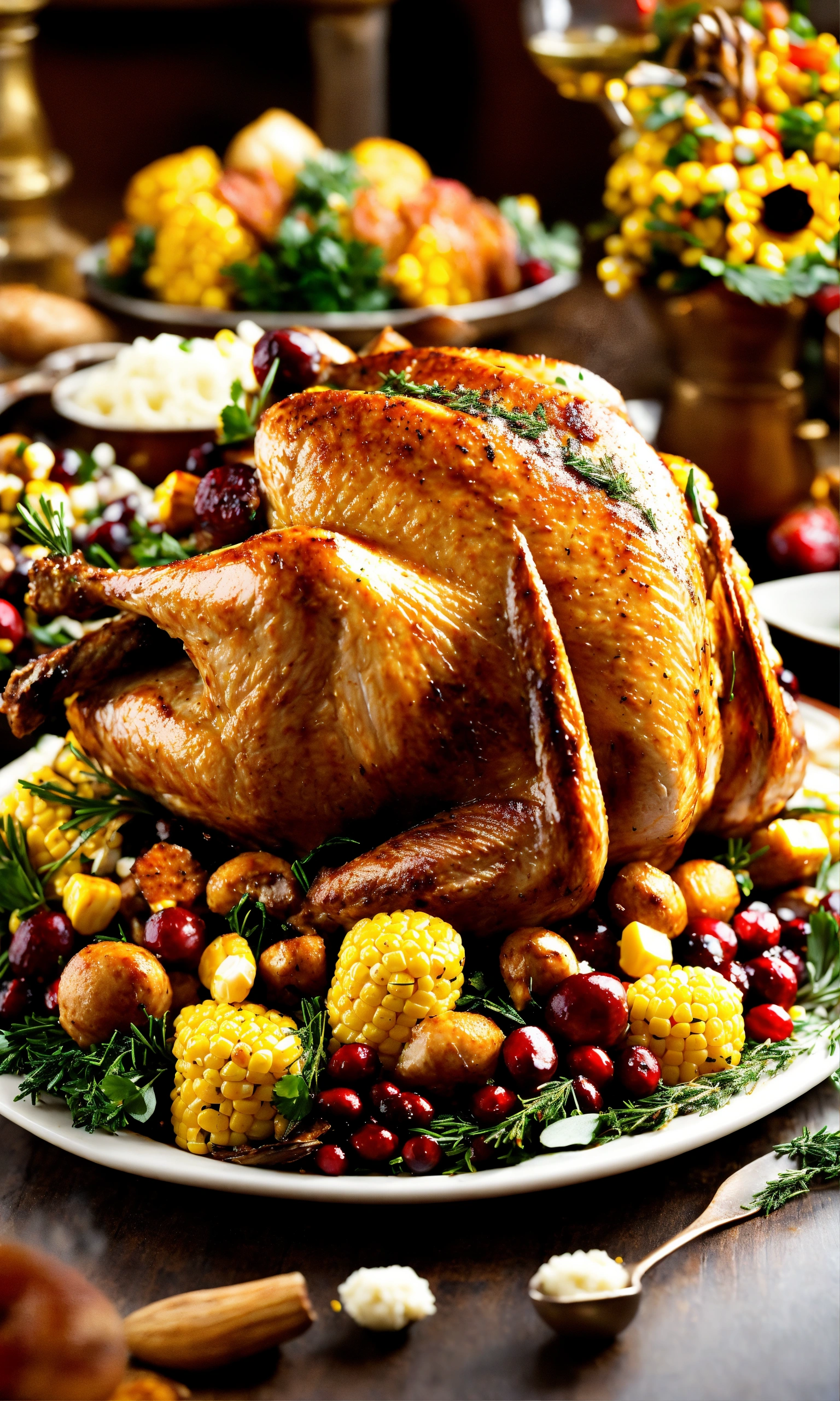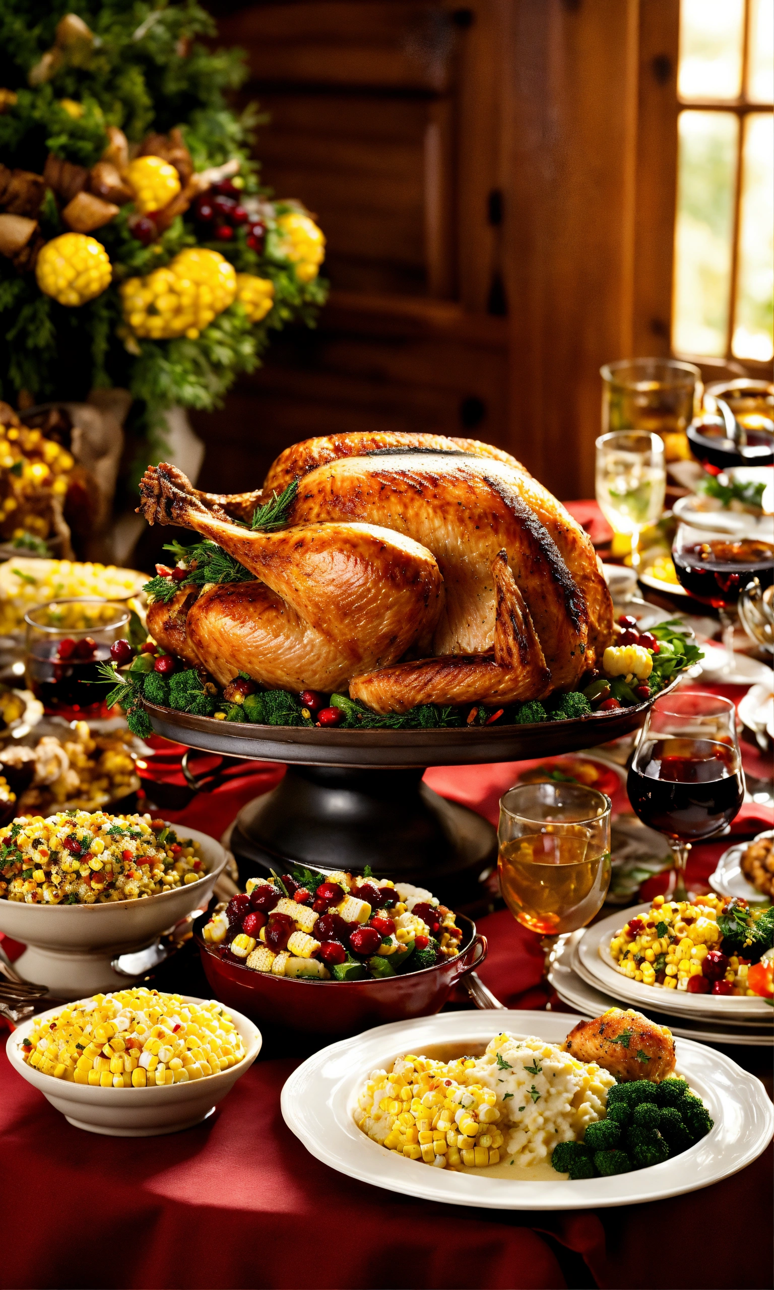 The feast itself is a masterpiece of culinary artistry. roasted turkey, bronzed to perfection, takes center stage, surrounded by an abundance of side dishes that include creamy mashed potatoes, buttery corn on the cob, cranberry sauce with a glistening sheen, and stuffing brimming with aromatic herbs and vegetables. aromatic steam rises from each dish, tantalizing the senses.