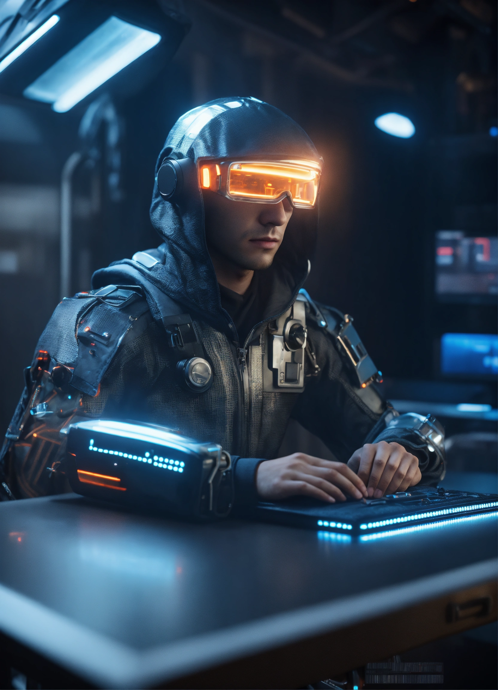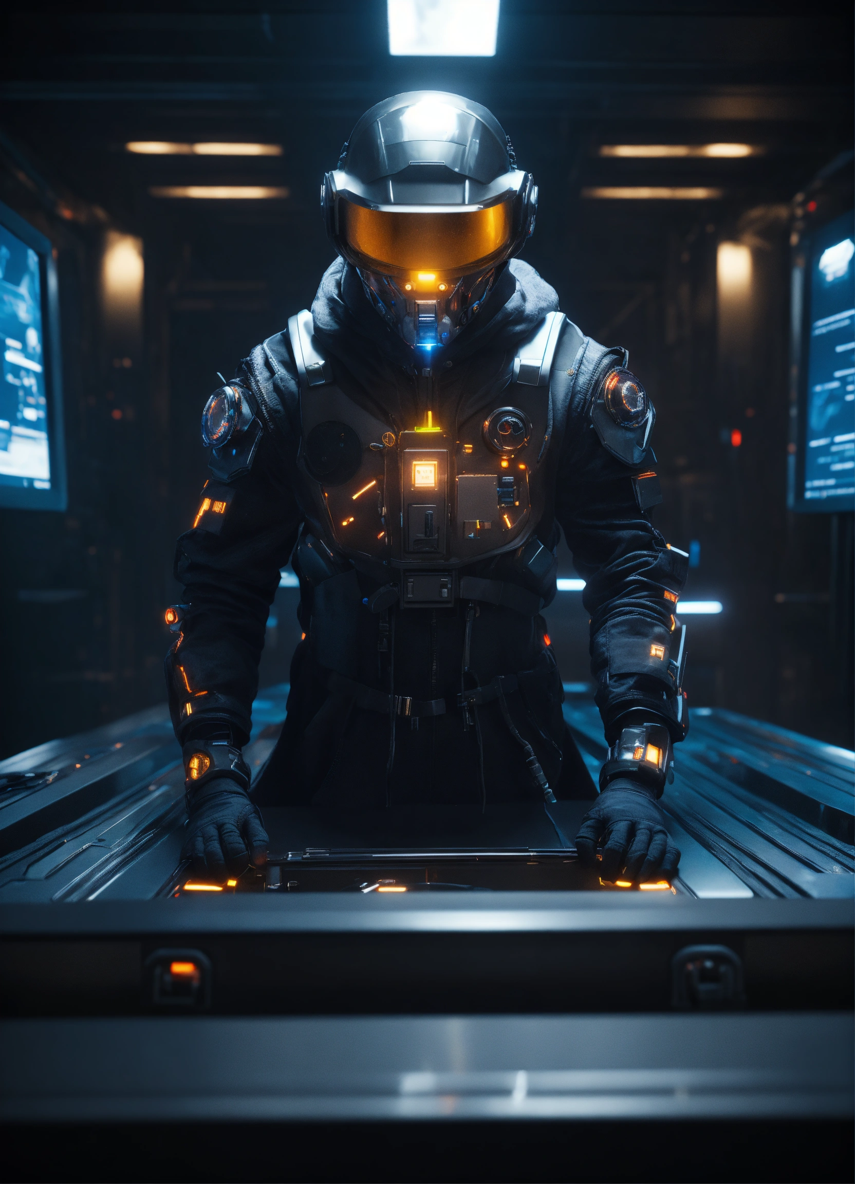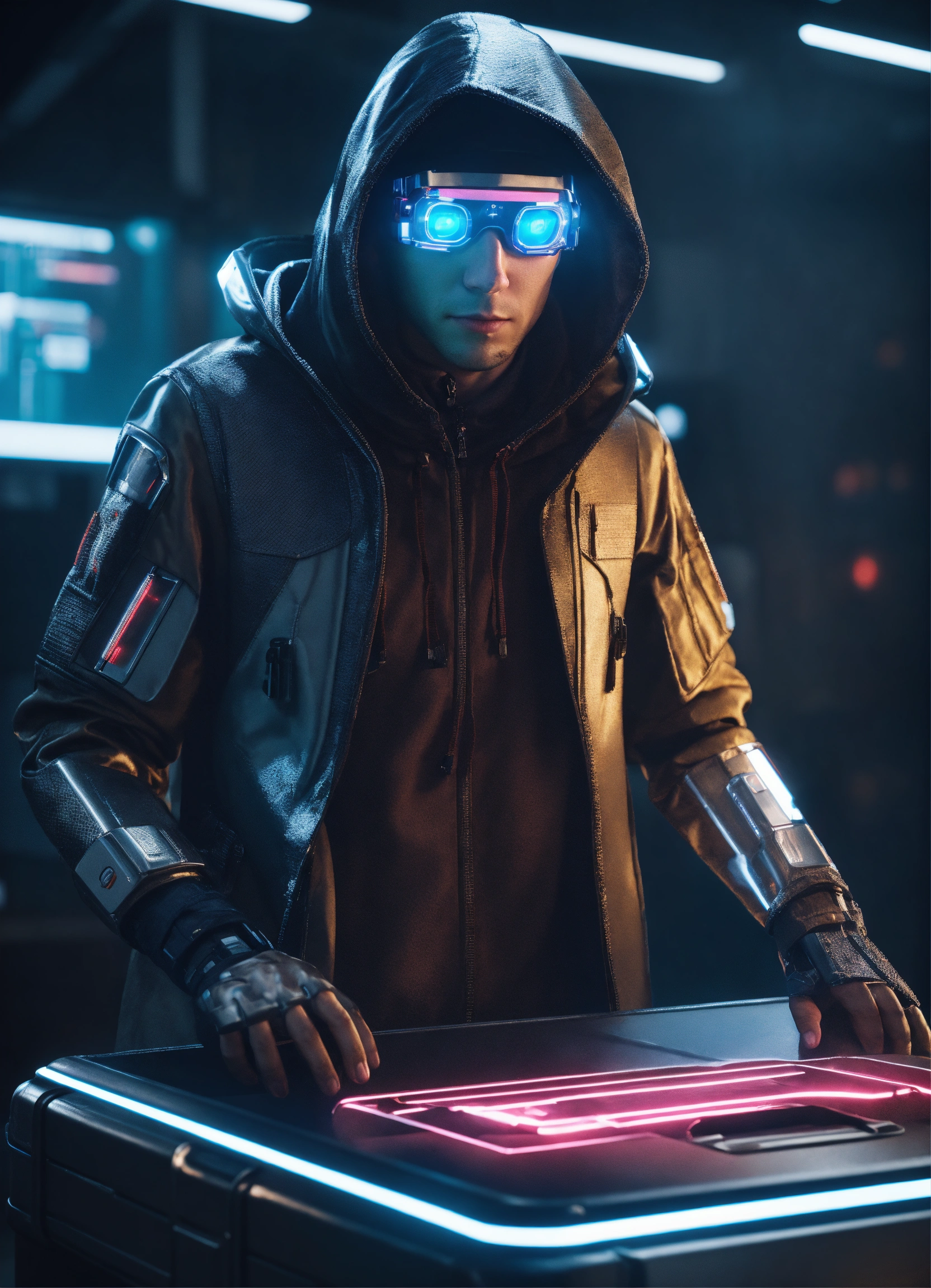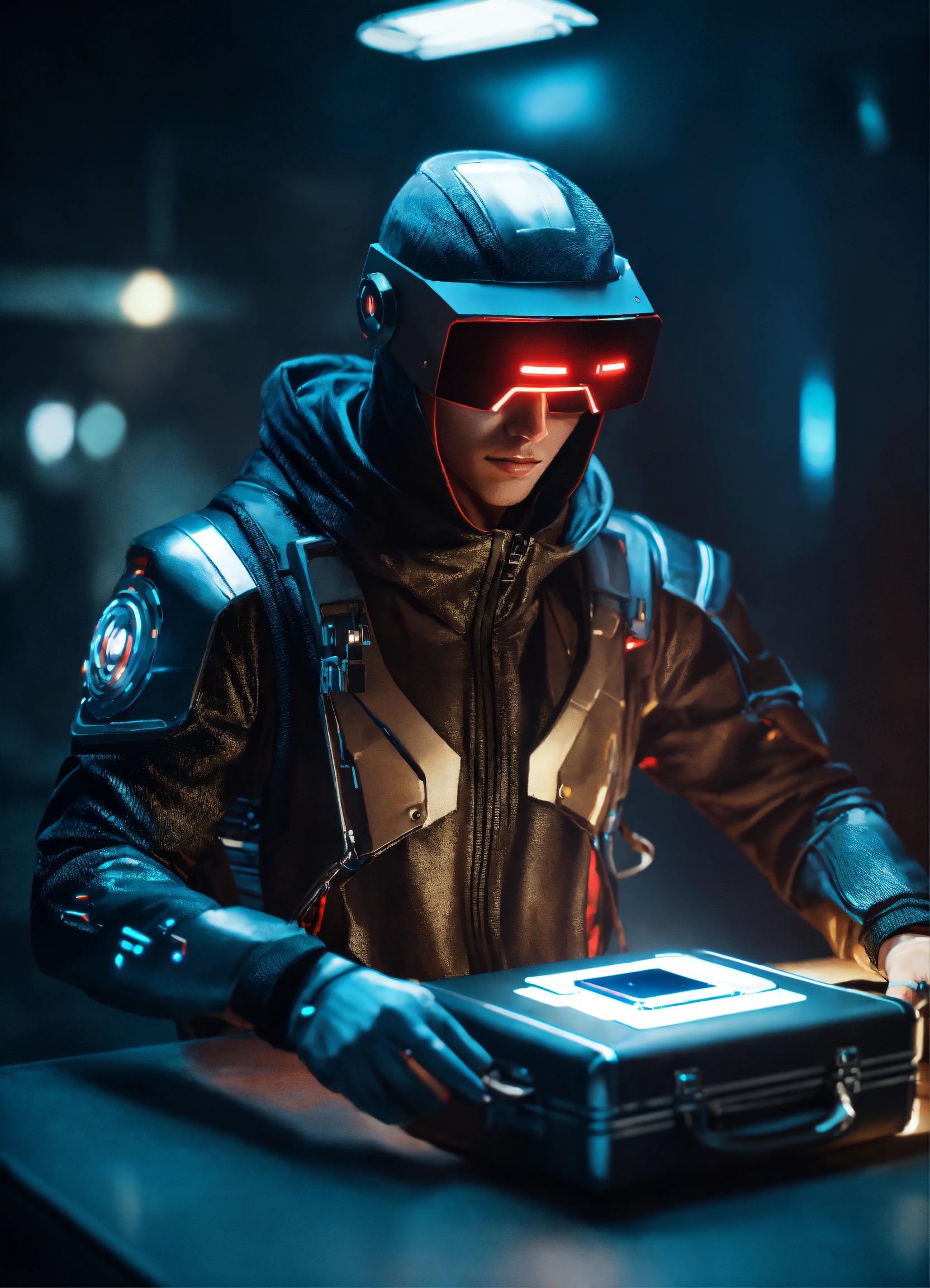 Nerdy 25 year old male cyborg hacker wearing futuristic clothing, hi-tech visor, hooded cloak, with a polished steel security suitcase on the table, in a dark space craft. 8k, realistic. unreal engine, pixar
