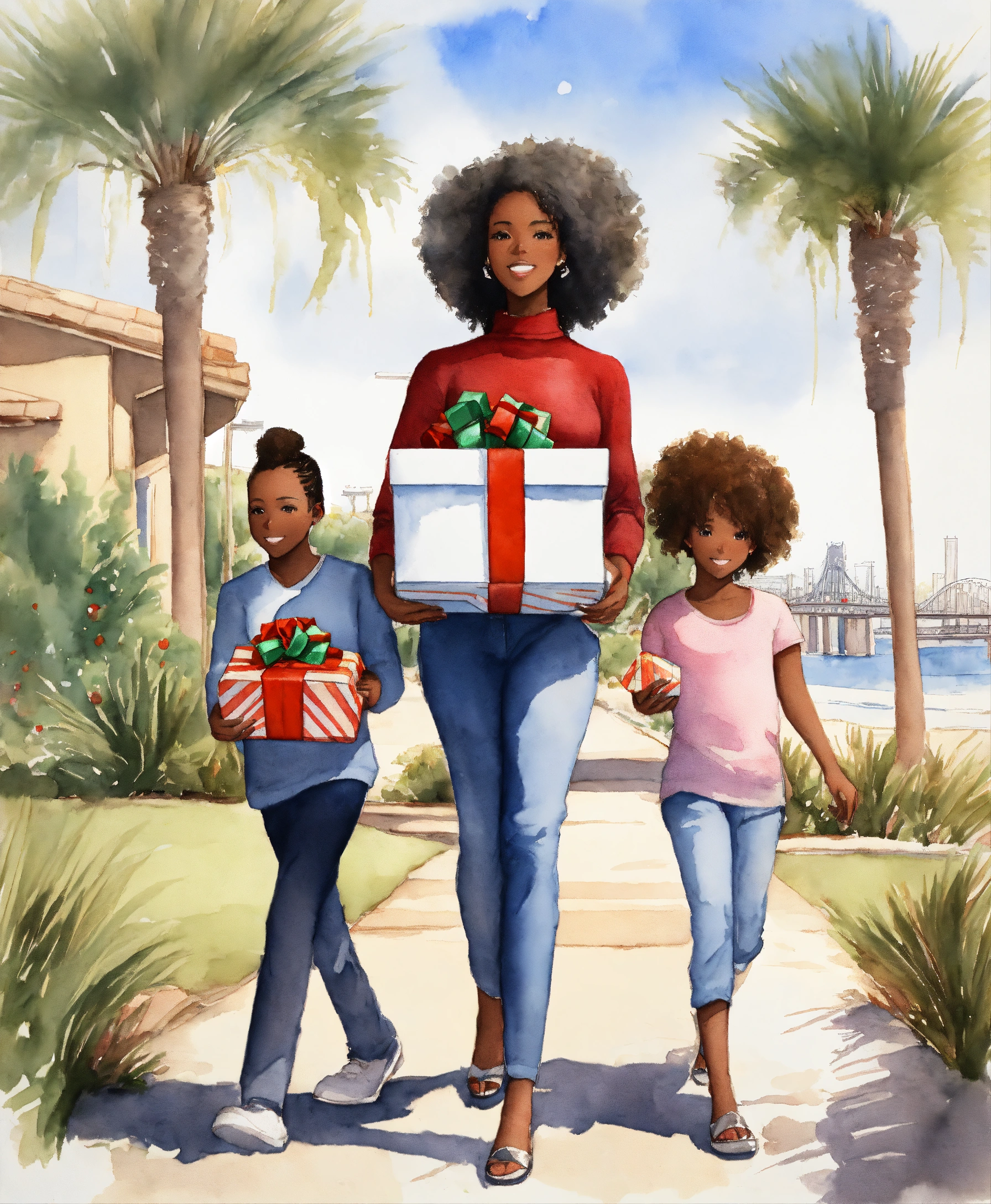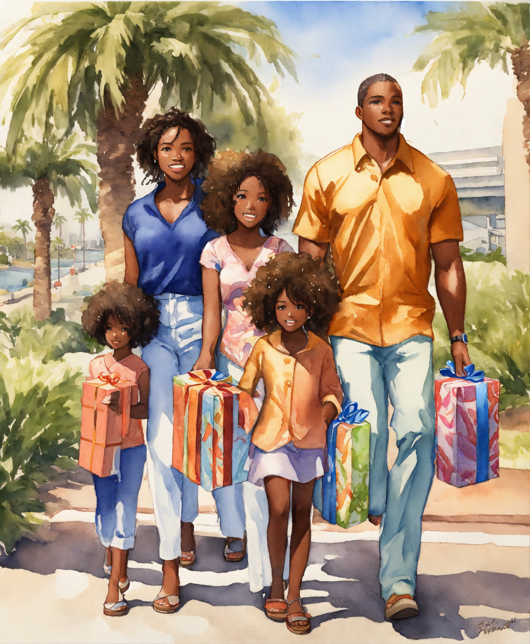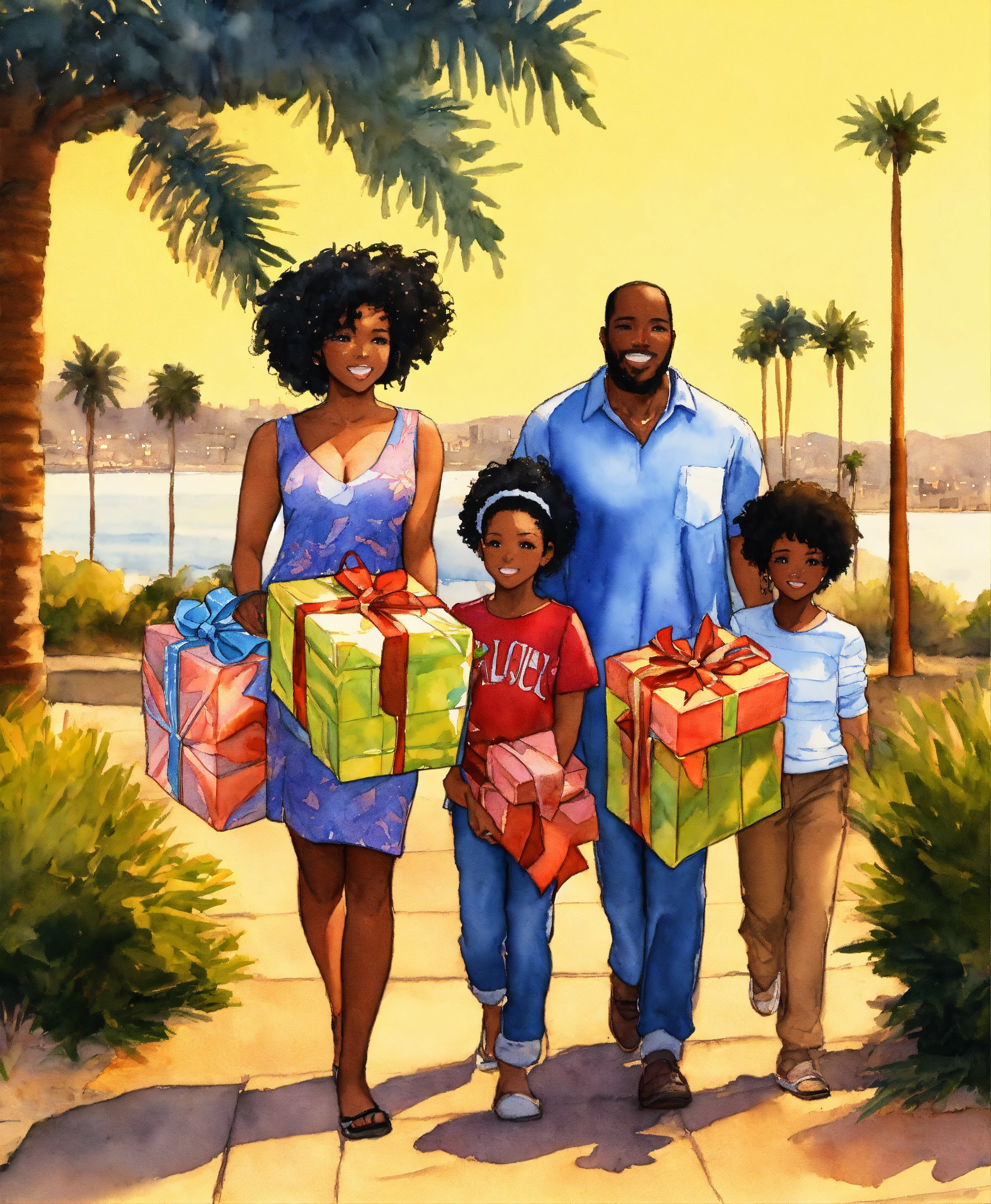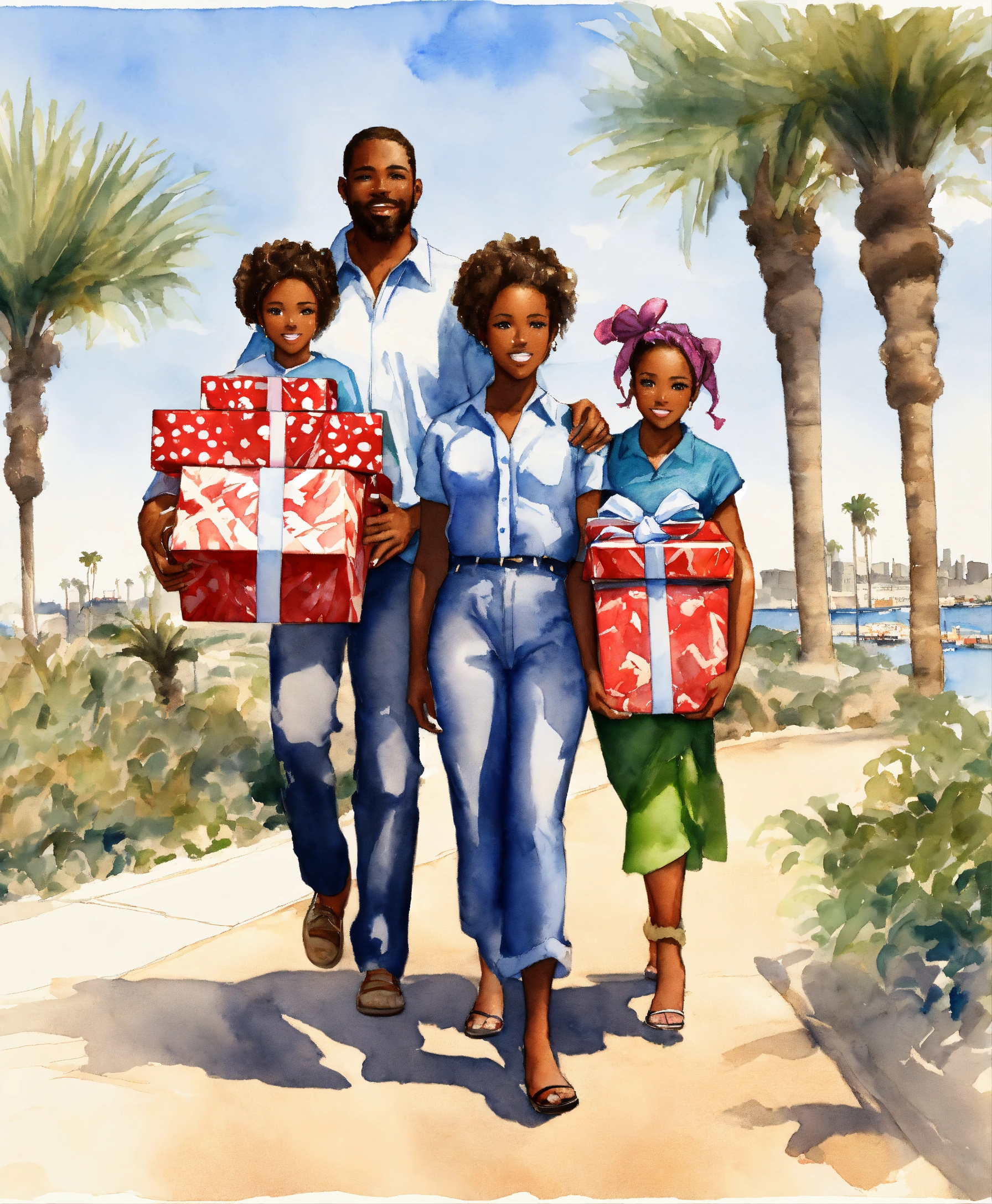 African american west african features fully clothed tradition 5 member family carrying stacks of wrapped presents, realistic healthy glossy well defined loc’d hair styles texture, full body shot, san diego california winter christmas scene theme, palm trees, coronado bridge in distance, rule of thirds centered subject placement, moe anime, intricate detail line drawing, watercolor