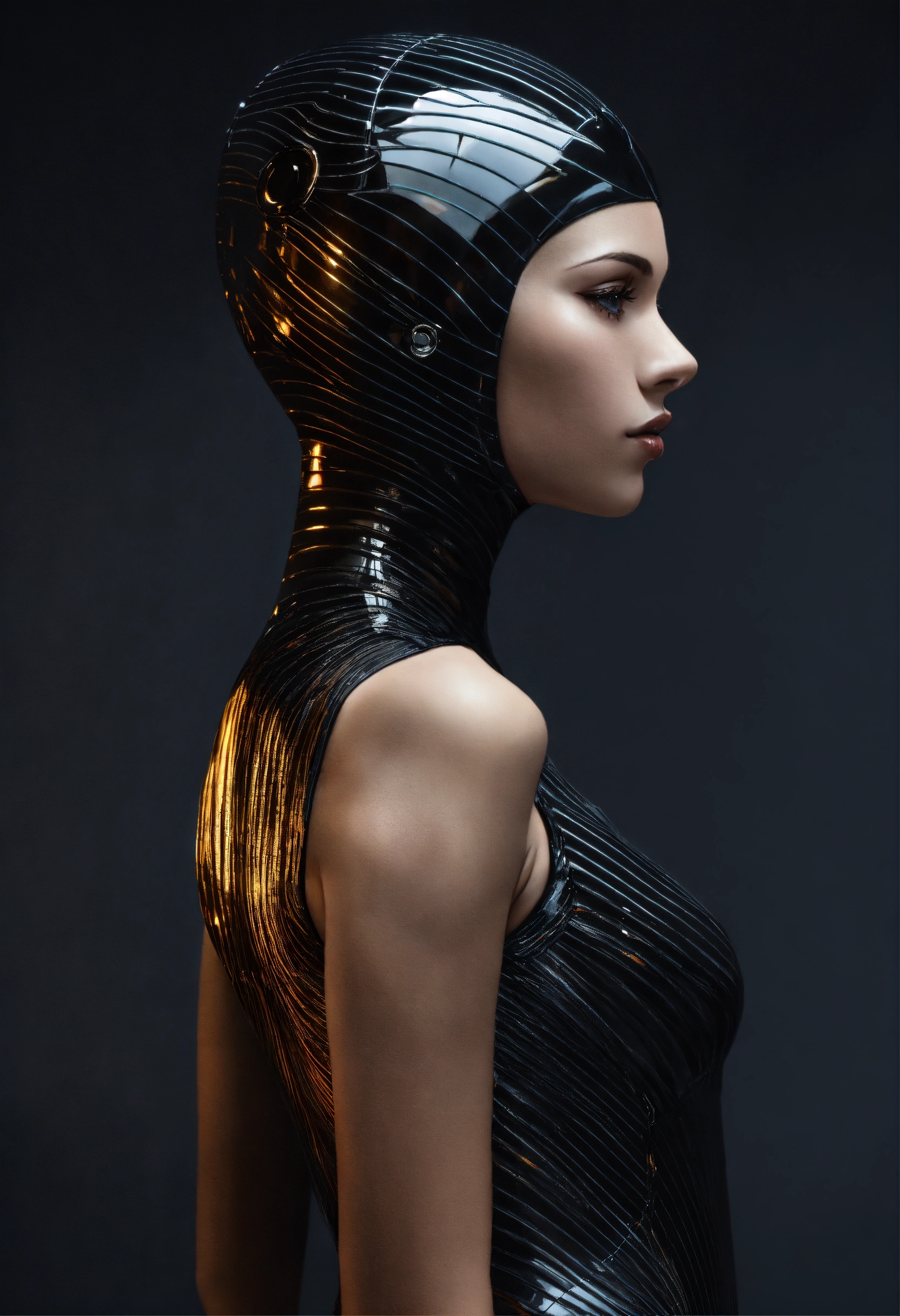 futuristic woman in black striped body suit with head
