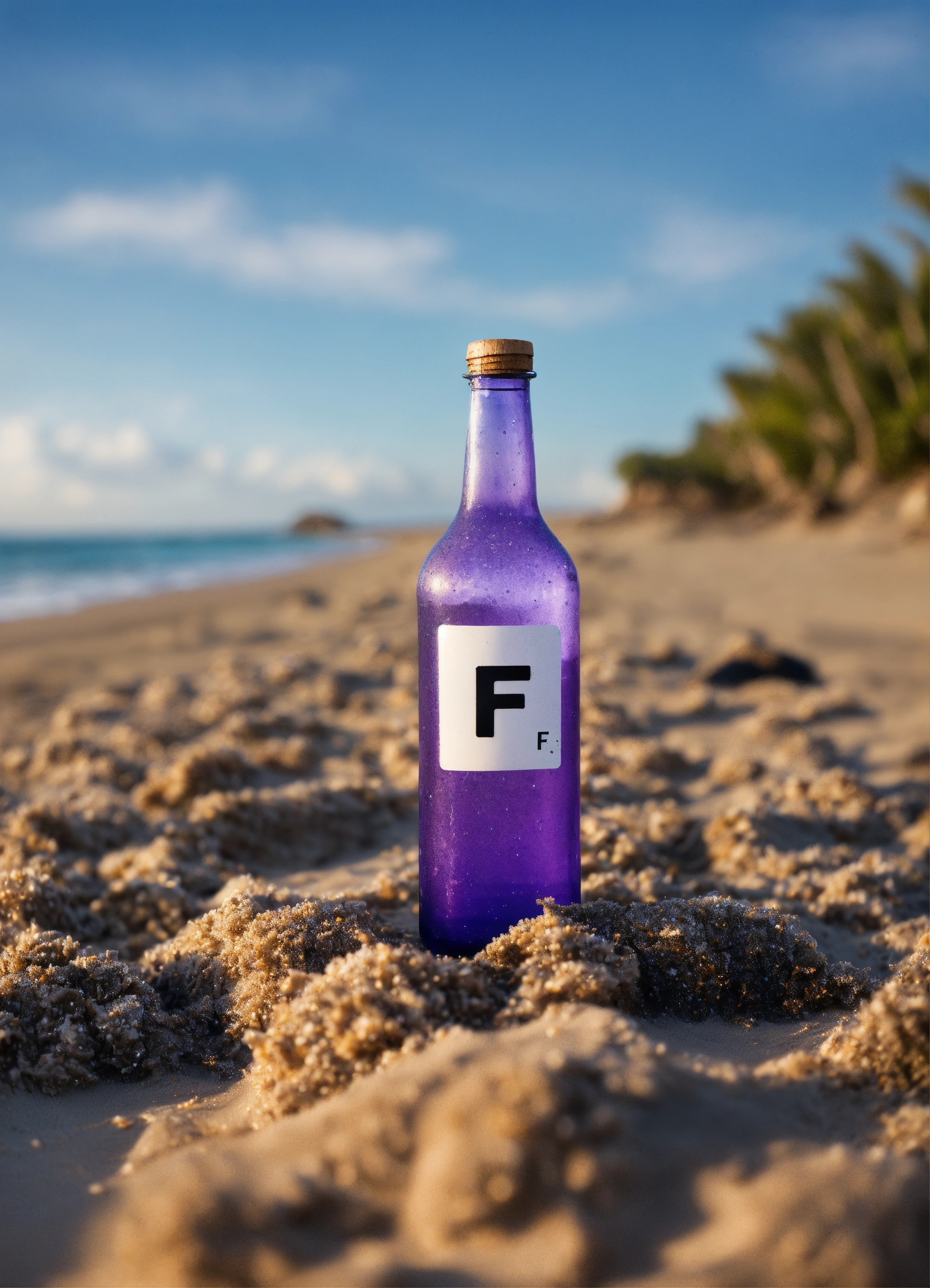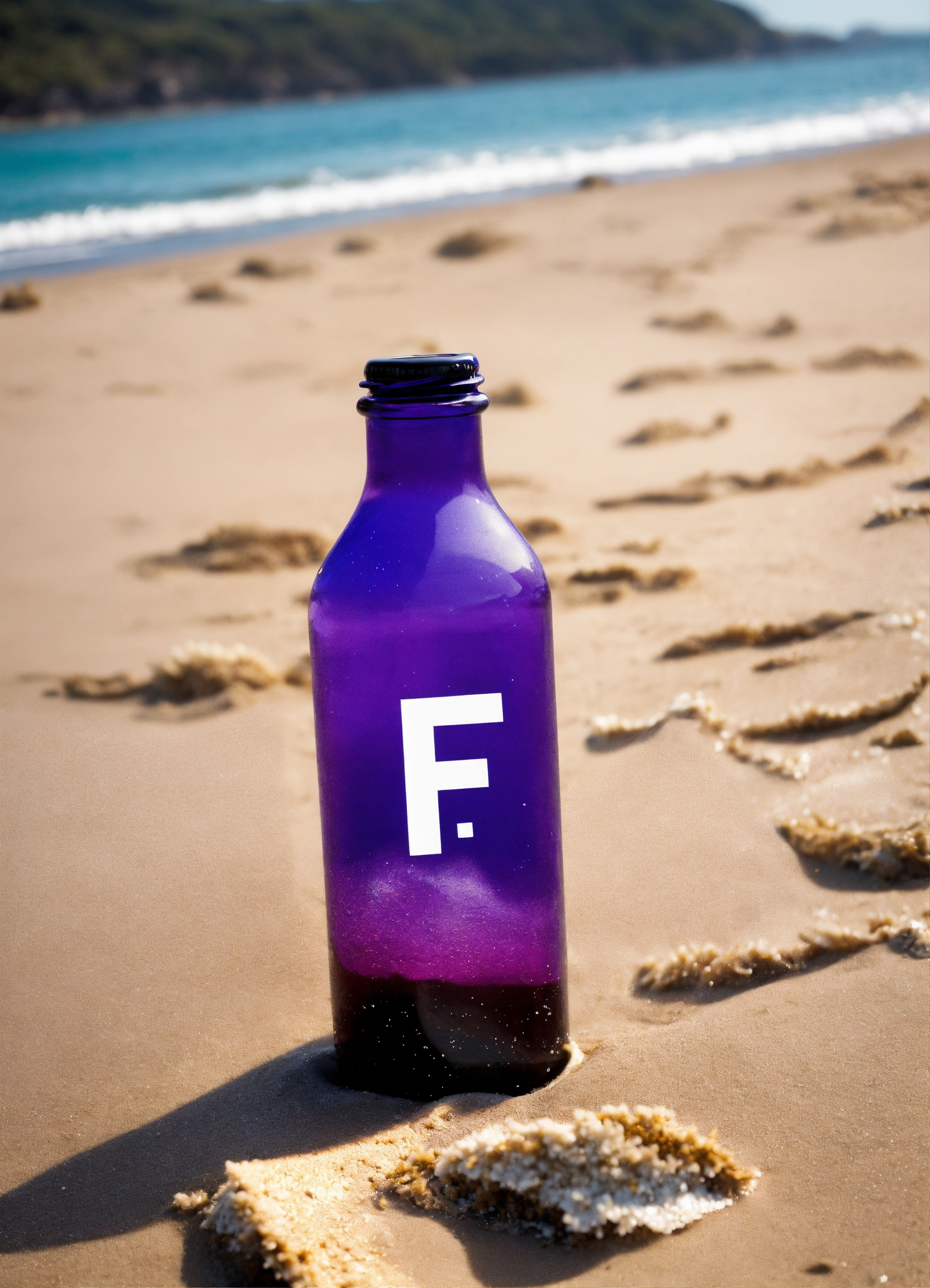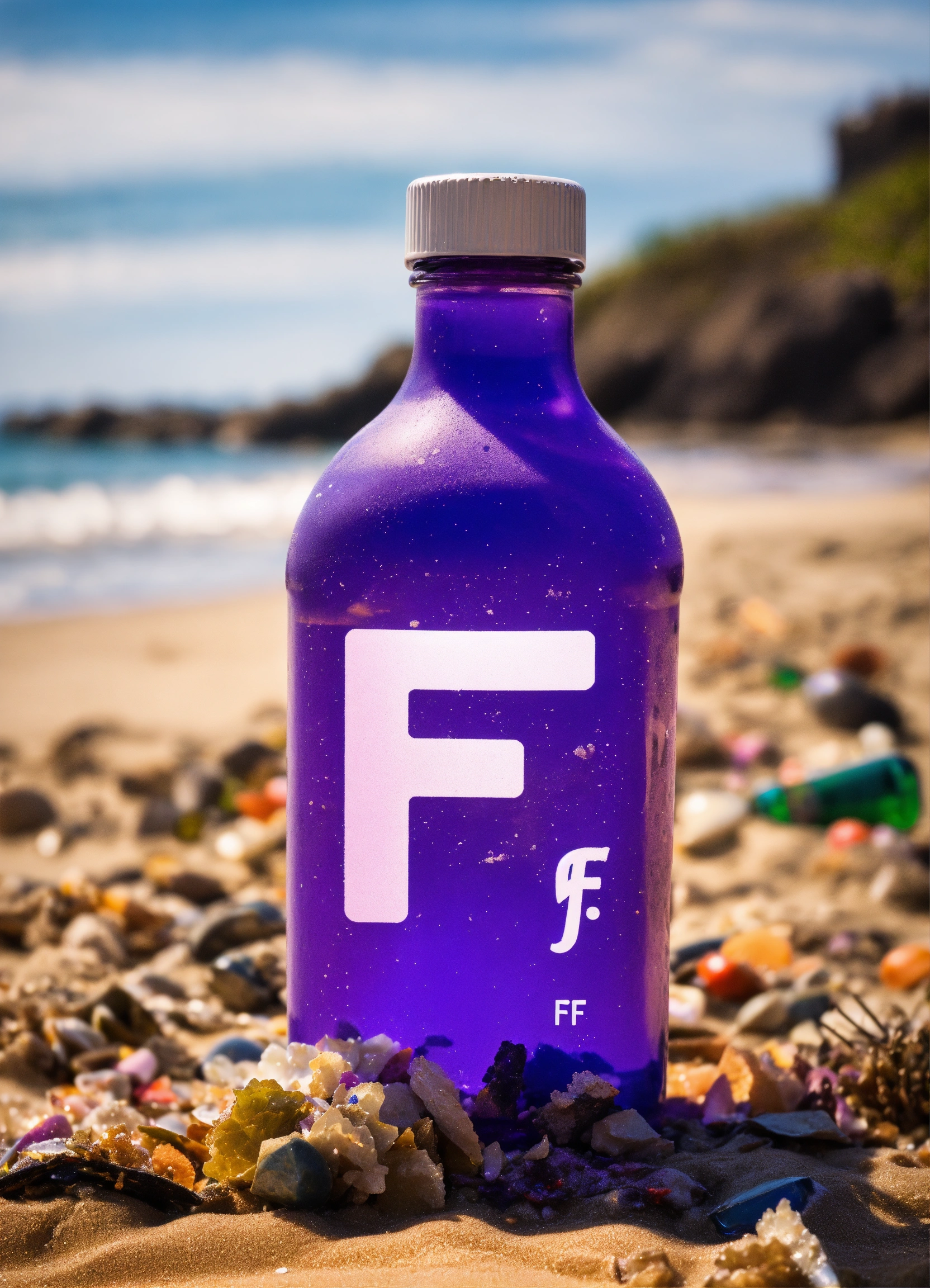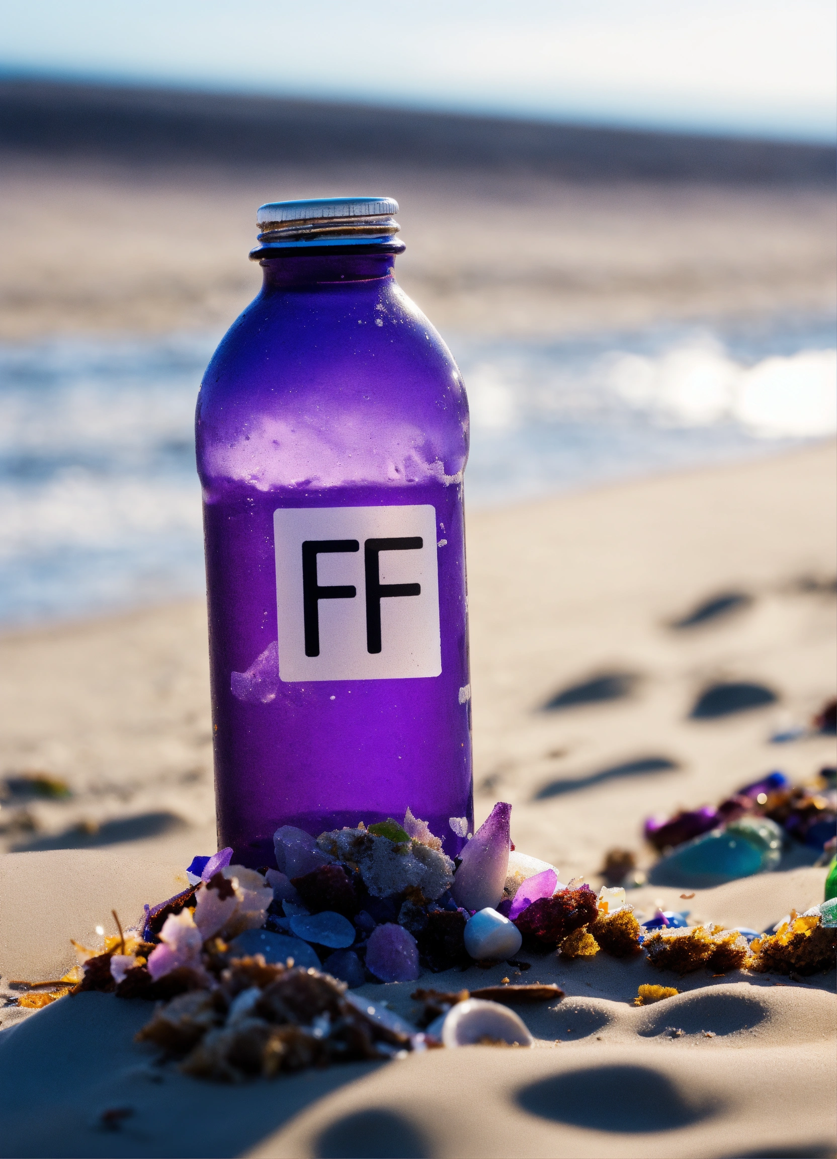 a washed up purple bottle on the beach