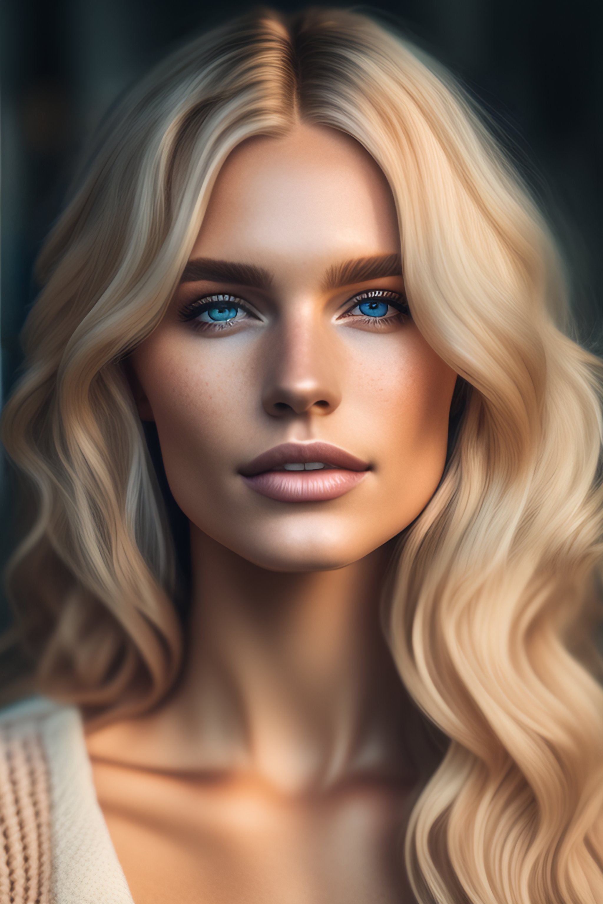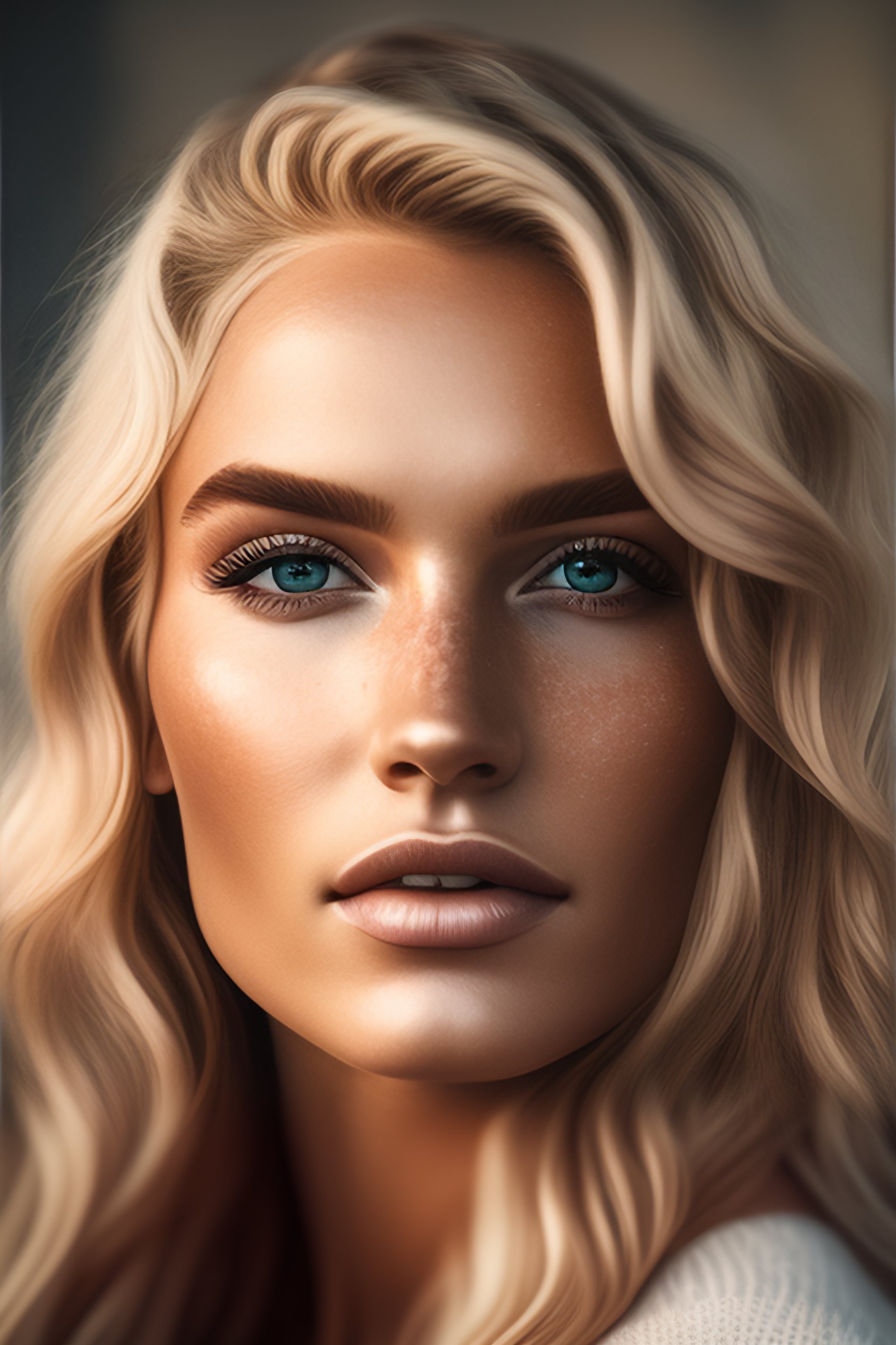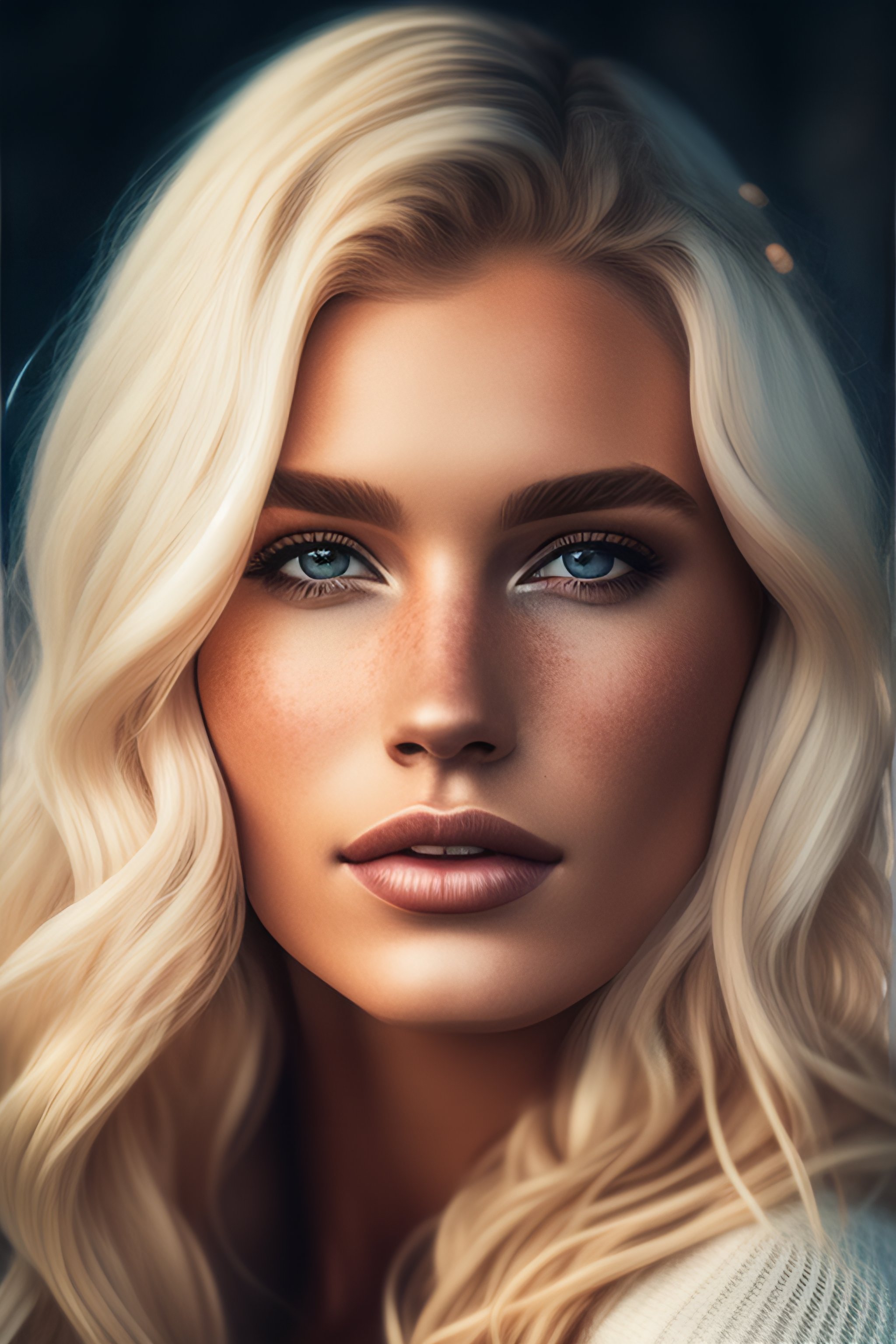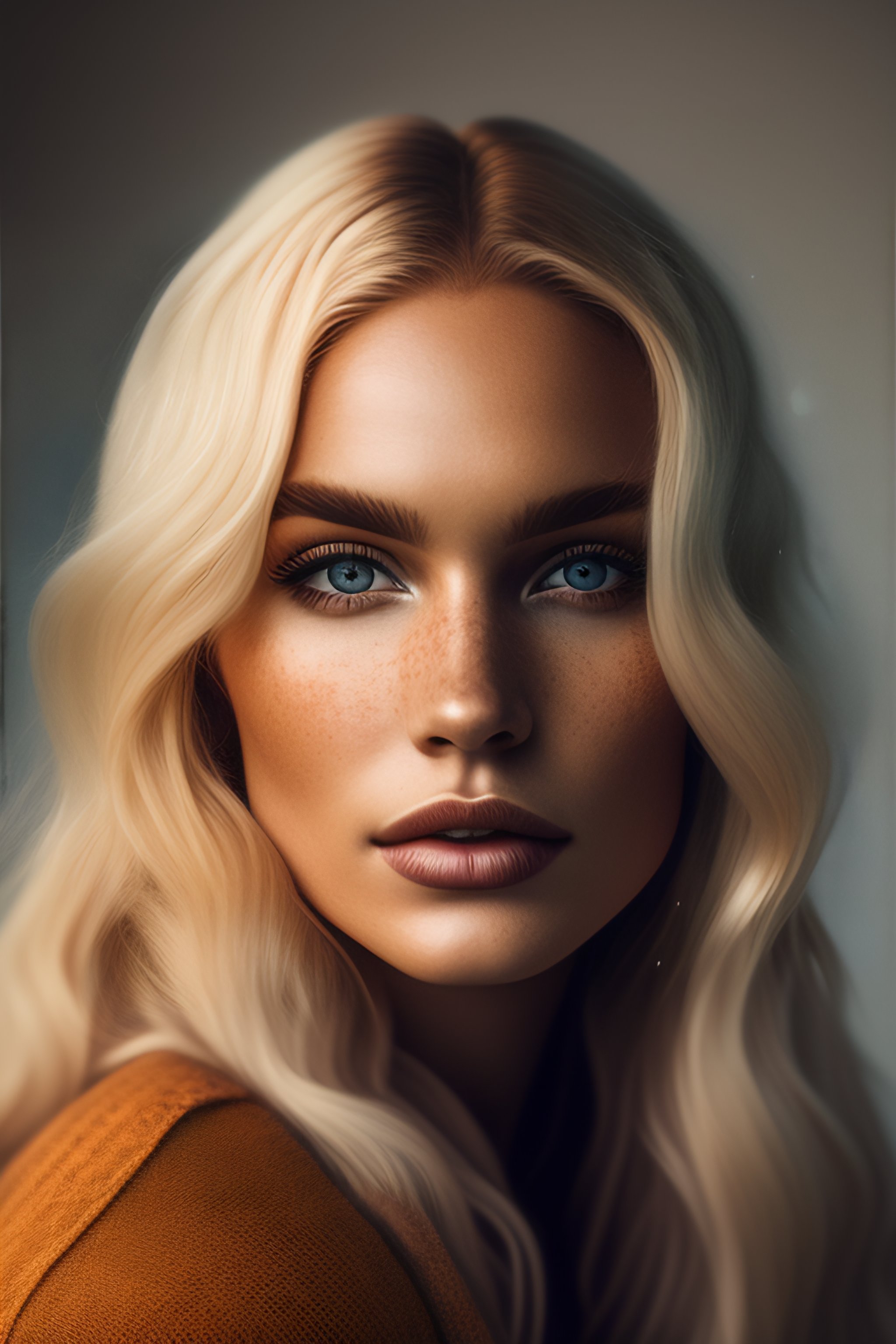 A portrait of a beautiful blonde woman, fine - art photography, soft portrait shot 8 k, mid length, ultrarealistic uhd faces, unsplash, freckles, intricate, centered symmetrical composition, stunning photos, masterpiece, grainy, centered composition