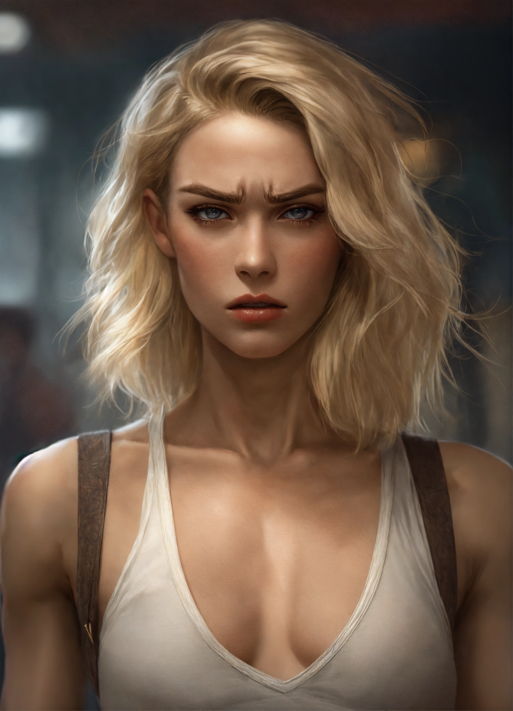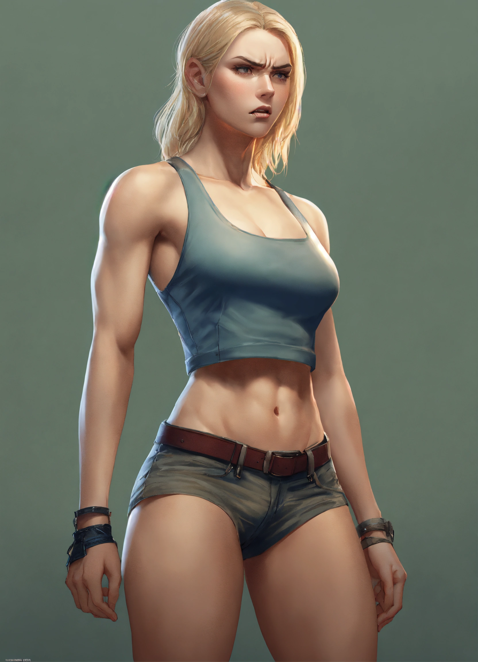 Full body potrait of thin beautiful faced tall woman with high cheekbones, pale skin, blonde hair, heavy chest, thin muscular midriff with angry face, illustration, hyper realistic, highly detailed, side glamor pose, 4k, hdr, smooth, sharp focus, high resolution.