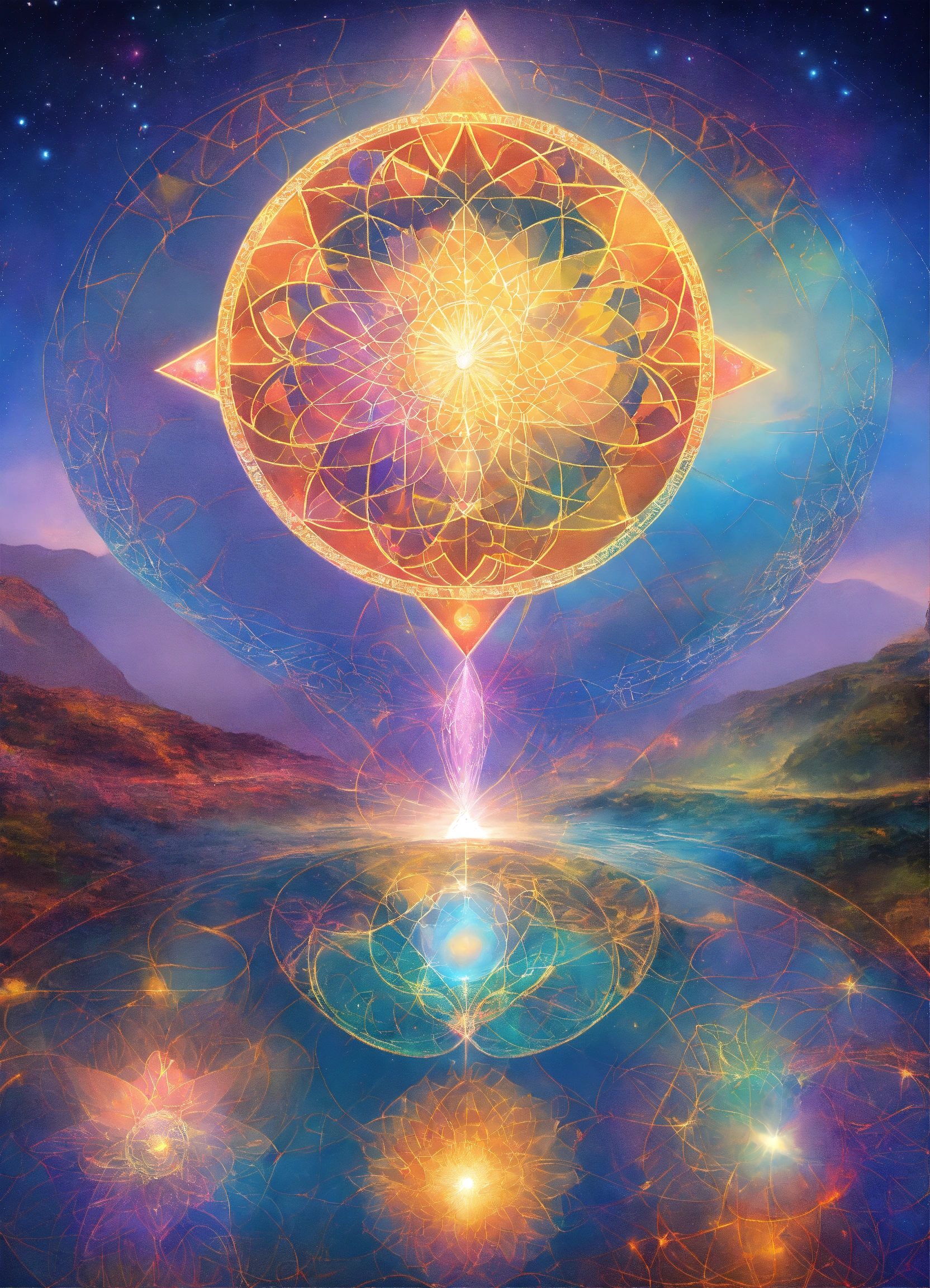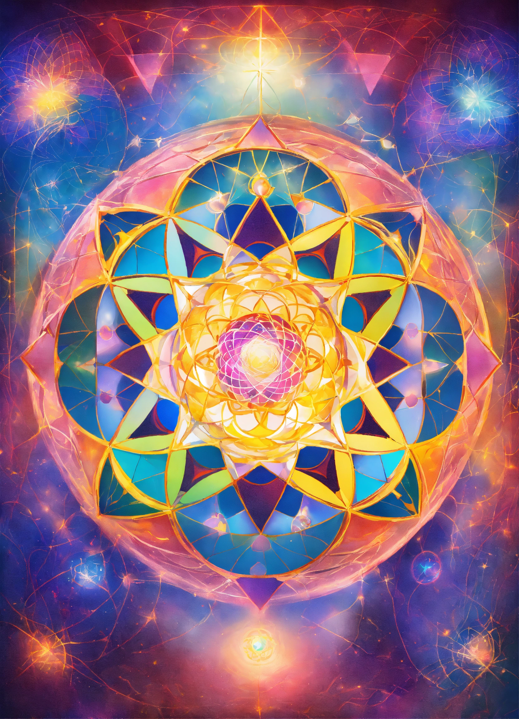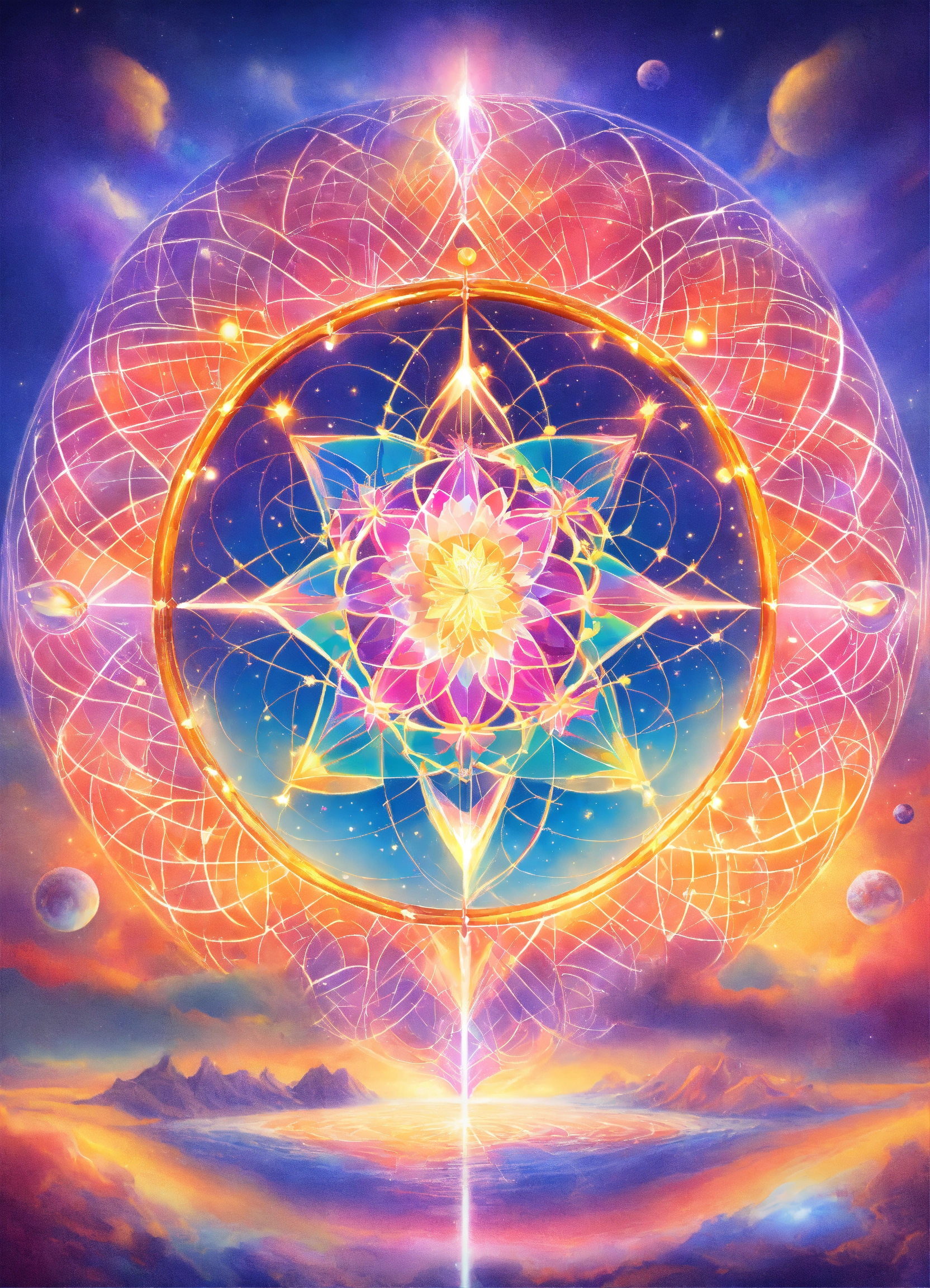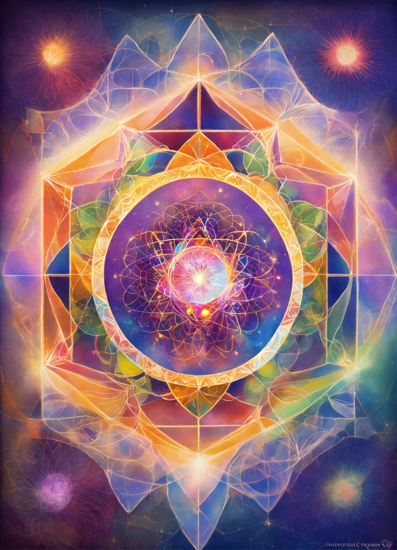 Activation bonheur symbole, adn, connected to other universes, to the invisible worlds, pastel colors, shades multicolors, shinning light, sacred geometry
